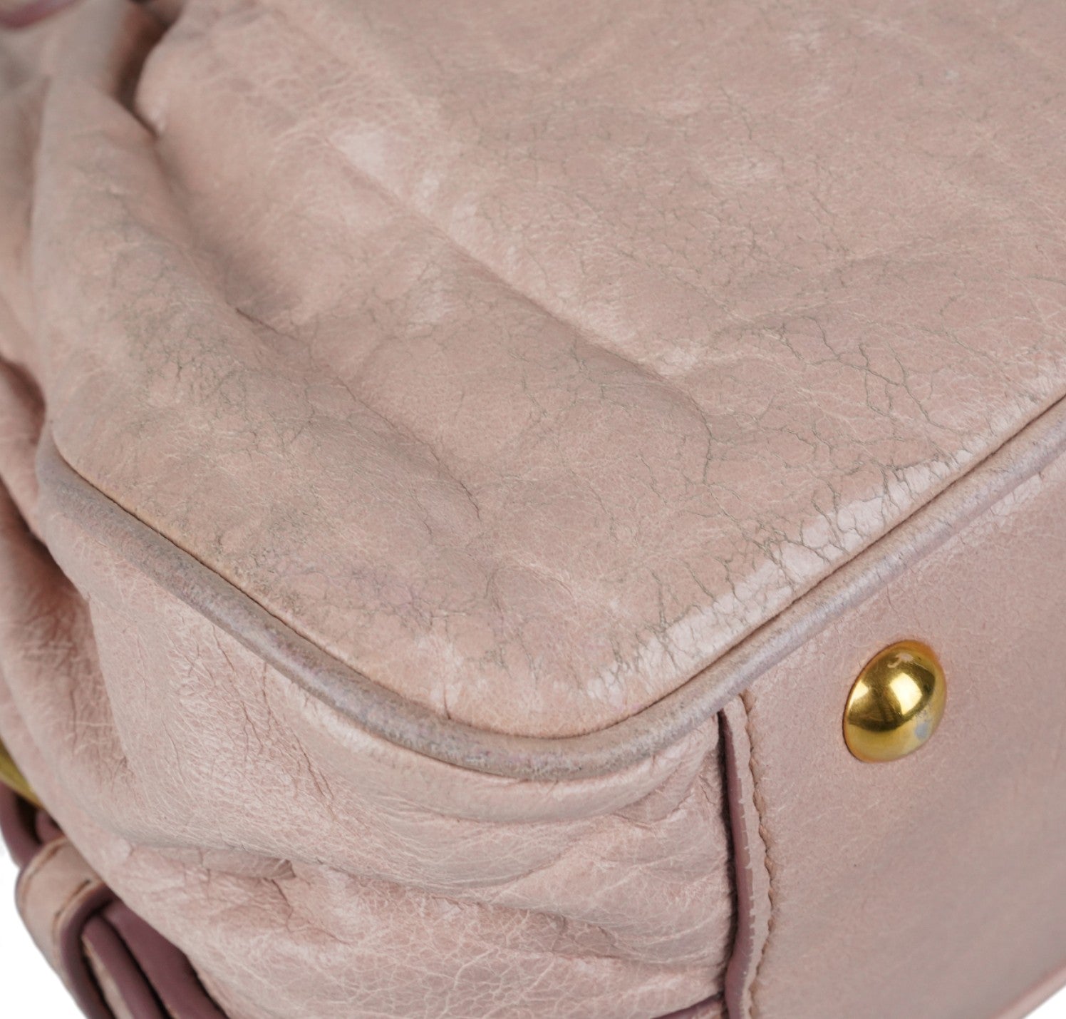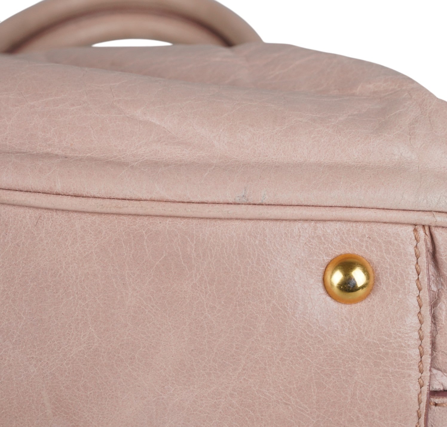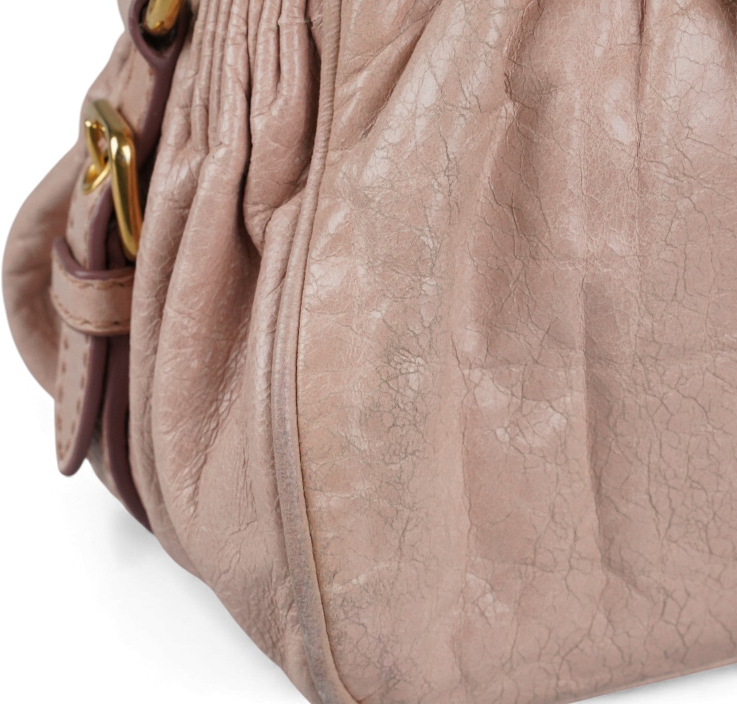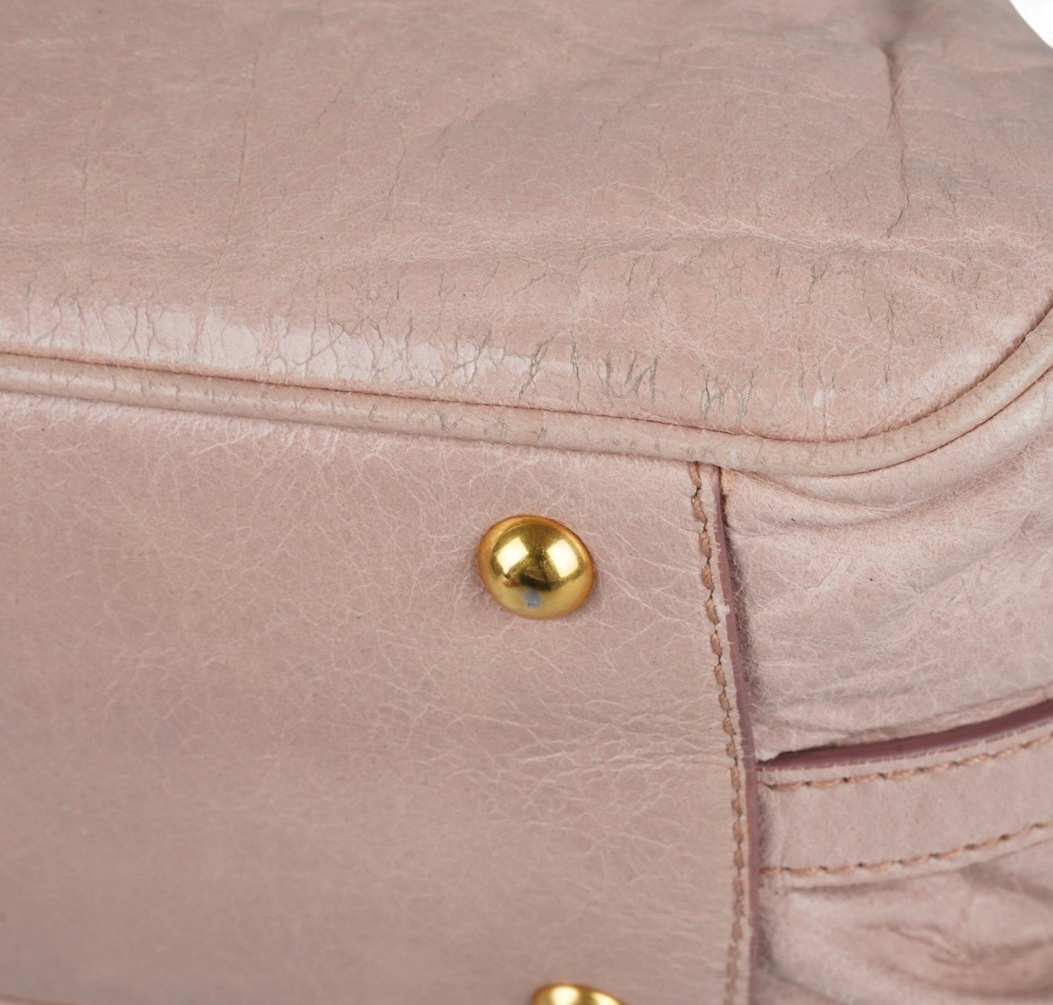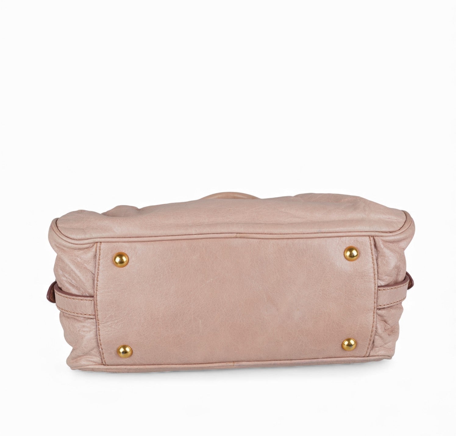 Borsa Miu Miu, modello 2 Way, realizzata in morbida pelle “shine” color Cipria con dettagli arricciati laterali e charm lucchetto dorato frontale. Metalleria in finitura oro, doppi manici superiori e tracolla regolabile e rimovibile per portabilità a mano o a spalla. Tasca frontale con zip, interno foderato in tessuto viola con scomparto capiente ideale per uso quotidiano. Piedini metallici di protezione sul fondo. Chiusura superiore a pressione. Minimi segni d’uso sulla pelle, minimi segni d'uso metalleria, micrograffi. Condizioni complessive ottime.