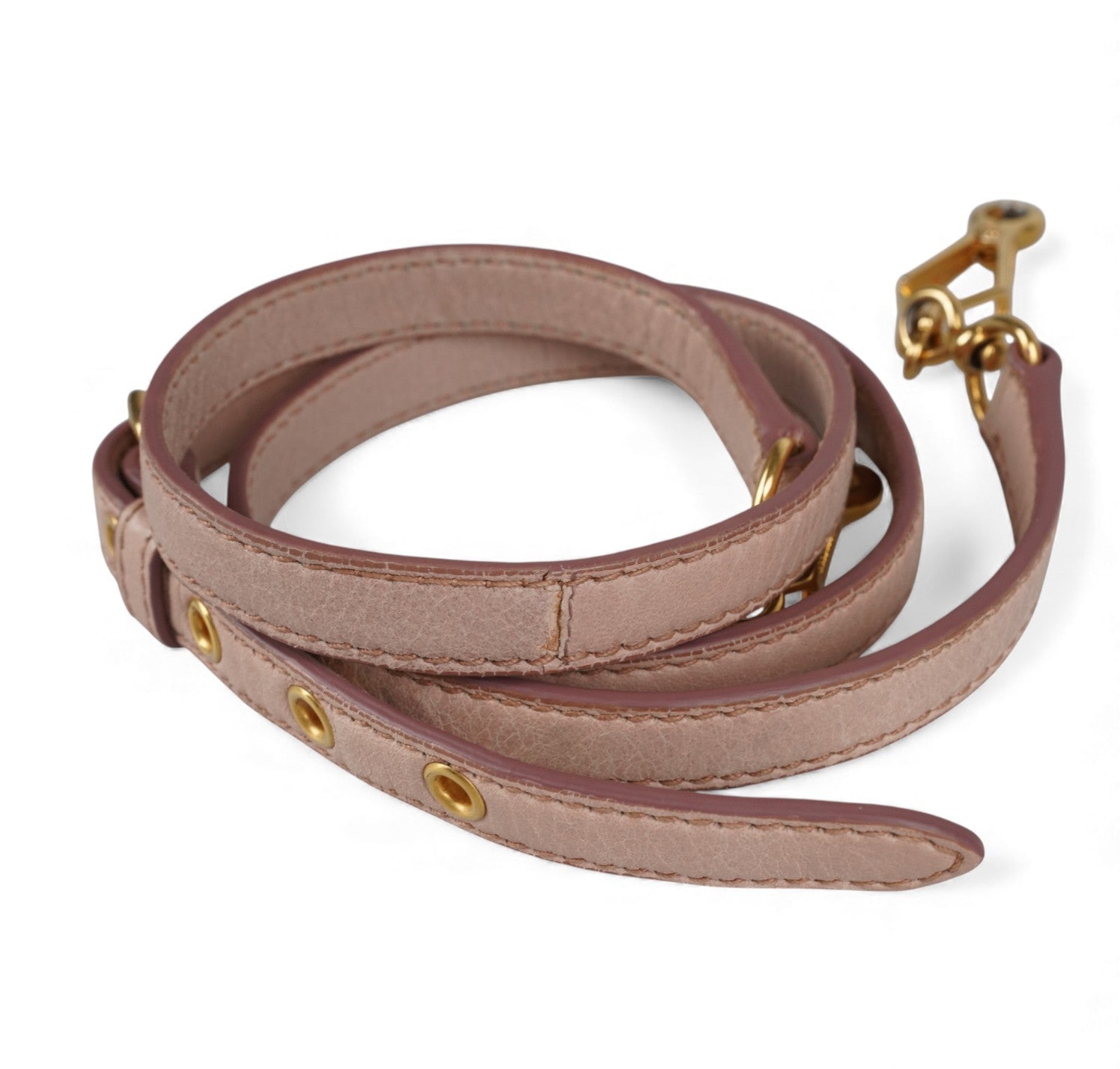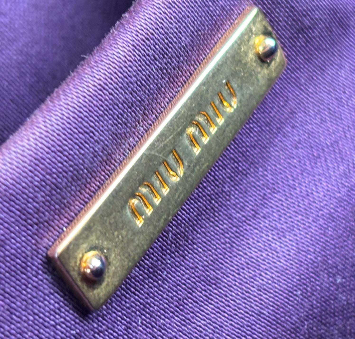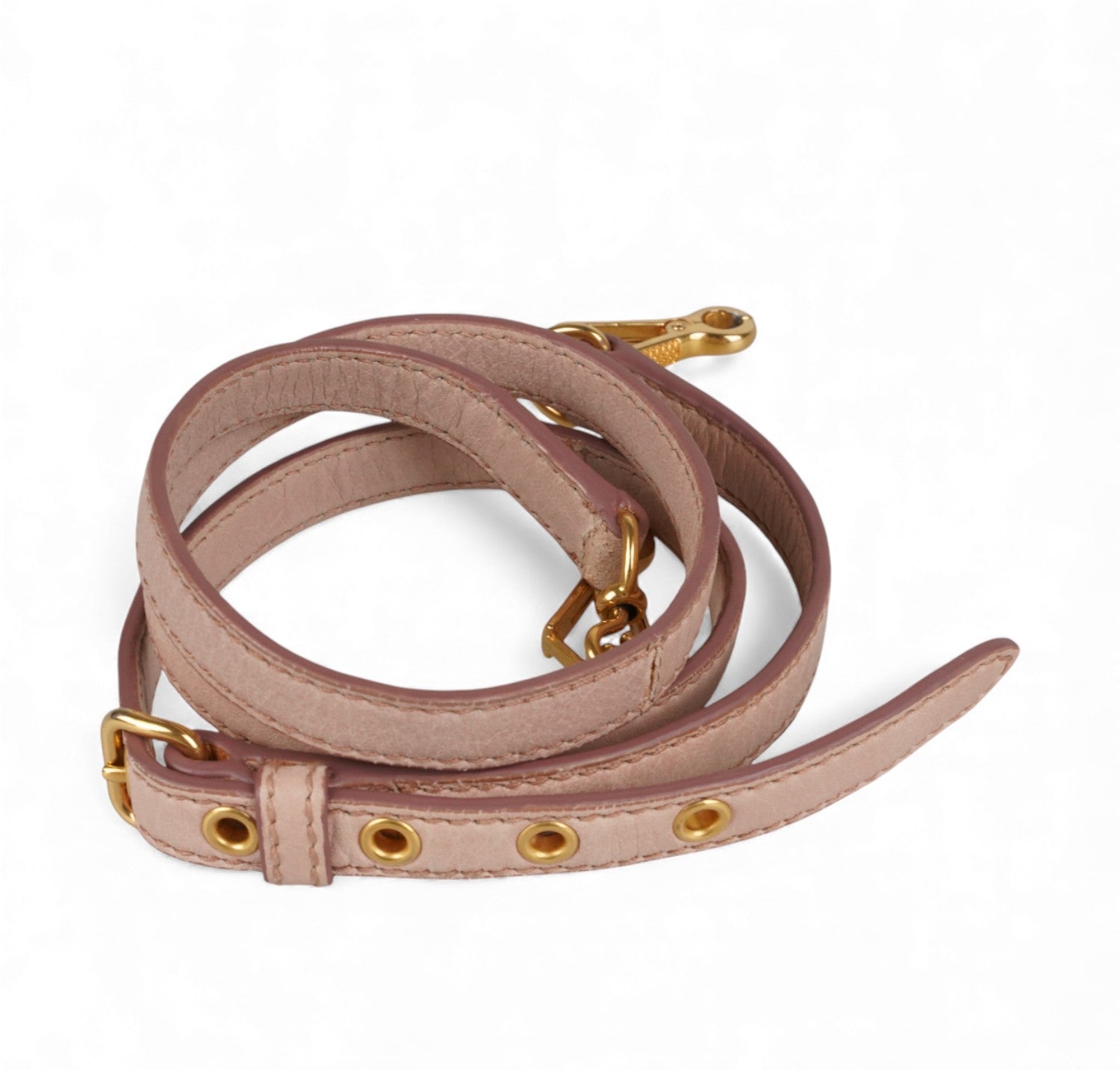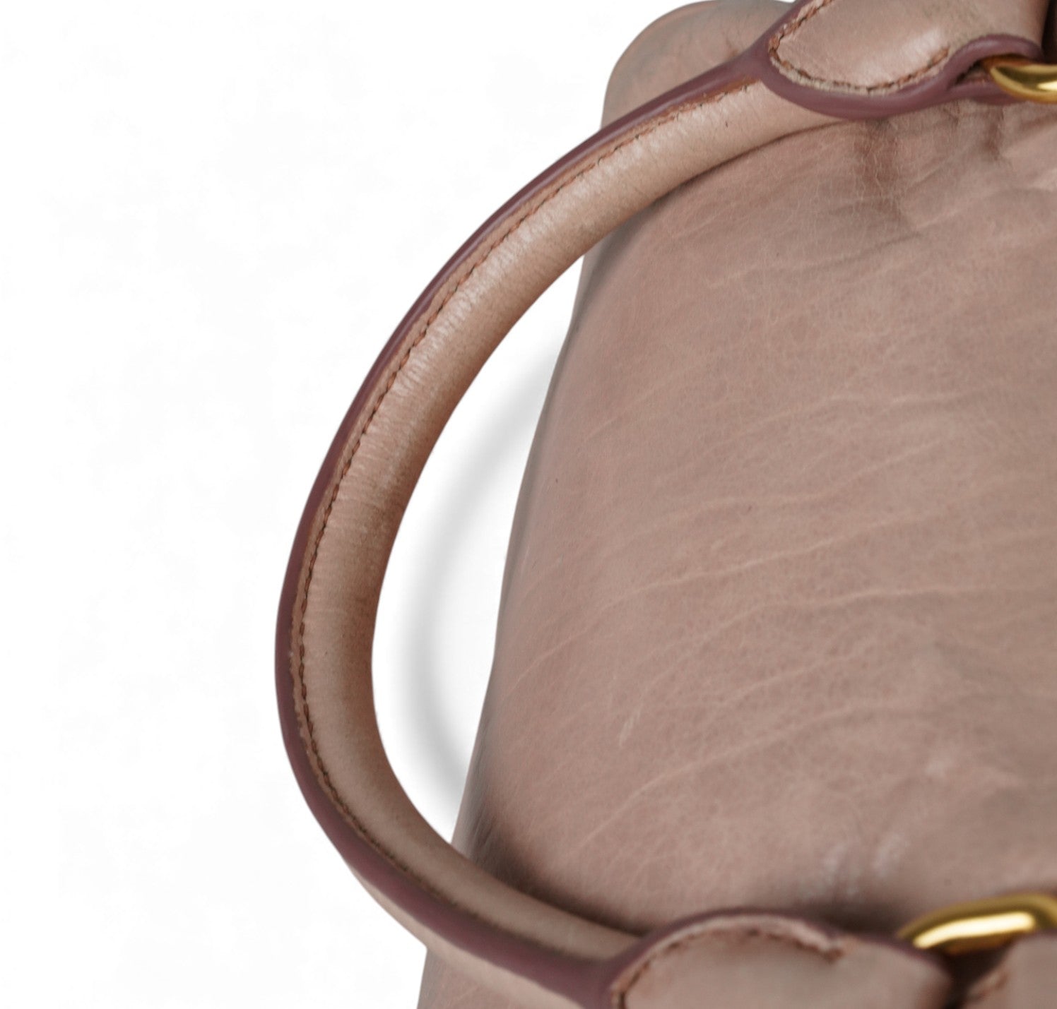 Borsa Miu Miu, modello 2 Way, realizzata in morbida pelle “shine” color Cipria con dettagli arricciati laterali e charm lucchetto dorato frontale. Metalleria in finitura oro, doppi manici superiori e tracolla regolabile e rimovibile per portabilità a mano o a spalla. Tasca frontale con zip, interno foderato in tessuto viola con scomparto capiente ideale per uso quotidiano. Piedini metallici di protezione sul fondo. Chiusura superiore a pressione. Minimi segni d’uso sulla pelle, minimi segni d'uso metalleria, micrograffi. Condizioni complessive ottime.