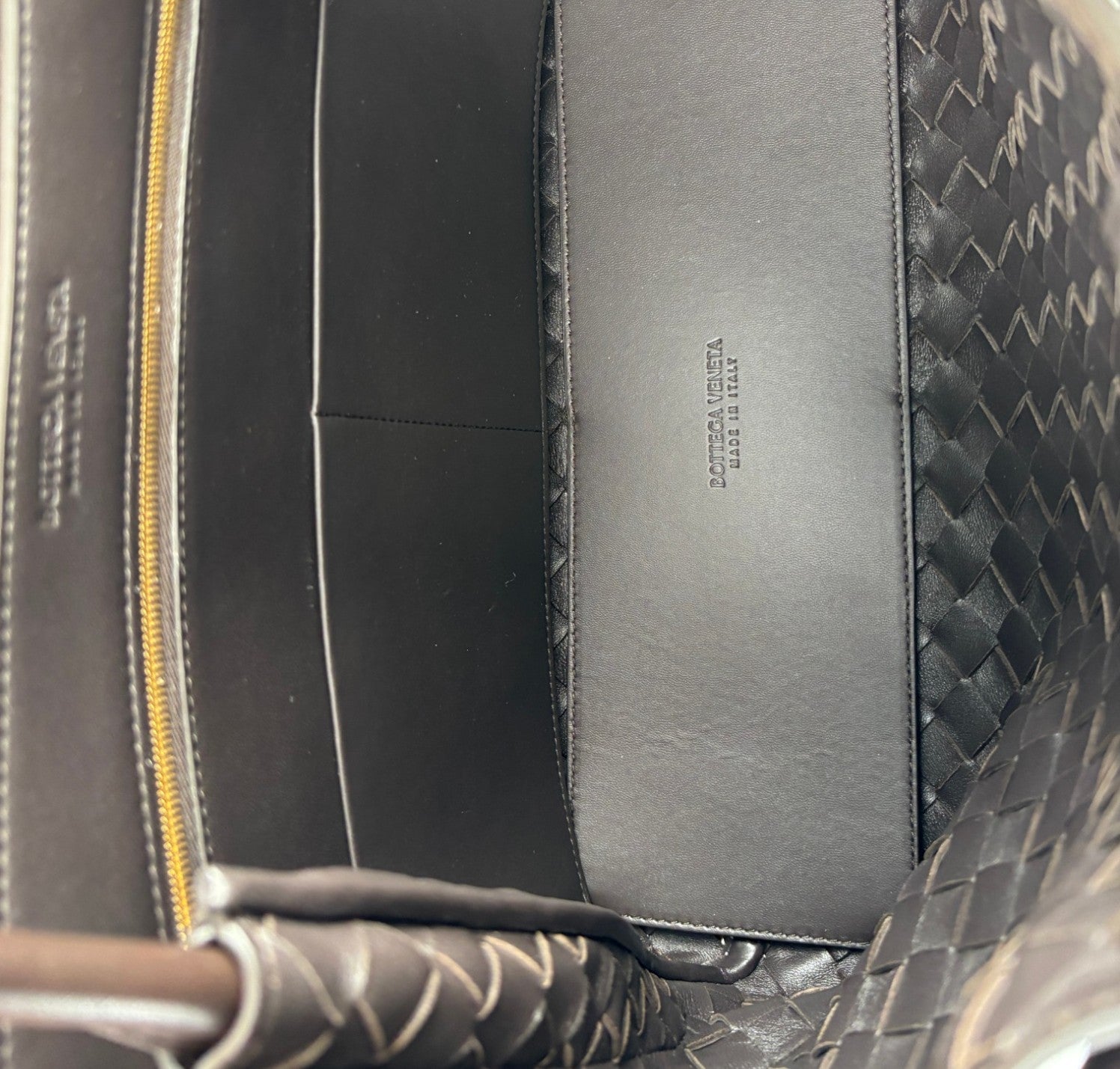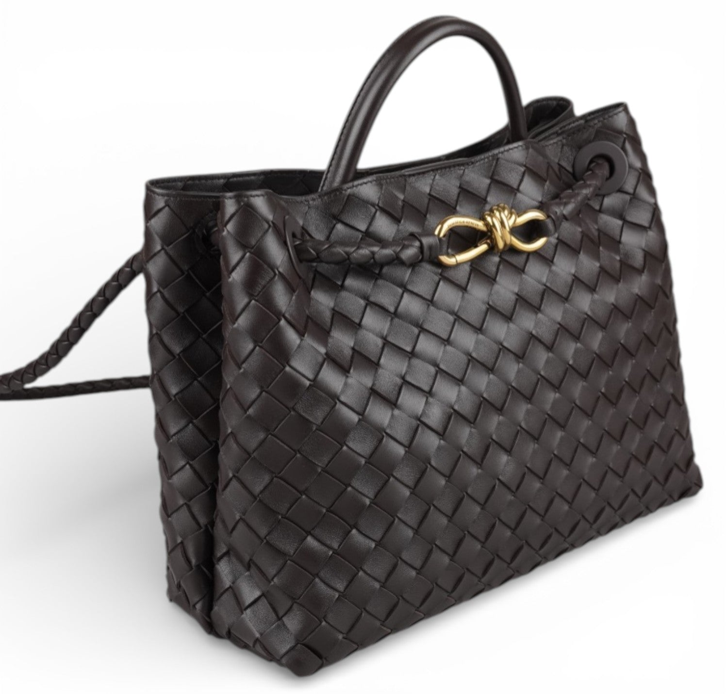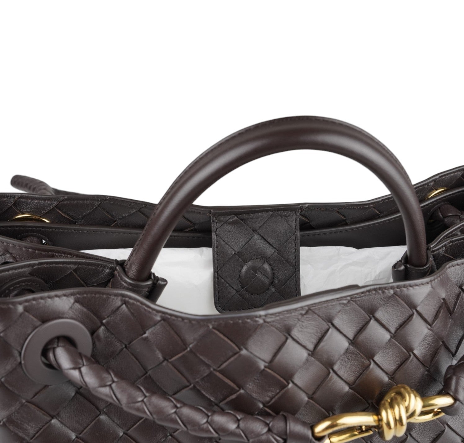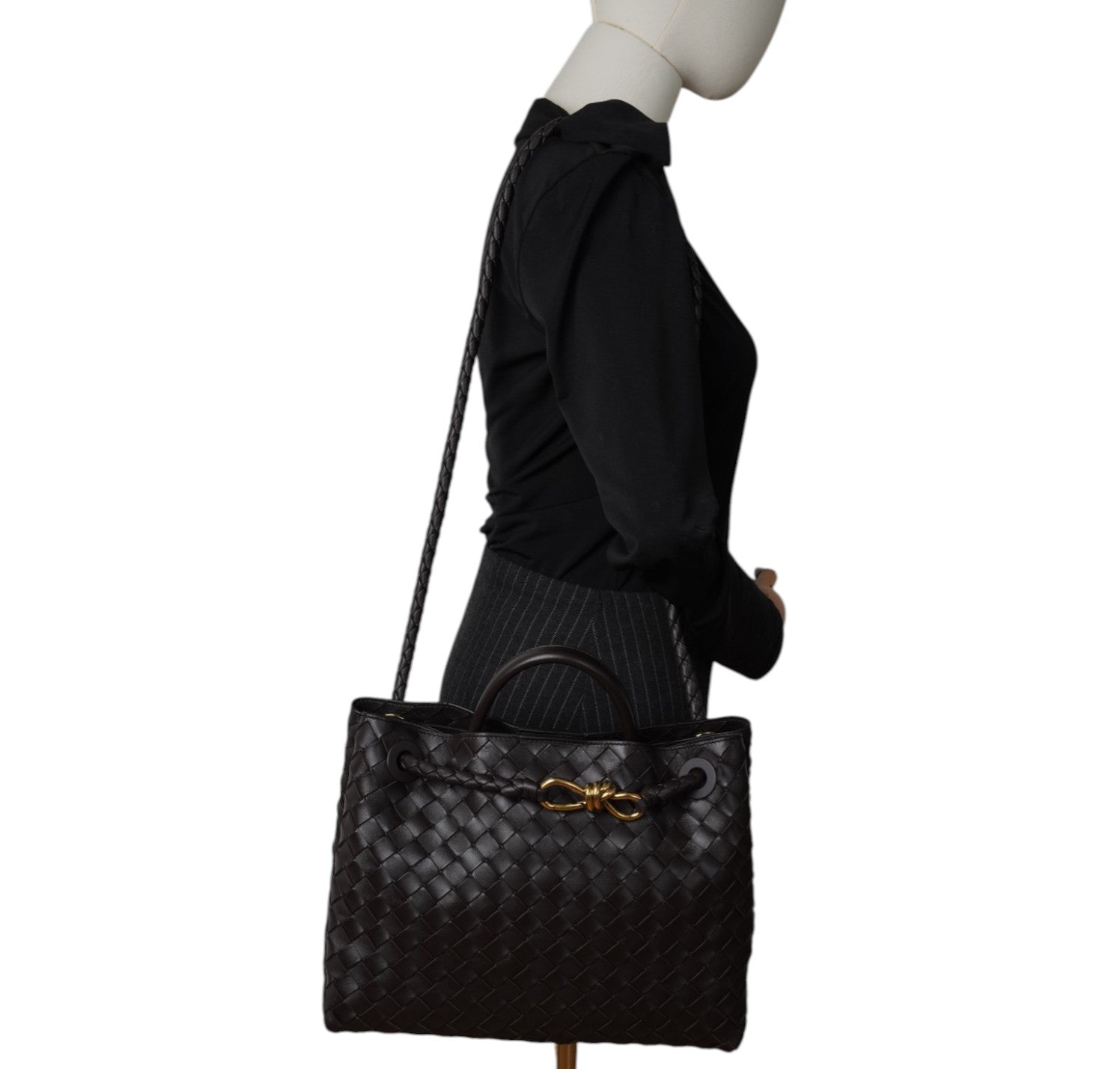 Borsa Bottega Veneta, modello Andiamo, misura Media realizzata in pelle Fondant (Marrone Scuro Cioccolato). Dettagli iconici con inserti intrecciati e chiusura superiore regolata da cordoncino in pelle intrecciata. Finiture in metallo color Oro, impreziosite dal nodo apribile "Andiamo". Pari al nuovo. Potrebbe presentare micro segni di stoccaggio. Retail €4.800. Luce manico: 9 cm, luce tracolla: 45 cm. Full set, ottima idea regalo.