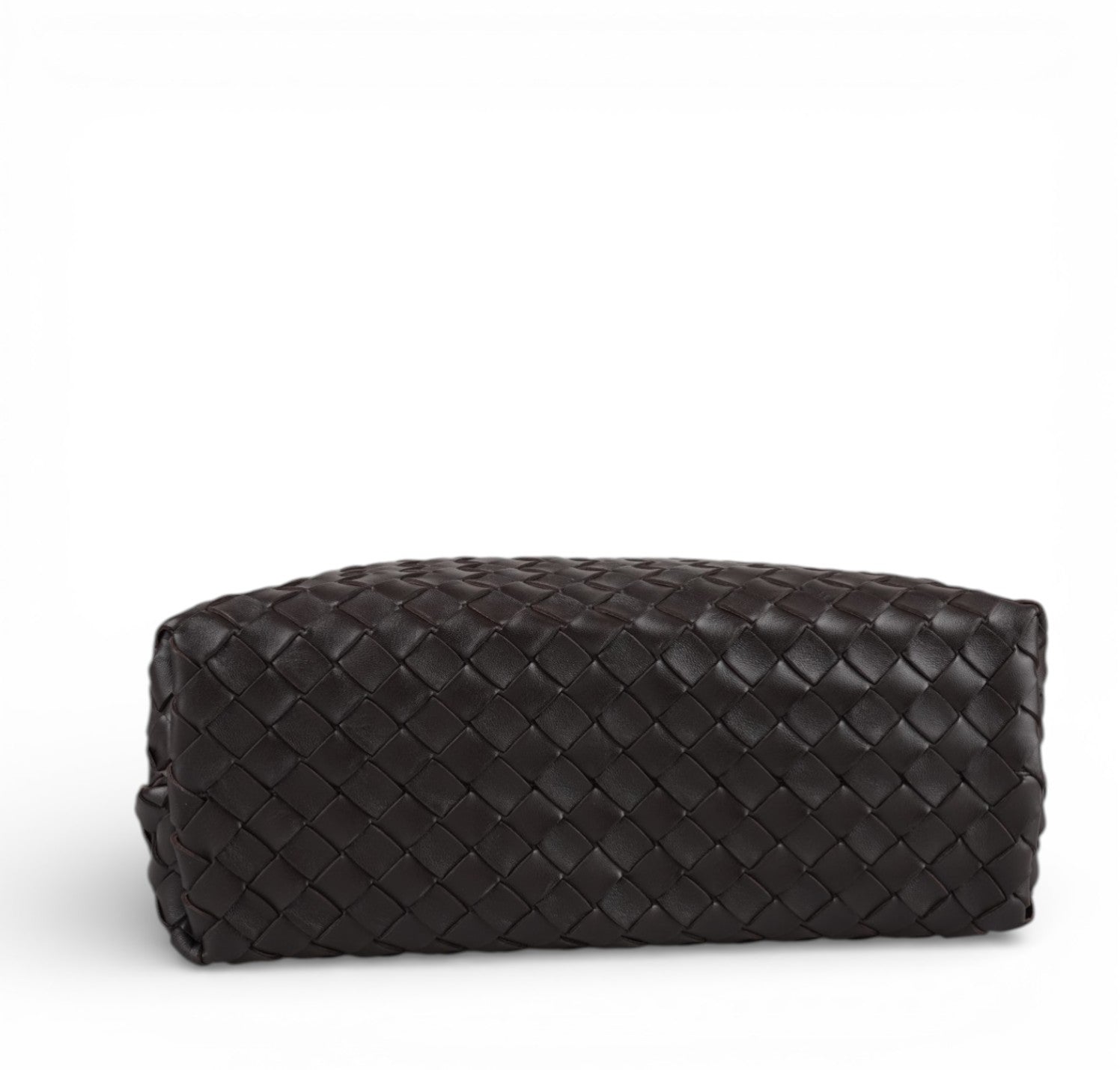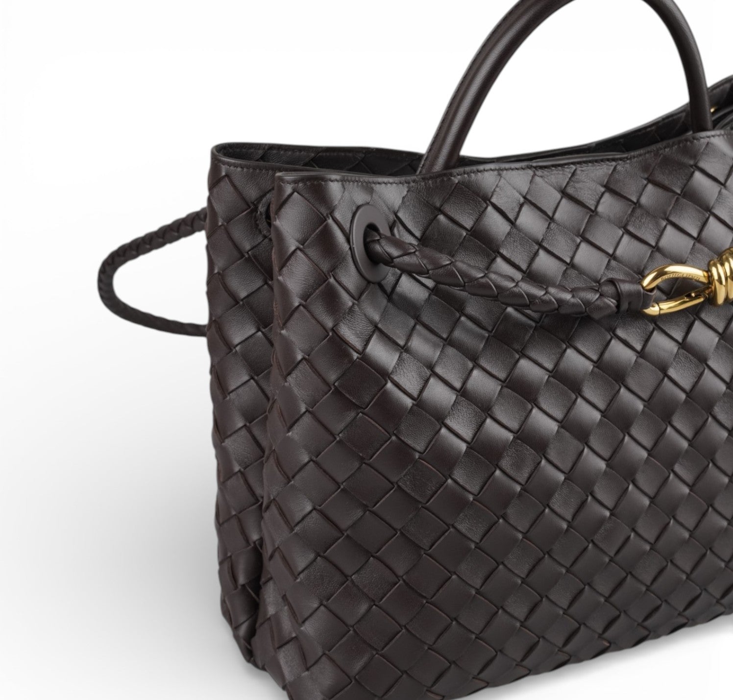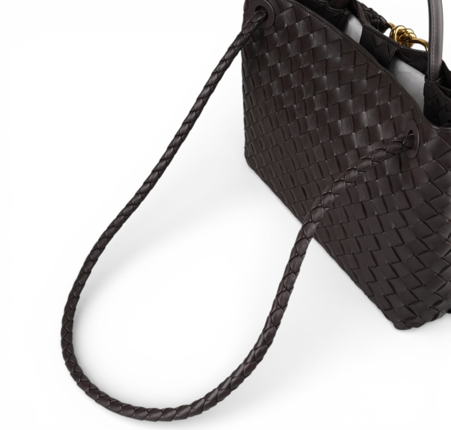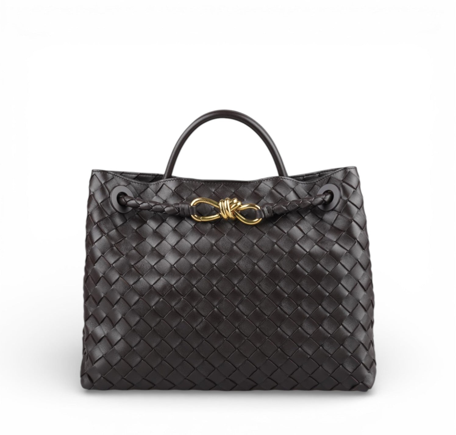 Borsa Bottega Veneta, modello Andiamo, misura Media realizzata in pelle Fondant (Marrone Scuro Cioccolato). Dettagli iconici con inserti intrecciati e chiusura superiore regolata da cordoncino in pelle intrecciata. Finiture in metallo color Oro, impreziosite dal nodo apribile "Andiamo". Pari al nuovo. Potrebbe presentare micro segni di stoccaggio. Retail €4.800. Luce manico: 9 cm, luce tracolla: 45 cm. Full set, ottima idea regalo.