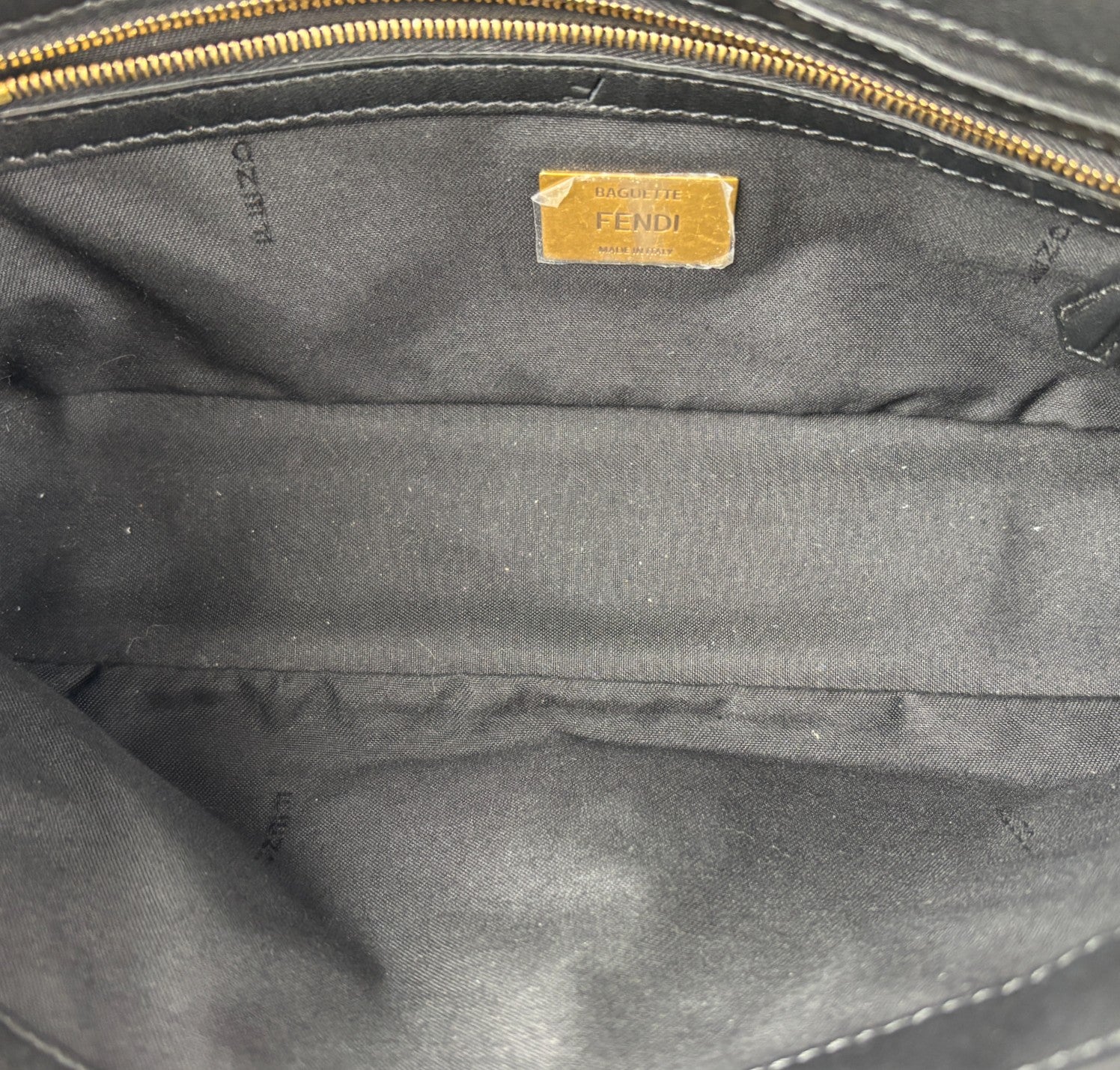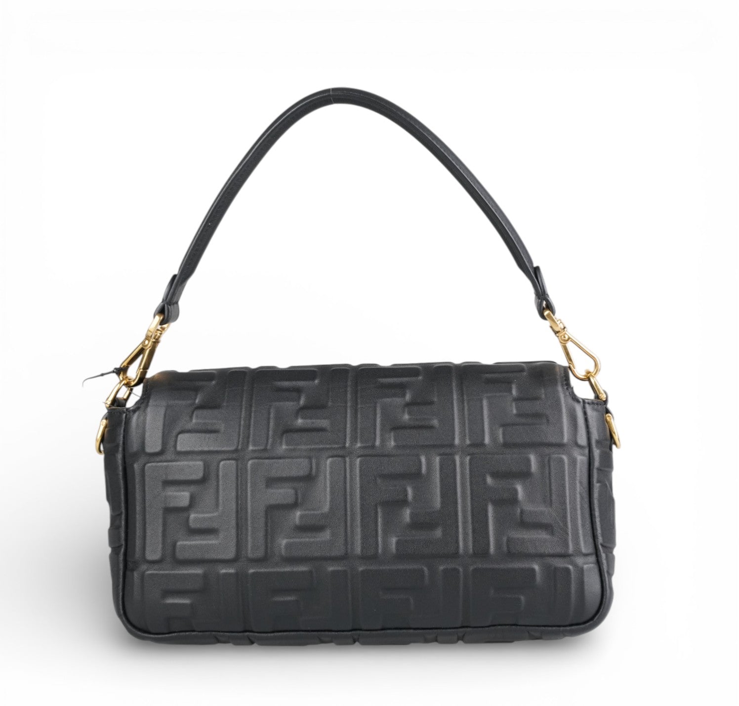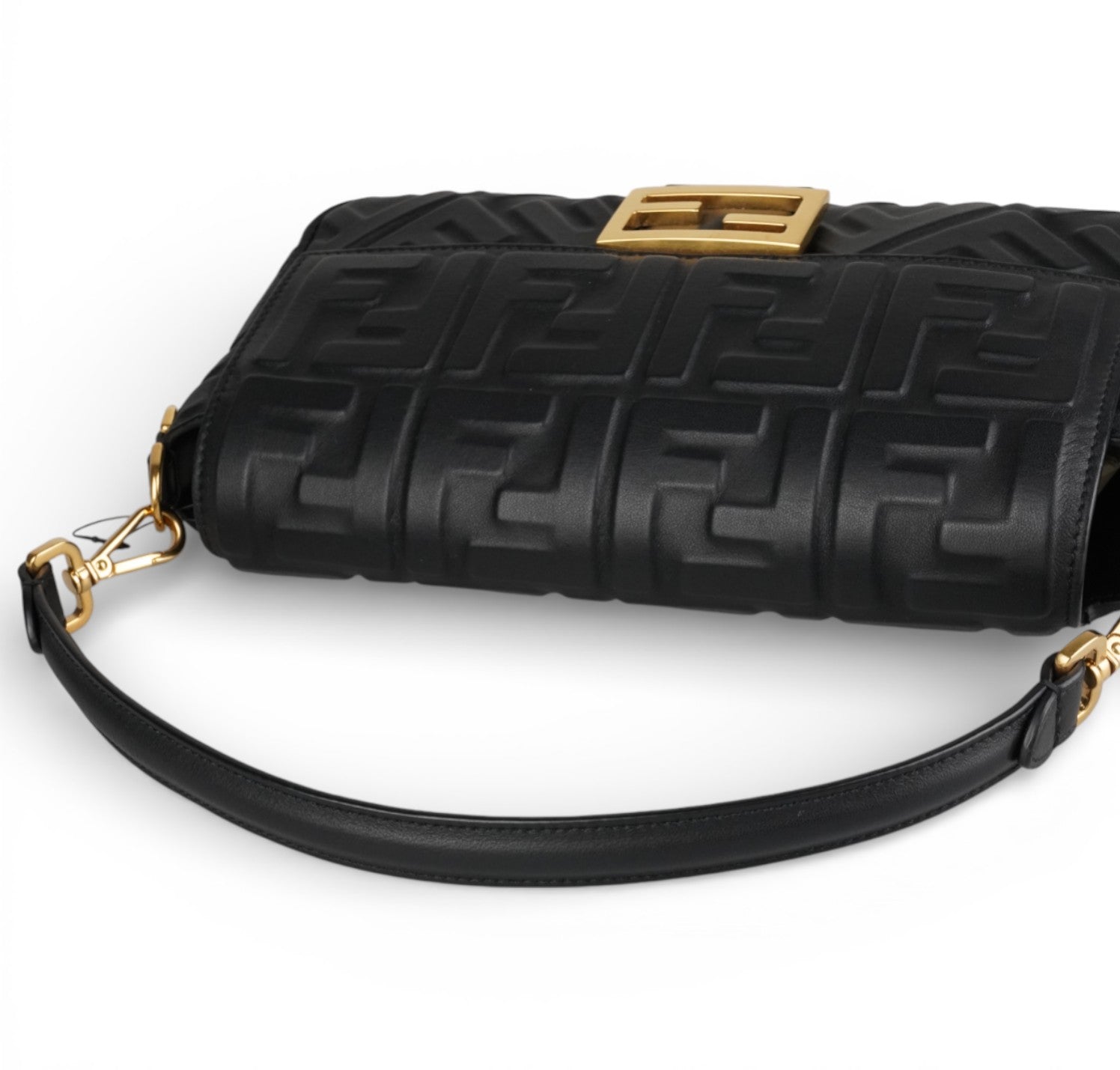 Borsa a spalla Fendi, modello Baguette, misura media, realizzata in morbida nappa Nera impreziosita da monogram FF in rilievo. Metalleria color Oro effetto anticato. Chiusura magnetica posta su patta frontale, caratterizzata dall'iconico logo. Interni foderati in tessuto nero, tasca con zip. Presenti due tracolle, entrambe amovibili, per personalizzarne l'utilizzo a mano, a spalla o crossbody. Inutilizzata con micro graffi di stoccaggio su logo FF, generali, stamp interno.