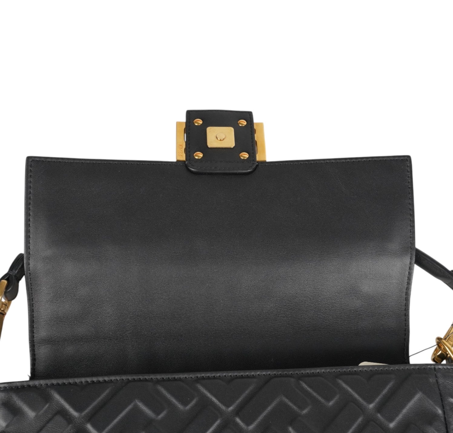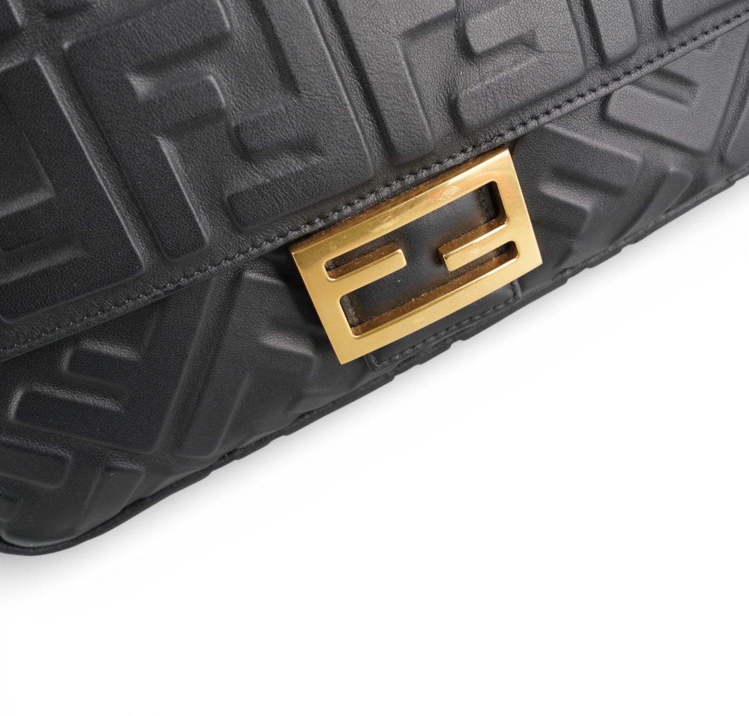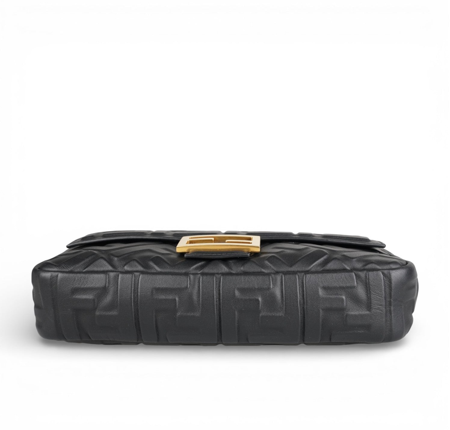 Borsa a spalla Fendi, modello Baguette, misura media, realizzata in morbida nappa Nera impreziosita da monogram FF in rilievo. Metalleria color Oro effetto anticato. Chiusura magnetica posta su patta frontale, caratterizzata dall'iconico logo. Interni foderati in tessuto nero, tasca con zip. Presenti due tracolle, entrambe amovibili, per personalizzarne l'utilizzo a mano, a spalla o crossbody. Inutilizzata con micro graffi di stoccaggio su logo FF, generali, stamp interno.