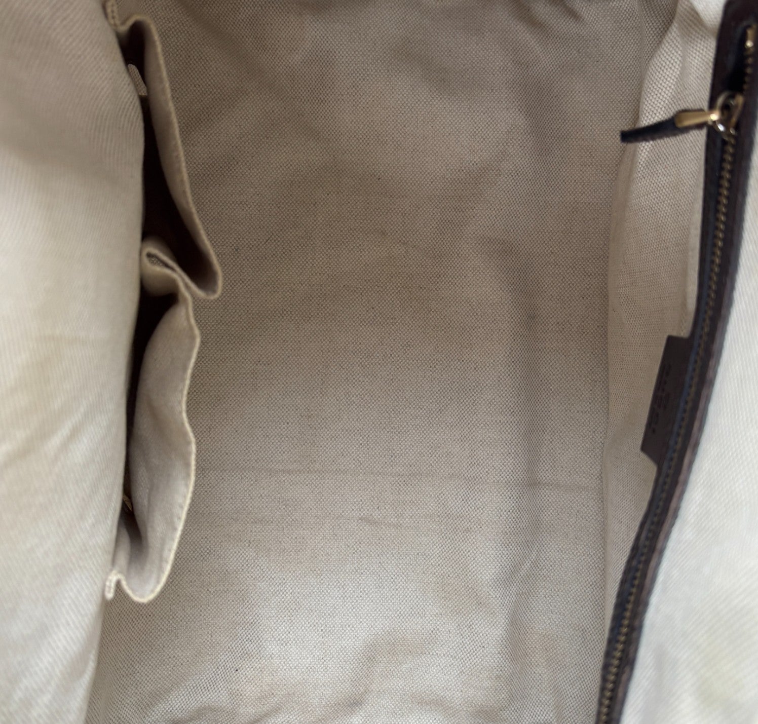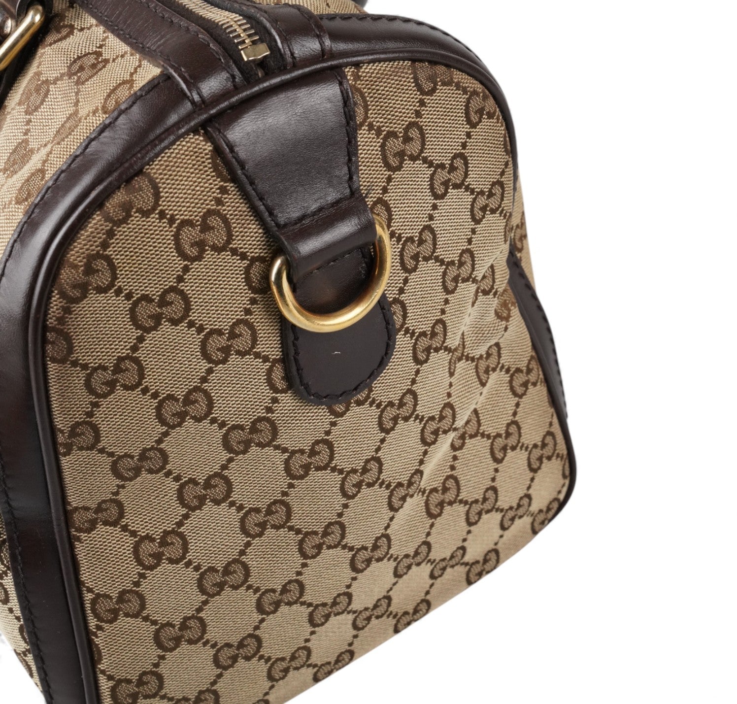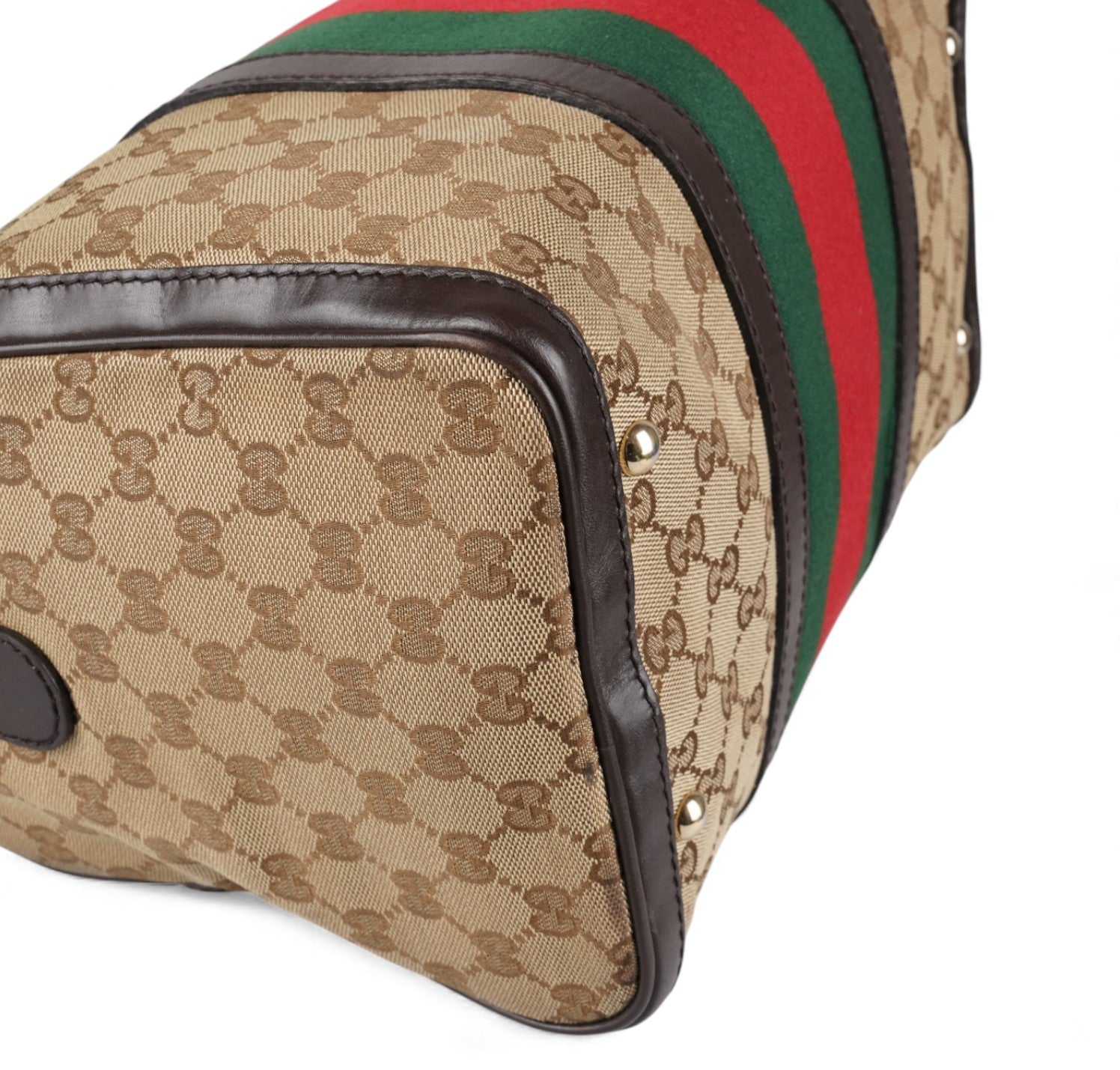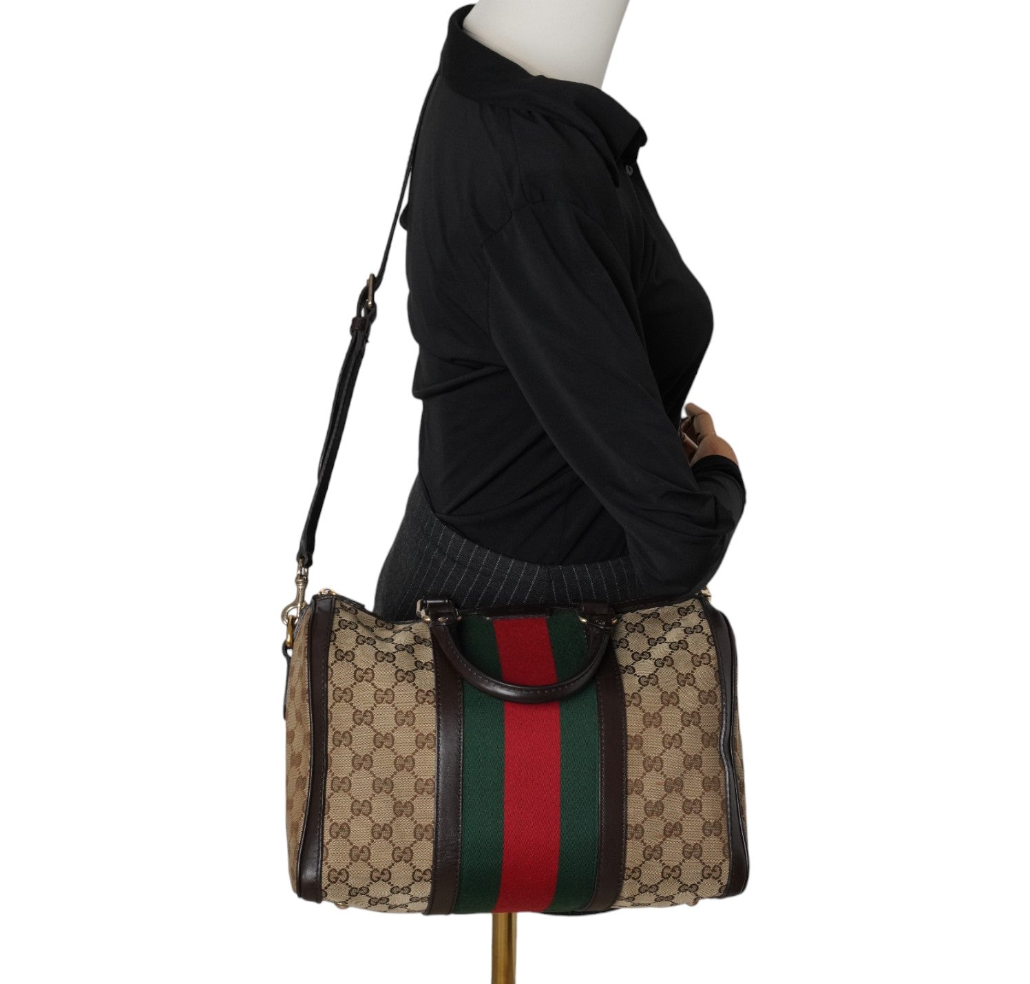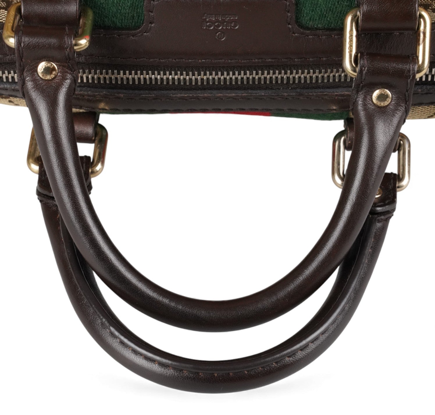 Borsa Gucci, modello Boston, realizzata in Tela GG Beige con Monogram GG a contrasto, color Ebano. Impreziosita da fascia Web centrale nei toni del Rosso e Verde. Dettagli in Pelle Marrone. Metalleria color Oro. Munita di manici superiori per il trasporto a mano. Tracolla amovibile e regolabile per il trasporto a spalla o bandoliera. Internamente foderata in tela Beige, con comode tasche applicate. Chiusura superiore con cerniera. Lievi segni d'uso generali. Lievi micro graffi su pelle e metalleria. Normali segni del tempo.
