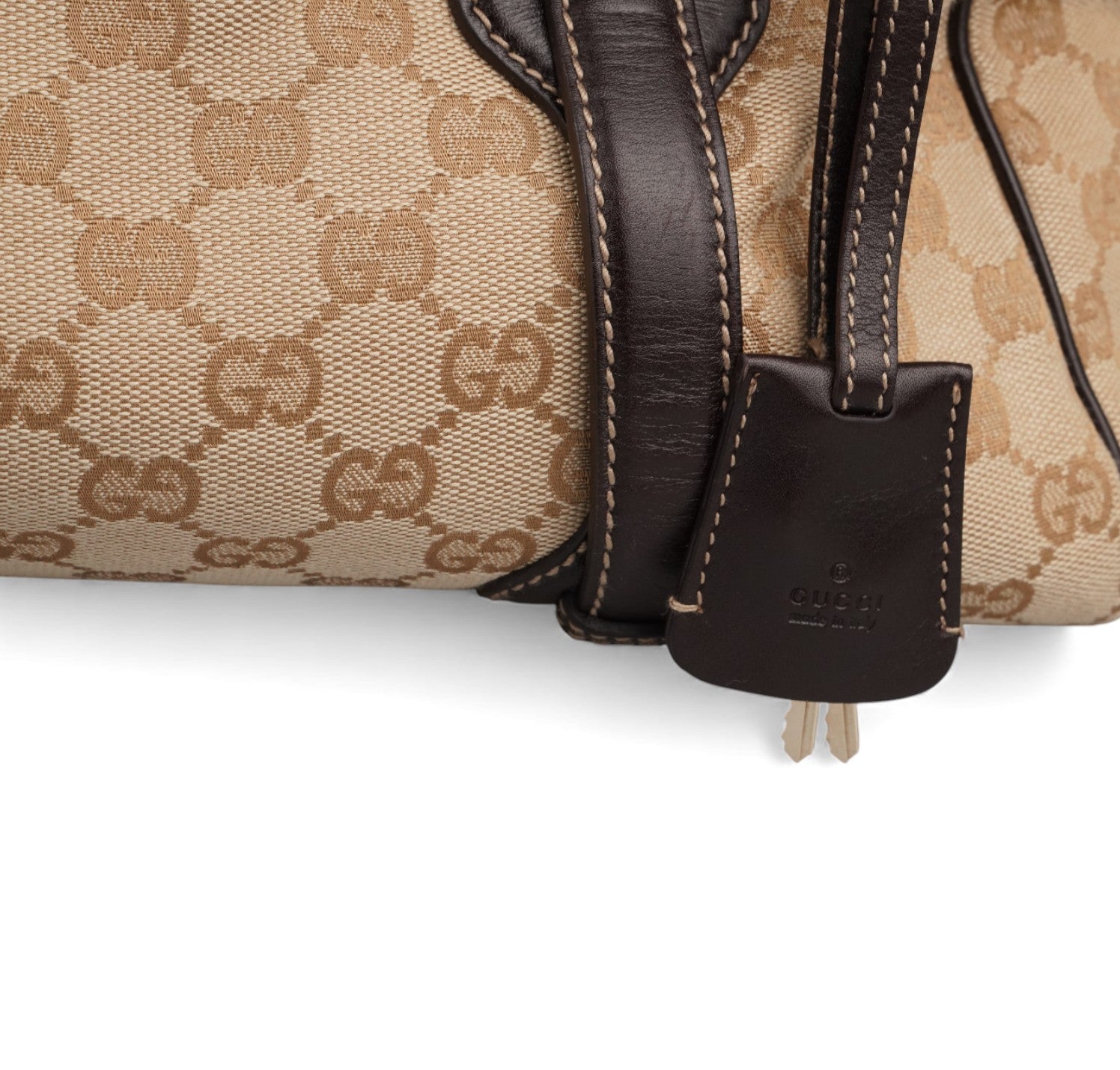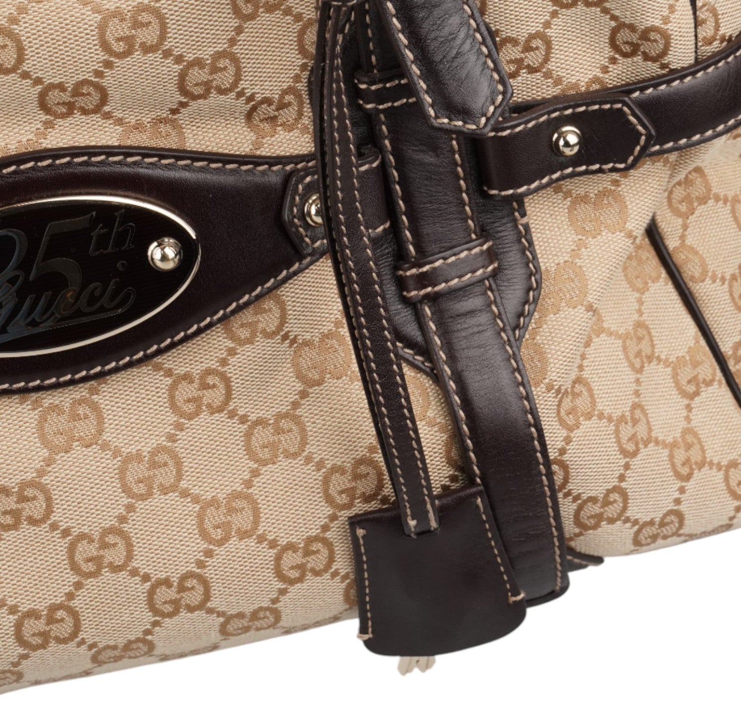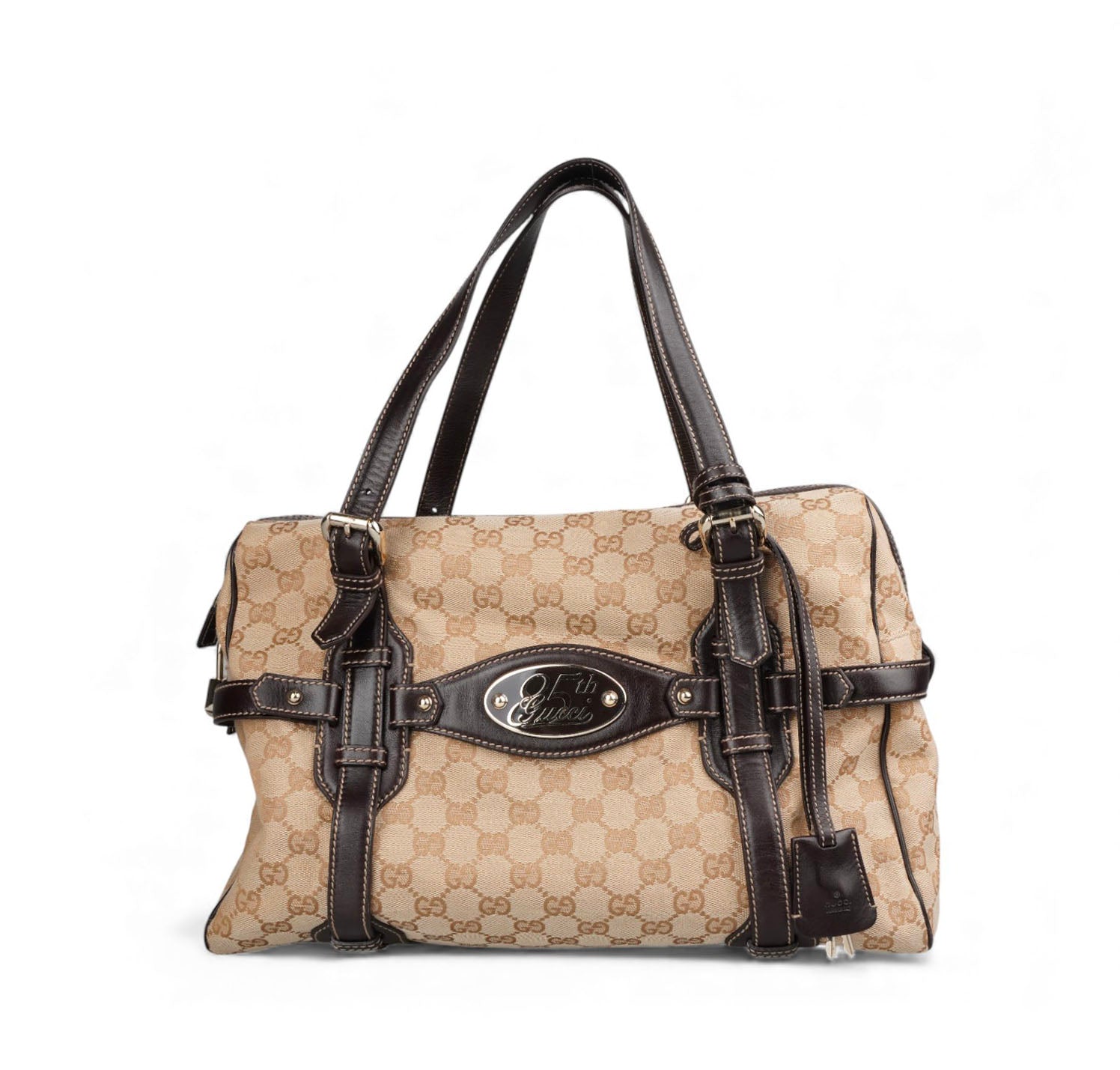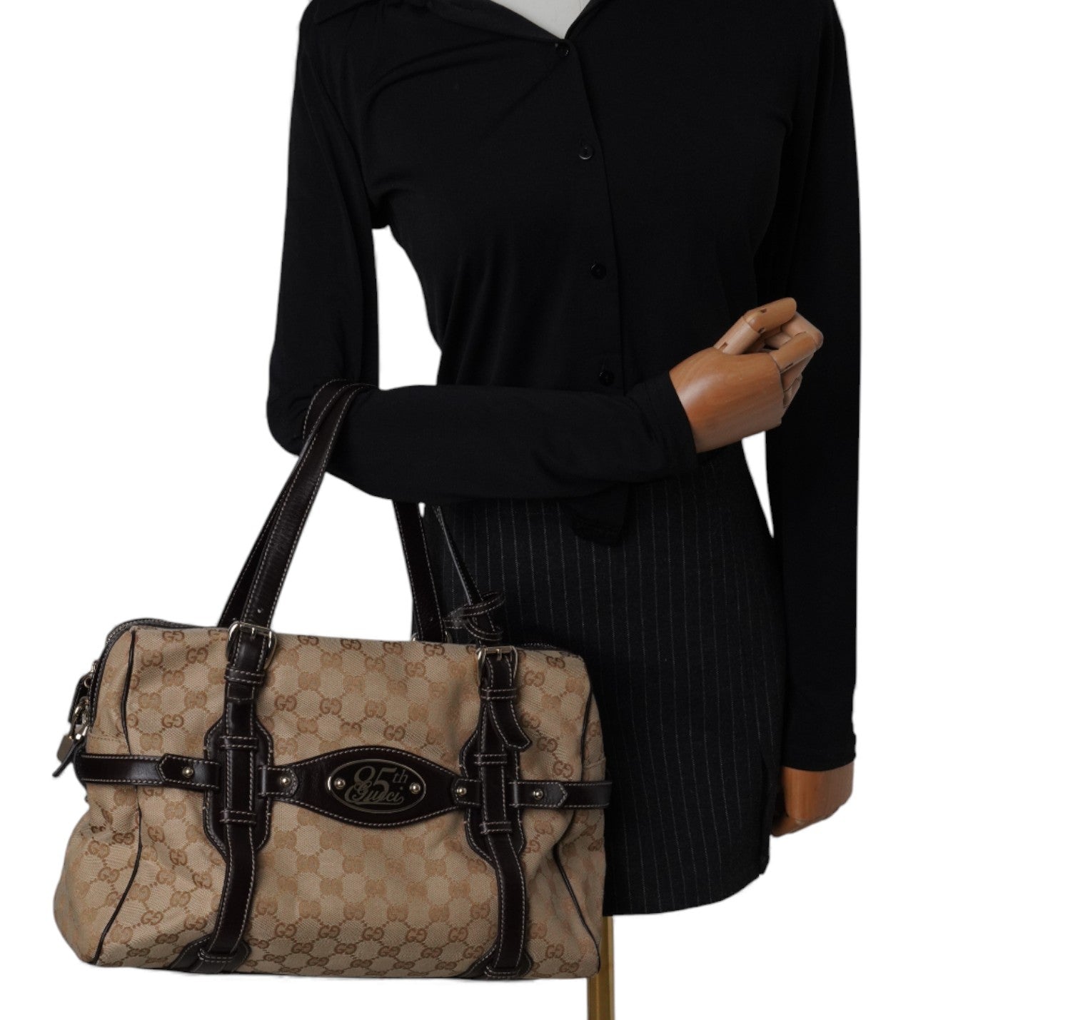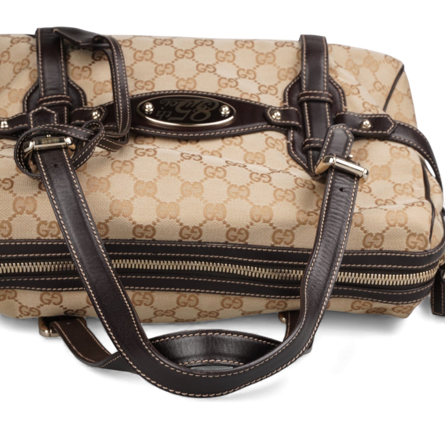 Borsa Gucci, modello Boston collezione limitata 85th Anniversary, realizzata in tela GG Monogram Beige con dettagli e finiture in Pelle Marrone. Placca metallica frontale dedicata all’anniversario, elemento distintivo della capsule del 2006. Doppi manici in pelle, chiusura superiore con zip e interno foderato in tessuto dotato di pratici taschini. La base è rinforzata con inserti in pelle e piedini metallici protettivi. Condizioni ottime con micro segni d’uso generali.
