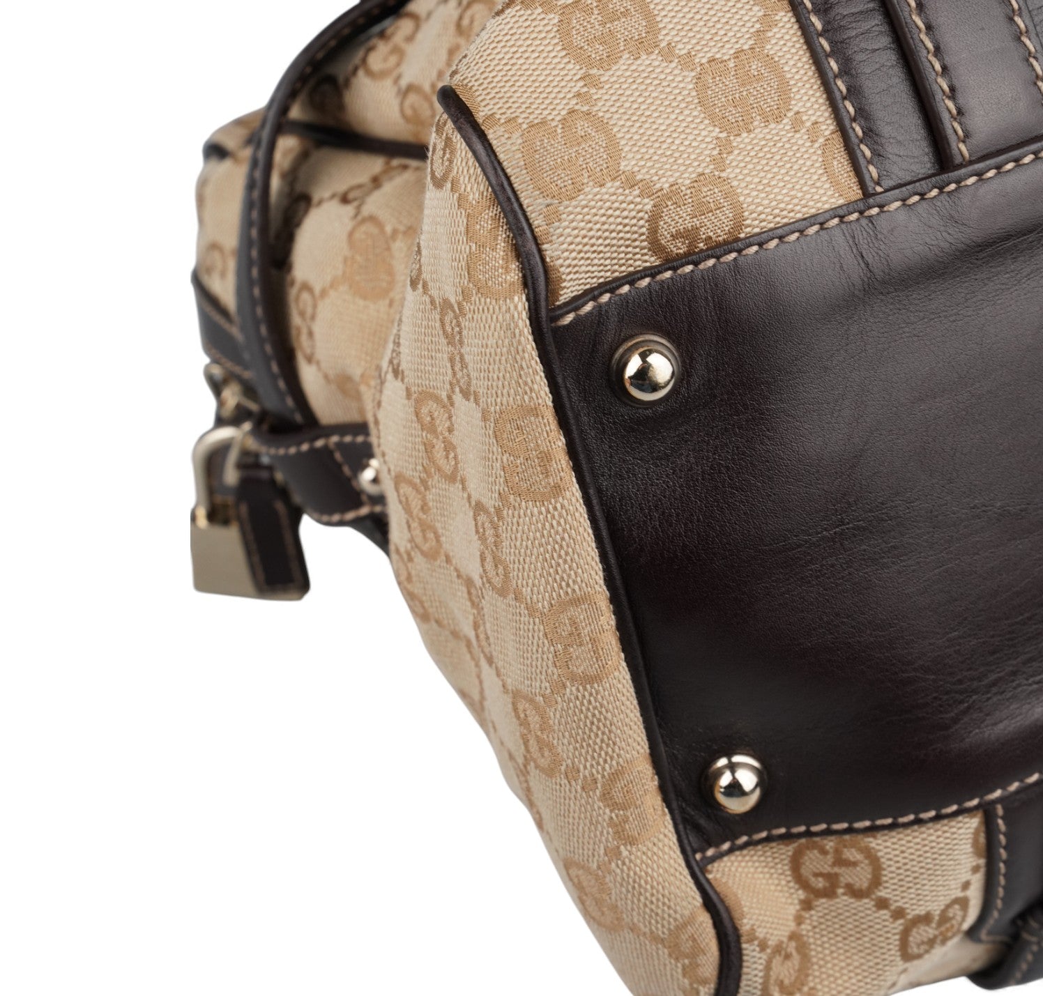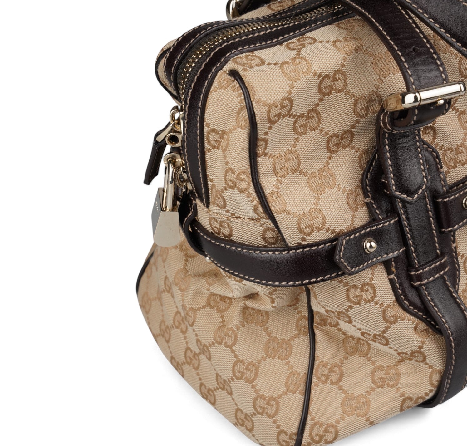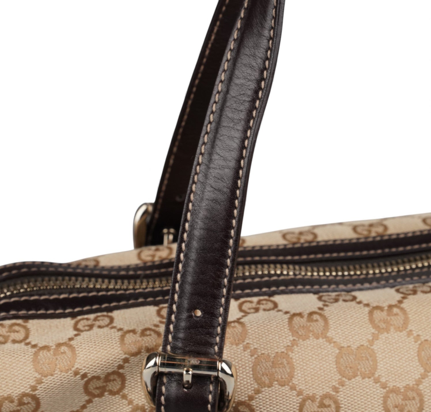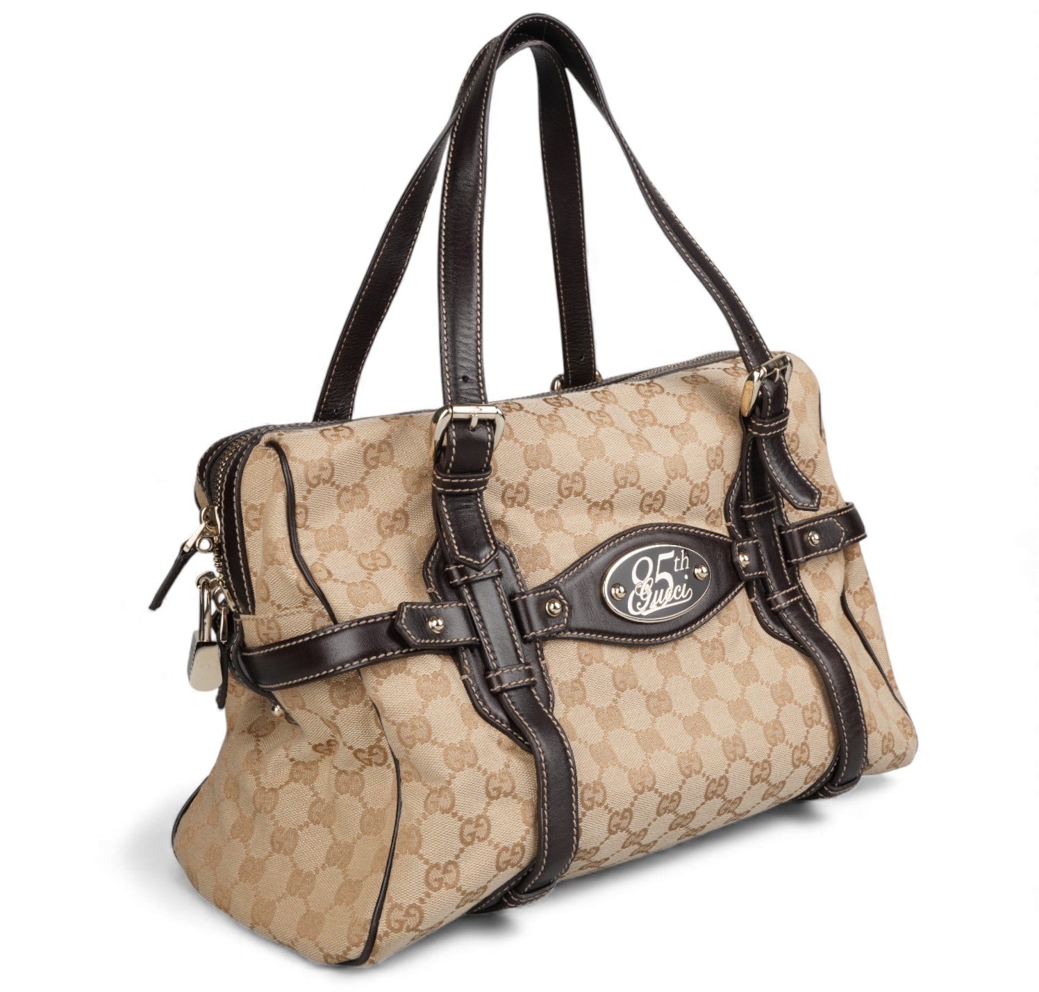 Borsa Gucci, modello Boston collezione limitata 85th Anniversary, realizzata in tela GG Monogram Beige con dettagli e finiture in Pelle Marrone. Placca metallica frontale dedicata all’anniversario, elemento distintivo della capsule del 2006. Doppi manici in pelle, chiusura superiore con zip e interno foderato in tessuto dotato di pratici taschini. La base è rinforzata con inserti in pelle e piedini metallici protettivi. Condizioni ottime con micro segni d’uso generali.