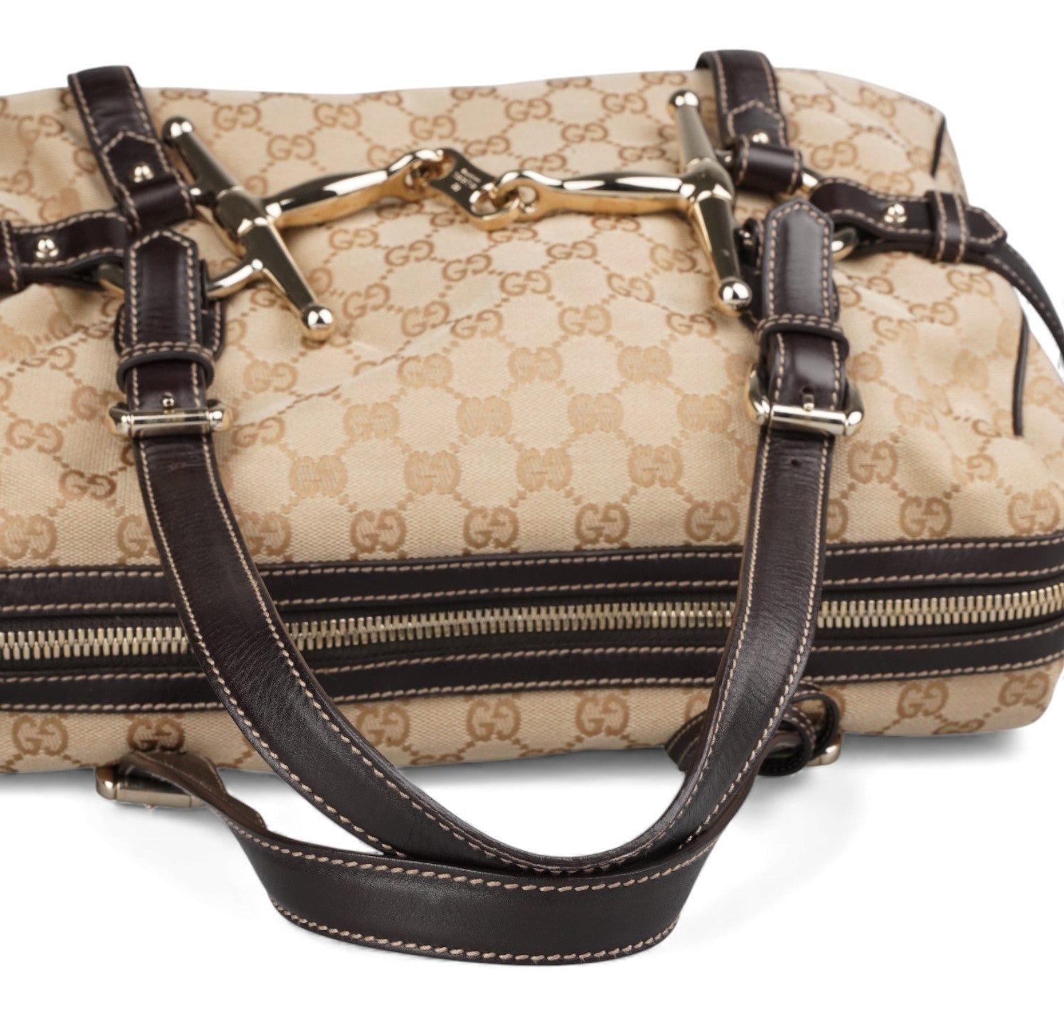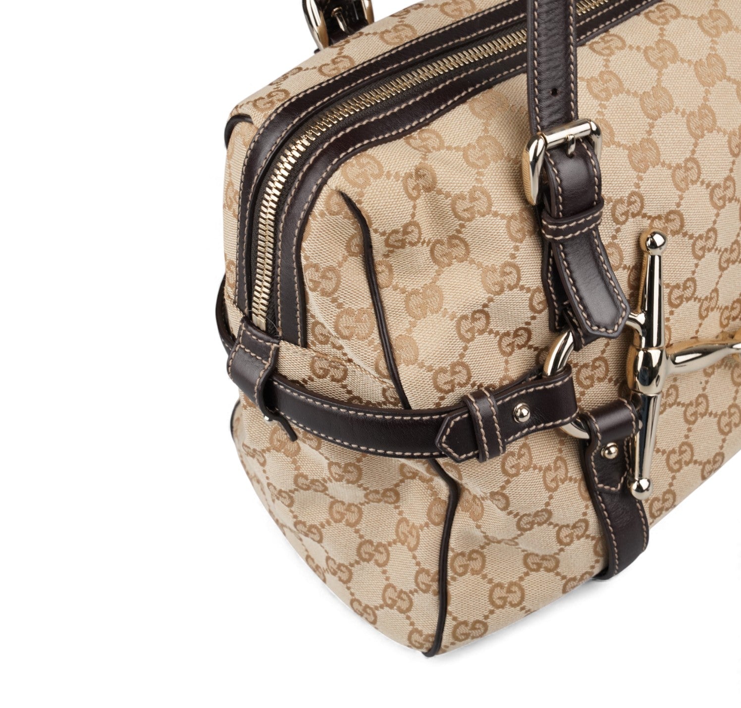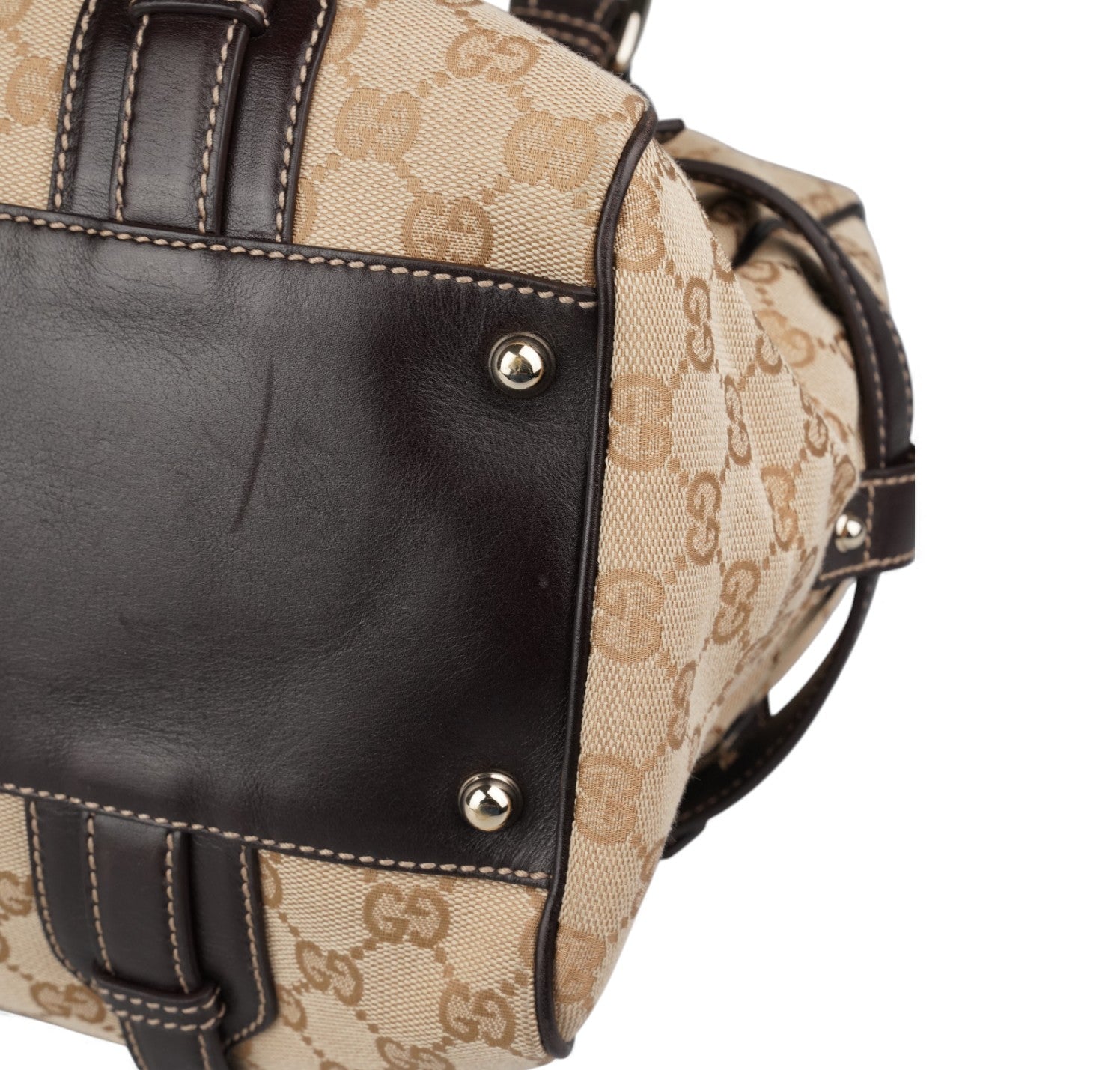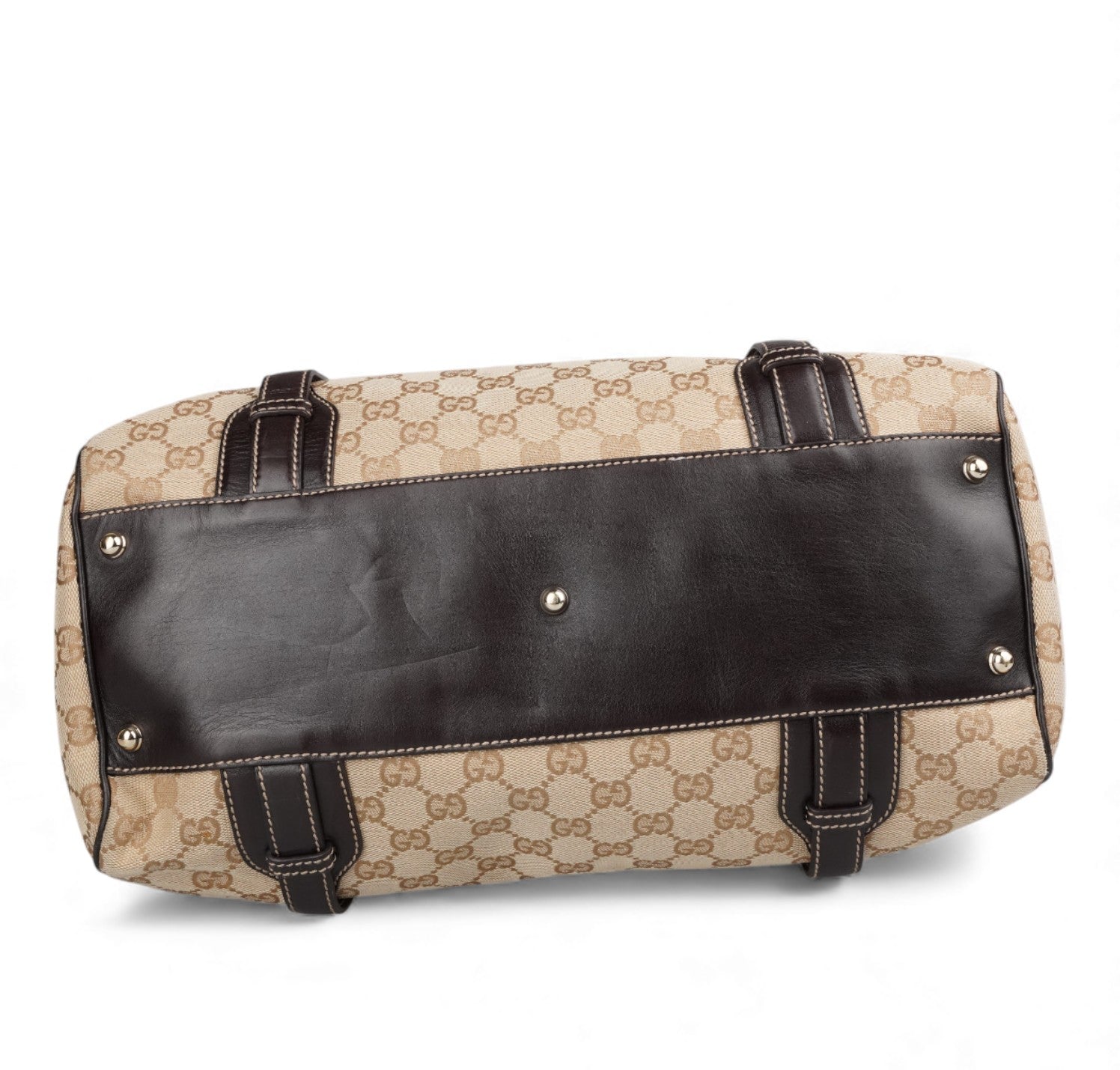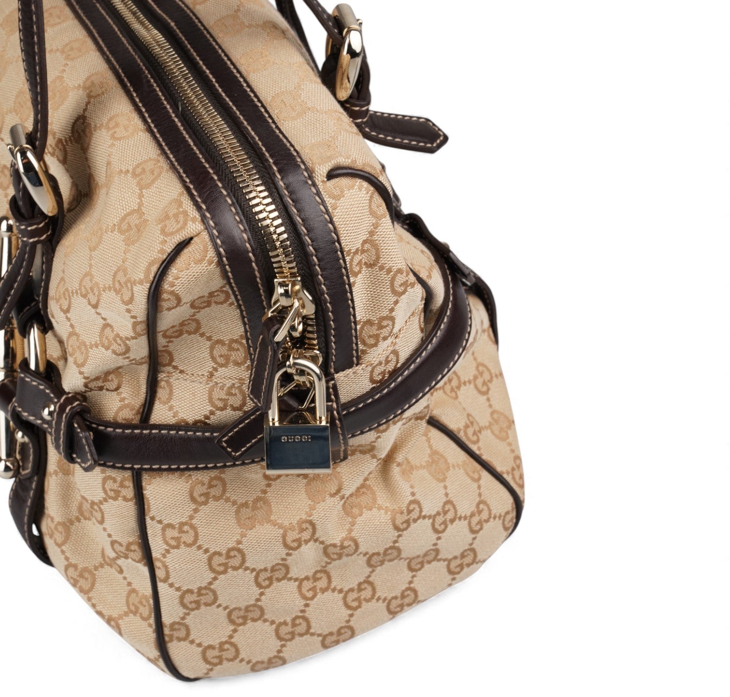 Borsa Gucci, modello Boston collezione limitata 85th Anniversary, realizzata in tela GG Monogram Beige con dettagli e finiture in Pelle Marrone. Placca metallica frontale dedicata all’anniversario, elemento distintivo della capsule del 2006. Doppi manici in pelle, chiusura superiore con zip e interno foderato in tessuto dotato di pratici taschini. La base è rinforzata con inserti in pelle e piedini metallici protettivi. Condizioni ottime con micro segni d’uso generali.