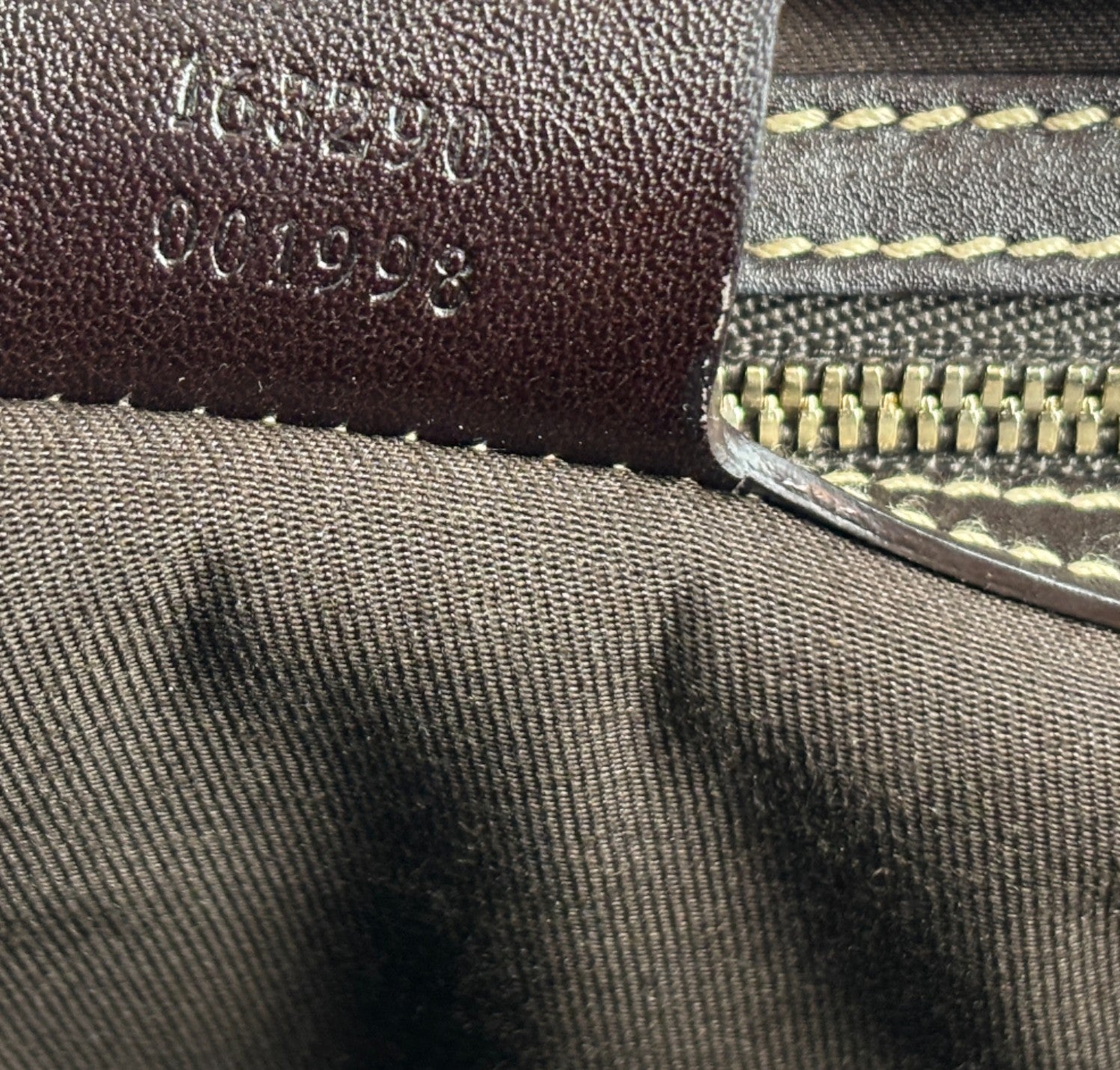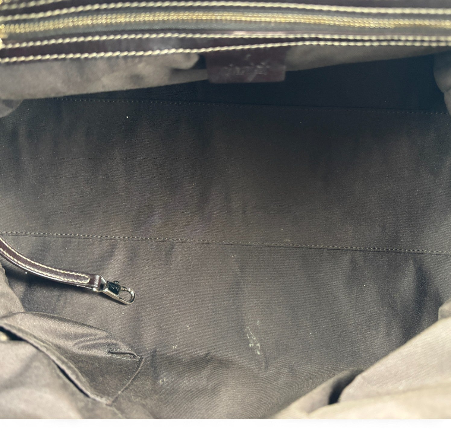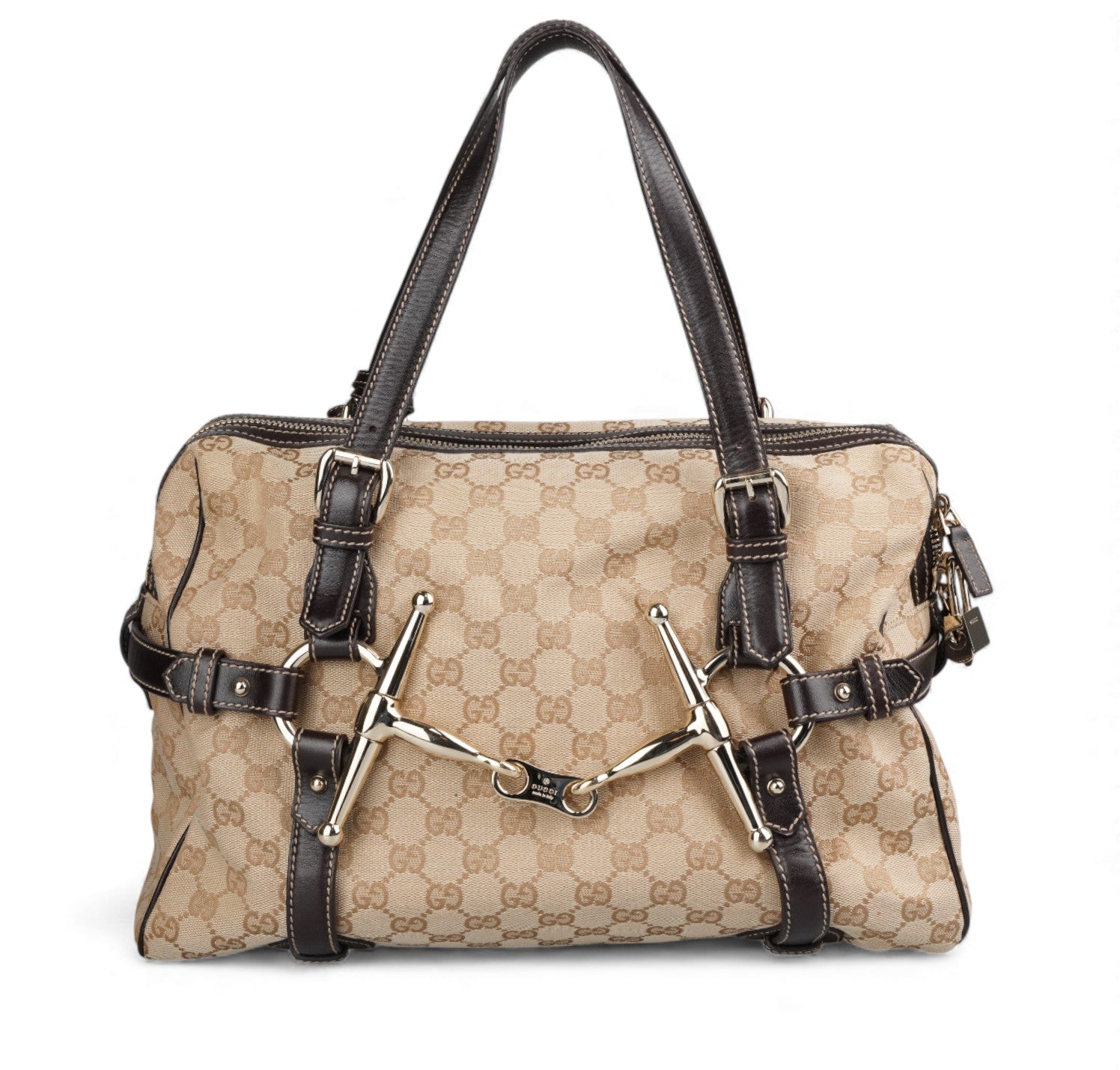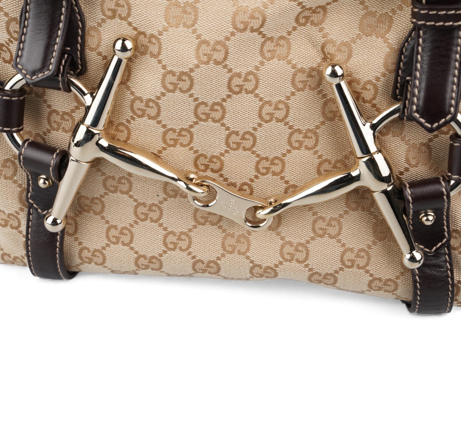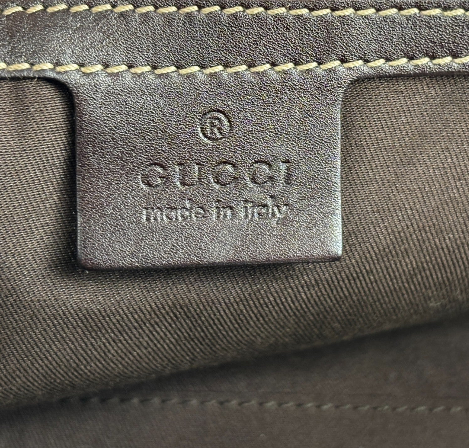 Borsa Gucci, modello Boston collezione limitata 85th Anniversary, realizzata in tela GG Monogram Beige con dettagli e finiture in Pelle Marrone. Placca metallica frontale dedicata all’anniversario, elemento distintivo della capsule del 2006. Doppi manici in pelle, chiusura superiore con zip e interno foderato in tessuto dotato di pratici taschini. La base è rinforzata con inserti in pelle e piedini metallici protettivi. Condizioni ottime con micro segni d’uso generali.
