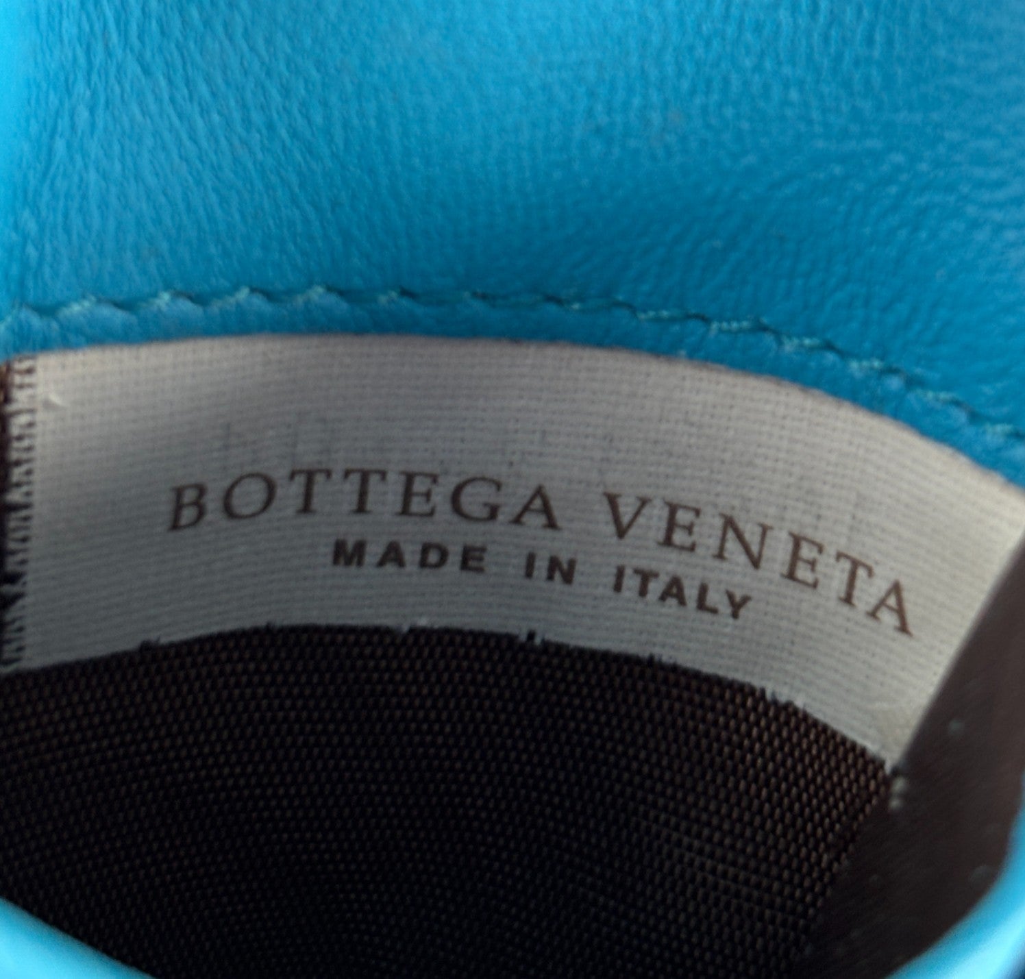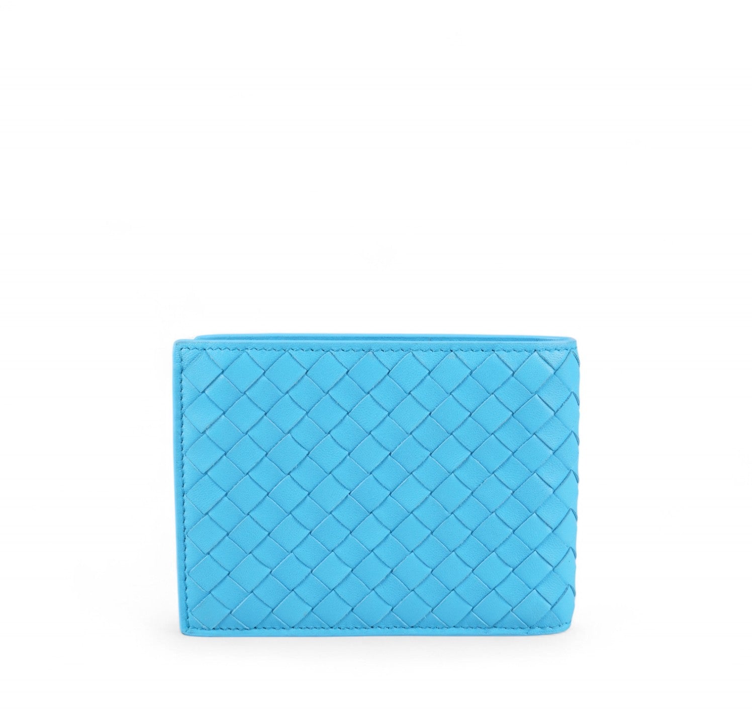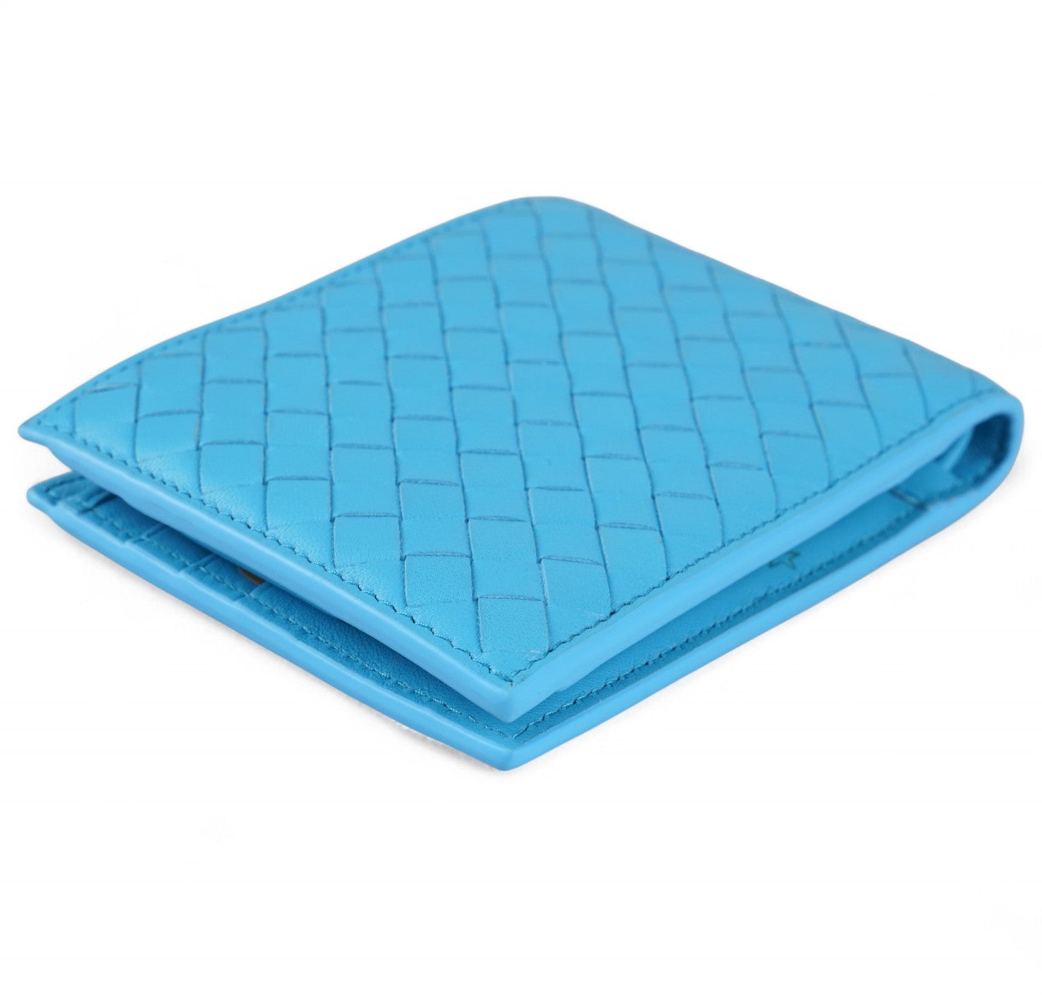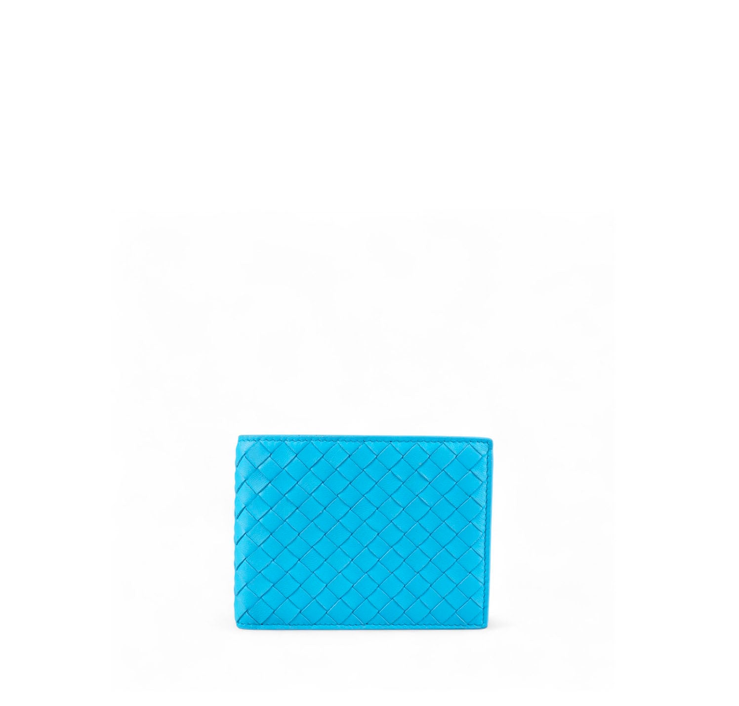 Portafoglio Bottega Veneta, modello Bifold, di produzione recente (non vintage), realizzato in morbida pelle con iconico motivo Intrecciato tonalità Bright Sky Blue (Azzurro Brillante). Interno con scomparti per banconote, tasca portamonete con bottone e slot per carte di credito. Tasche interne in pelle color Fango. Nuovo mai utilizzato, potrebbe presentare segni di stoccaggio. Perfetto anche come idea regalo.