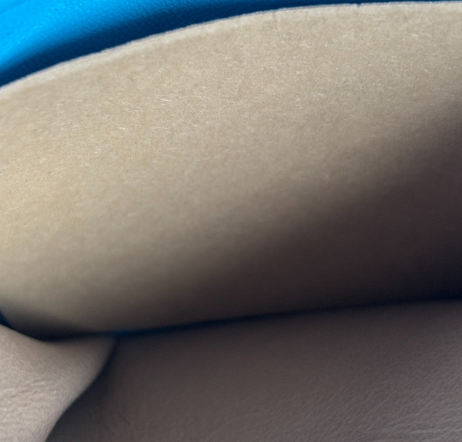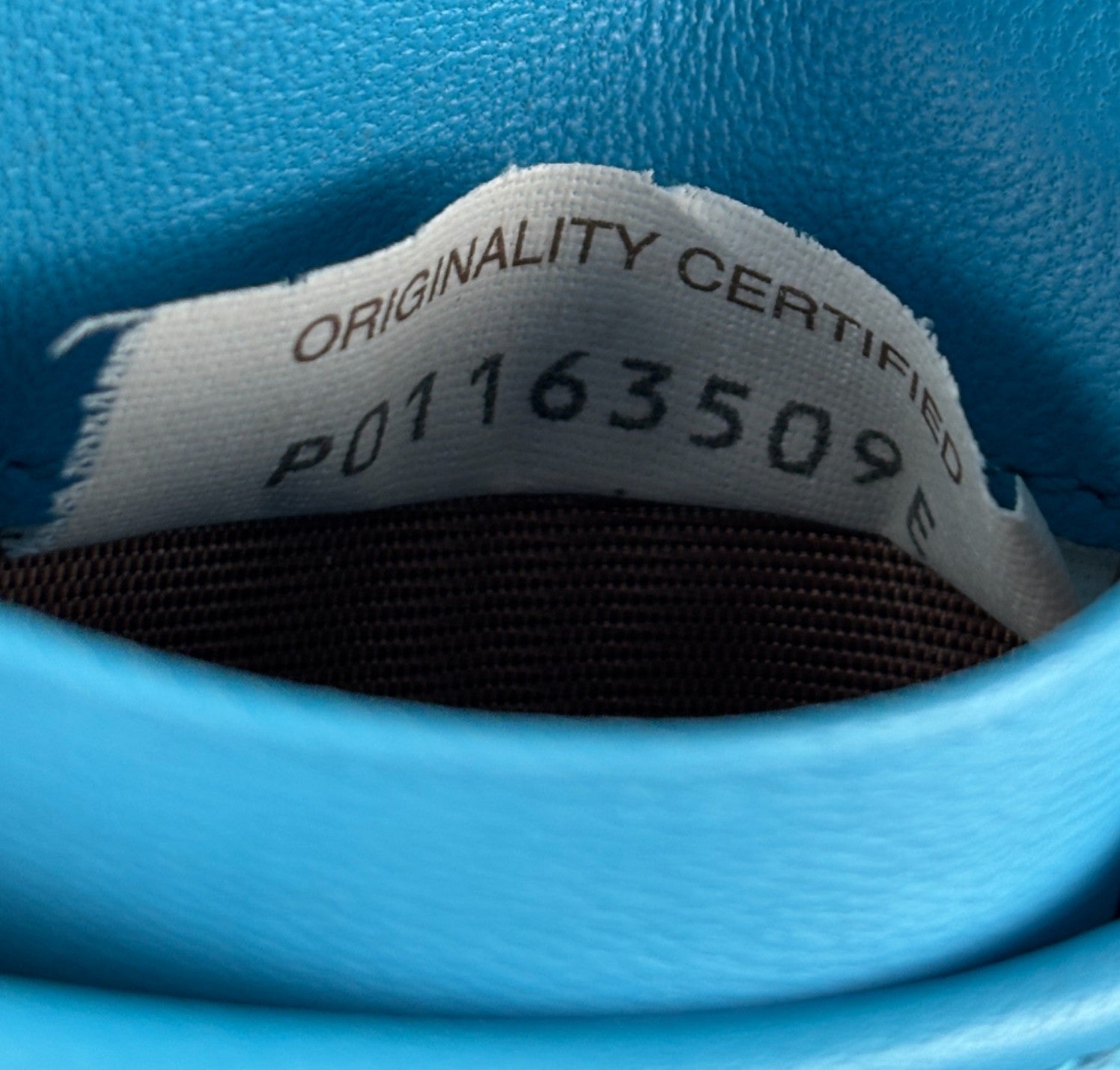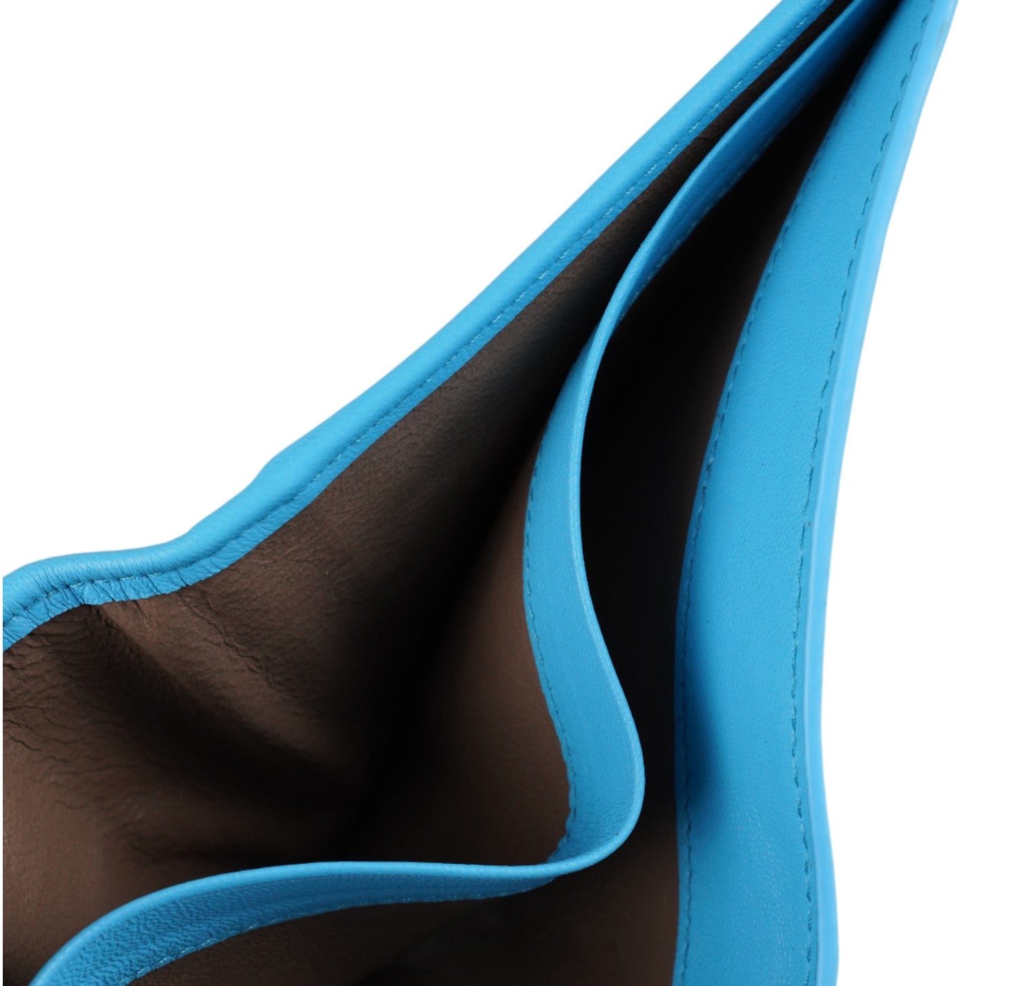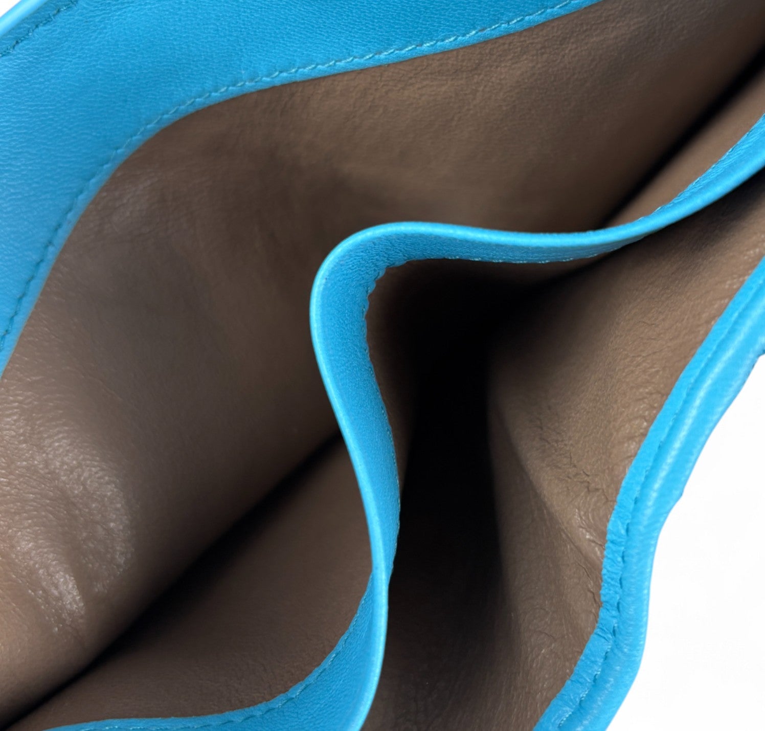 Portafoglio Bottega Veneta, modello Bifold, di produzione recente (non vintage), realizzato in morbida pelle con iconico motivo Intrecciato tonalità Bright Sky Blue (Azzurro Brillante). Interno con scomparti per banconote, tasca portamonete con bottone e slot per carte di credito. Tasche interne in pelle color Fango. Nuovo mai utilizzato, potrebbe presentare segni di stoccaggio. Perfetto anche come idea regalo.