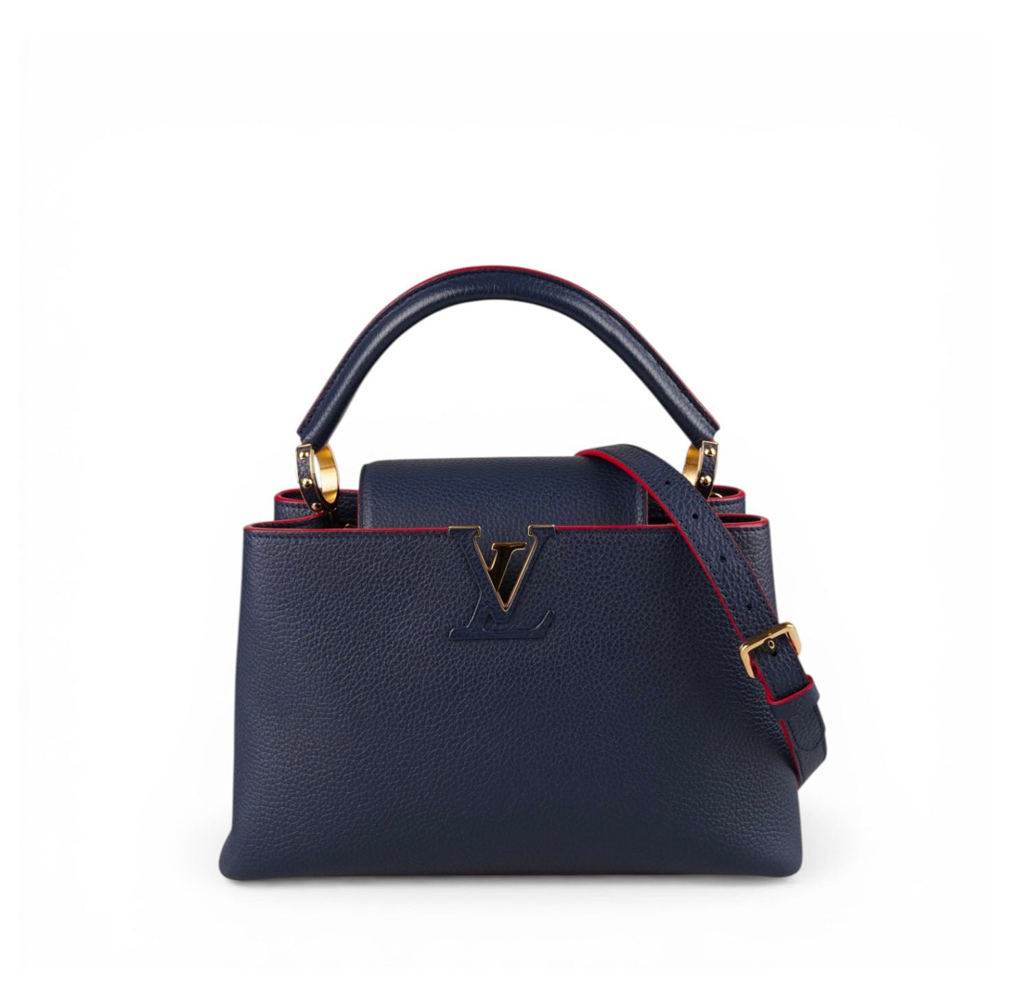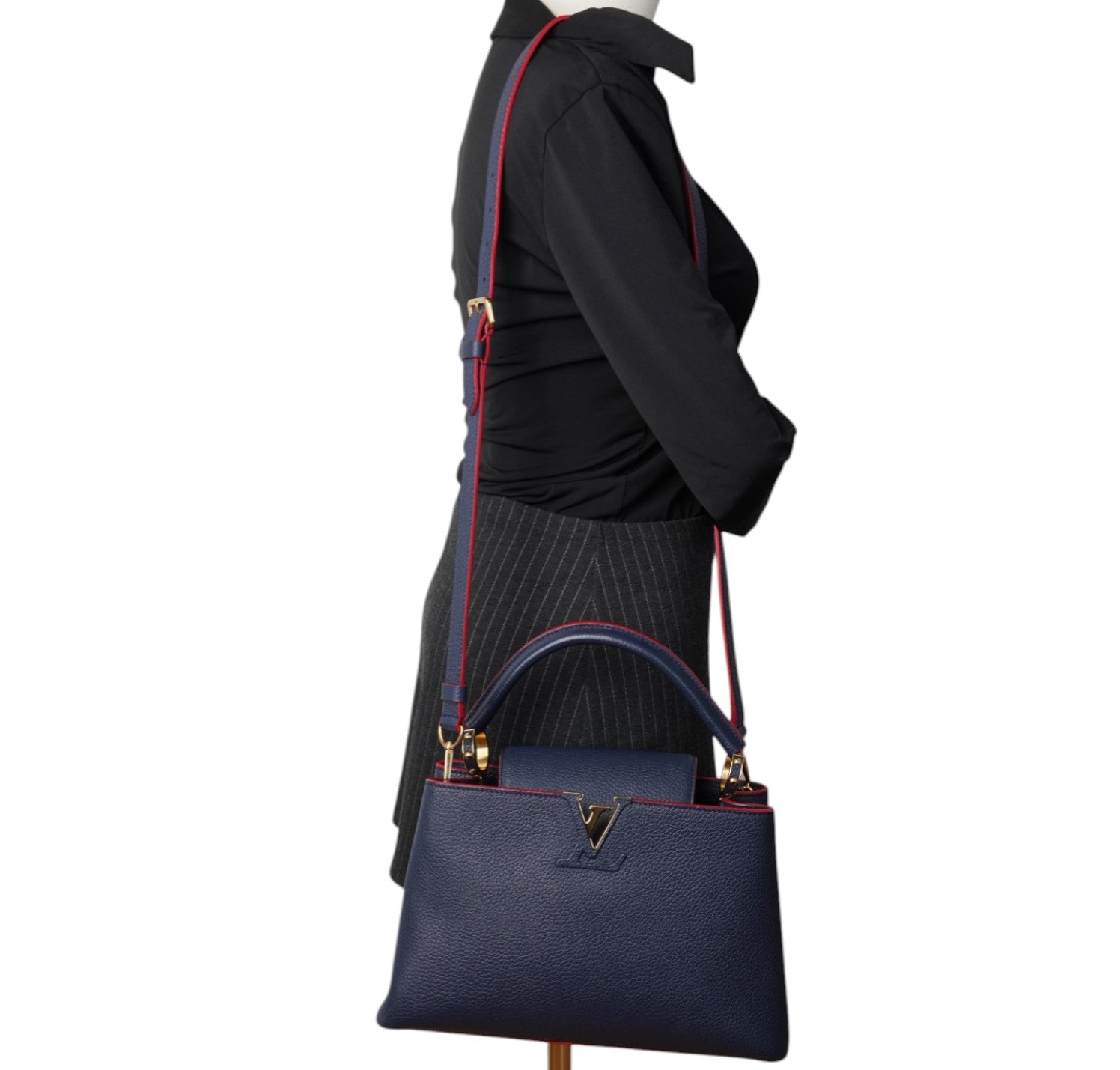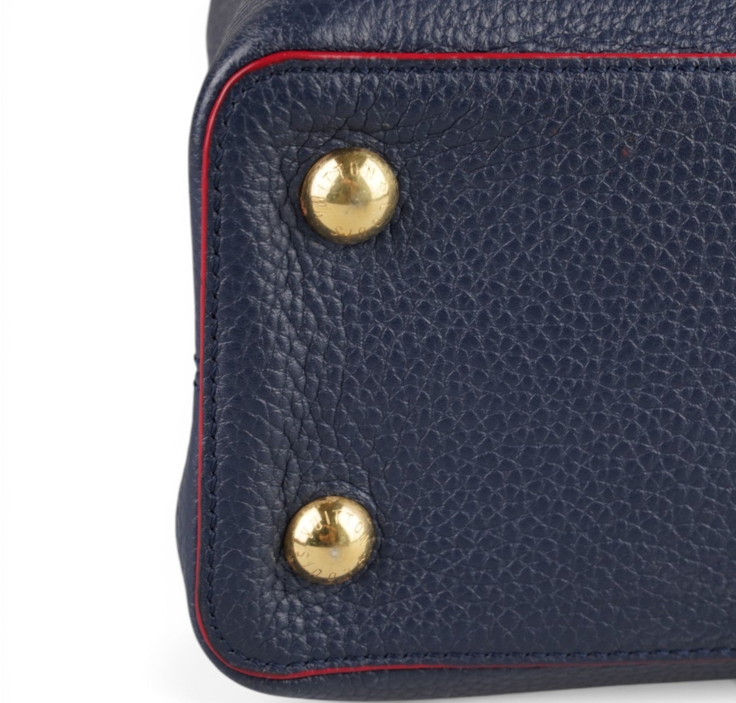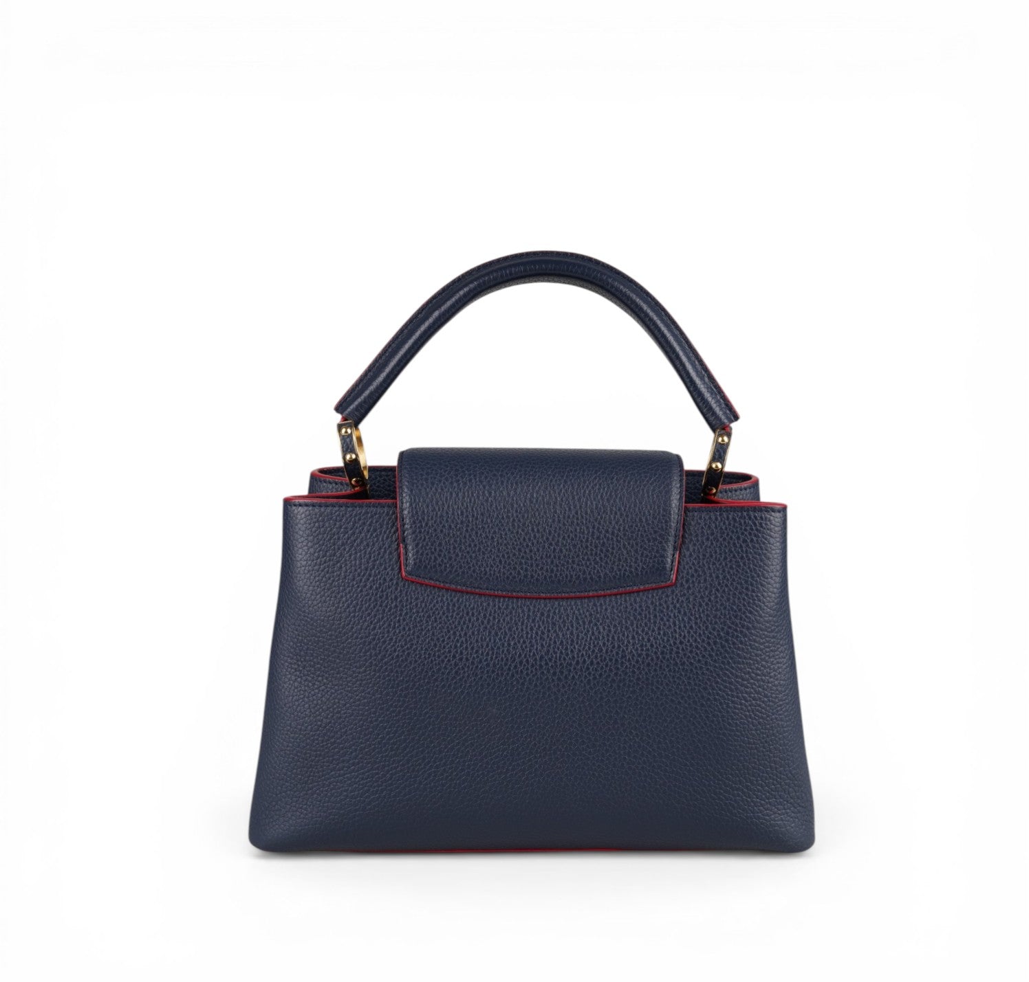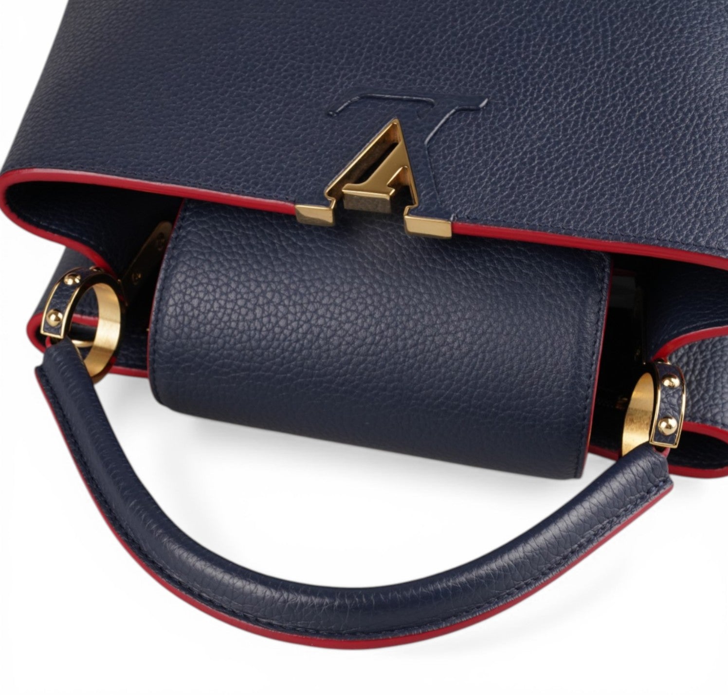Borsa Louis Vuitton, modello Capucines MM, realizzata in pelle Taurillon Blu Marino con profili a contrasto in Rosso. Parti metalliche color Oro. Manico singolo rigido e tracolla rimovibile e regolabile per l'utilizzo a spalla o crossbody. Chiusura con pattina superiore interna impreziosita da motivo Monogram a fiore. Logo LV in rilievo applicato frontalmente. Interno in pelle con due scomparti separati. Minimi segni d’uso e micrograffi su metalleria.