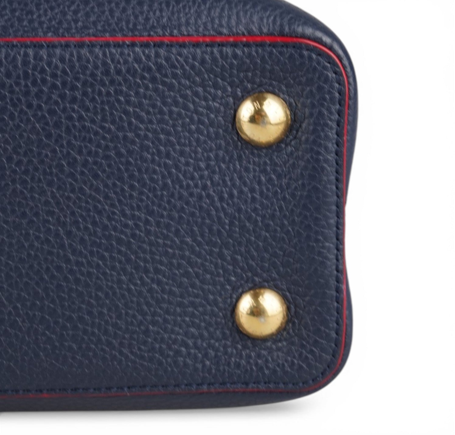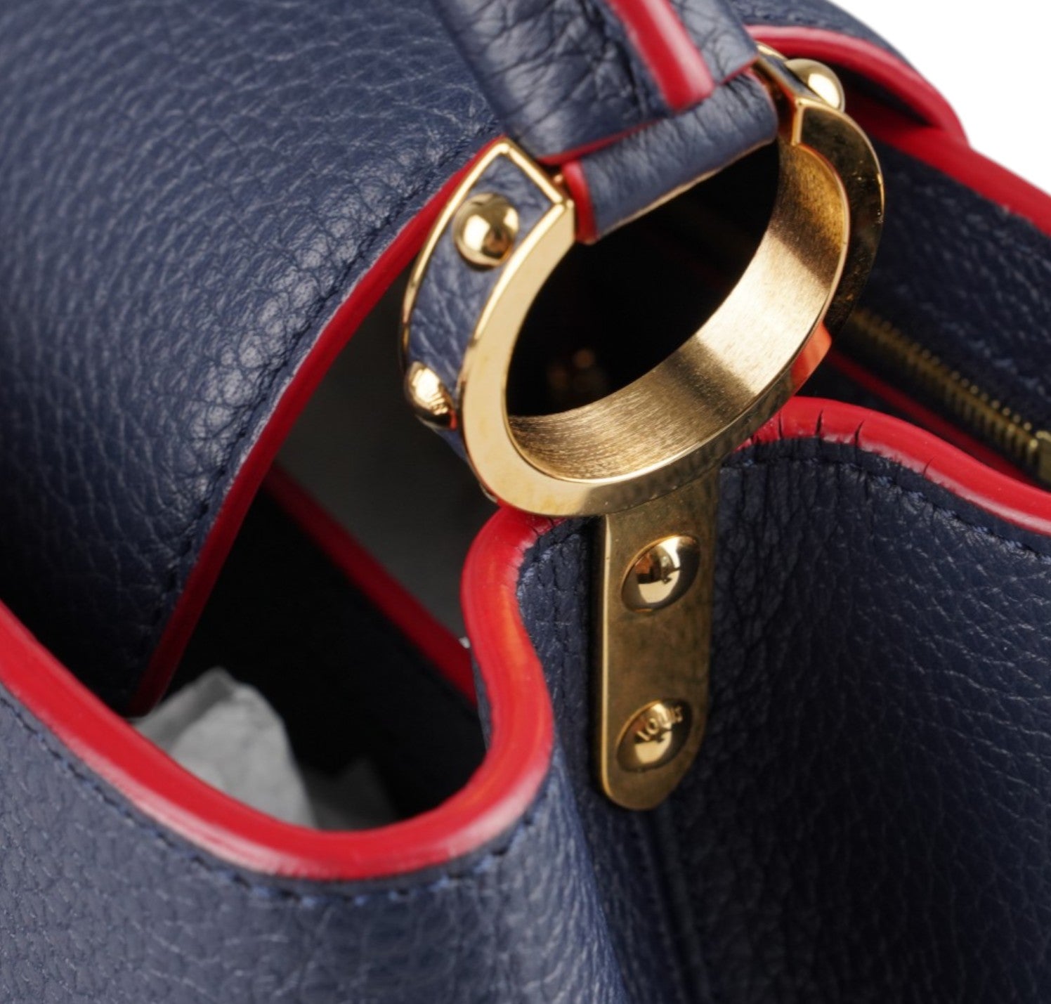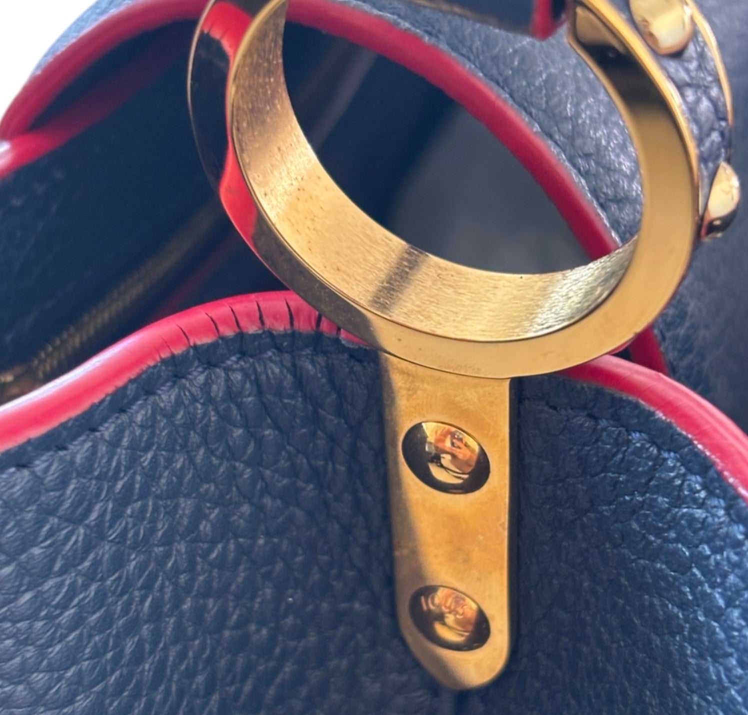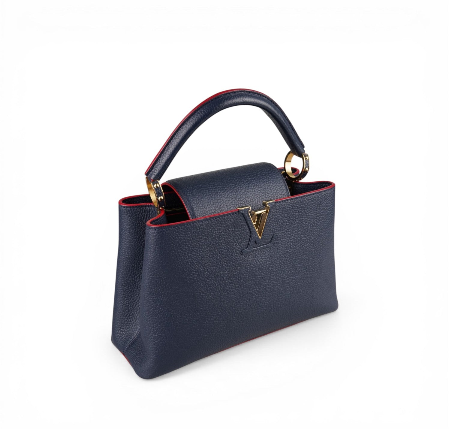 Borsa Louis Vuitton, modello Capucines MM, realizzata in pelle Taurillon Blu Marino con profili a contrasto in Rosso. Parti metalliche color Oro. Manico singolo rigido e tracolla rimovibile e regolabile per l'utilizzo a spalla o crossbody. Chiusura con pattina superiore interna impreziosita da motivo Monogram a fiore. Logo LV in rilievo applicato frontalmente. Interno in pelle con due scomparti separati. Minimi segni d’uso e micrograffi su metalleria.