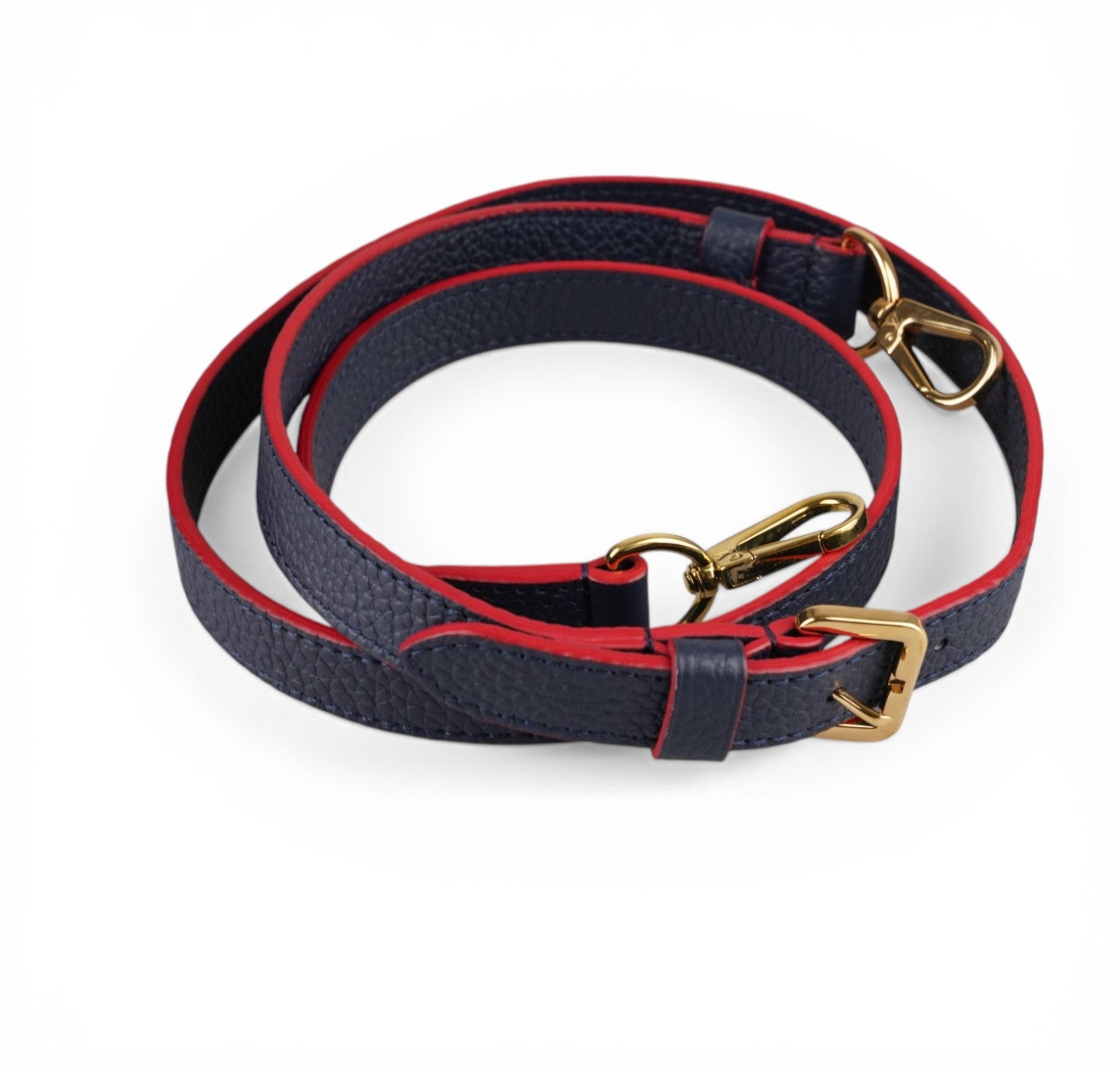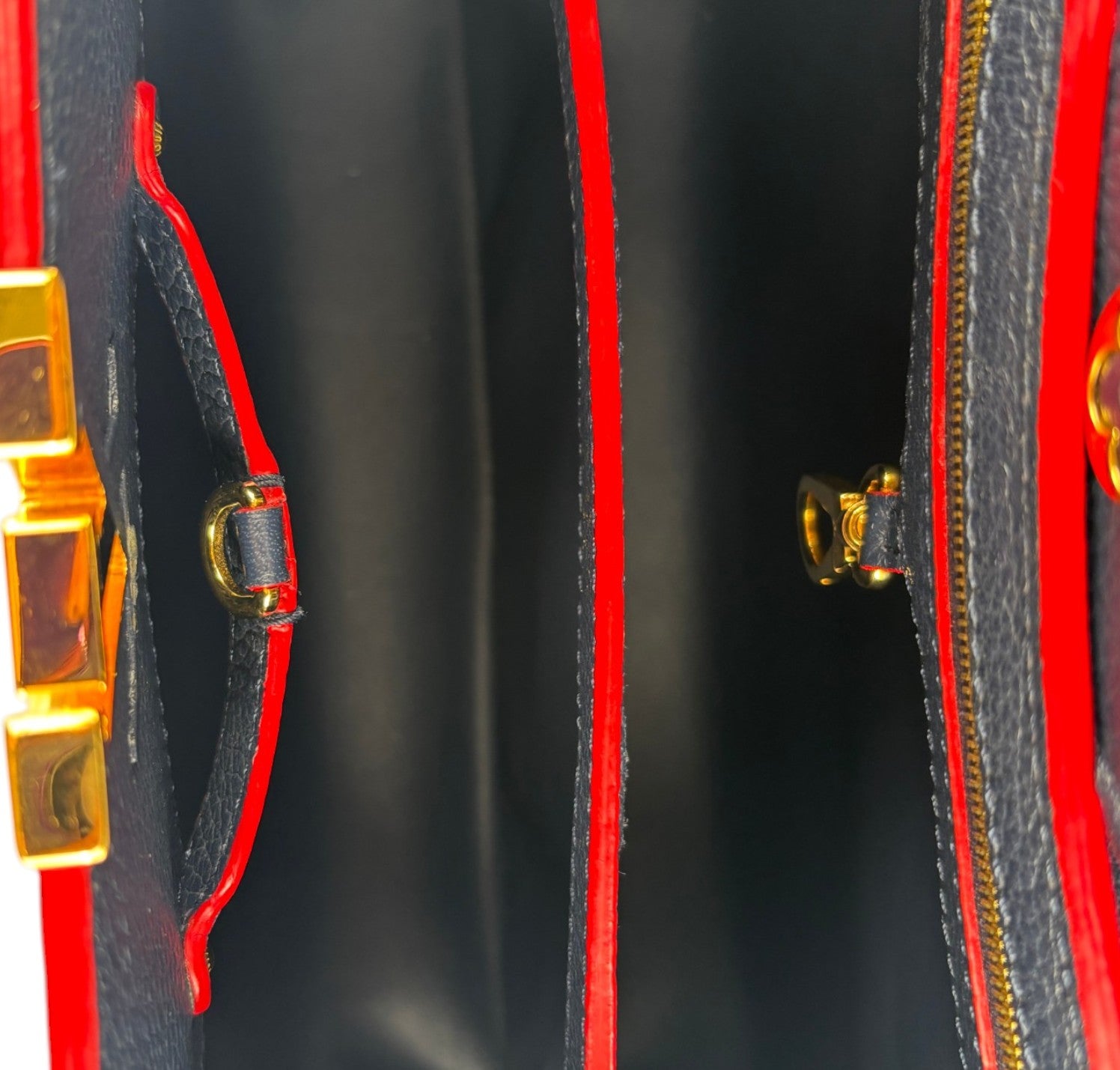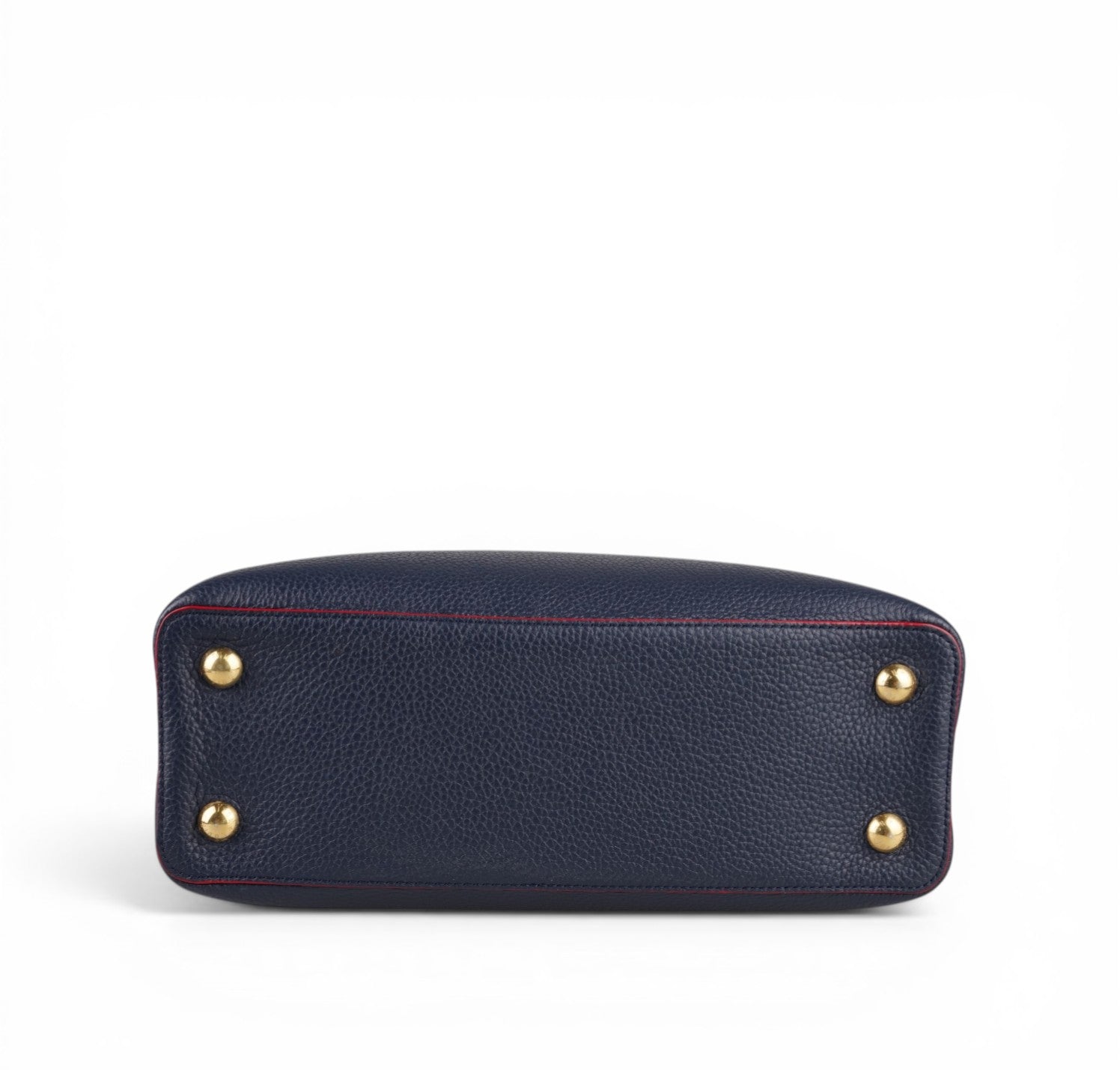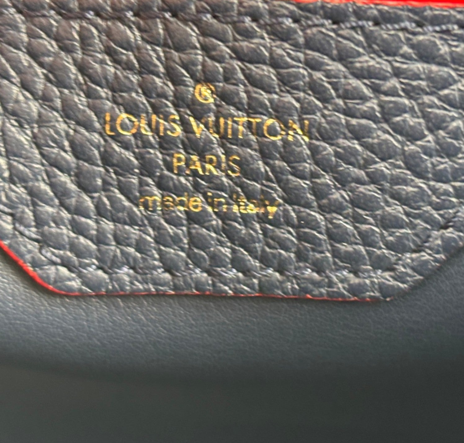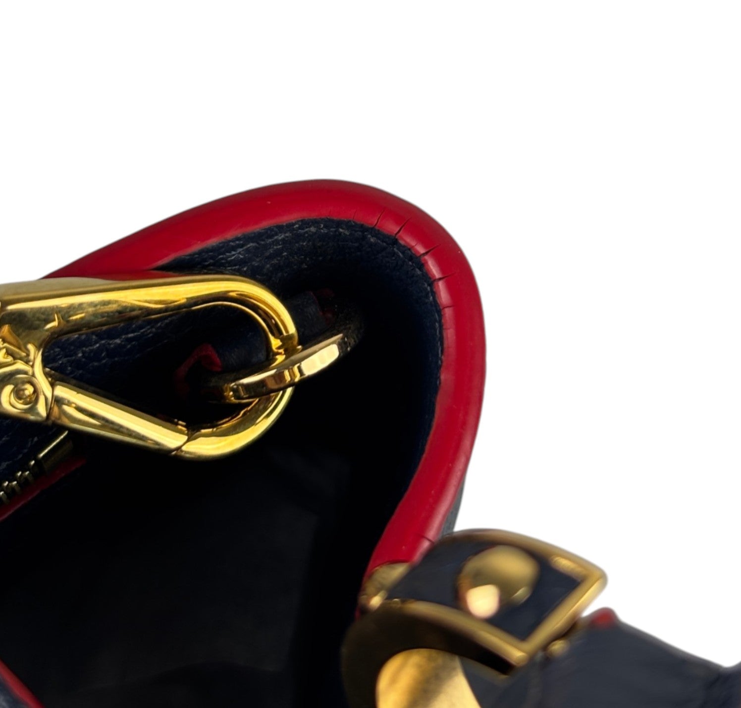 Borsa Louis Vuitton, modello Capucines MM, realizzata in pelle Taurillon Blu Marino con profili a contrasto in Rosso. Parti metalliche color Oro. Manico singolo rigido e tracolla rimovibile e regolabile per l'utilizzo a spalla o crossbody. Chiusura con pattina superiore interna impreziosita da motivo Monogram a fiore. Logo LV in rilievo applicato frontalmente. Interno in pelle con due scomparti separati. Minimi segni d’uso e micrograffi su metalleria.