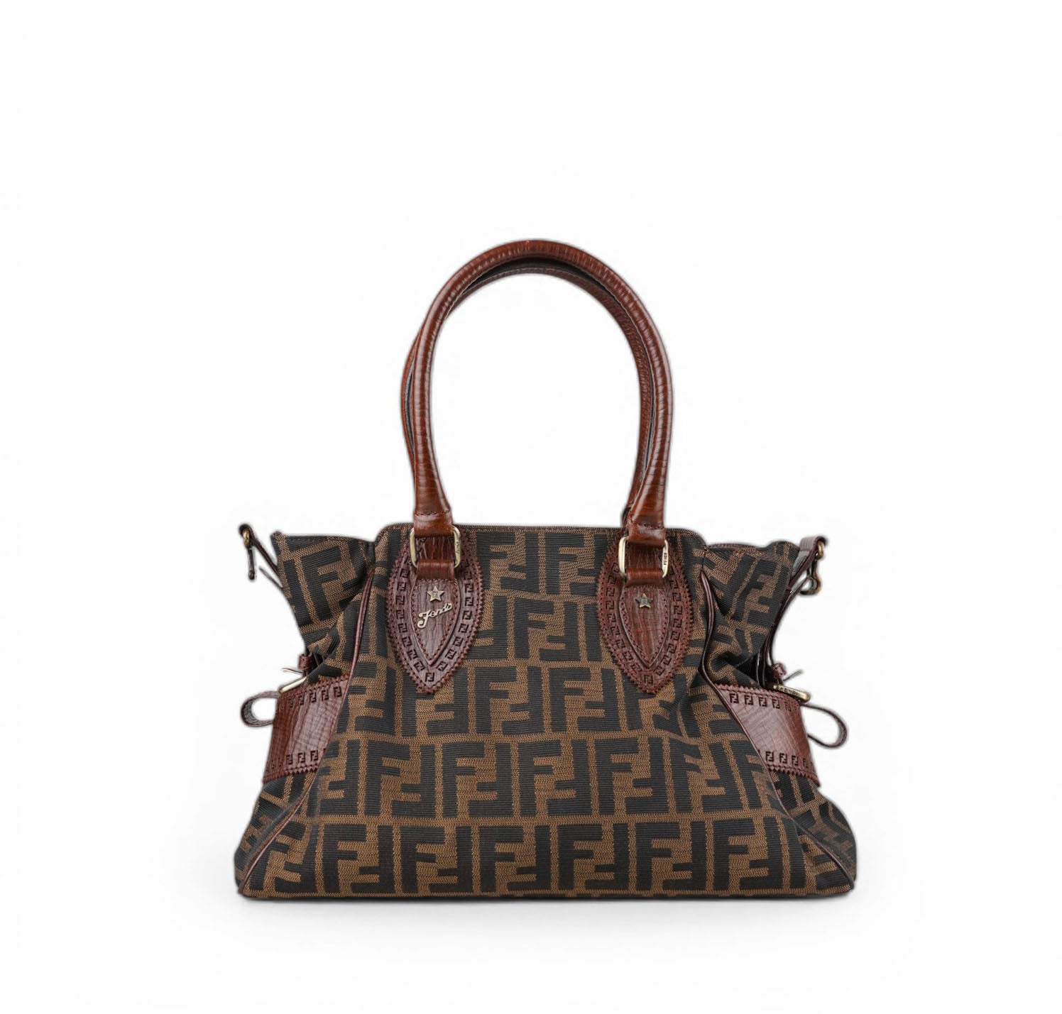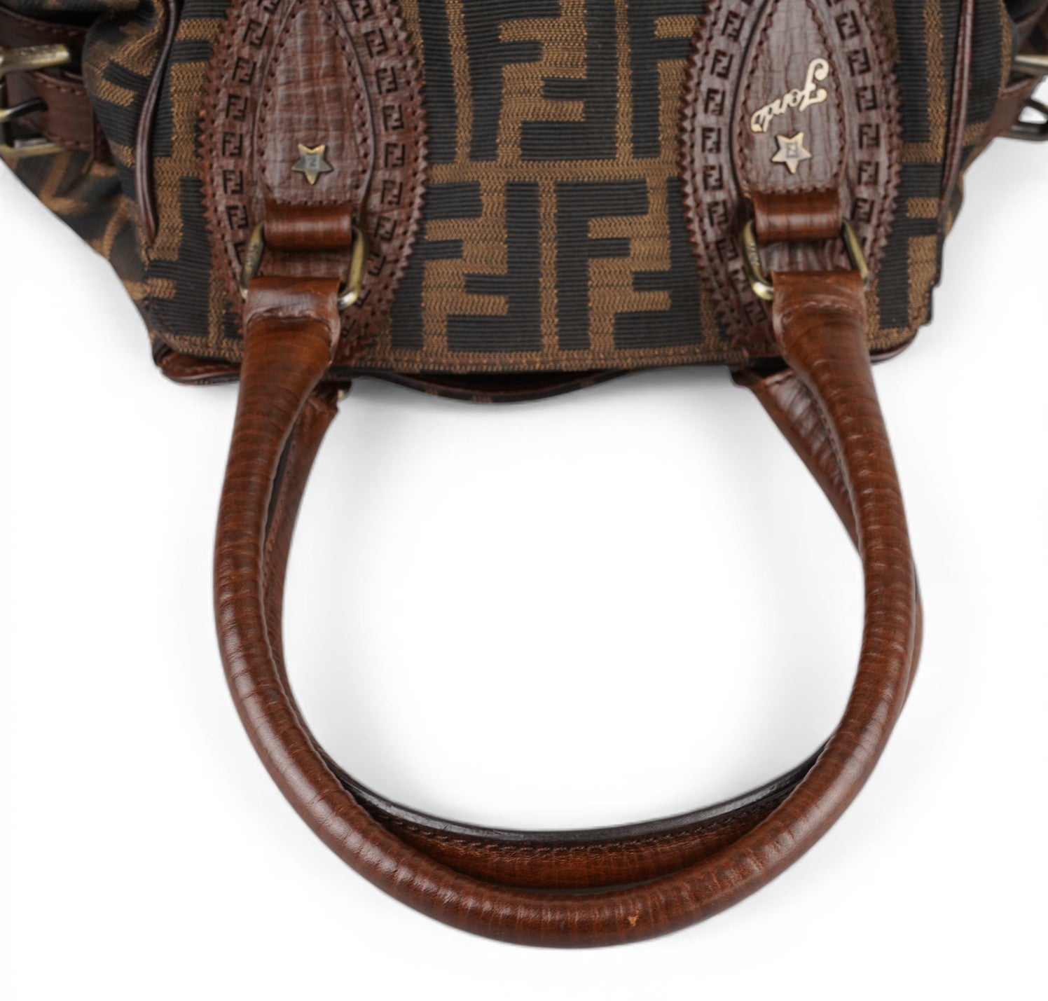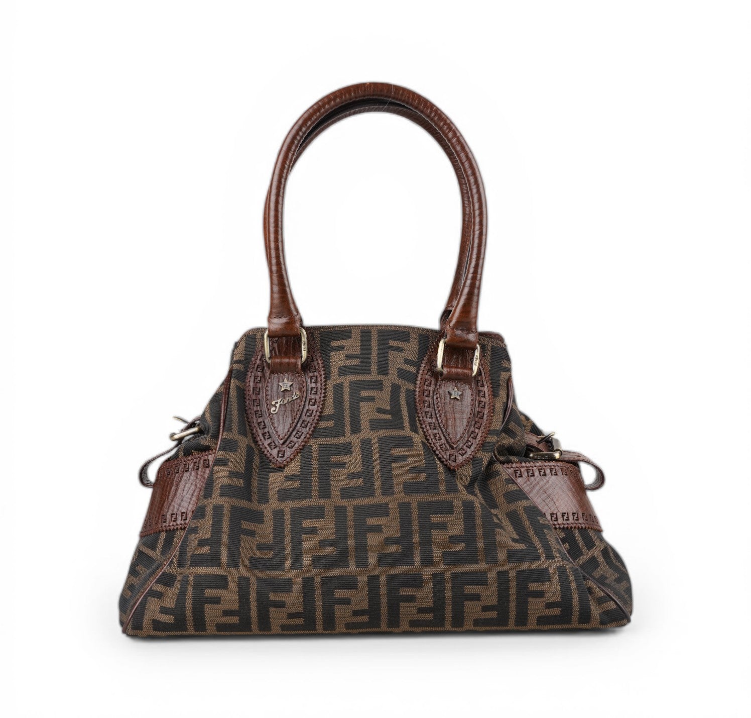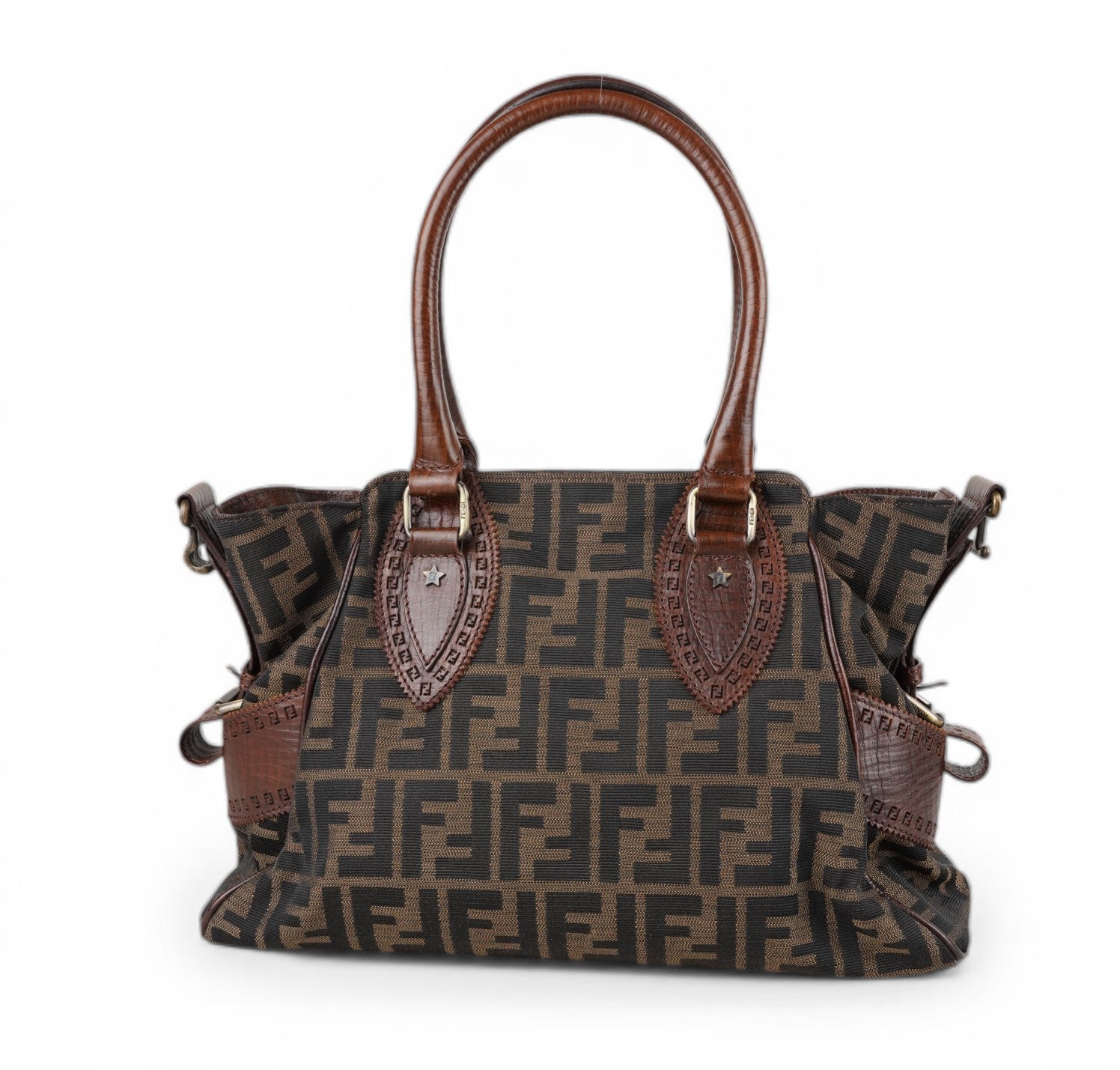 Borsa Fendi, modello Etniko Star, in Tela Monogram Zucca con dettagli in Pelle Marrone. Manici arrotondati in pelle e inserti con piccola borchia a forma di stella. Chiusura superiore con gancio, interno foderato in tessuto munito di taschino con zip. Capiente e comoda da portare a spalla. Lievi segni d’uso generali. Micro graffi pelle, metalleria, generali.