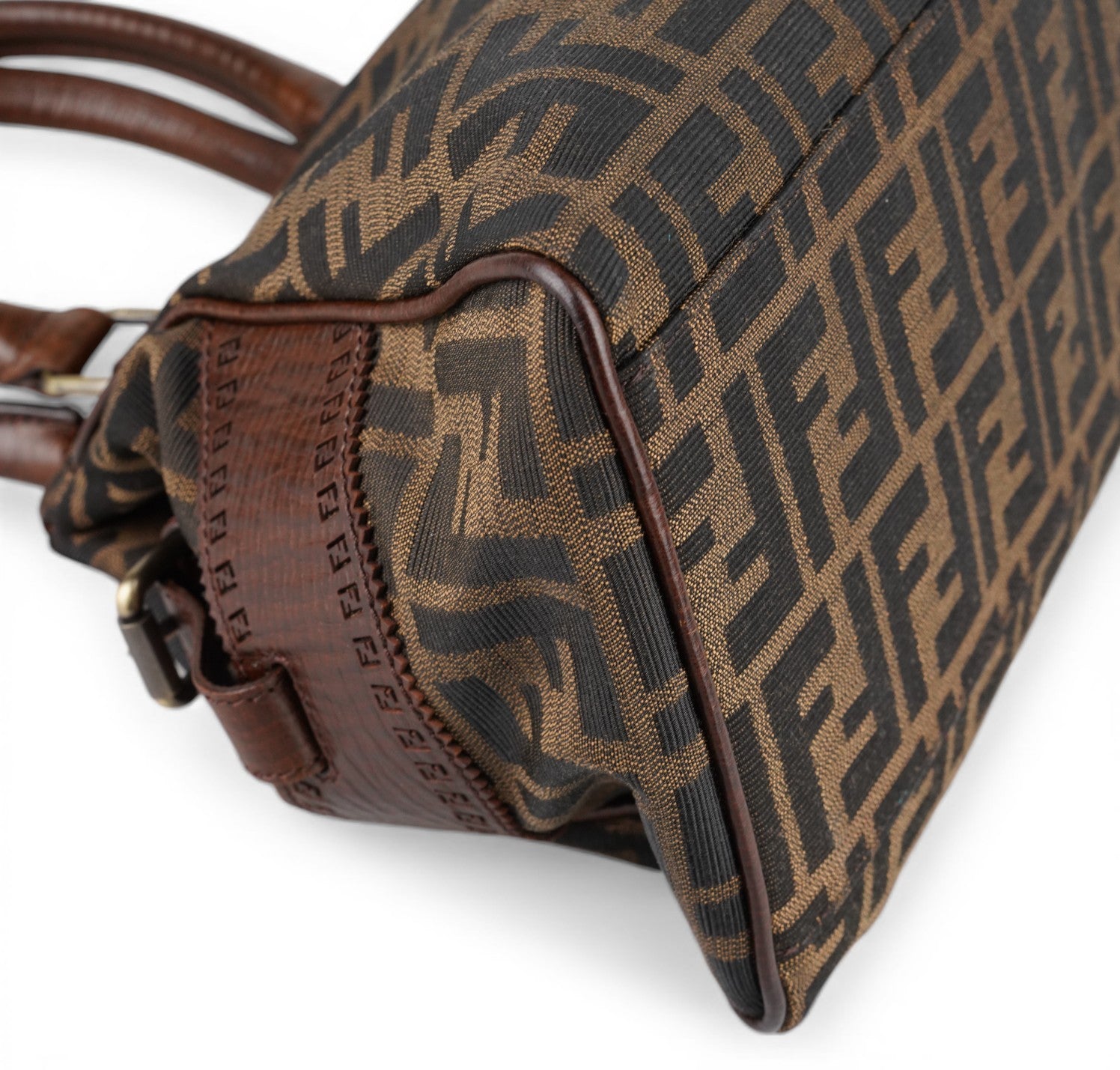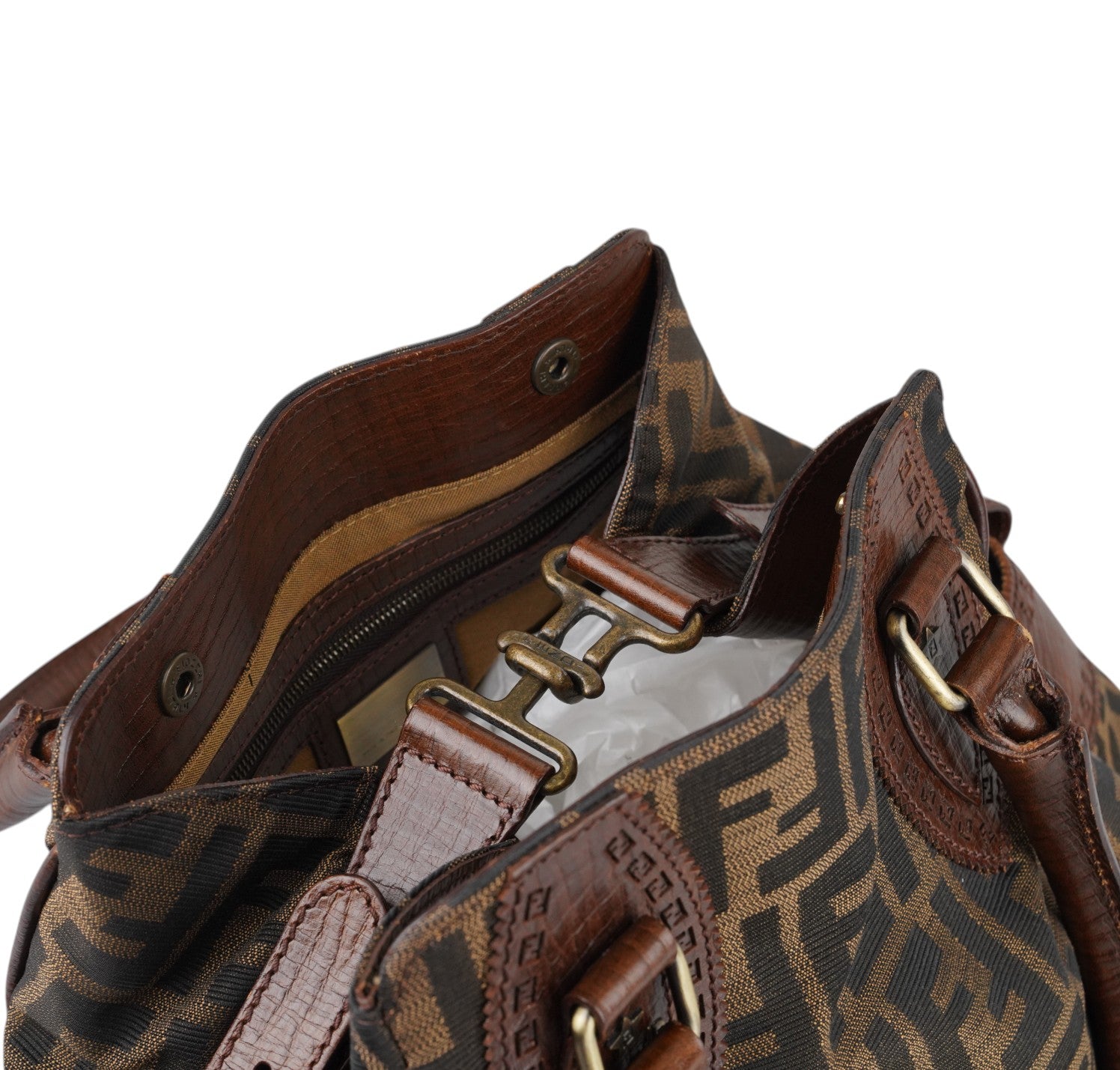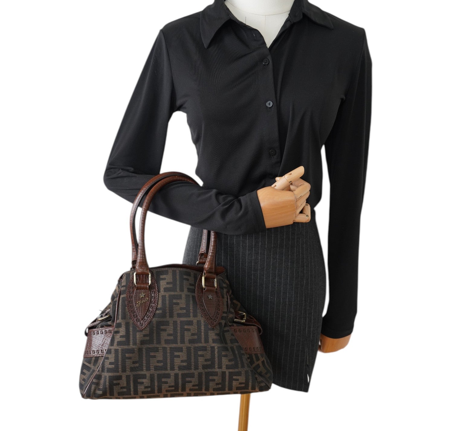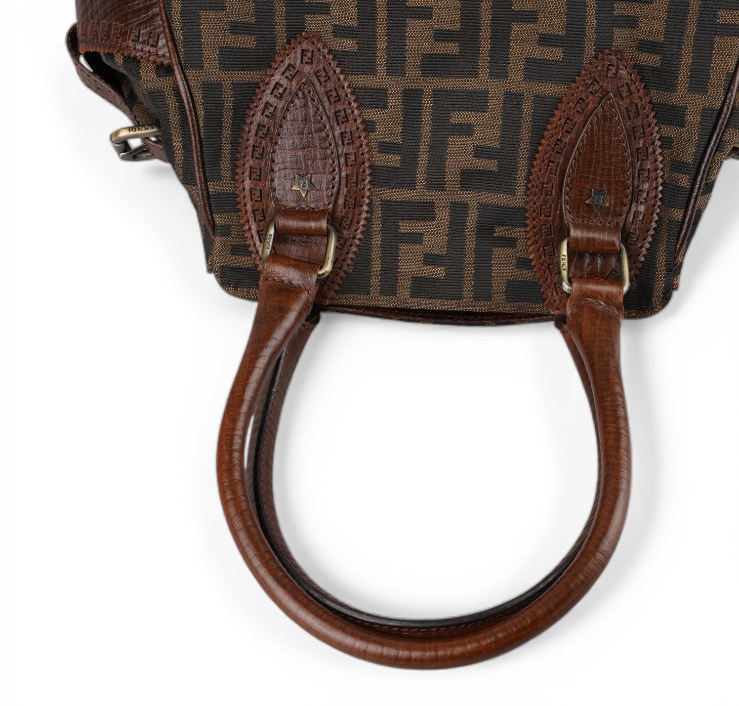 Borsa Fendi, modello Etniko Star, in Tela Monogram Zucca con dettagli in Pelle Marrone. Manici arrotondati in pelle e inserti con piccola borchia a forma di stella. Chiusura superiore con gancio, interno foderato in tessuto munito di taschino con zip. Capiente e comoda da portare a spalla. Lievi segni d’uso generali. Micro graffi pelle, metalleria, generali.