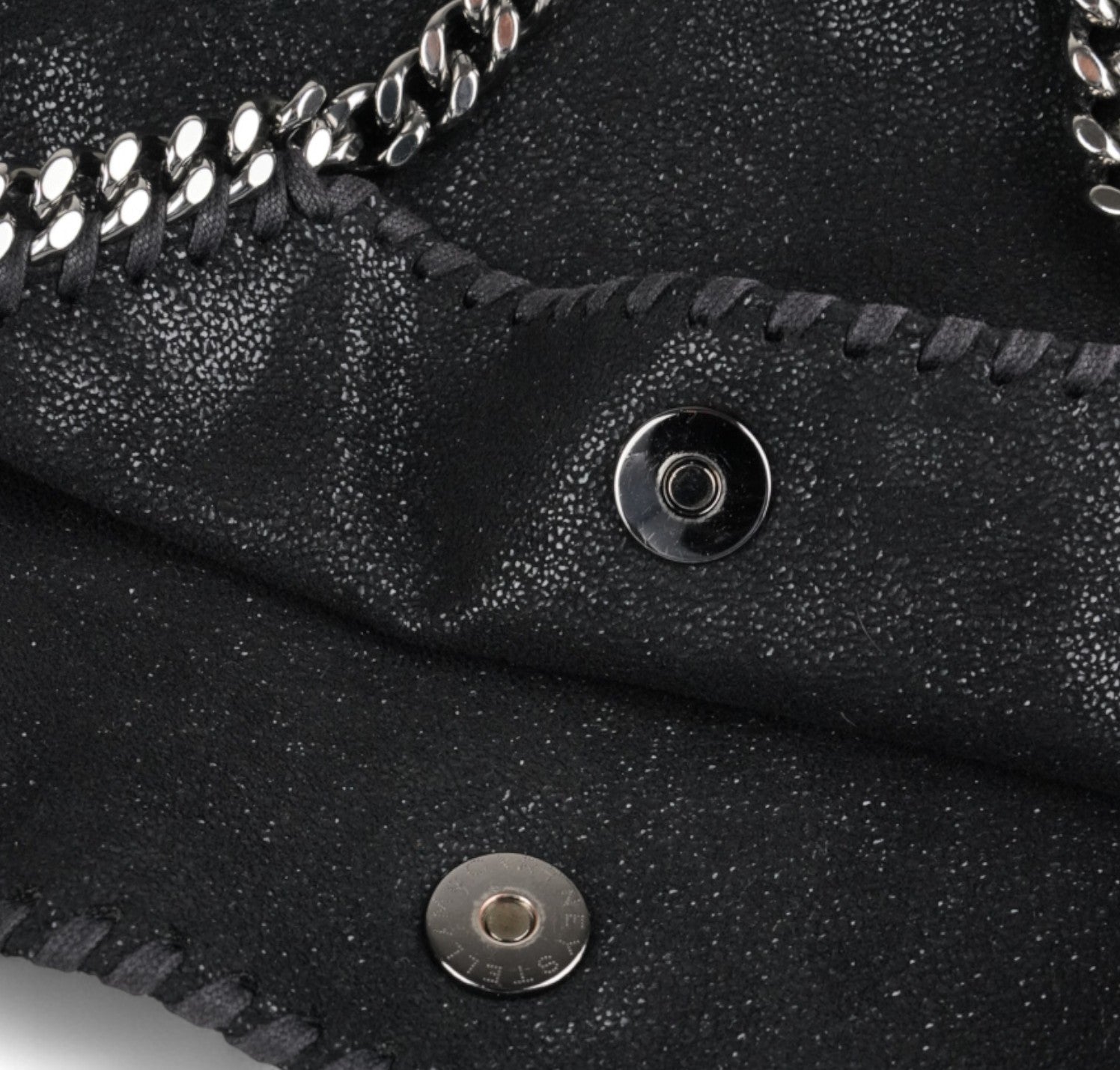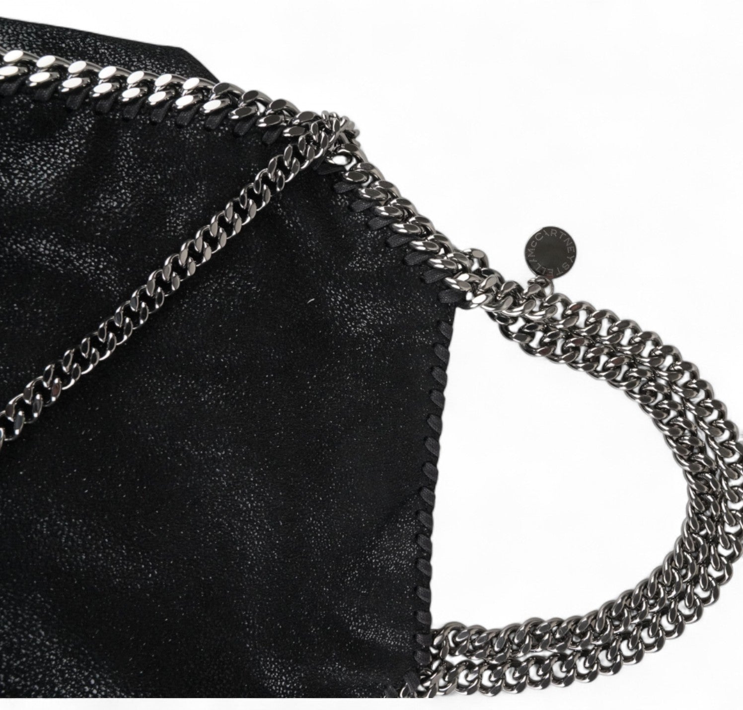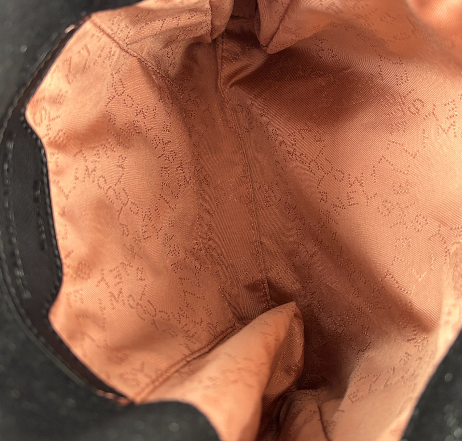 Borsa Stella McCartney, modello Falabella, misura Mini, realizzata in Tessuto Sintetico Shaggy Deer Nero. Metalleria Argento. Chiusura esterna magnetica. Manici superiori per il trasporto a mano. Tracolla per il trasporto a spalla o bandoliera. Interno foderato in Tessuto Rosa Ecosostenibile. Lievi segni del tempo generali.