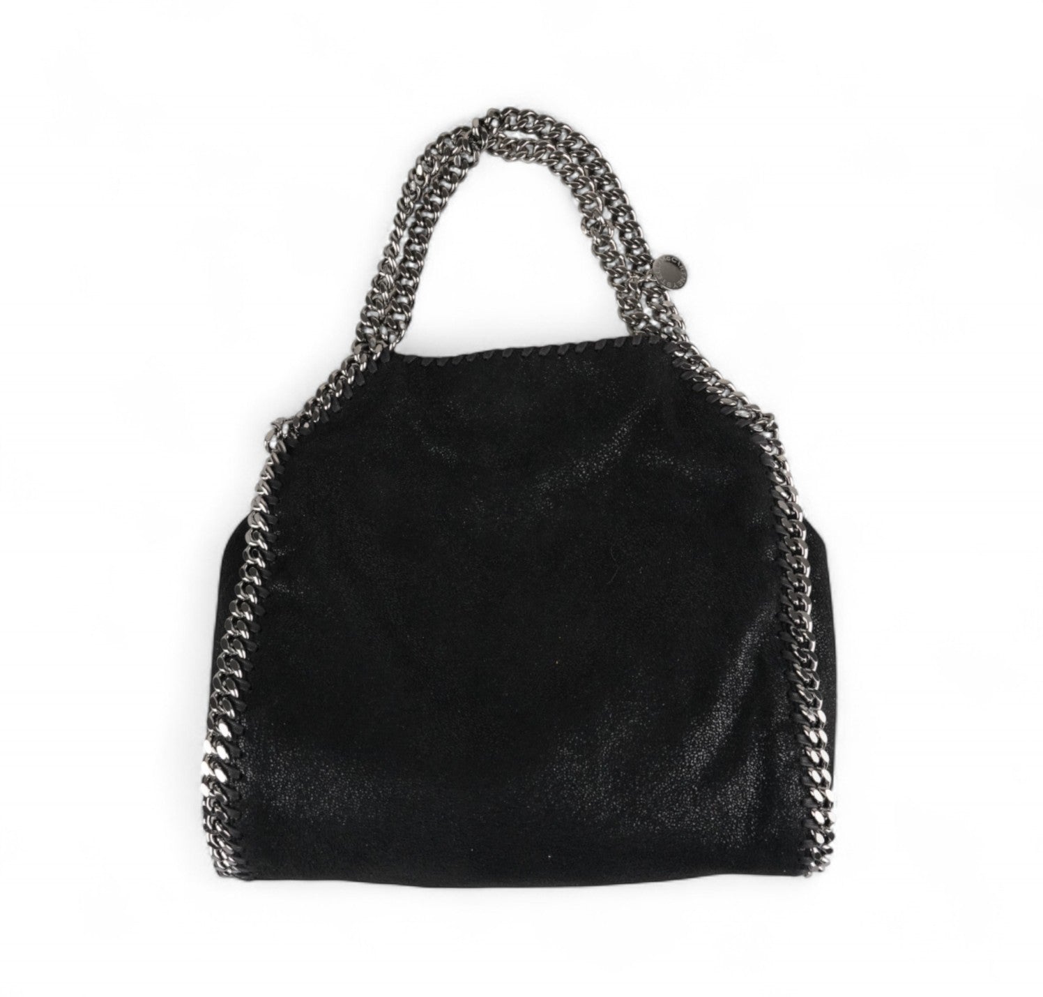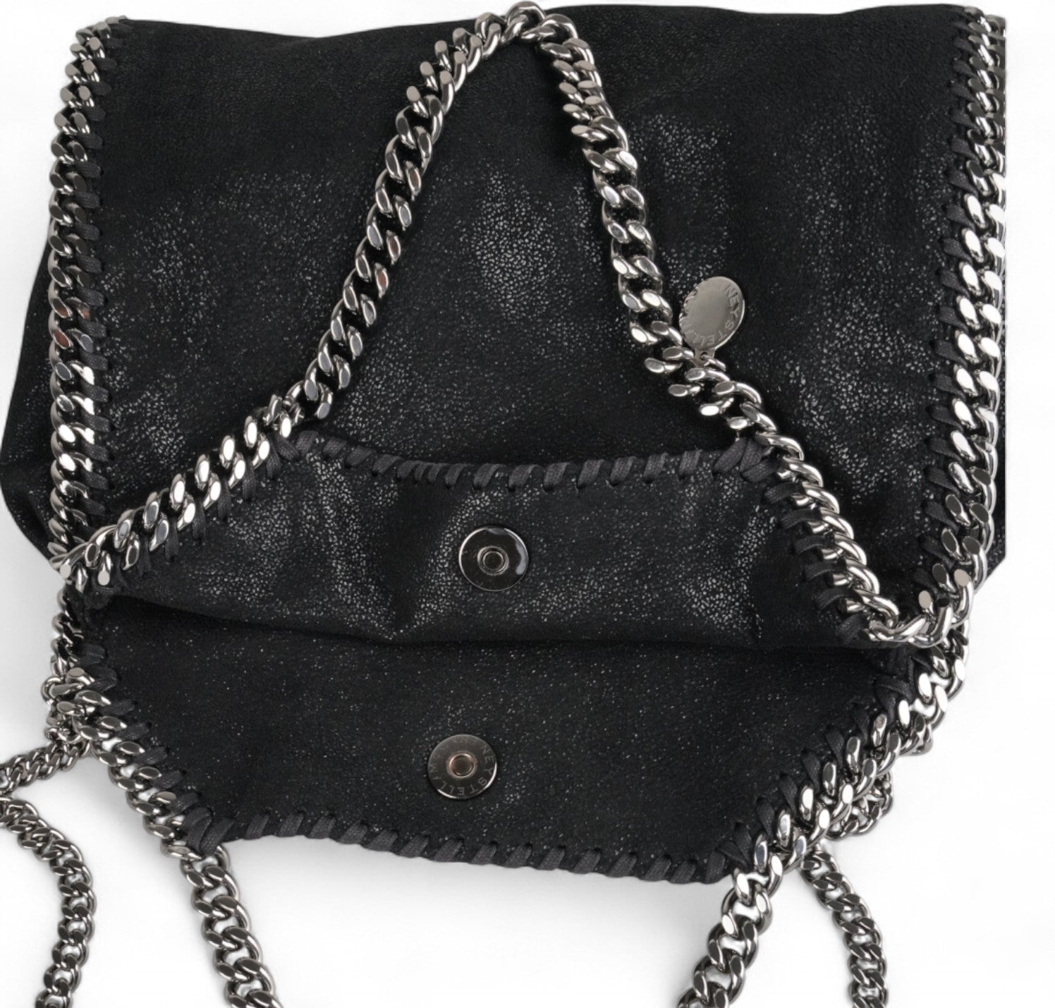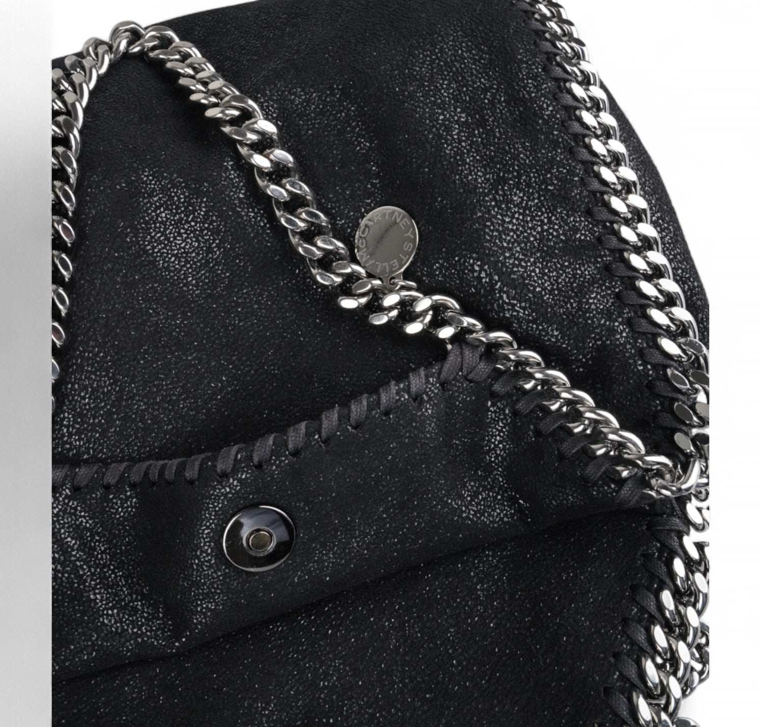 Borsa Stella McCartney, modello Falabella, misura Mini, realizzata in Tessuto Sintetico Shaggy Deer Nero. Metalleria Argento. Chiusura esterna magnetica. Manici superiori per il trasporto a mano. Tracolla per il trasporto a spalla o bandoliera. Interno foderato in Tessuto Rosa Ecosostenibile. Lievi segni del tempo generali.