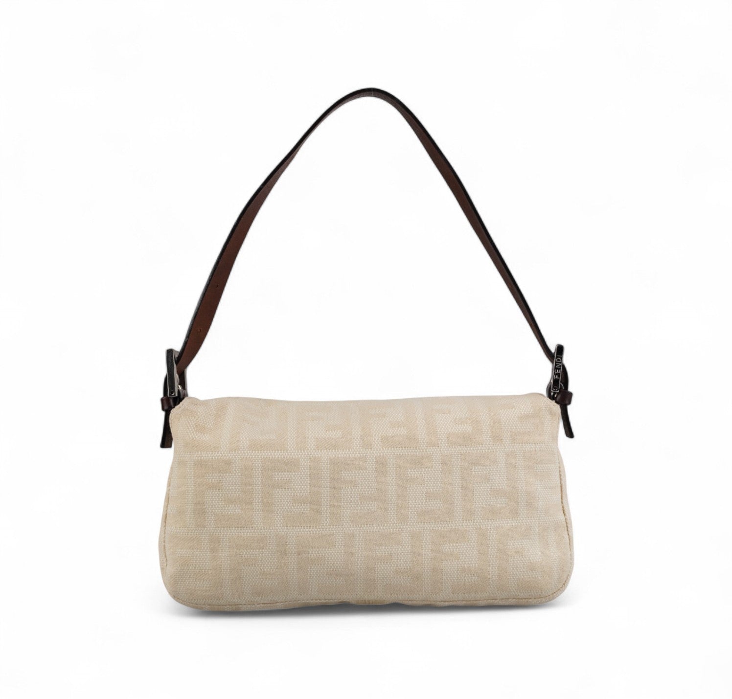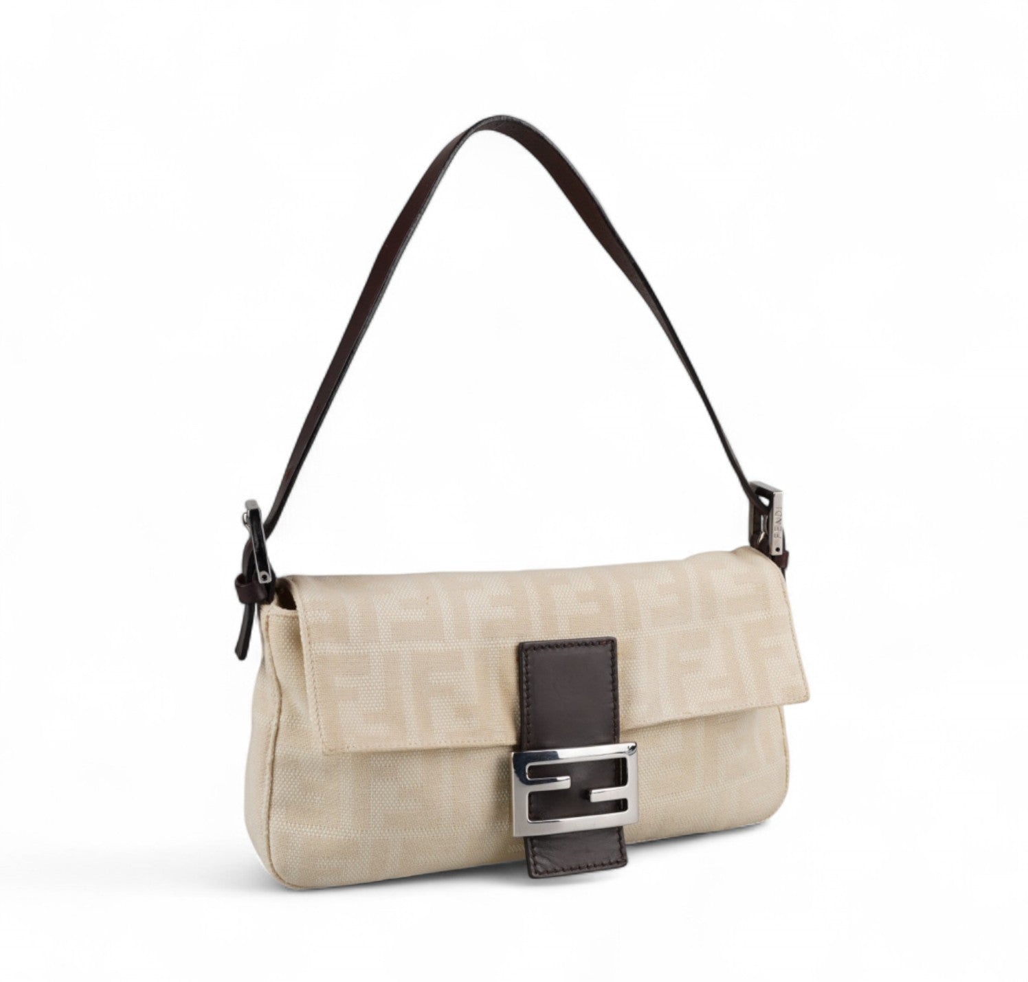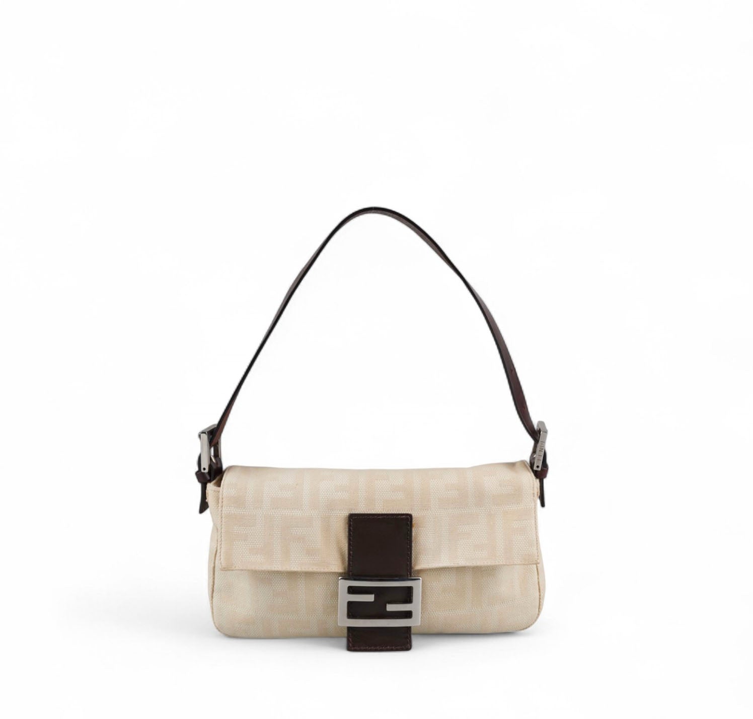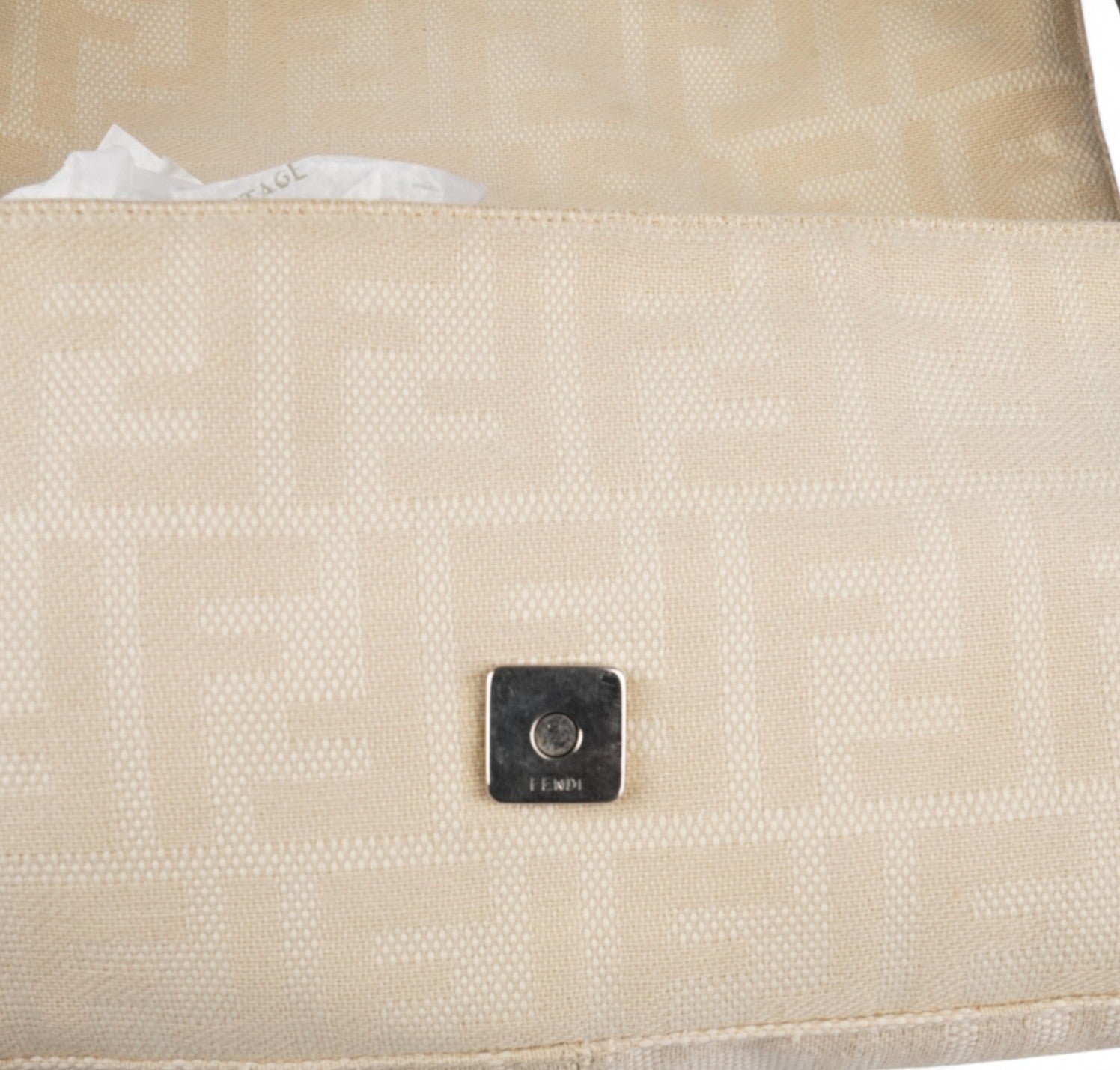 Borsa Fendi, modello Baguette, realizzata in Tela Monogram Avorio/Beige. Finiture in Pelle Marrone. Metalleria Argento. Chiusura magnetica posta su patta anteriore impreziosita dall'iconco logo FF. Interno foderato in tessuto, taschino con zip. Munita di manico superiore regolabile. Presenta micro graffi alla metalleria. Lievi segni del tempo generali. Minimi segni su pelle. Minimi segni interni.