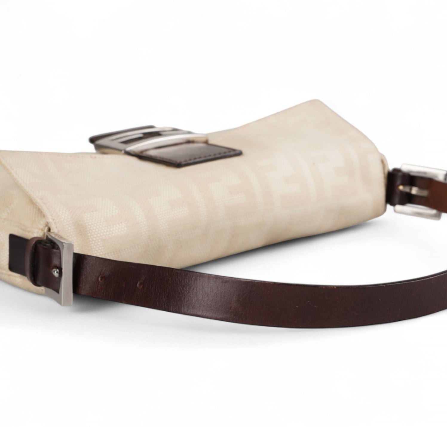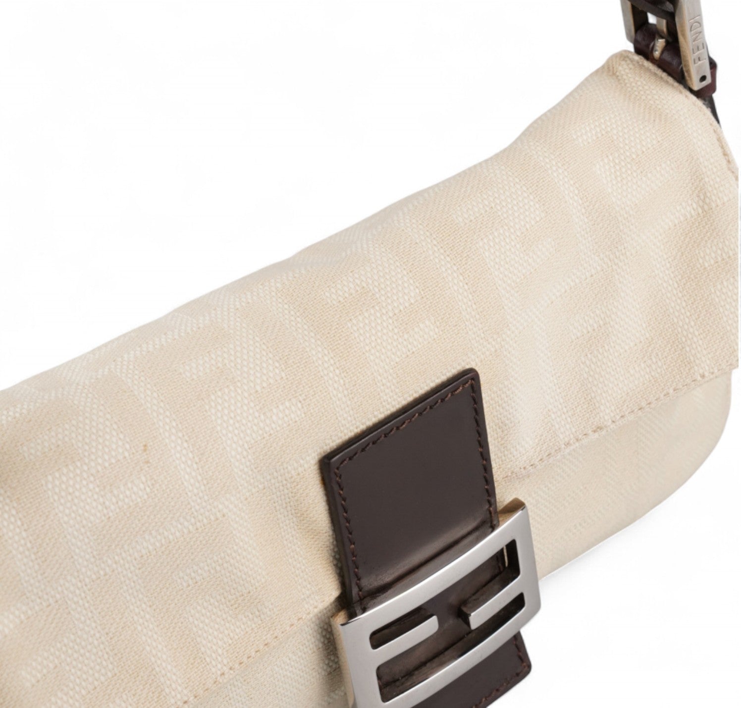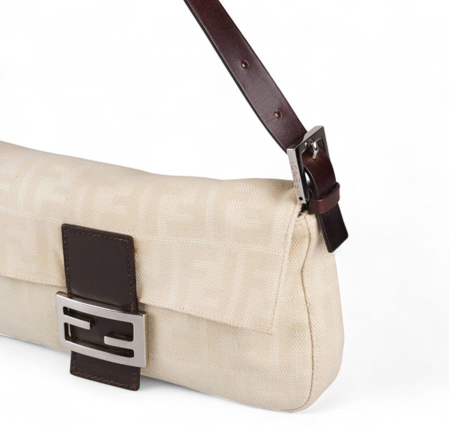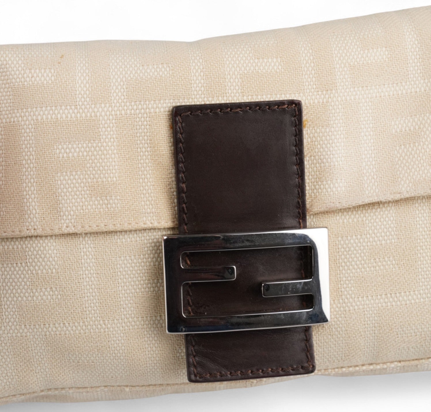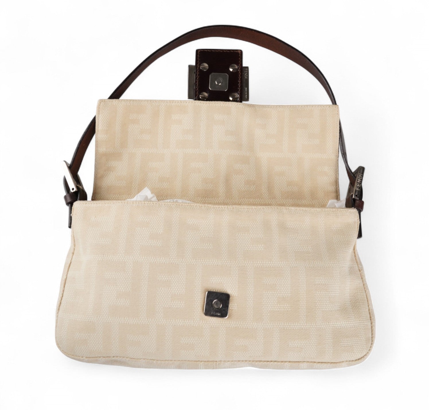 Borsa Fendi, modello Baguette, realizzata in Tela Monogram Avorio/Beige. Finiture in Pelle Marrone. Metalleria Argento. Chiusura magnetica posta su patta anteriore impreziosita dall'iconco logo FF. Interno foderato in tessuto, taschino con zip. Munita di manico superiore regolabile. Presenta micro graffi alla metalleria. Lievi segni del tempo generali. Minimi segni su pelle. Minimi segni interni.