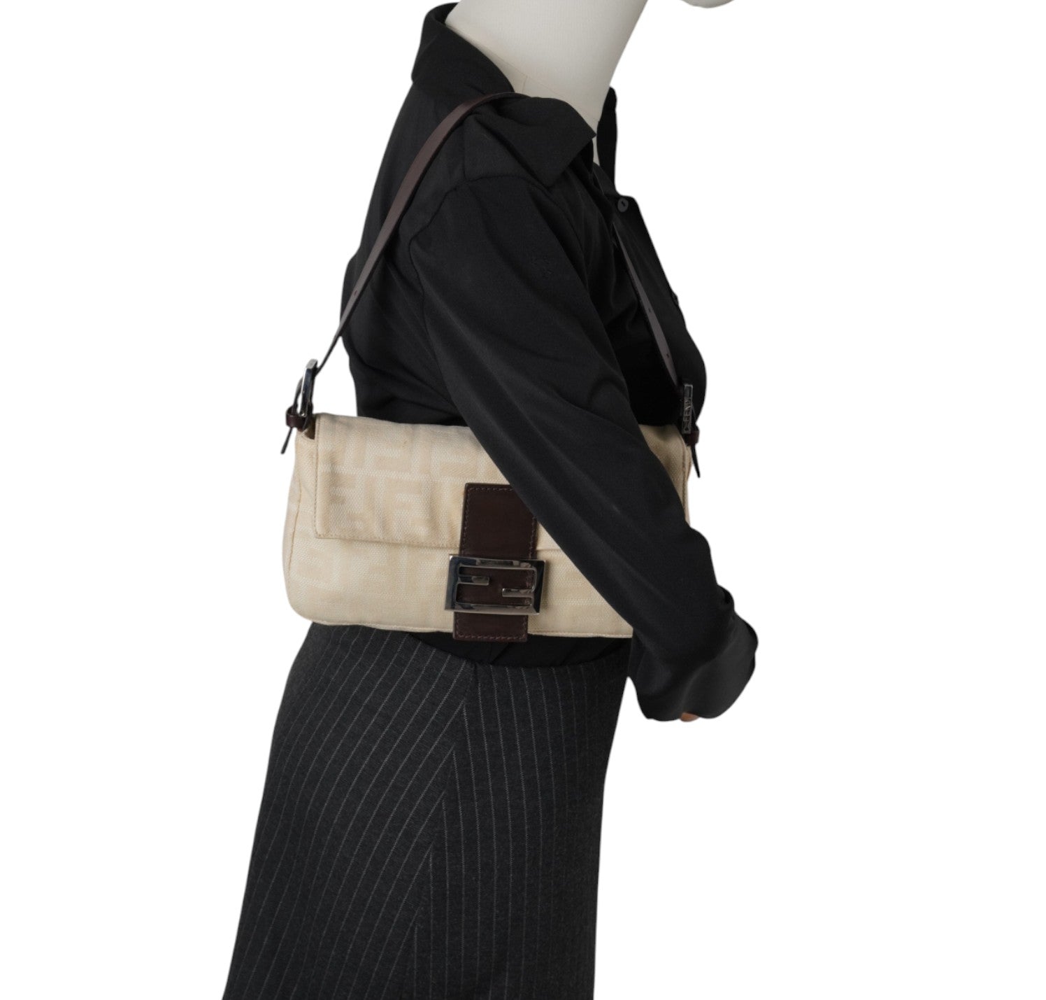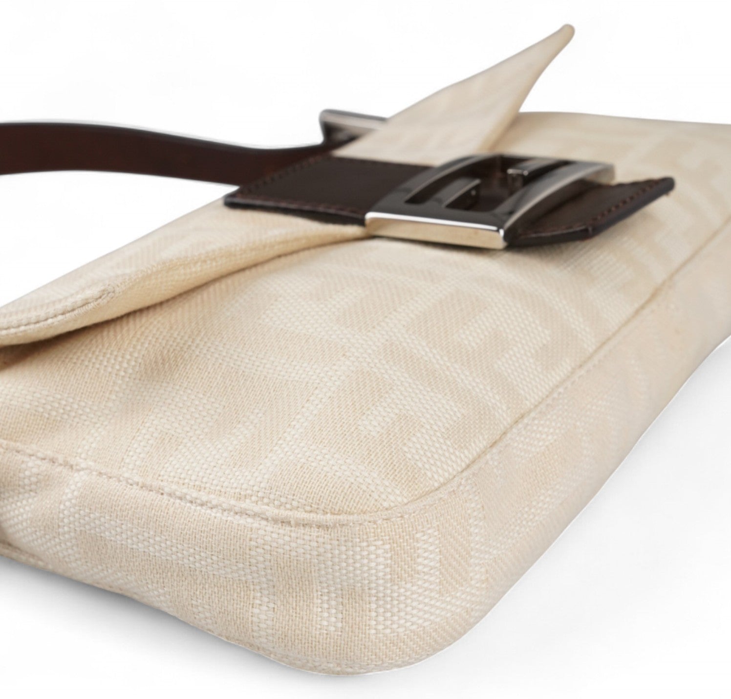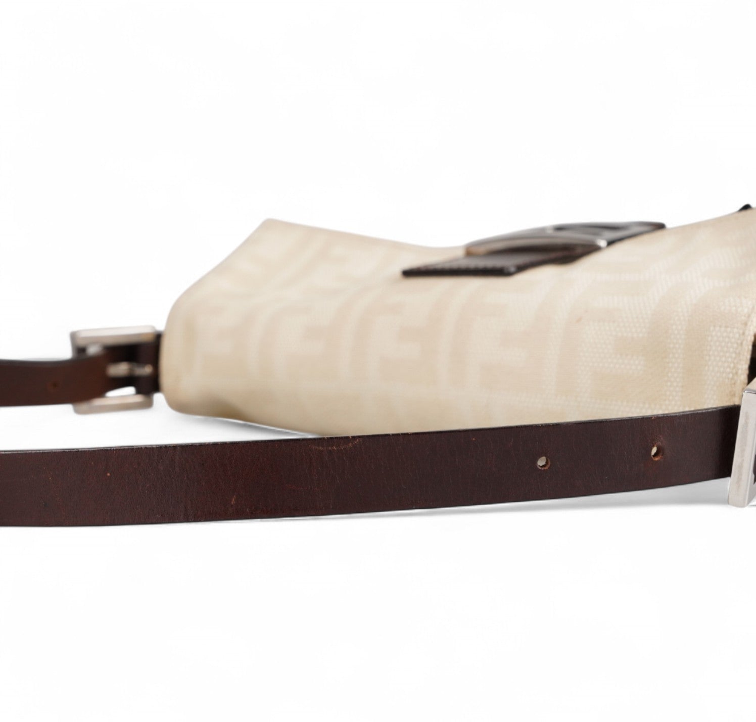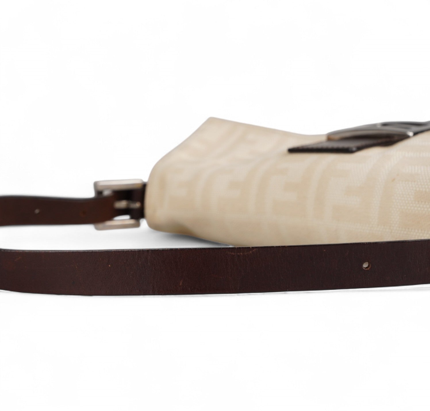 Borsa Fendi, modello Baguette, realizzata in Tela Monogram Avorio/Beige. Finiture in Pelle Marrone. Metalleria Argento. Chiusura magnetica posta su patta anteriore impreziosita dall'iconco logo FF. Interno foderato in tessuto, taschino con zip. Munita di manico superiore regolabile. Presenta micro graffi alla metalleria. Lievi segni del tempo generali. Minimi segni su pelle. Minimi segni interni.