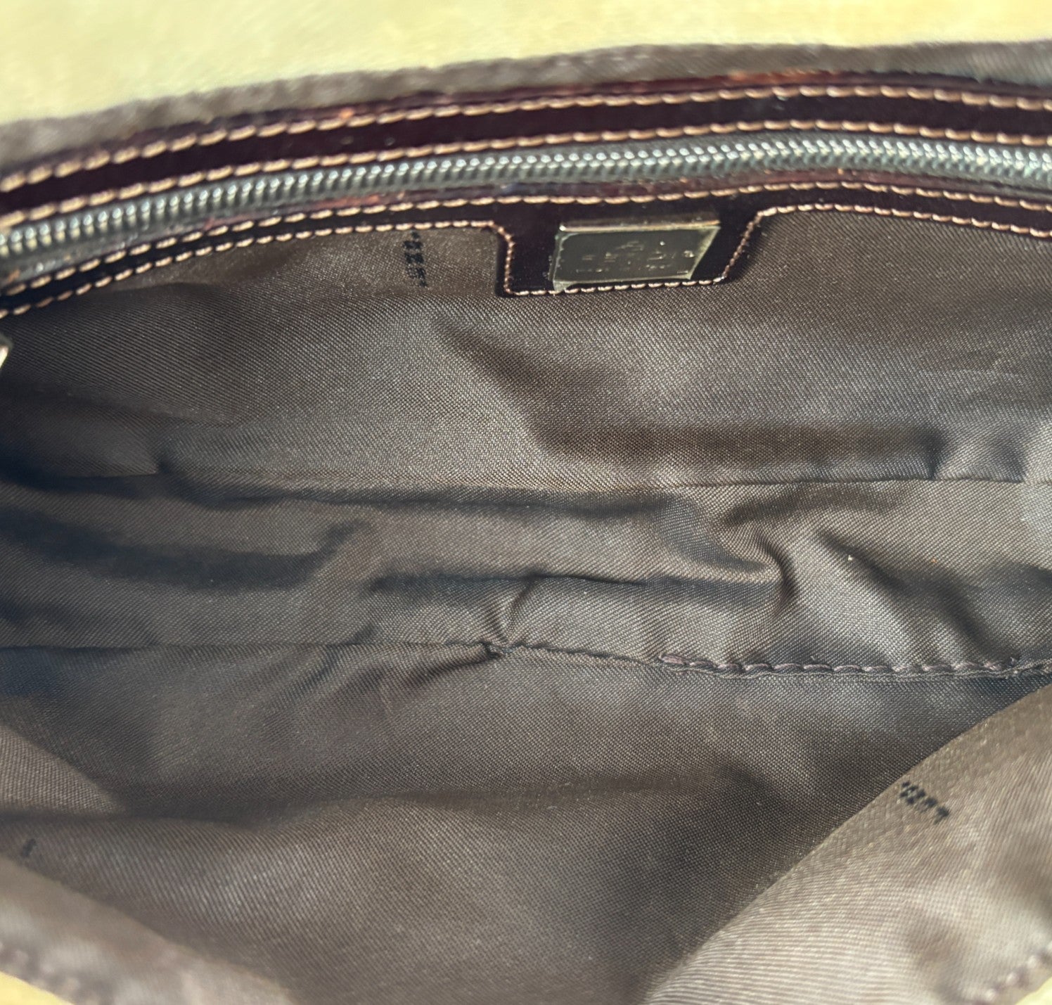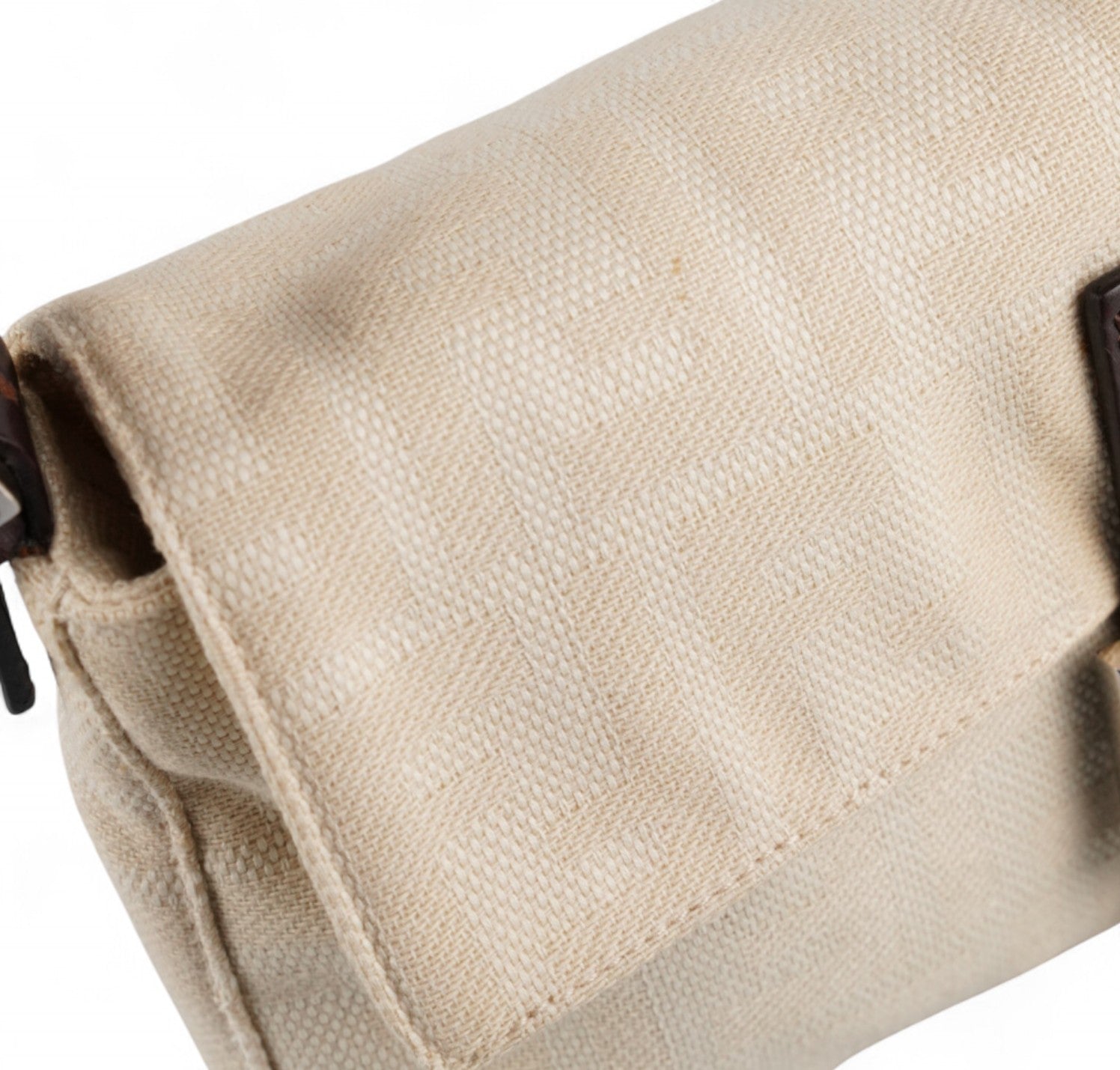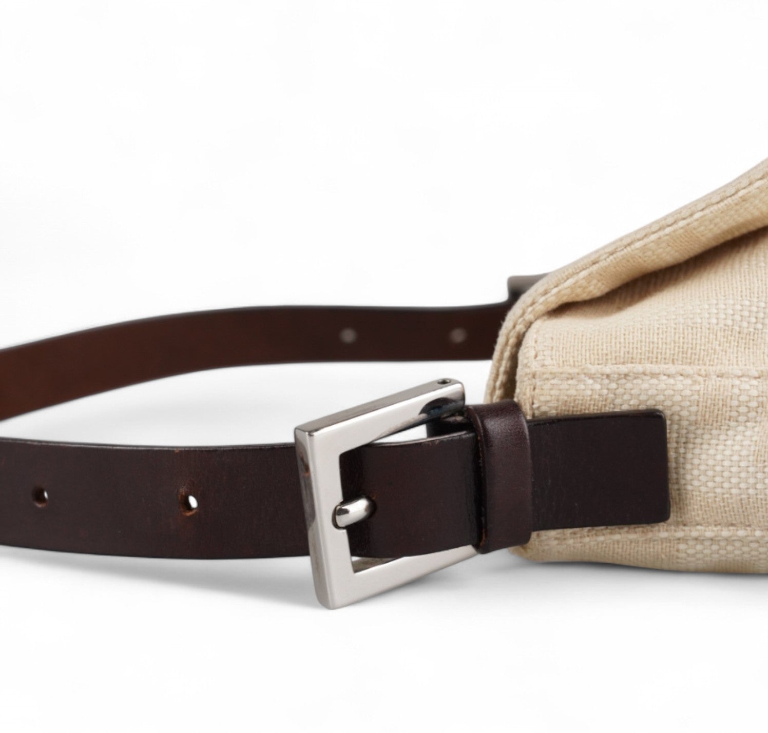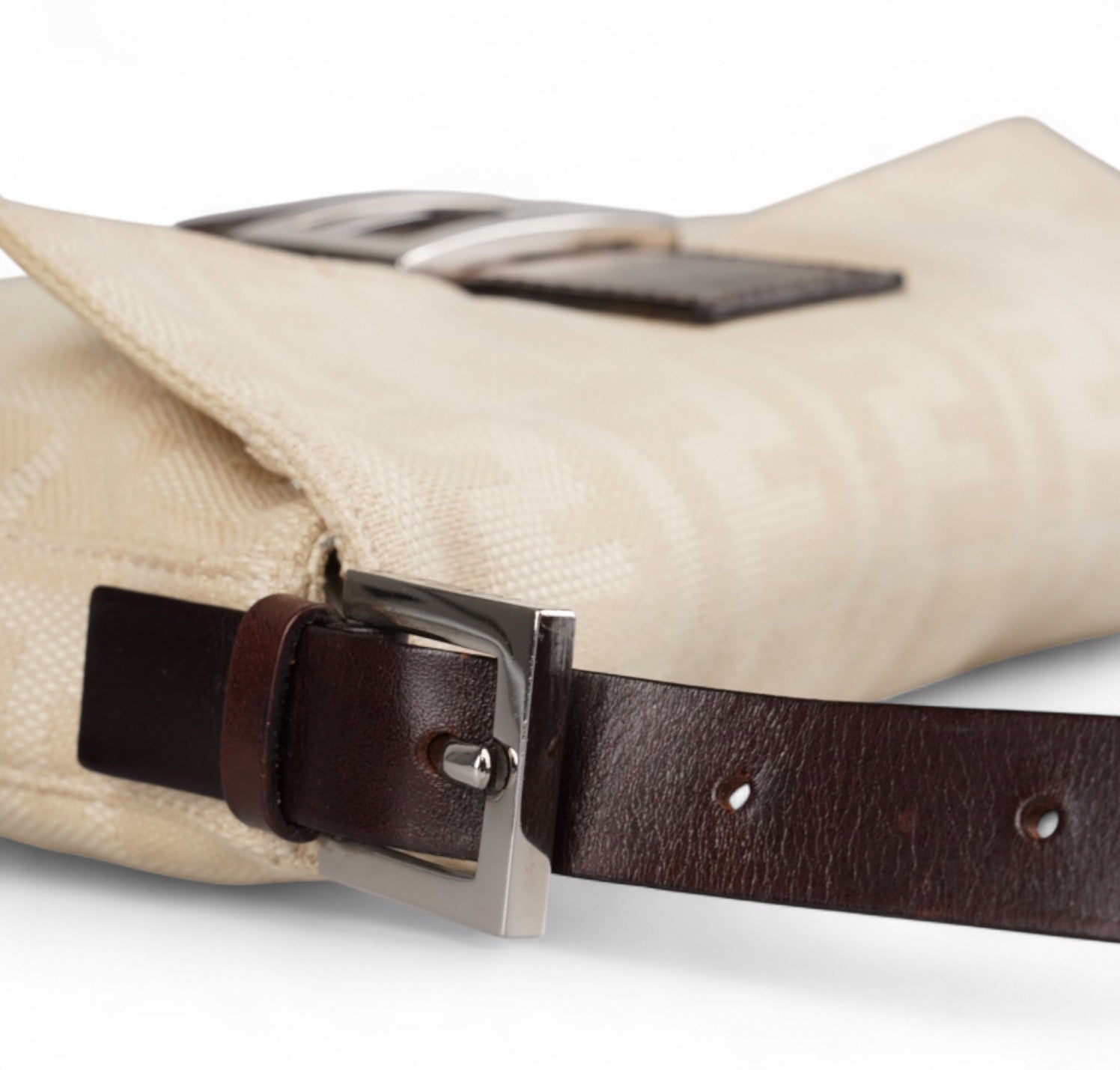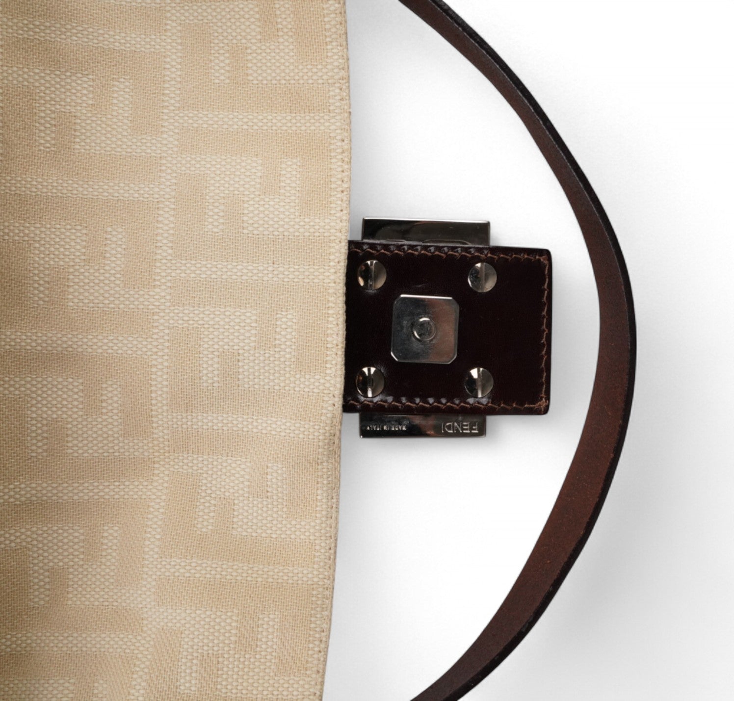 Borsa Fendi, modello Baguette, realizzata in Tela Monogram Avorio/Beige. Finiture in Pelle Marrone. Metalleria Argento. Chiusura magnetica posta su patta anteriore impreziosita dall'iconco logo FF. Interno foderato in tessuto, taschino con zip. Munita di manico superiore regolabile. Presenta micro graffi alla metalleria. Lievi segni del tempo generali. Minimi segni su pelle. Minimi segni interni.