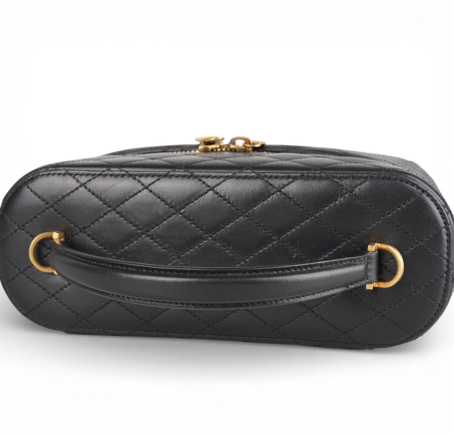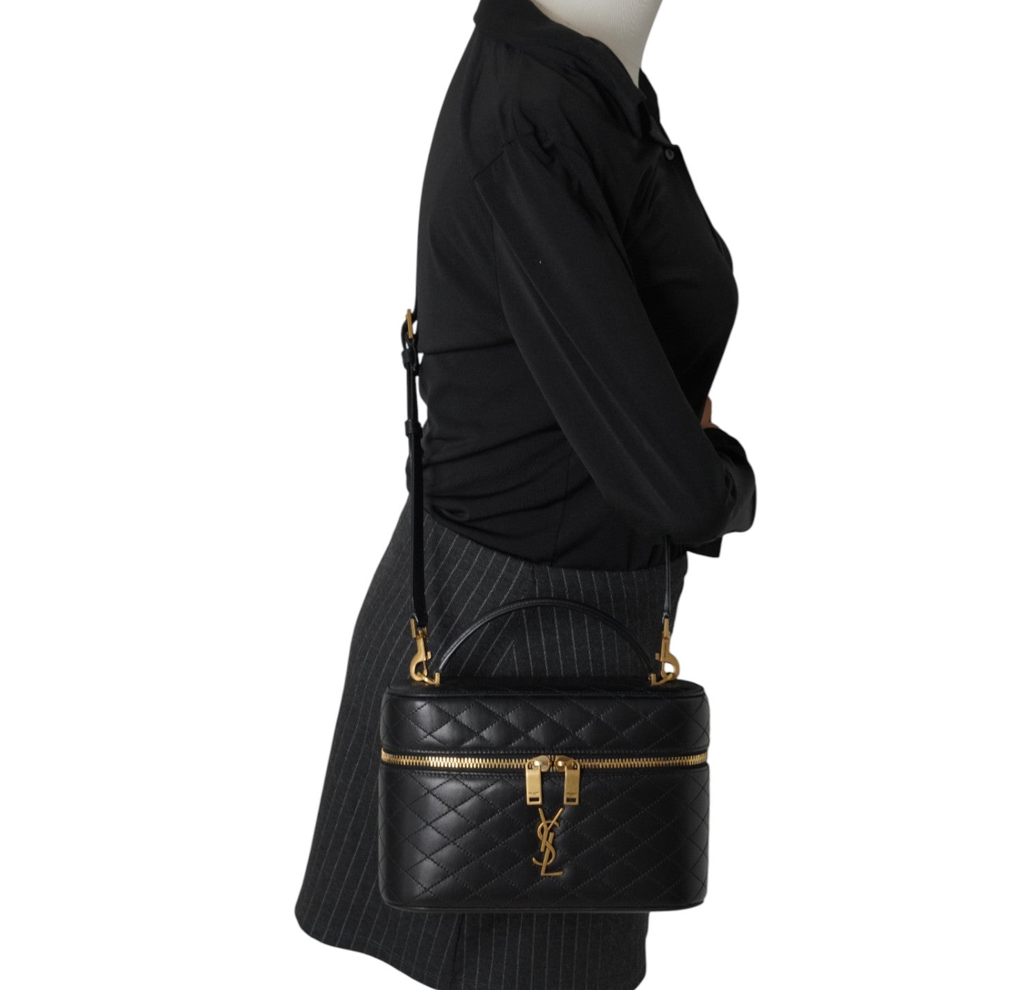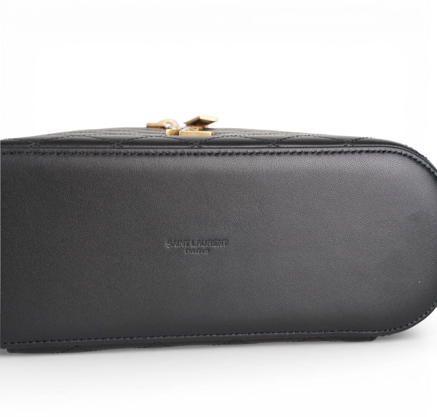 Borsa Saint Laurent, modello Gaby Vanity, misura Grande, realizzata in Pelle trapuntata Nera, impreziosita dall’iconico logo YSL in metallo color oro e da zip superiore con doppio cursore. Manico on top per il trasporto a mano, tracolla regolabile ed amovibile per portabilità a spalla o crossbody. Interno con unico scomparto con tasca piatta. Condizioni eccellenti, pari al nuovo. Potrebbero essere presenti micro segni di stoccaggio.