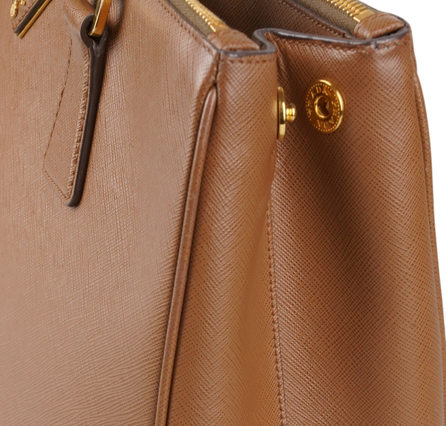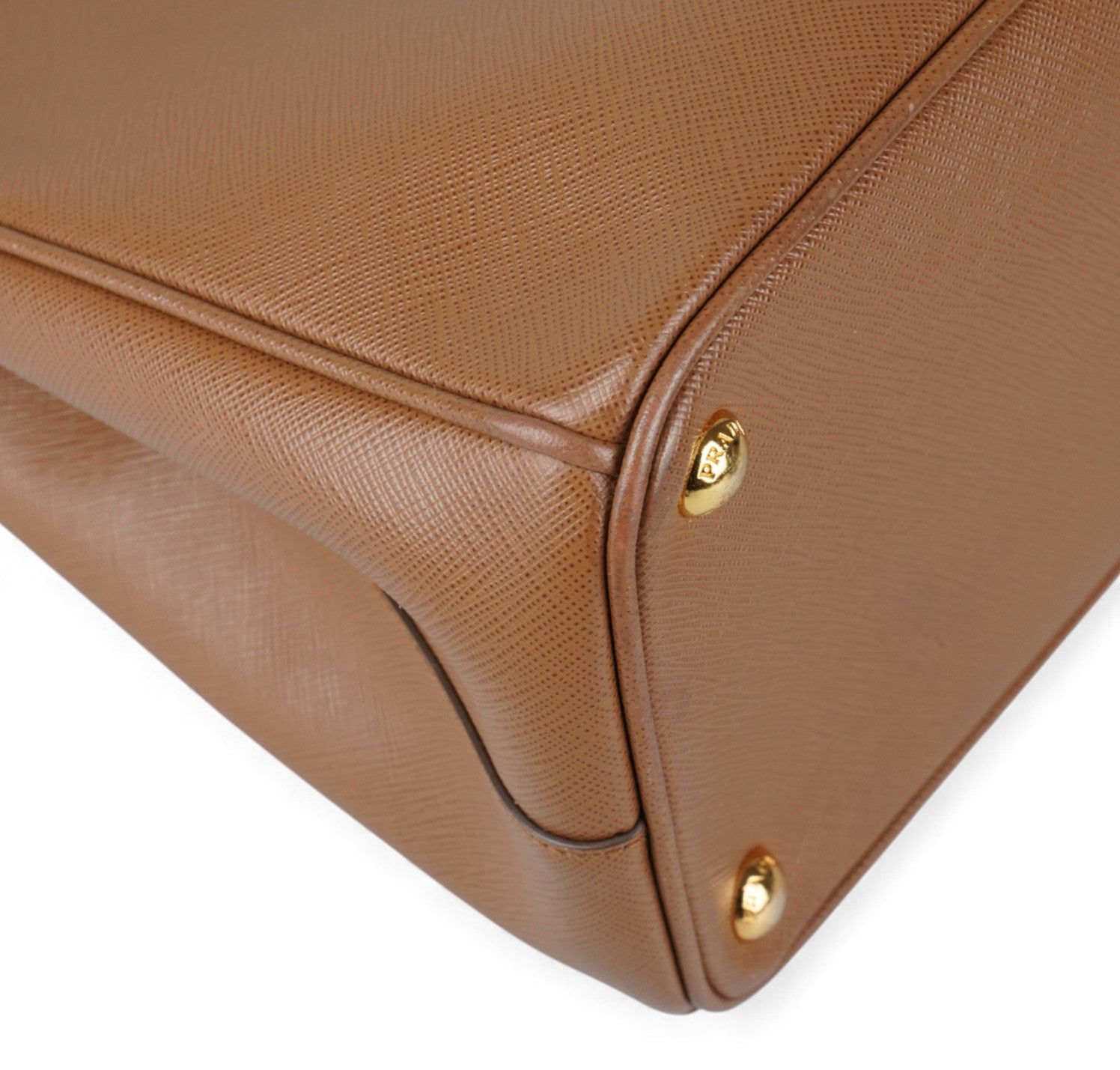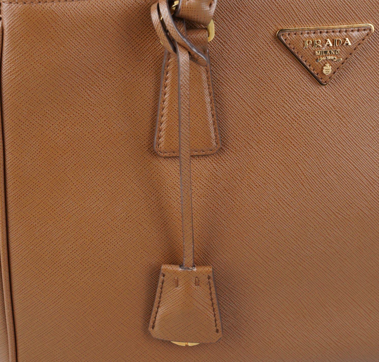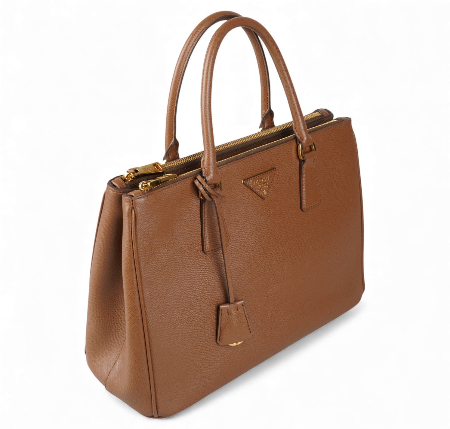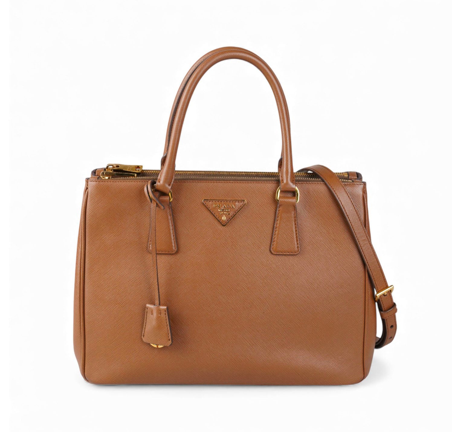 Borsa Prada, modello Galleria, misura Grande, realizzata in Pelle Saffiano, color Cammello. Metalleria color Oro. Internamente foderata in tessuto logato Beige, con dettagli in pelle e tasche esterne con chiusura a zip. Presente bottone laterale per aumentare o diminuire la capienza interna. Portachiavi frontale amovibile. Munita di tracolla amovibile e regolabile. Lievi segni del tempo generali. Lievi segni del tempo alla metalleria.