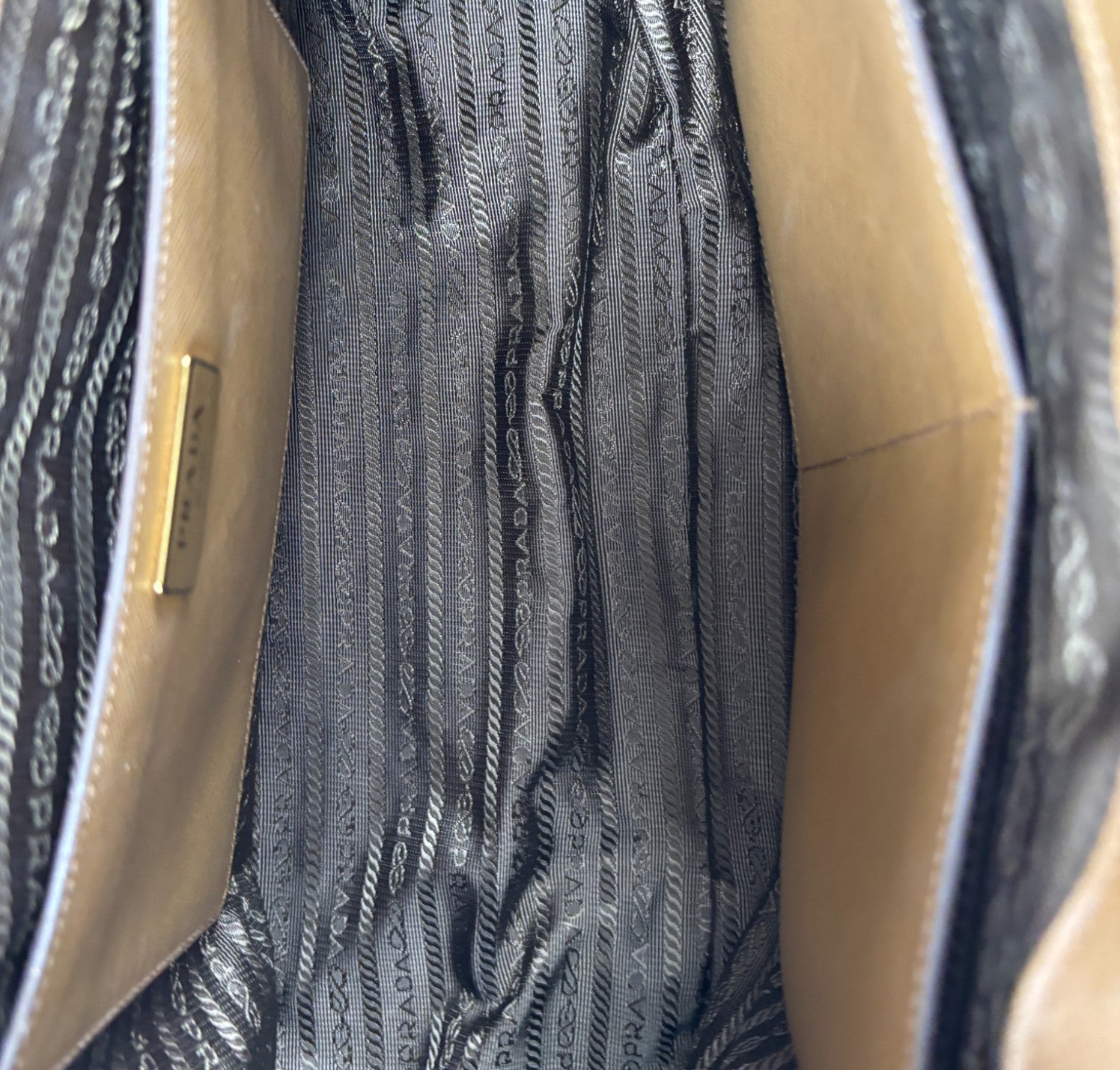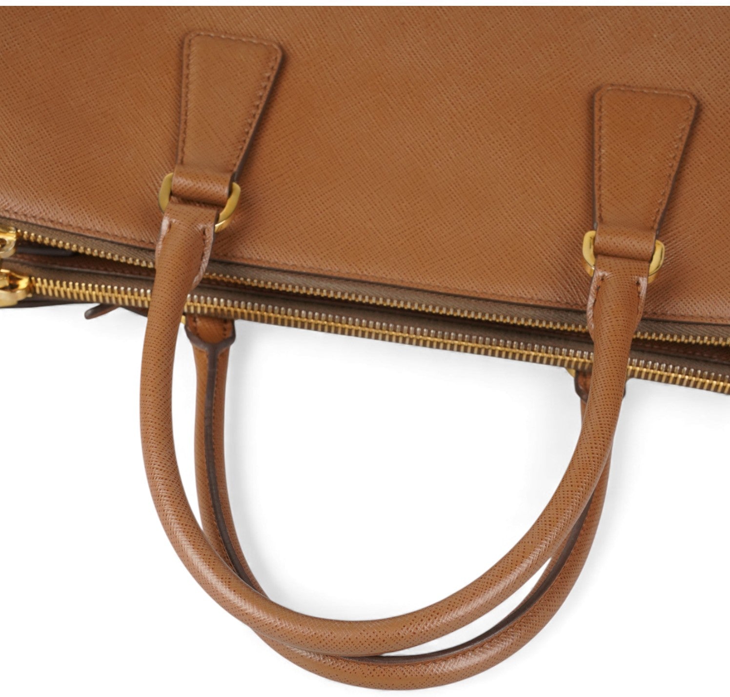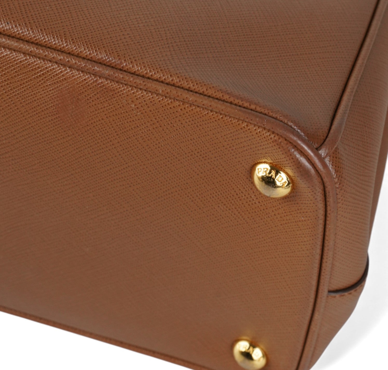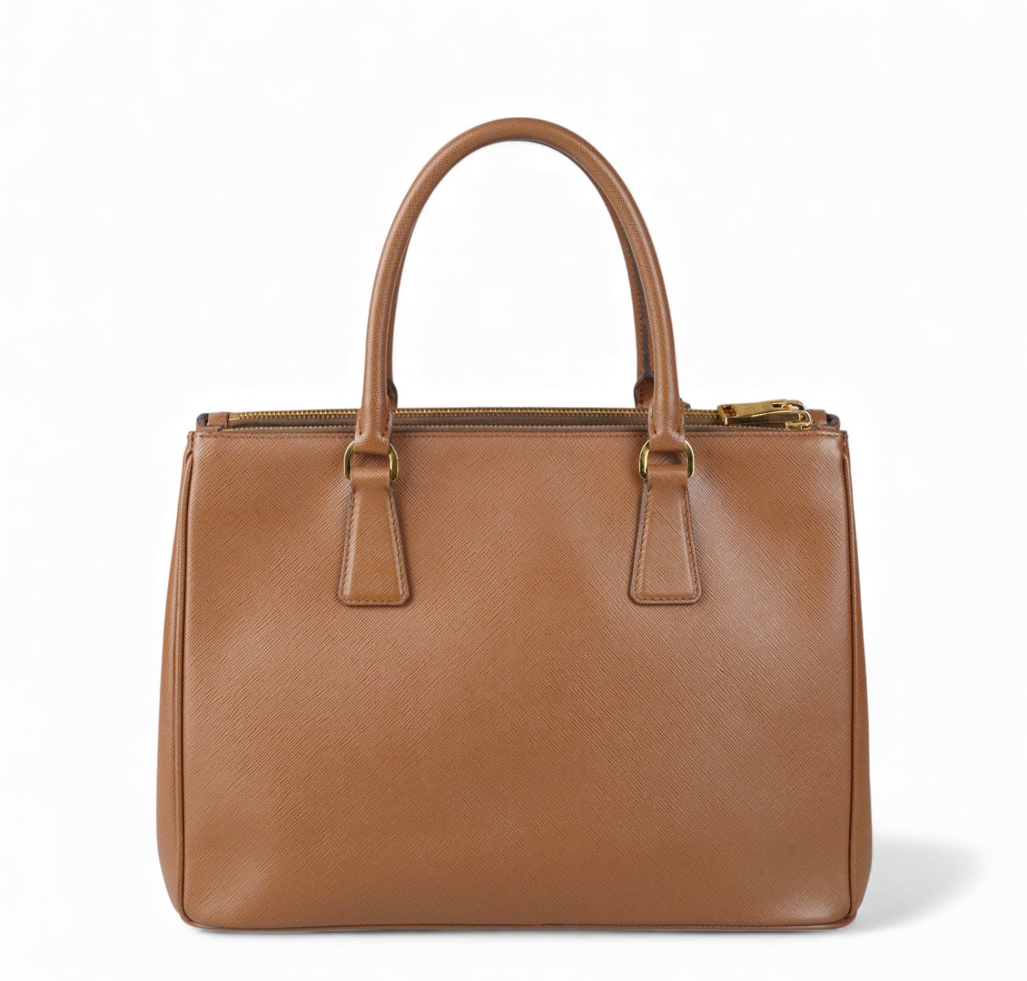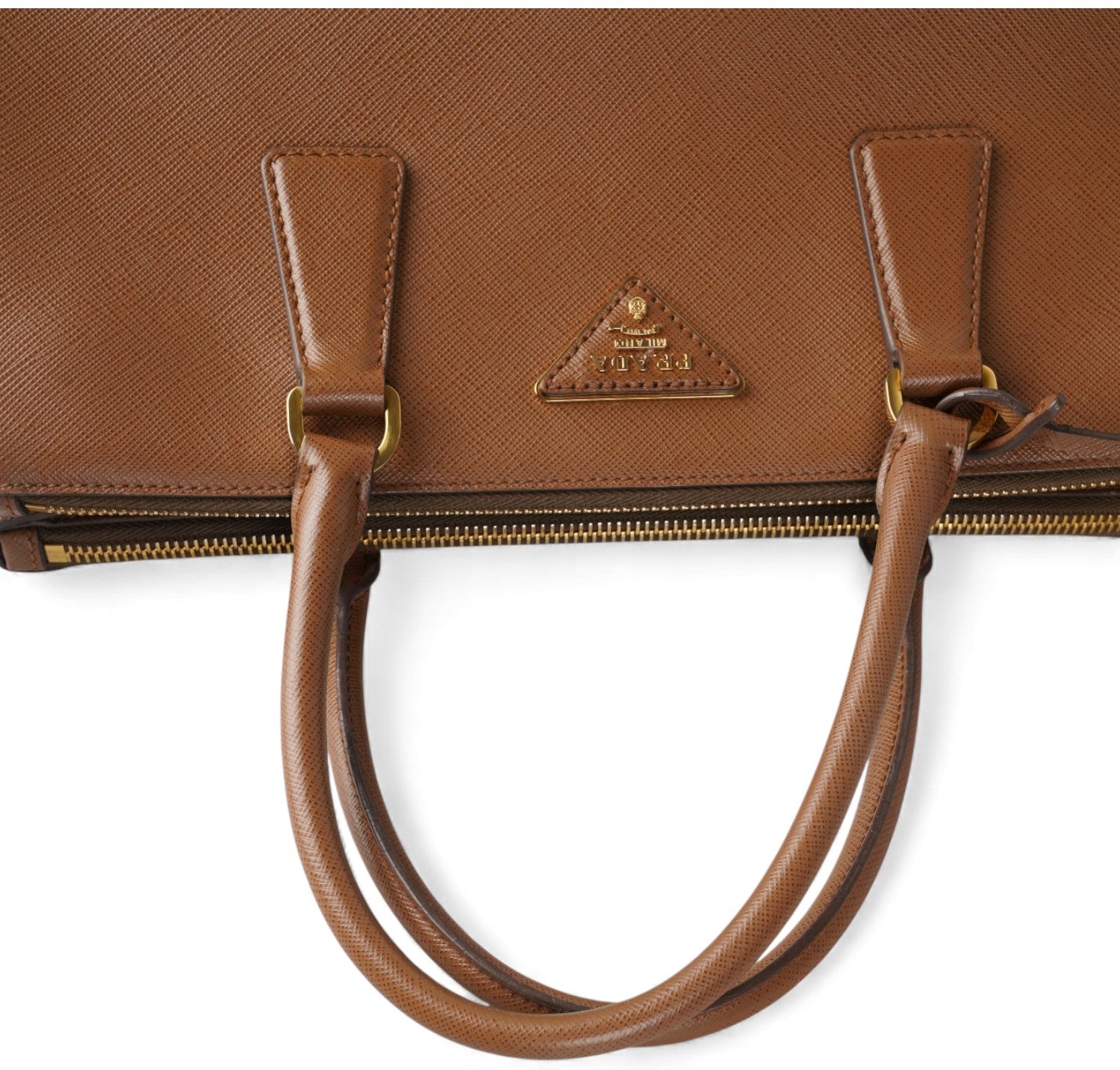 Borsa Prada, modello Galleria, misura Grande, realizzata in Pelle Saffiano, color Cammello. Metalleria color Oro. Internamente foderata in tessuto logato Beige, con dettagli in pelle e tasche esterne con chiusura a zip. Presente bottone laterale per aumentare o diminuire la capienza interna. Portachiavi frontale amovibile. Munita di tracolla amovibile e regolabile. Lievi segni del tempo generali. Lievi segni del tempo alla metalleria.