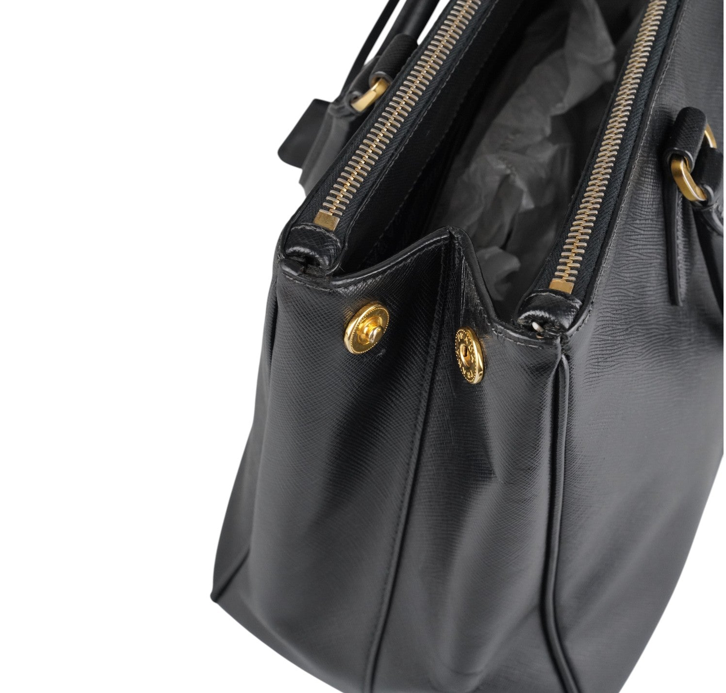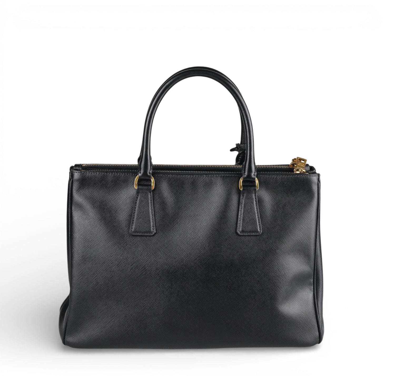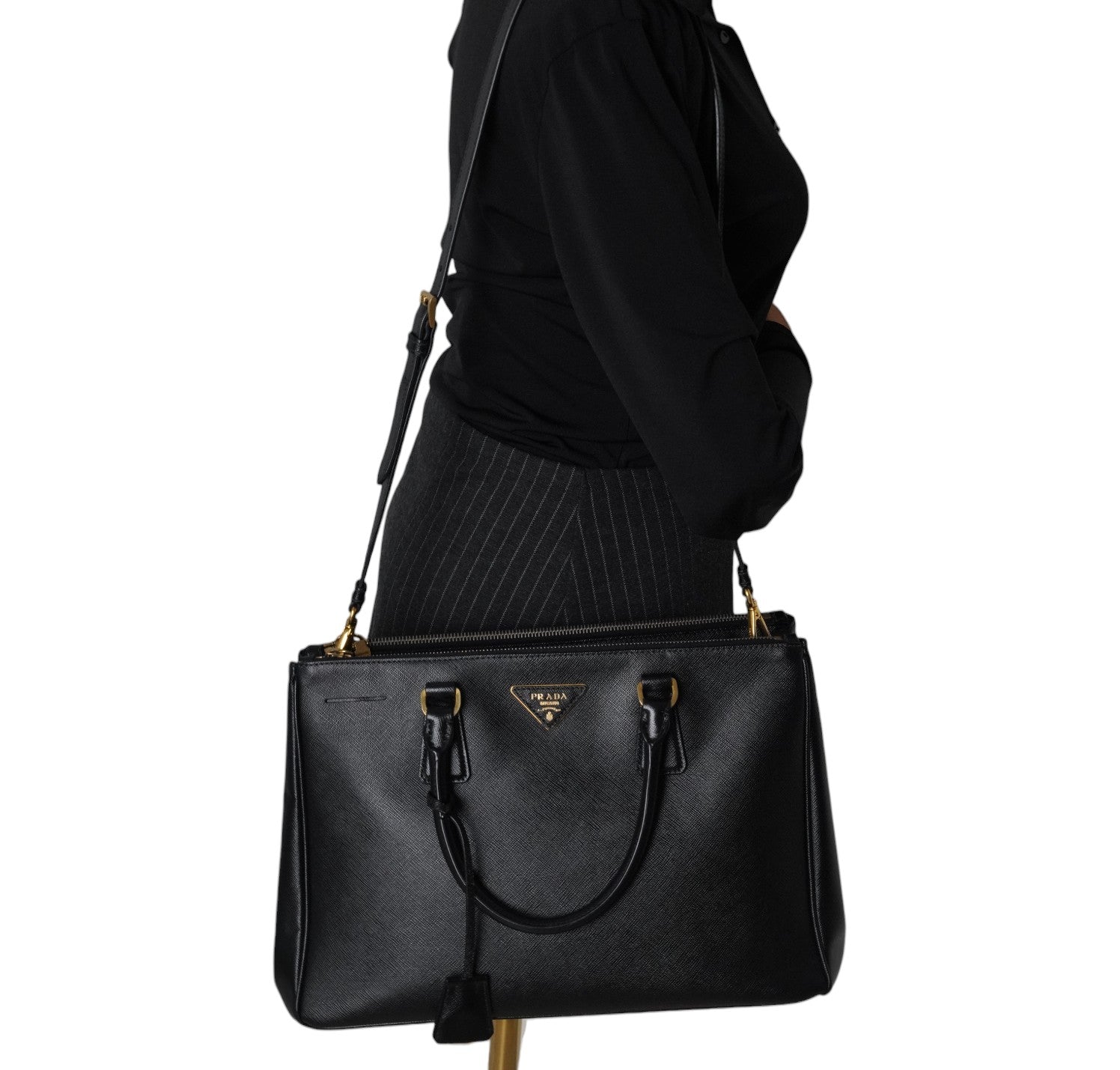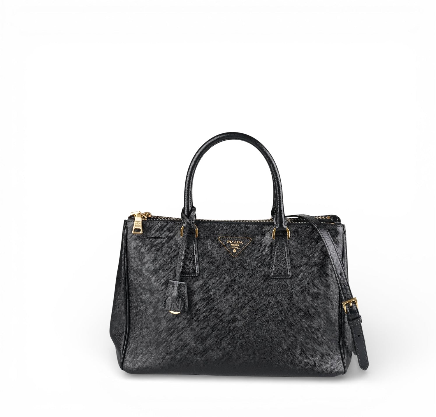 Borsa Prada, modello Galleria, misura Media (attualmente sostituita come Large dalla maison), realizzata in Pelle Saffiano Nera. Metalleria color Oro. Internamente foderata in tessuto logato, con dettagli in pelle e tasche esterne con chiusura a zip. Bottoni laterali per aumentare o diminuire la capienza interna. Munita di tracolla amovibile e regolabile. Lievi segni del tempo generali. Lievi segni del tempo alla metalleria, pelle.