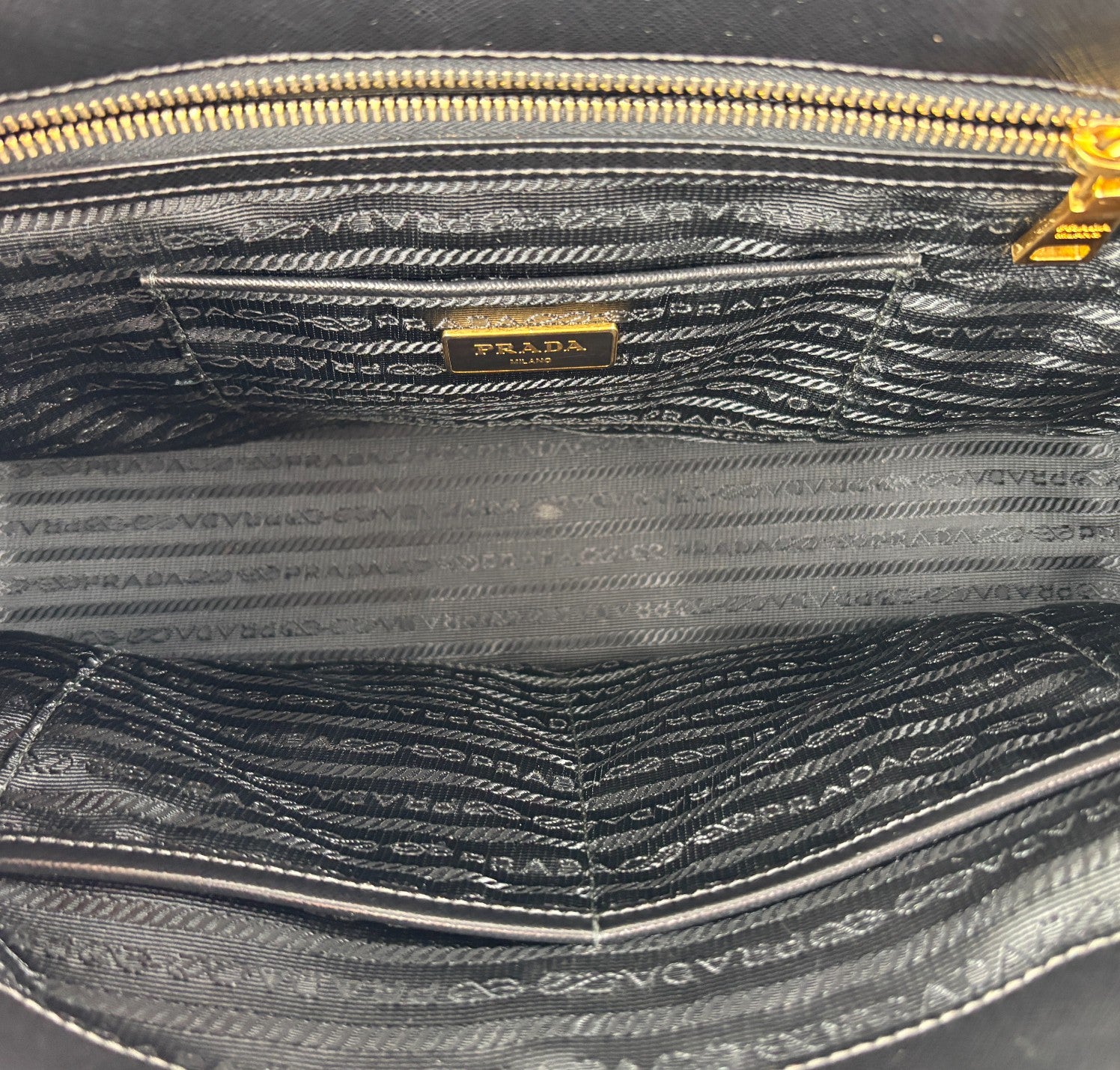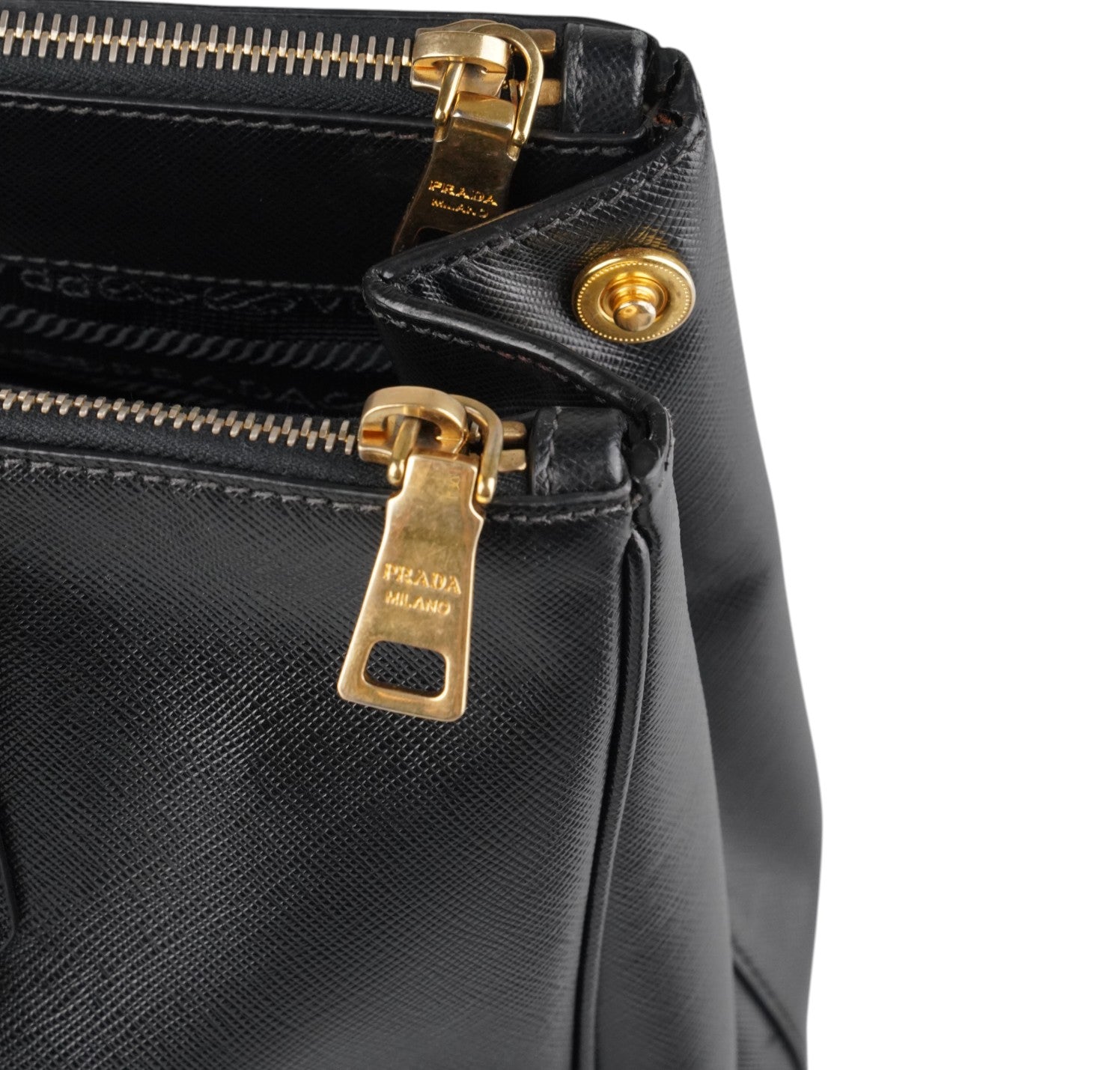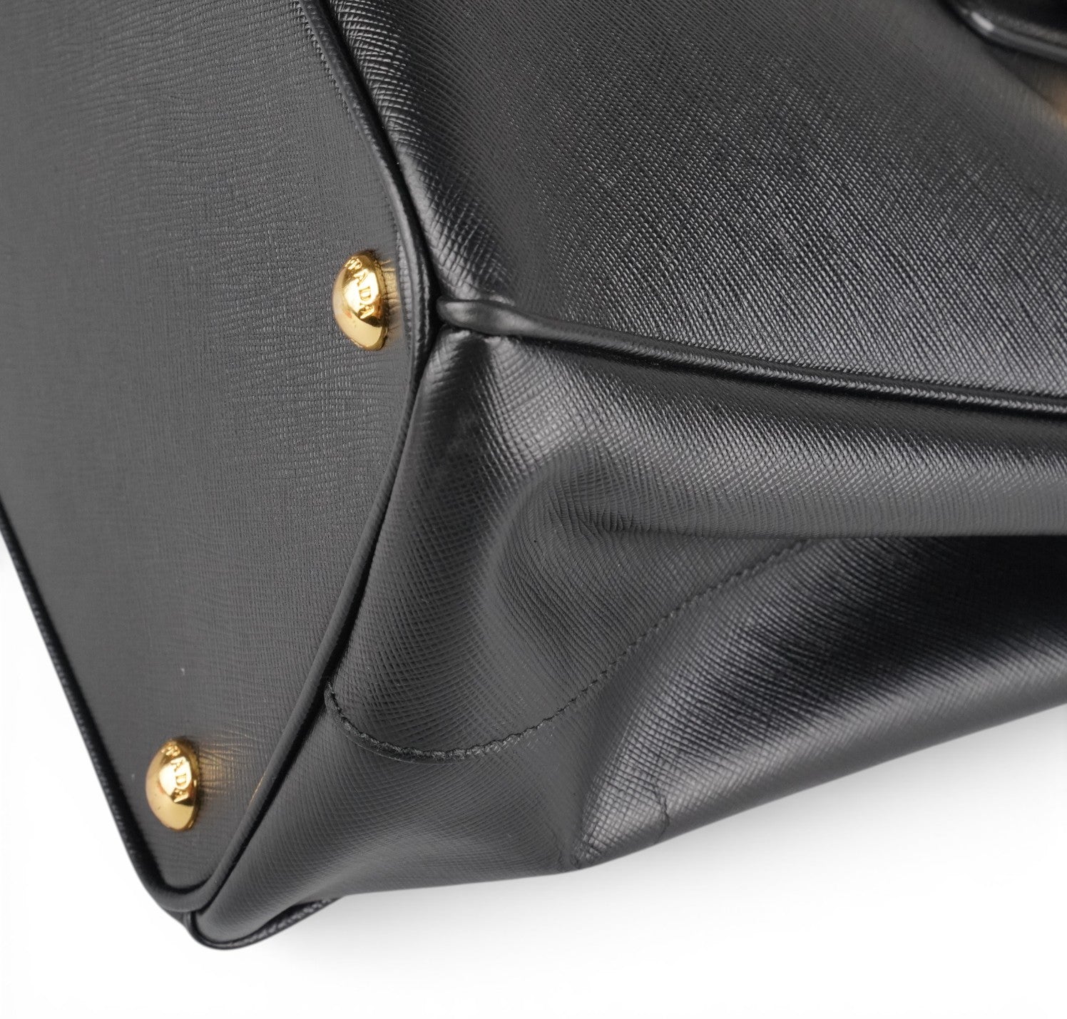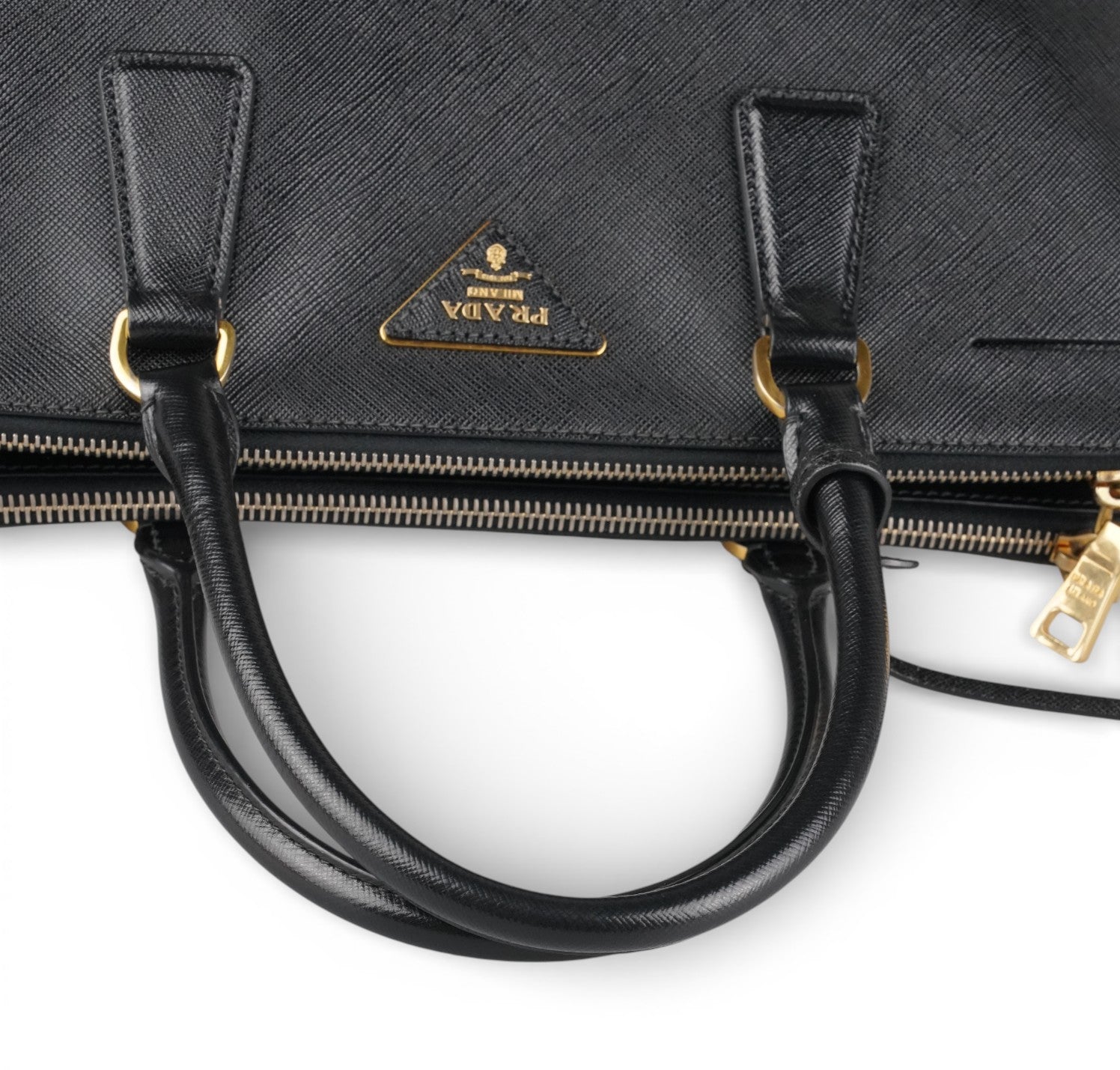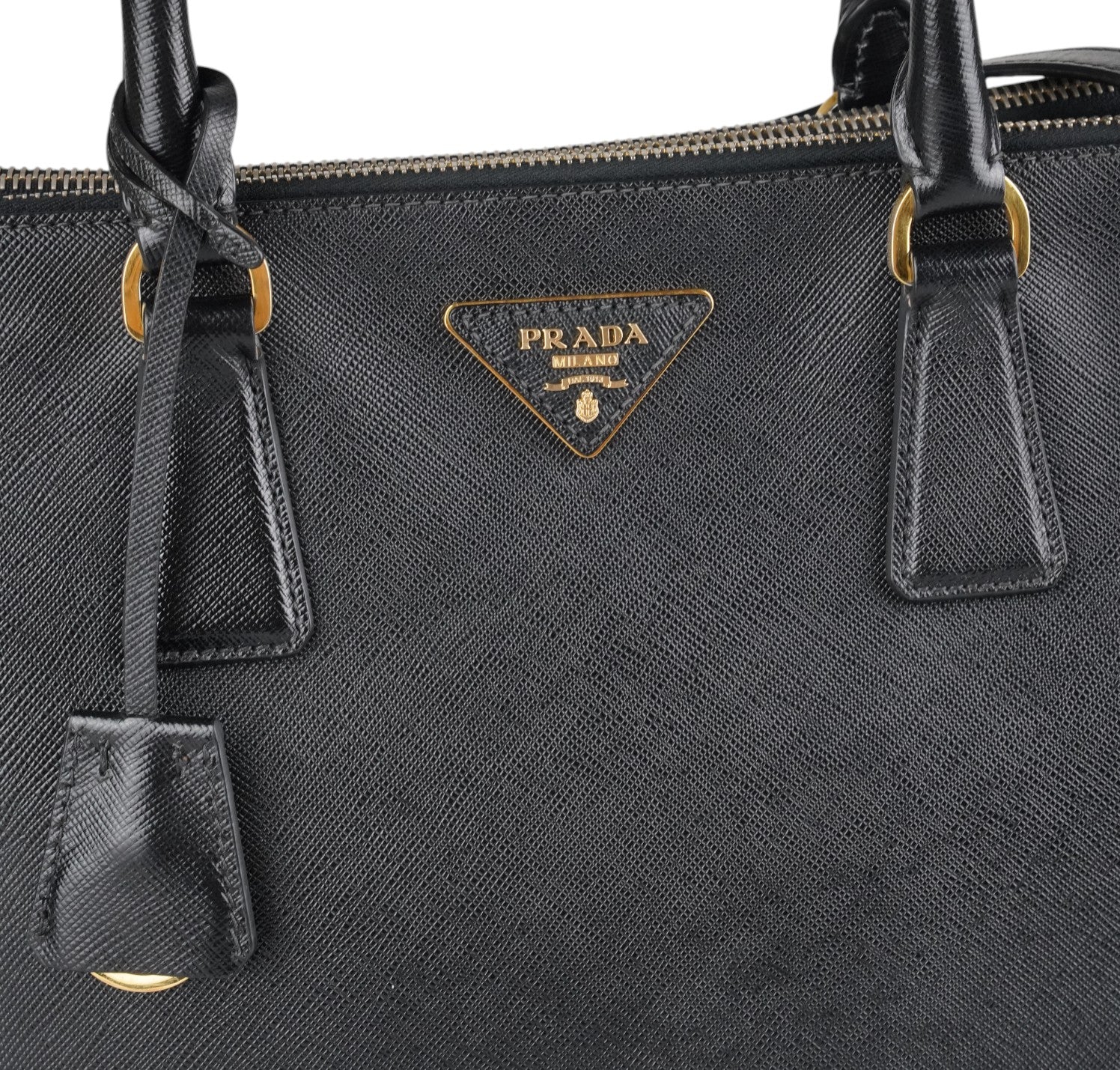 Borsa Prada, modello Galleria, misura Media (attualmente sostituita come Large dalla maison), realizzata in Pelle Saffiano Nera. Metalleria color Oro. Internamente foderata in tessuto logato, con dettagli in pelle e tasche esterne con chiusura a zip. Bottoni laterali per aumentare o diminuire la capienza interna. Munita di tracolla amovibile e regolabile. Lievi segni del tempo generali. Lievi segni del tempo alla metalleria, pelle.