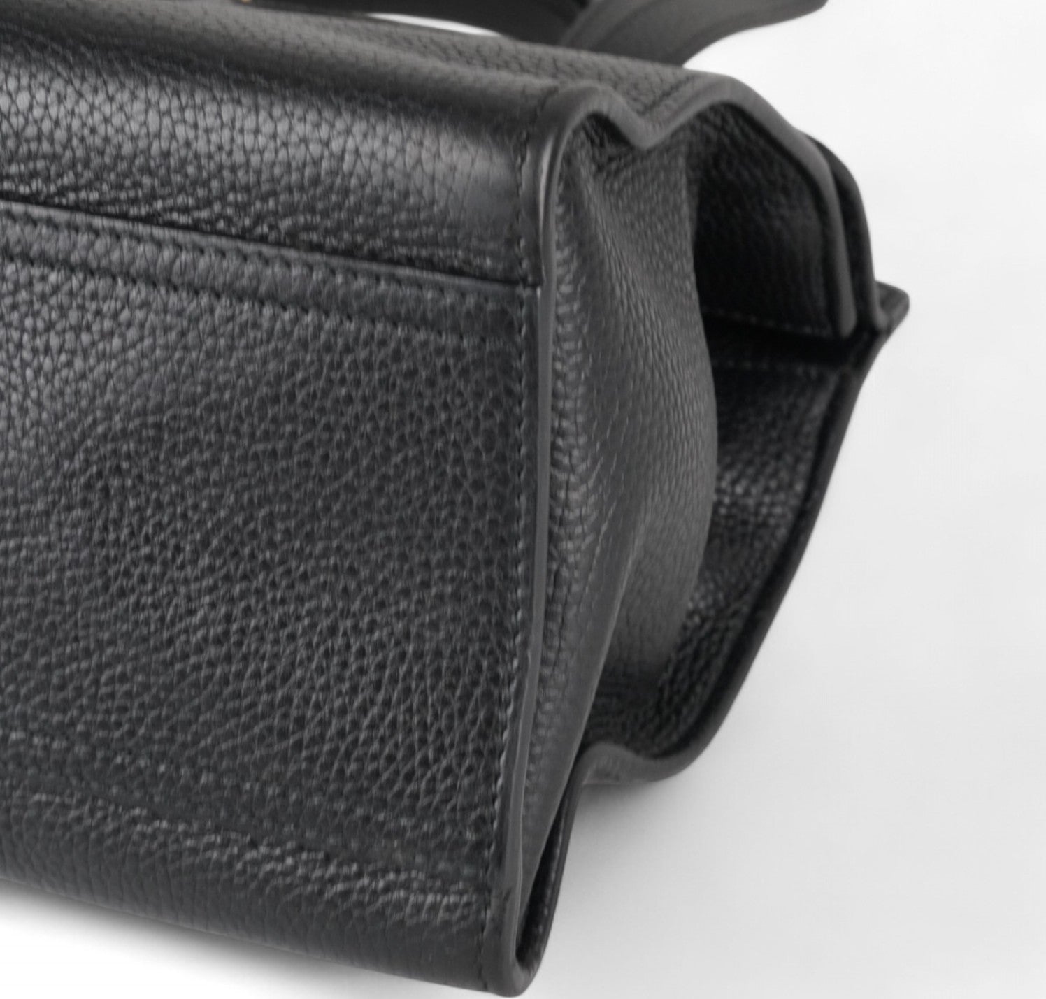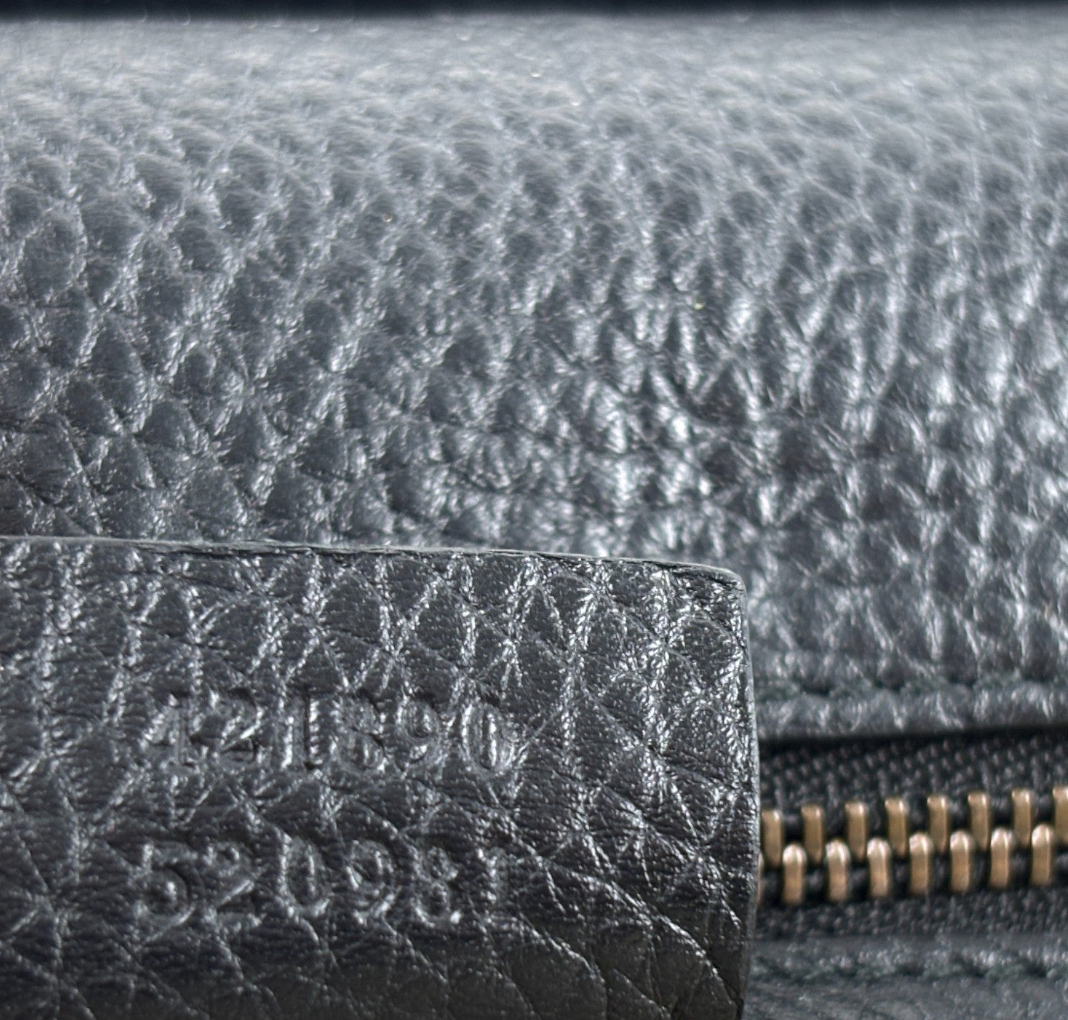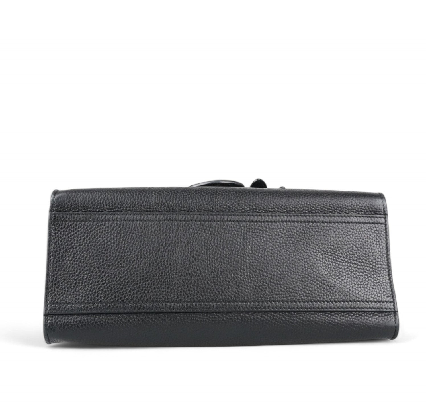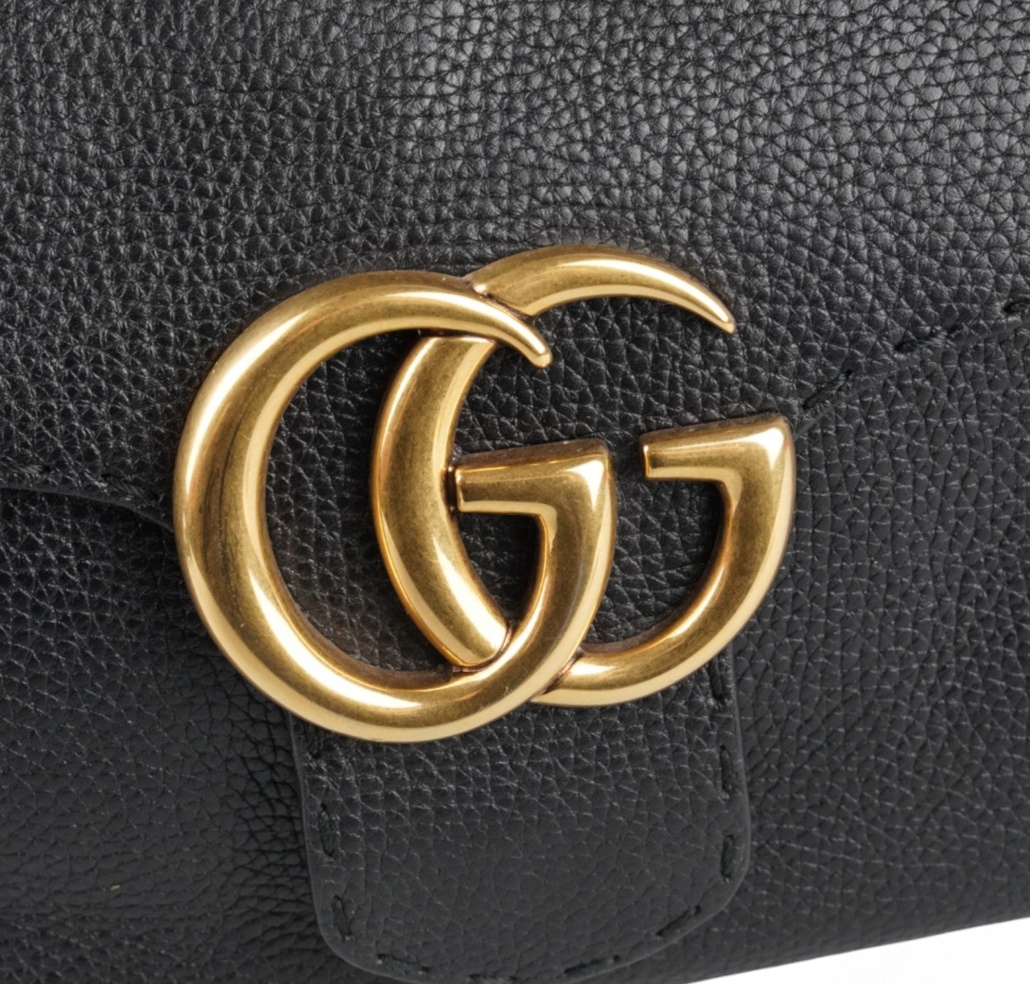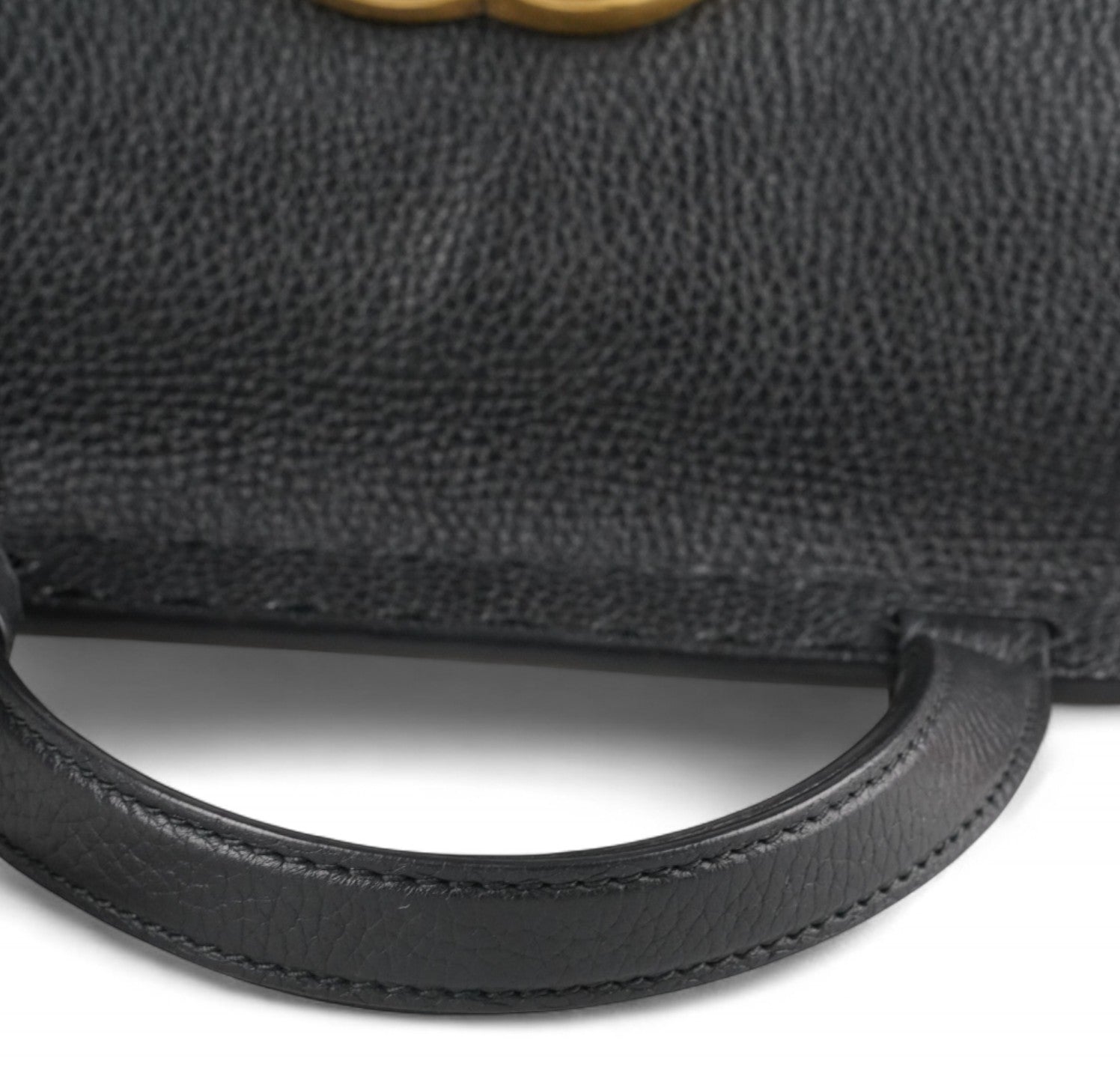 Borsa Gucci, modello GG Marmont Top Handle, realizzata in Pelle Nera, caratterizzata da impunture. Iconico dettaglio doppia G in metallo dorato effetto anticato sul davanti. Dotata di manico superiore e tracolla regolabile e removibile. Forma morbida ma lievemente strutturata con chiusura a molla. Interno foderato in tessuto chiaro con tasca con zip e tasca piatta. Minimi segni del tempo generali.