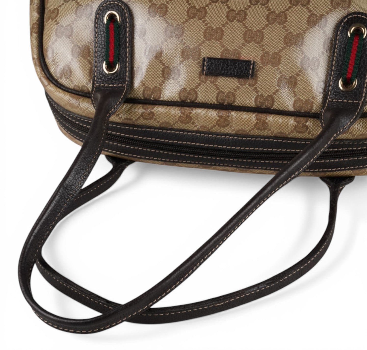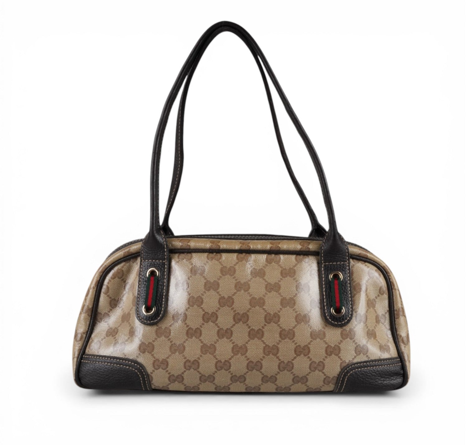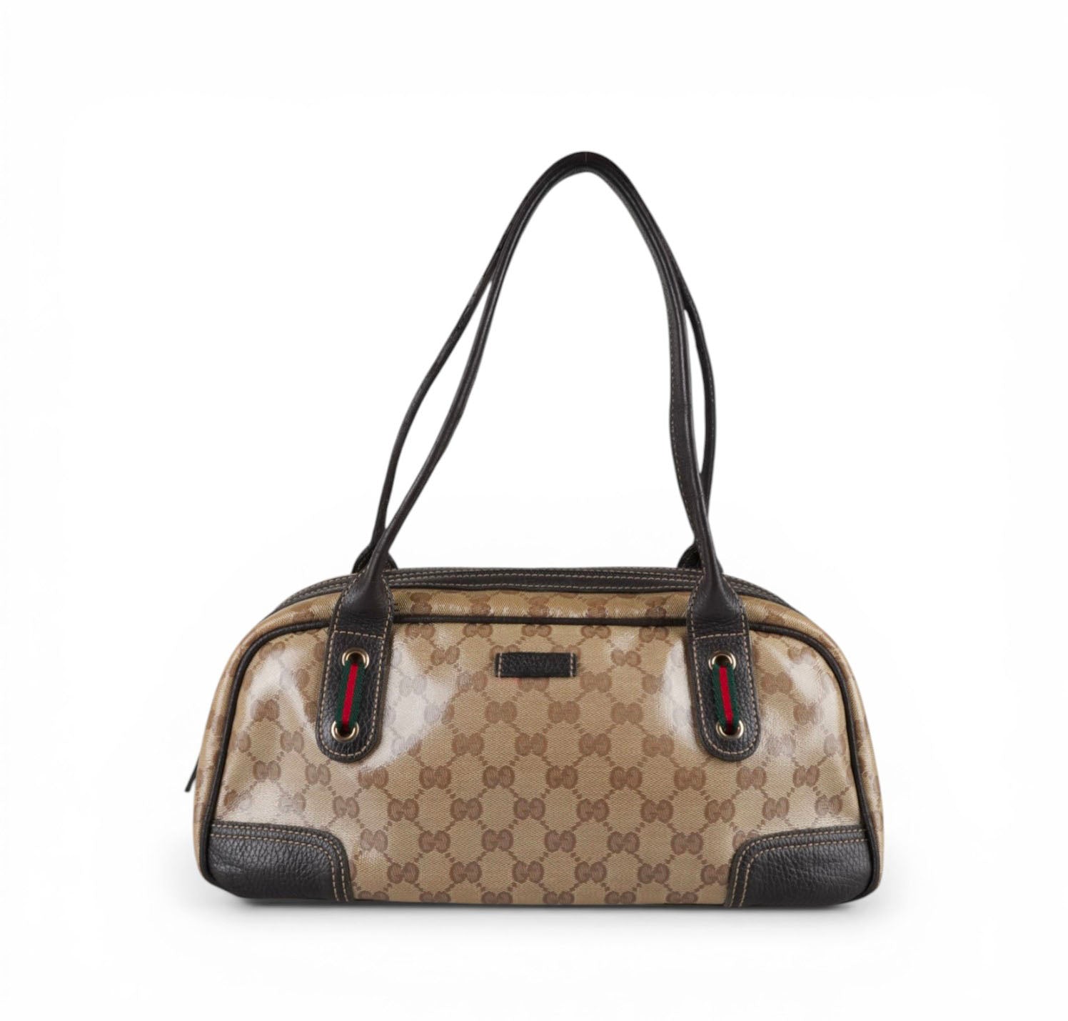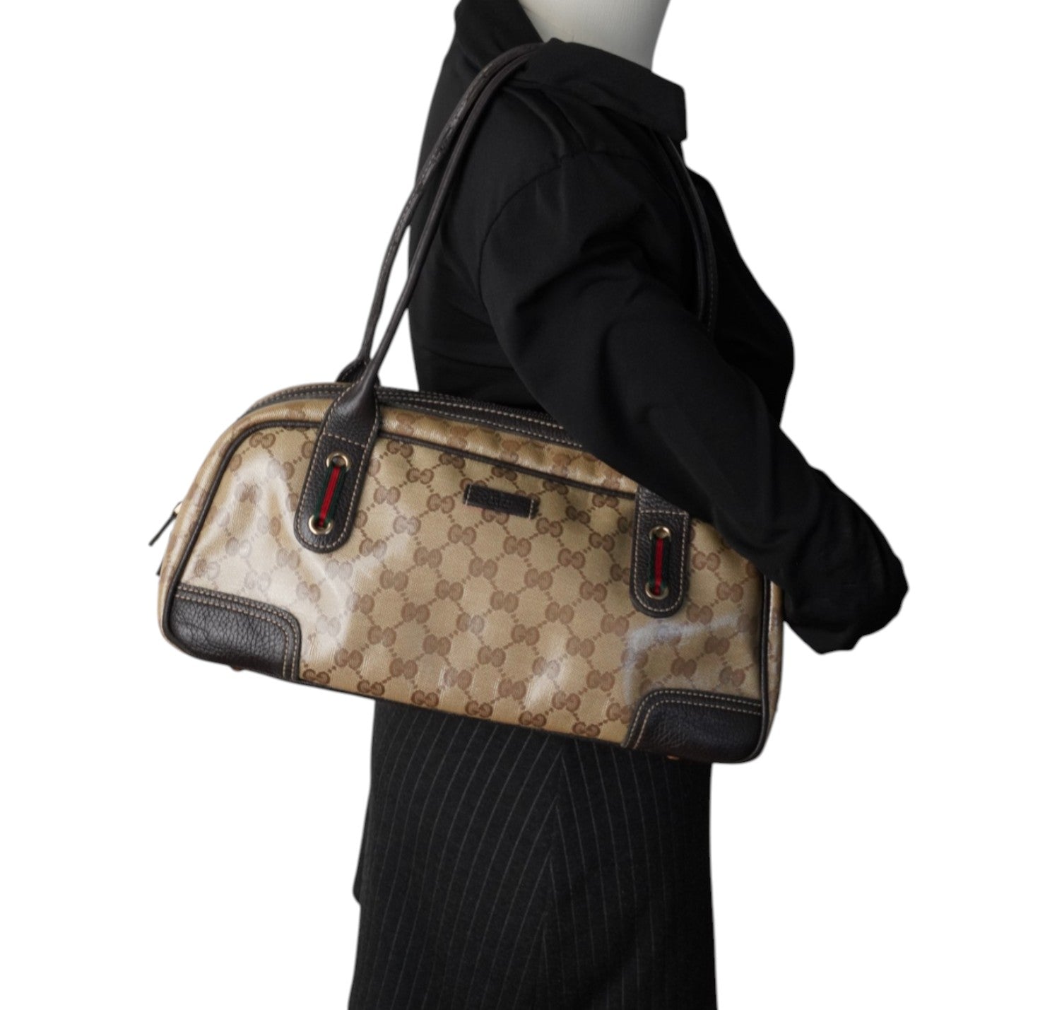 Borsa GUCCI, modello Princy Boston, realizzata in tela Crystal GG (plastificata) nei toni del Beige con finiture in pelle Marrone. Dettagli iconici Web verde/rosso e hardware color oro. Sottospalla dalla struttura semi rigida che si sviluppa in orizzontale. Chiusura superiore con zip. Interno foderato in tessuto con tasca con zip e taschini portaoggetti. Dotata di doppi manici, morbidi, per portabilità a spalla. Modello pratico e intramontabile, ideale per l’uso quotidiano. Condizioni ottime, con lievi segni d’uso generali. Minimo scolorimento in prossimità del logo frontale.