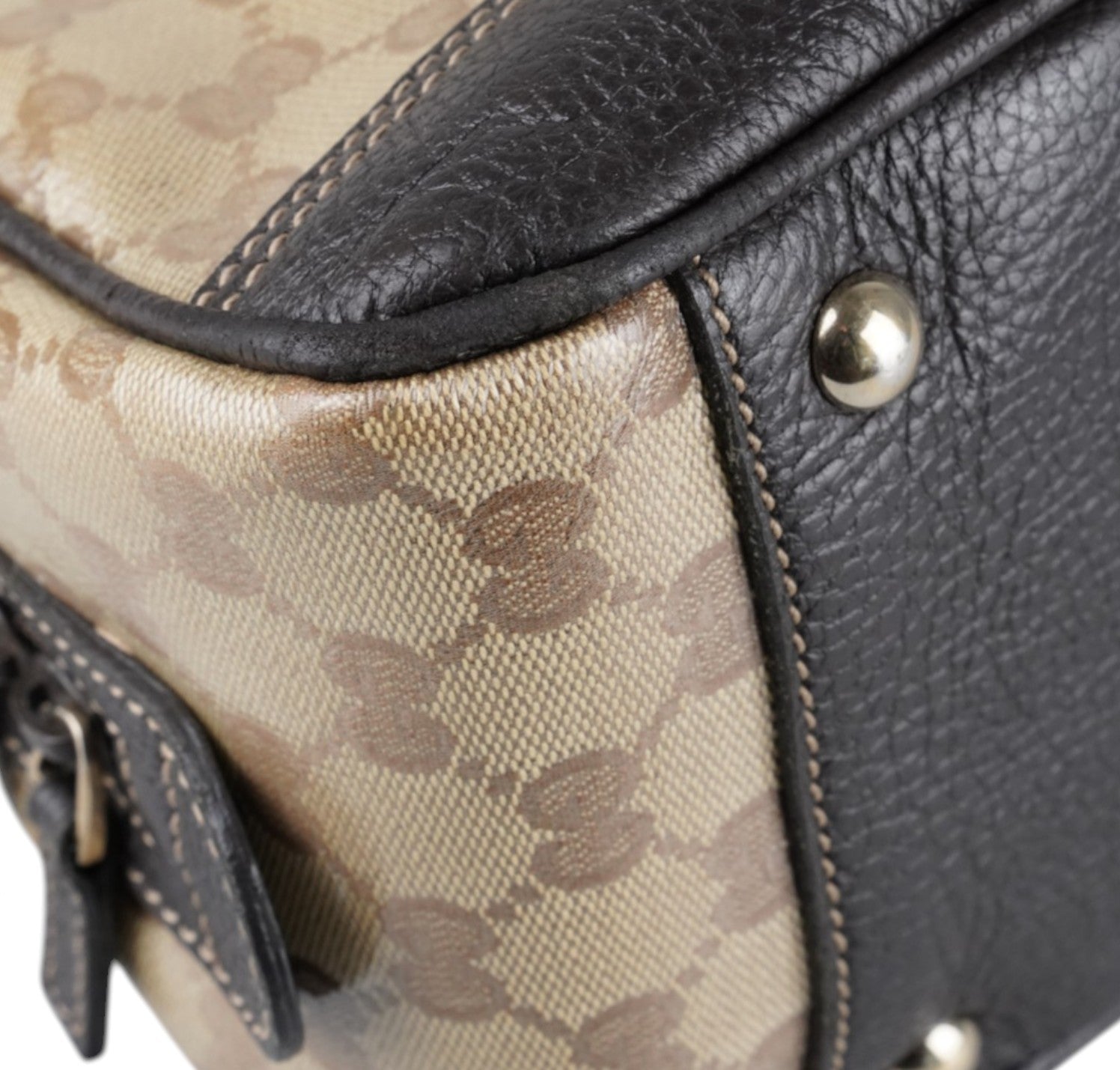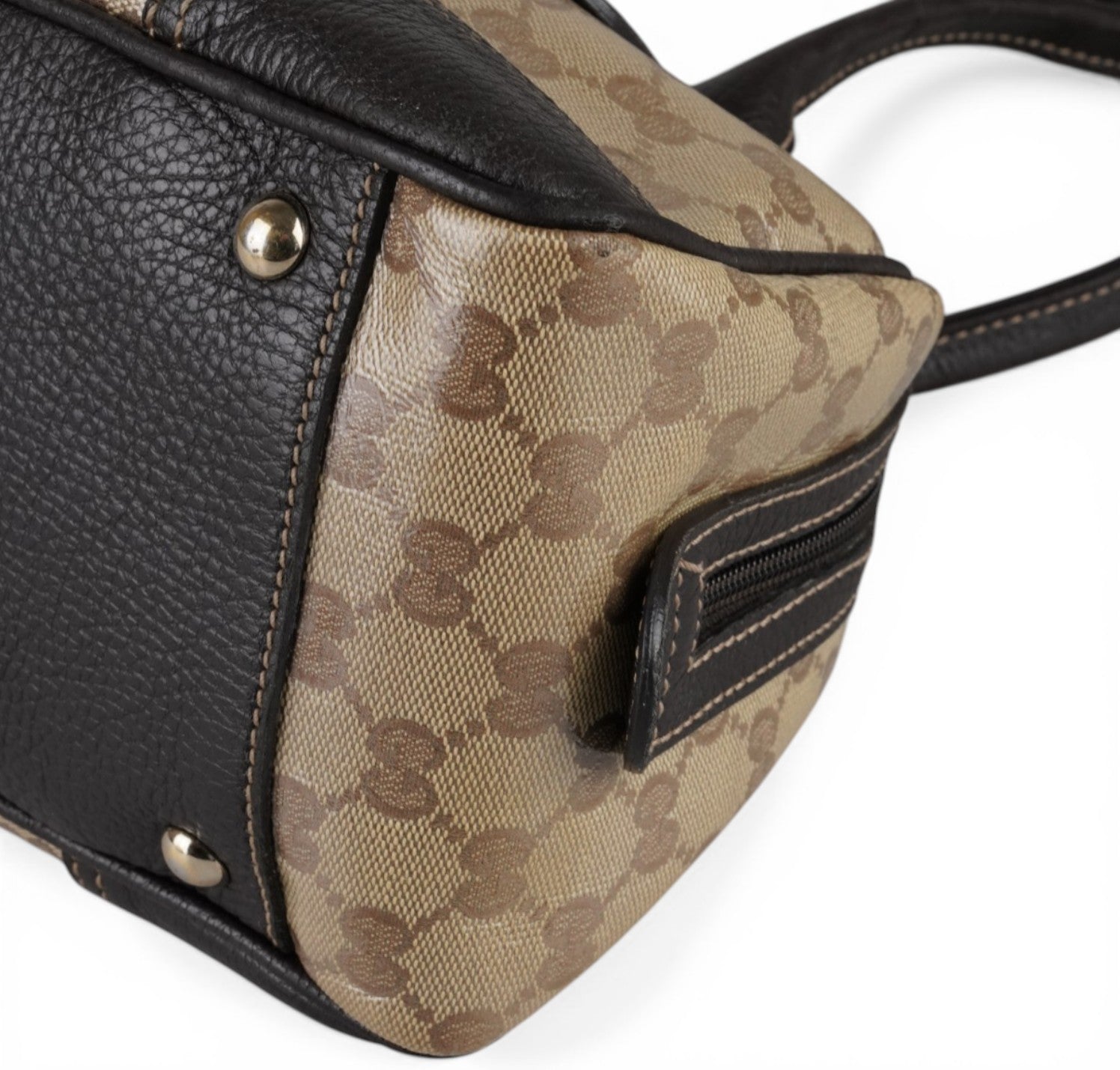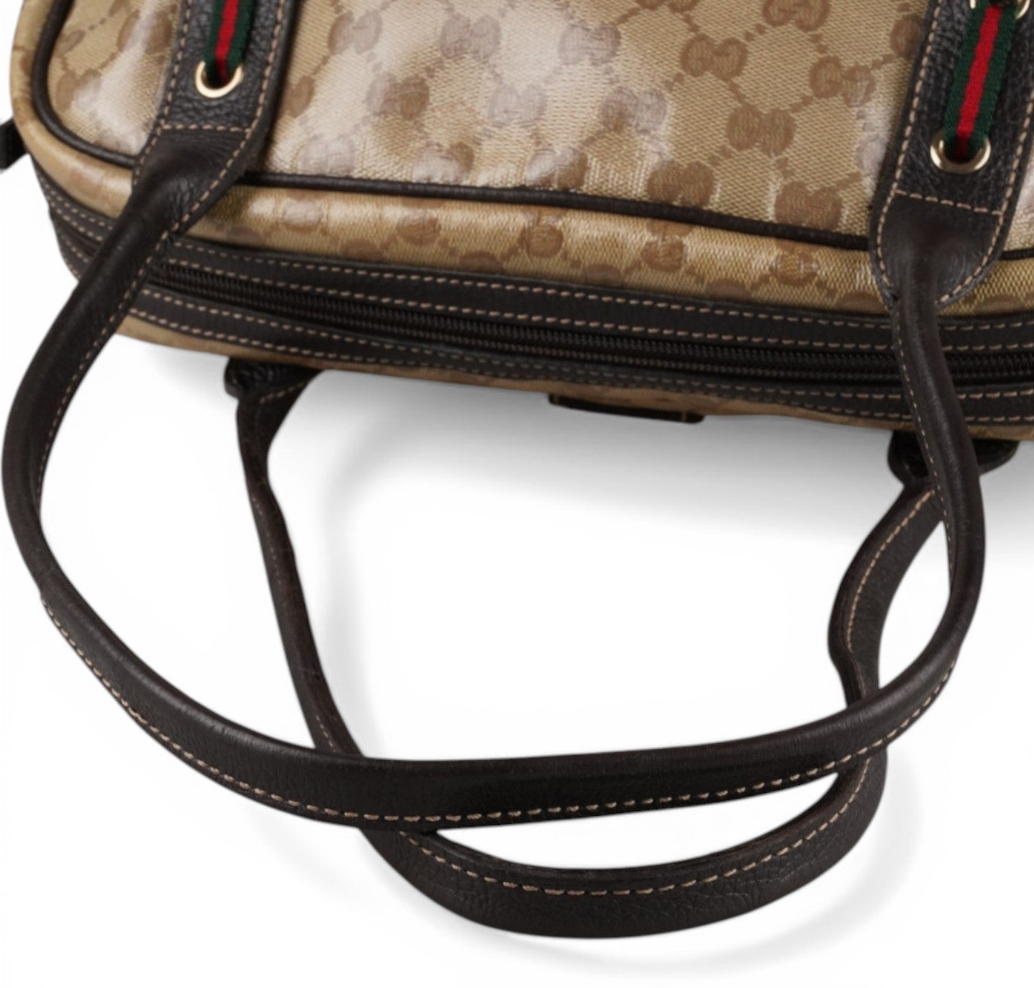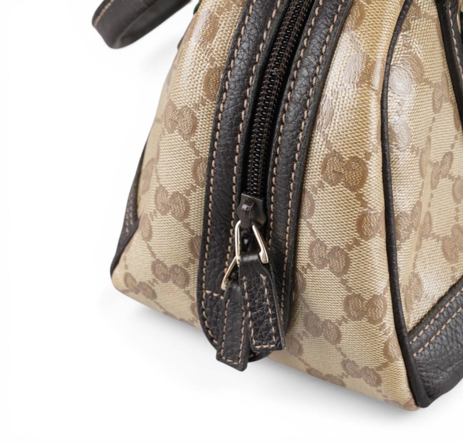 Borsa GUCCI, modello Princy Boston, realizzata in tela Crystal GG (plastificata) nei toni del Beige con finiture in pelle Marrone. Dettagli iconici Web verde/rosso e hardware color oro. Sottospalla dalla struttura semi rigida che si sviluppa in orizzontale. Chiusura superiore con zip. Interno foderato in tessuto con tasca con zip e taschini portaoggetti. Dotata di doppi manici, morbidi, per portabilità a spalla. Modello pratico e intramontabile, ideale per l’uso quotidiano. Condizioni ottime, con lievi segni d’uso generali. Minimo scolorimento in prossimità del logo frontale.
