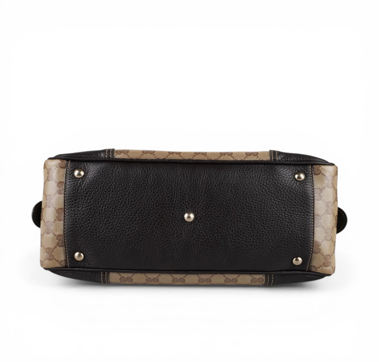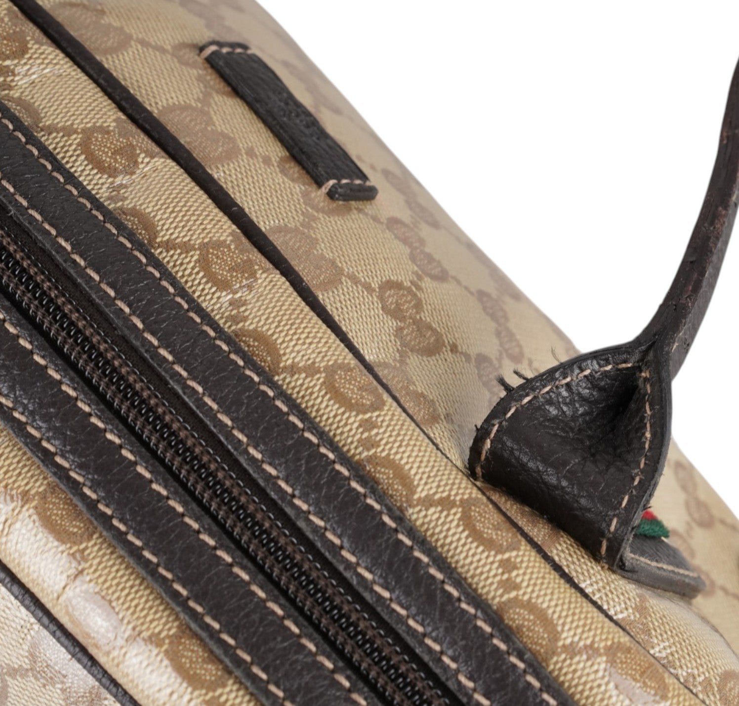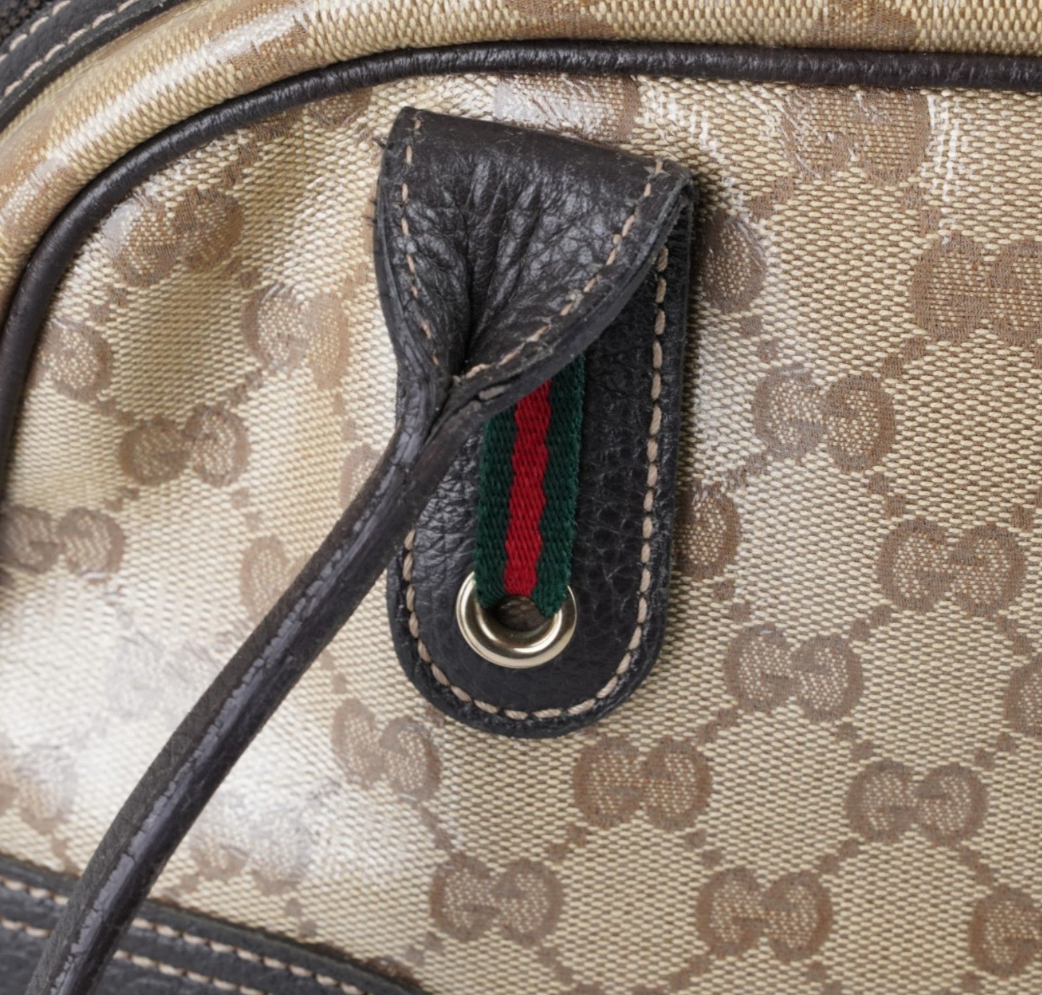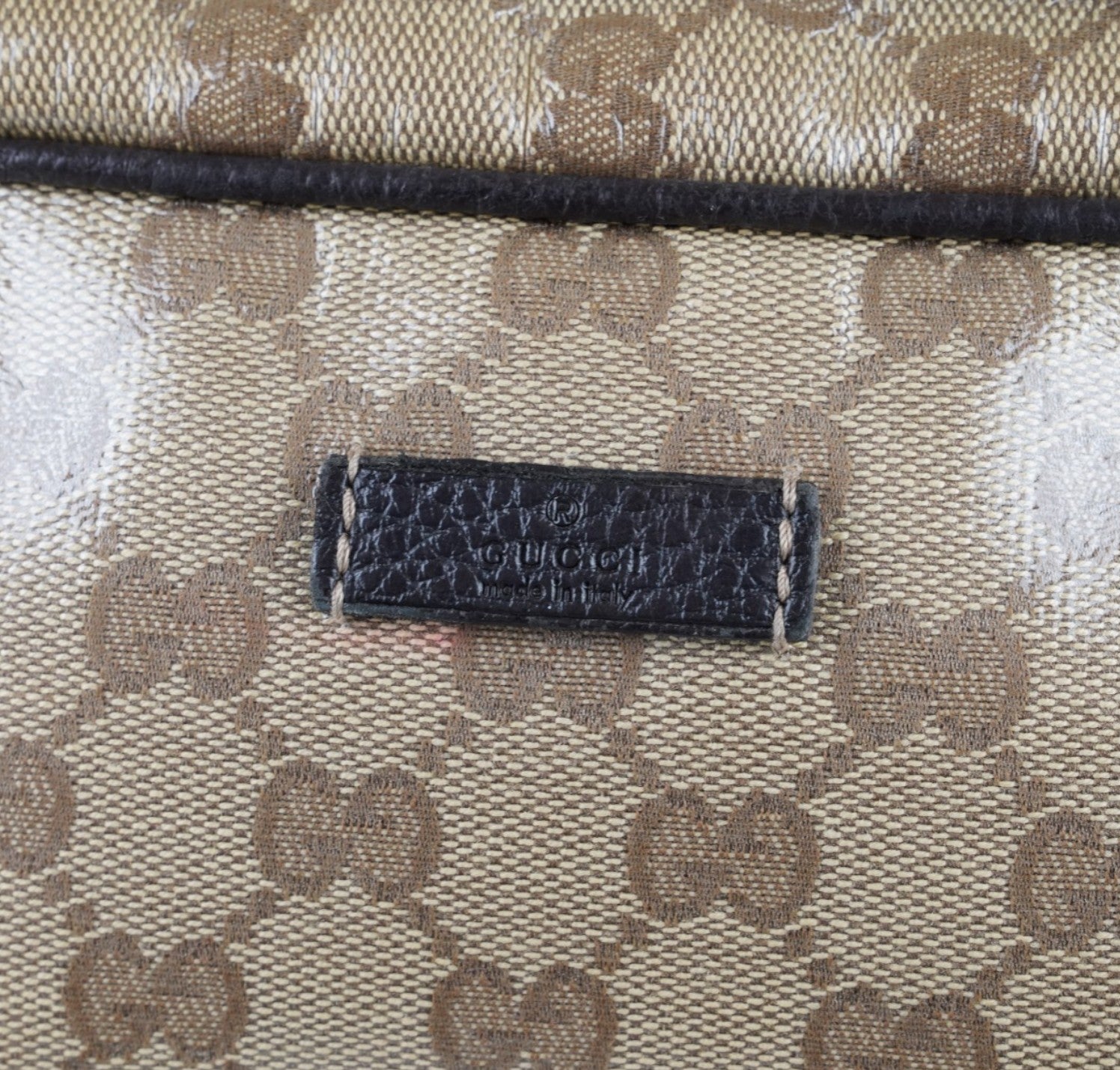 Borsa GUCCI, modello Princy Boston, realizzata in tela Crystal GG (plastificata) nei toni del Beige con finiture in pelle Marrone. Dettagli iconici Web verde/rosso e hardware color oro. Sottospalla dalla struttura semi rigida che si sviluppa in orizzontale. Chiusura superiore con zip. Interno foderato in tessuto con tasca con zip e taschini portaoggetti. Dotata di doppi manici, morbidi, per portabilità a spalla. Modello pratico e intramontabile, ideale per l’uso quotidiano. Condizioni ottime, con lievi segni d’uso generali. Minimo scolorimento in prossimità del logo frontale.