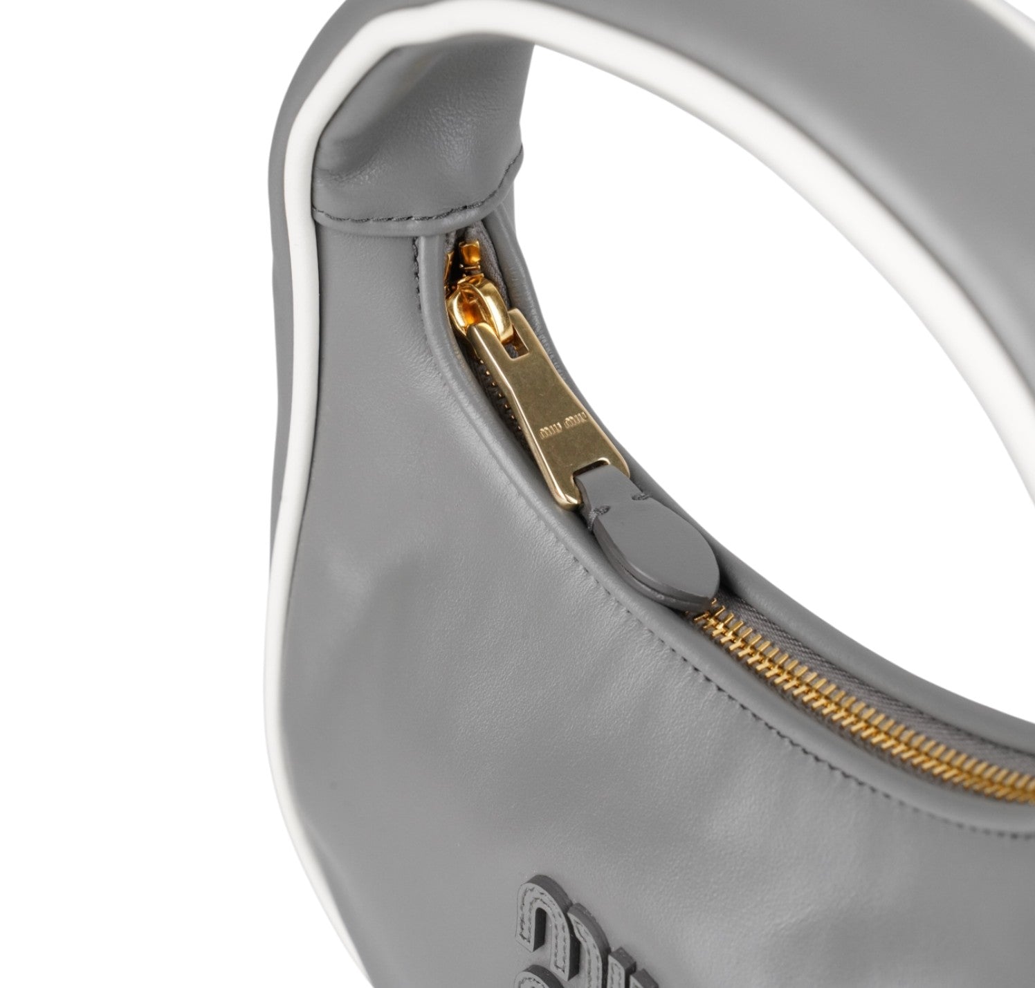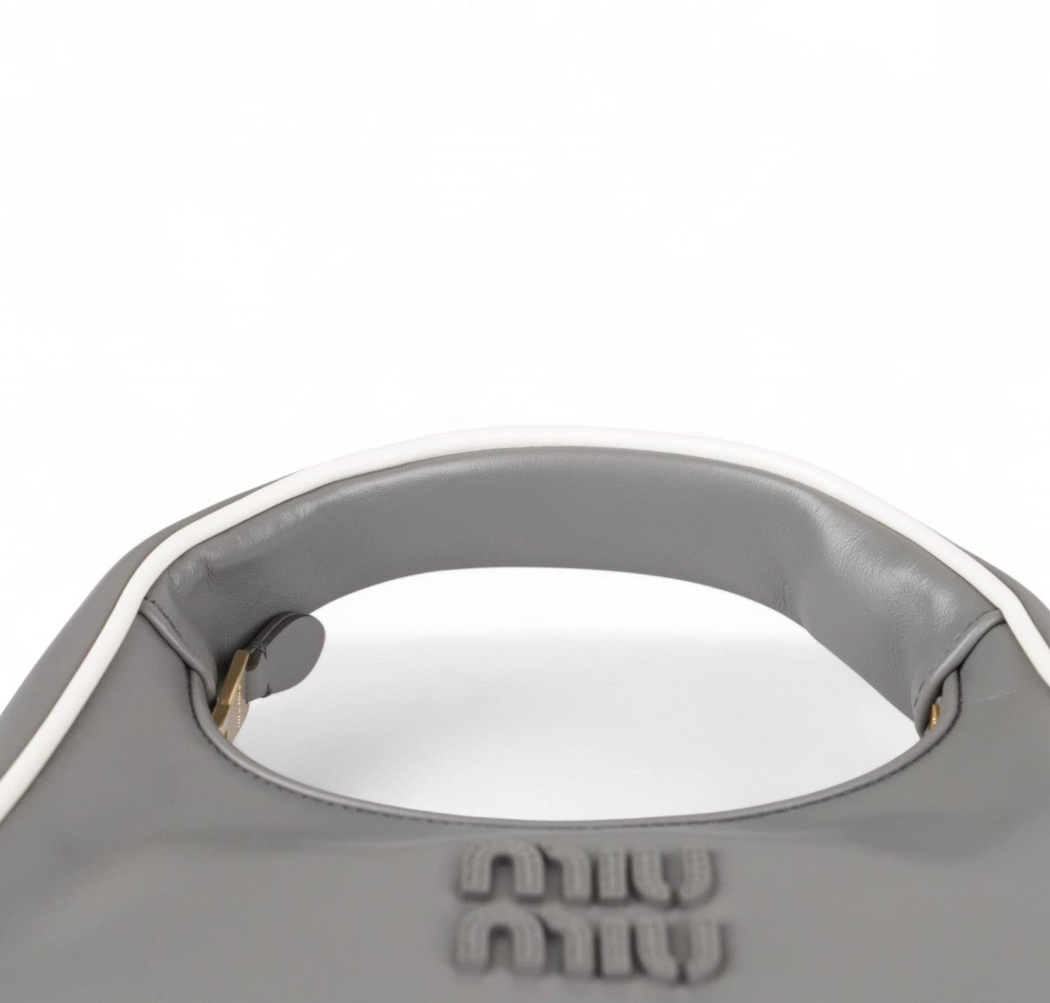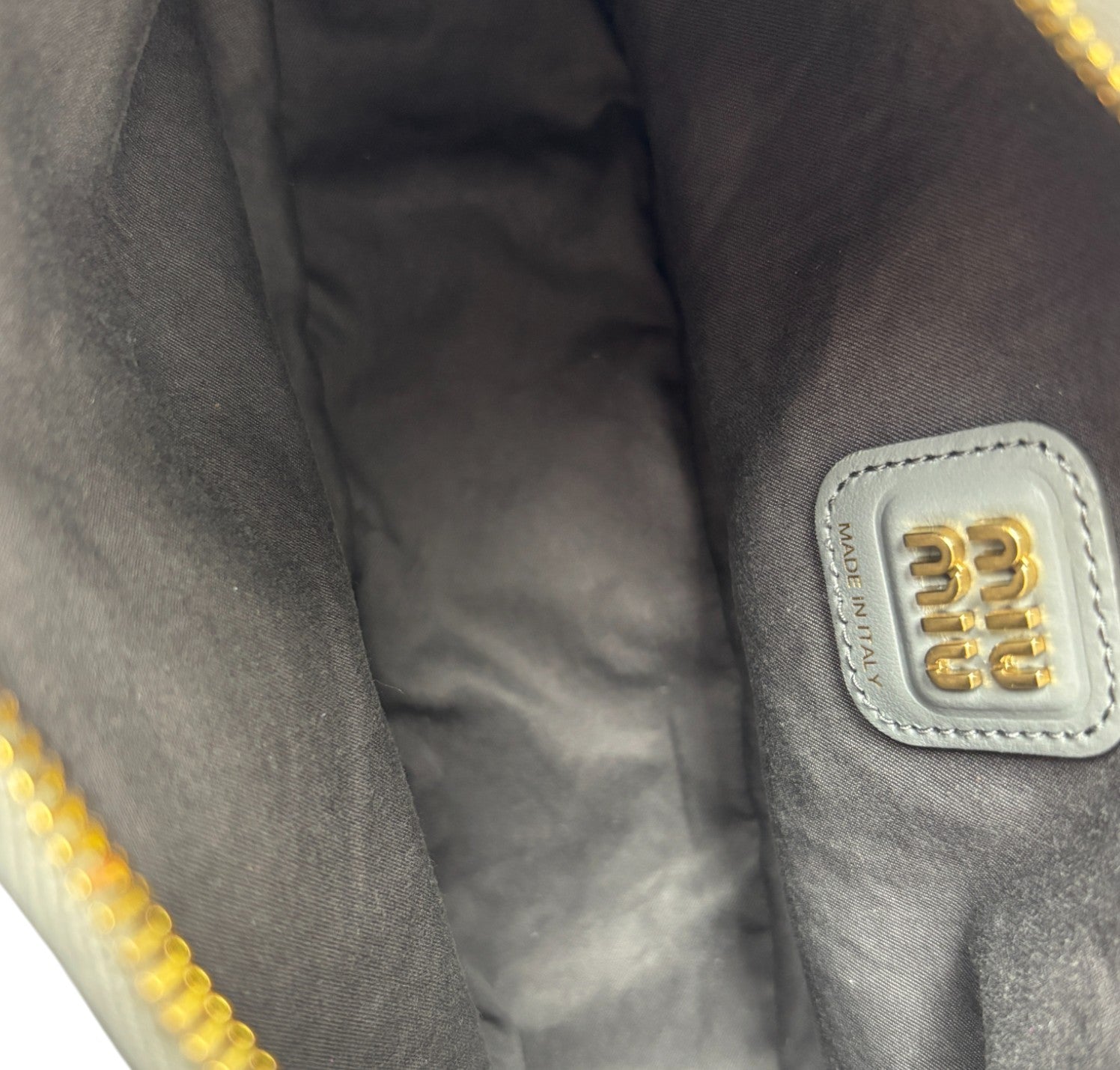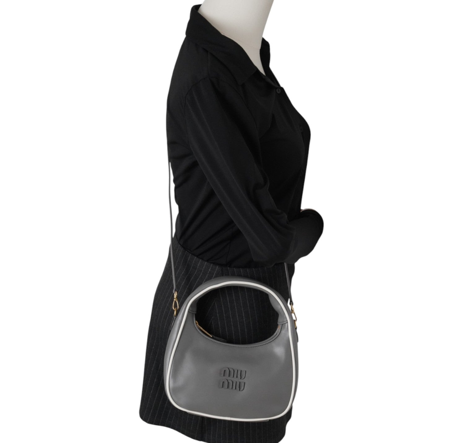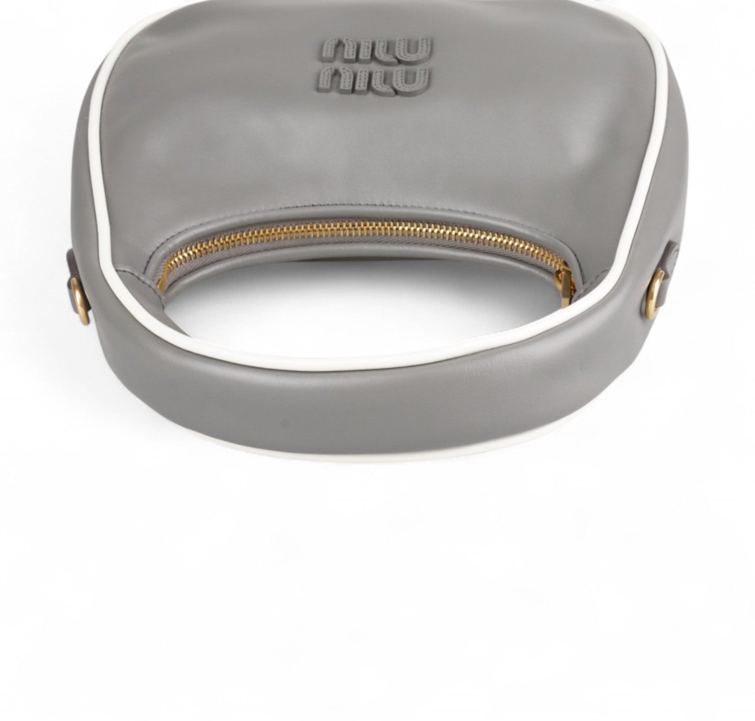 Borsa Miu Miu, modello Wander, misura Small, realizzata in pelle Liscia Grigia con profili bianchi a contrasto. Silhouette morbida e dallo stile sporty-chic. Portabilità a mano o a spalla grazie alla tracolla regolabile e rimovibile. Logo Miu Miu frontale in Pelle tono su tono. Interno foderato in raso cotone Chiusura superiore con zip. Condizioni pari al nuovo. Potrebbe presentare minimi segni di stoccaggio.
