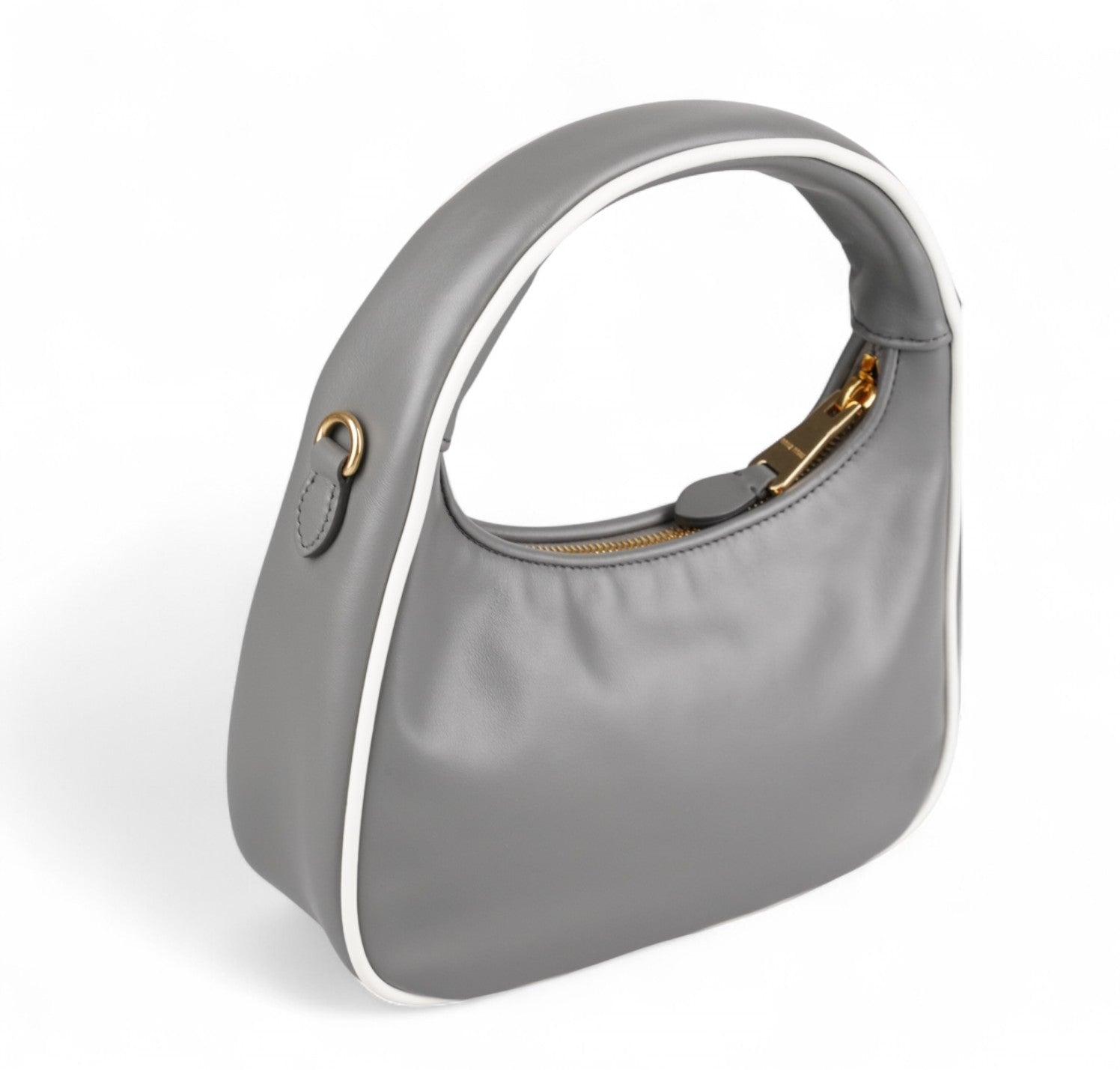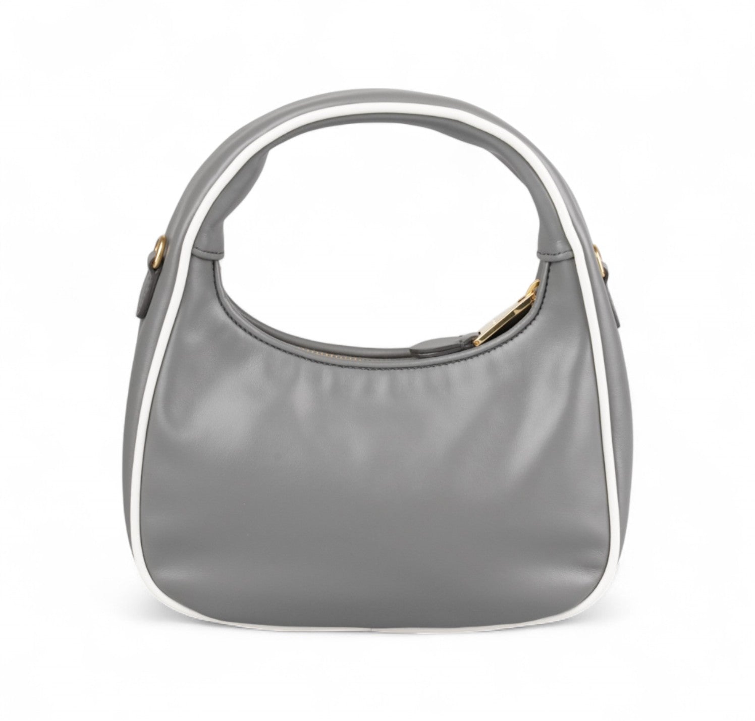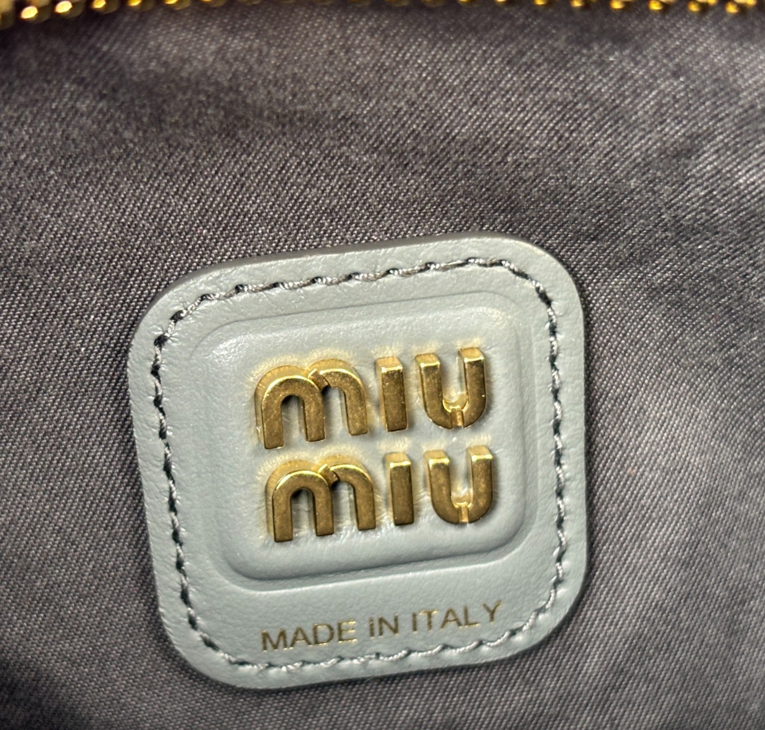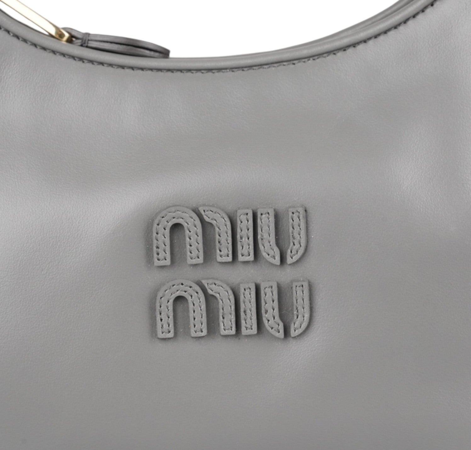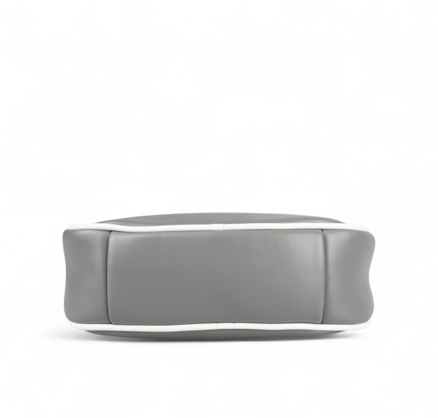 Borsa Miu Miu, modello Wander, misura Small, realizzata in pelle Liscia Grigia con profili bianchi a contrasto. Silhouette morbida e dallo stile sporty-chic. Portabilità a mano o a spalla grazie alla tracolla regolabile e rimovibile. Logo Miu Miu frontale in Pelle tono su tono. Interno foderato in raso cotone Chiusura superiore con zip. Condizioni pari al nuovo. Potrebbe presentare minimi segni di stoccaggio.