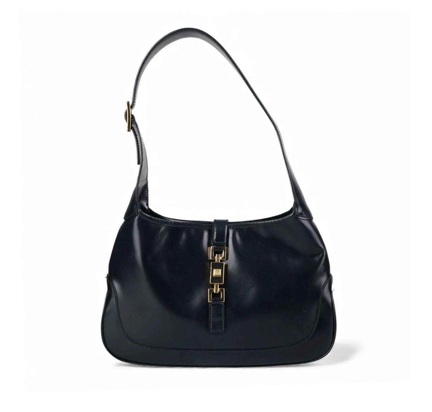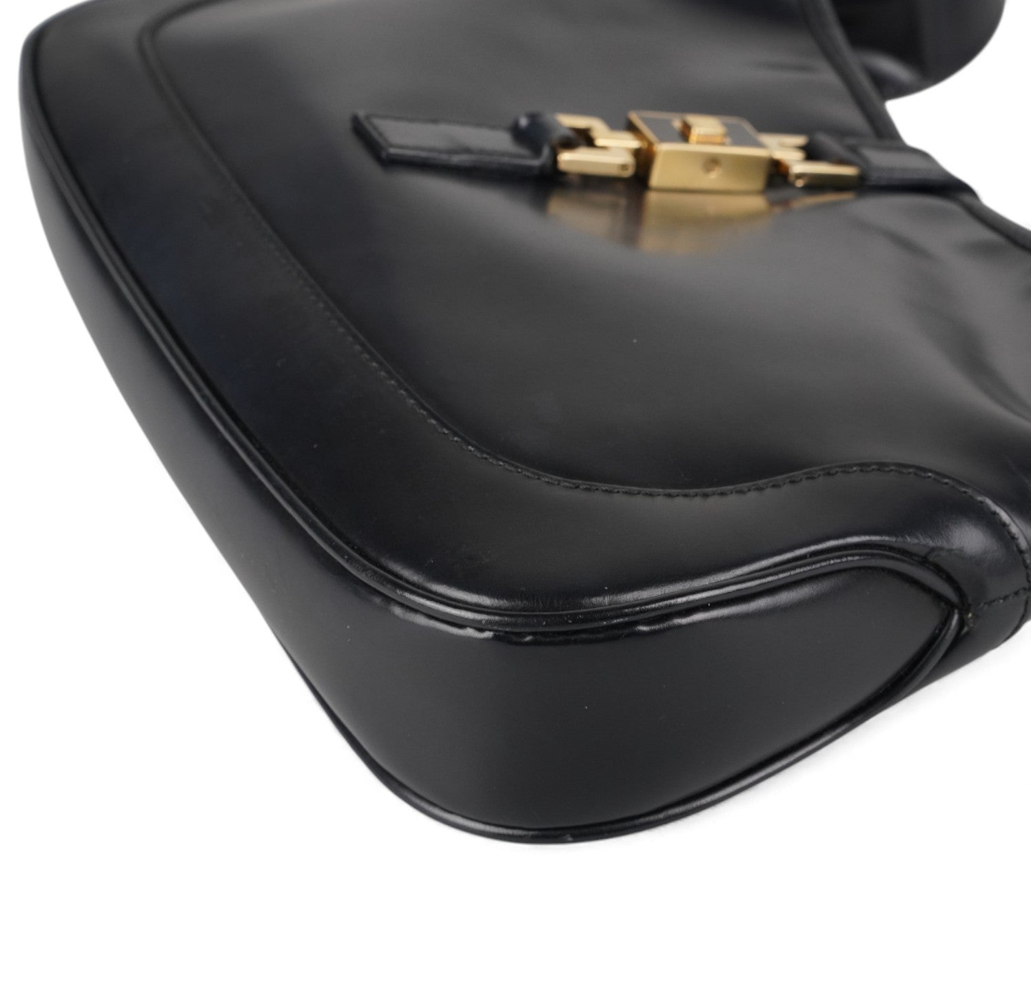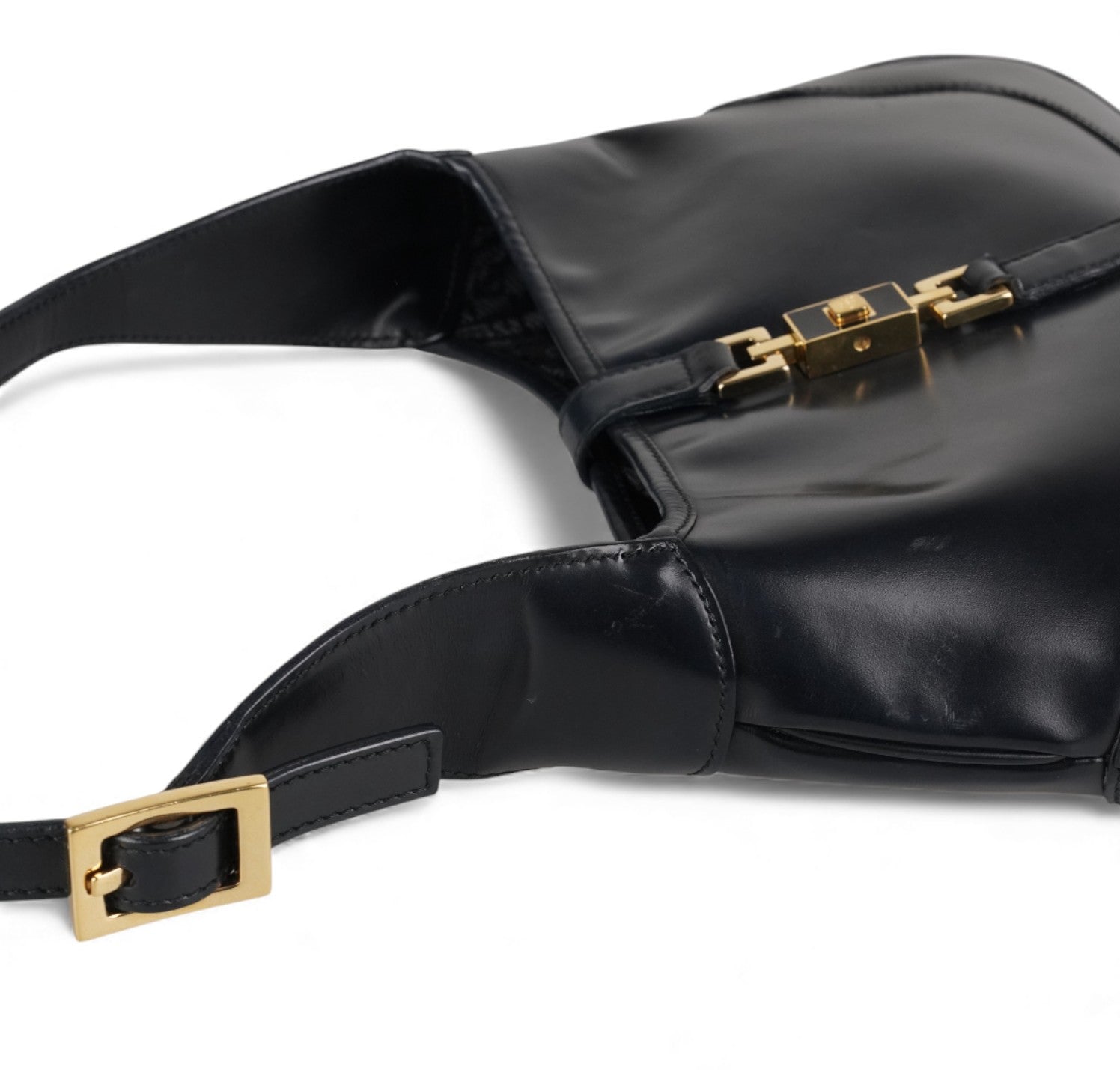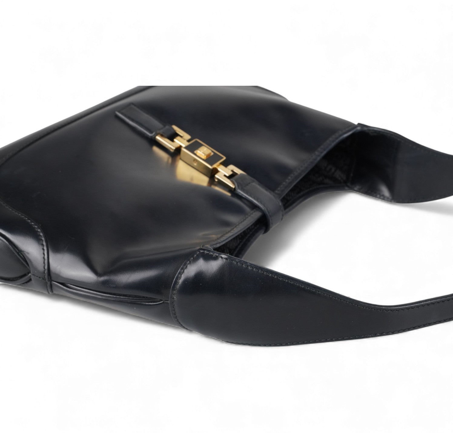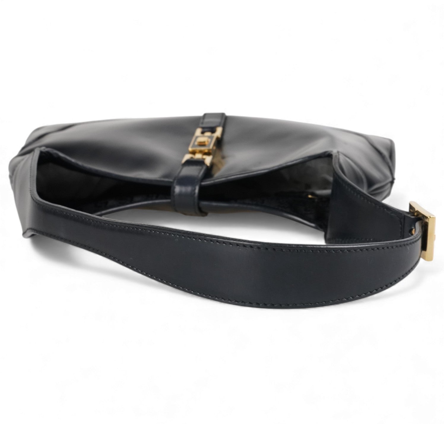 Borsa Gucci, modello Jackie, in pelle Nera. Metalleria color Oro. Iconica chiusura frontale ad incastro con fibbia in pelle. Interno foderato in tessuto logato. Manico superiore regolabile, ideale per l'utilizzo a spalla. Presenta dei minimi segni d'uso come lievi graffi su pelle e micro graffi su metalleria. Minimi segni del tempo.
