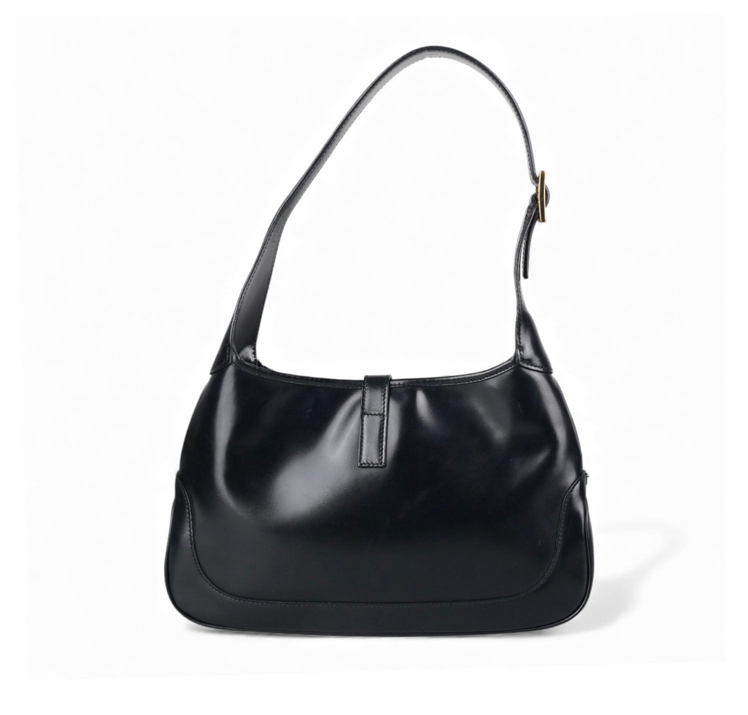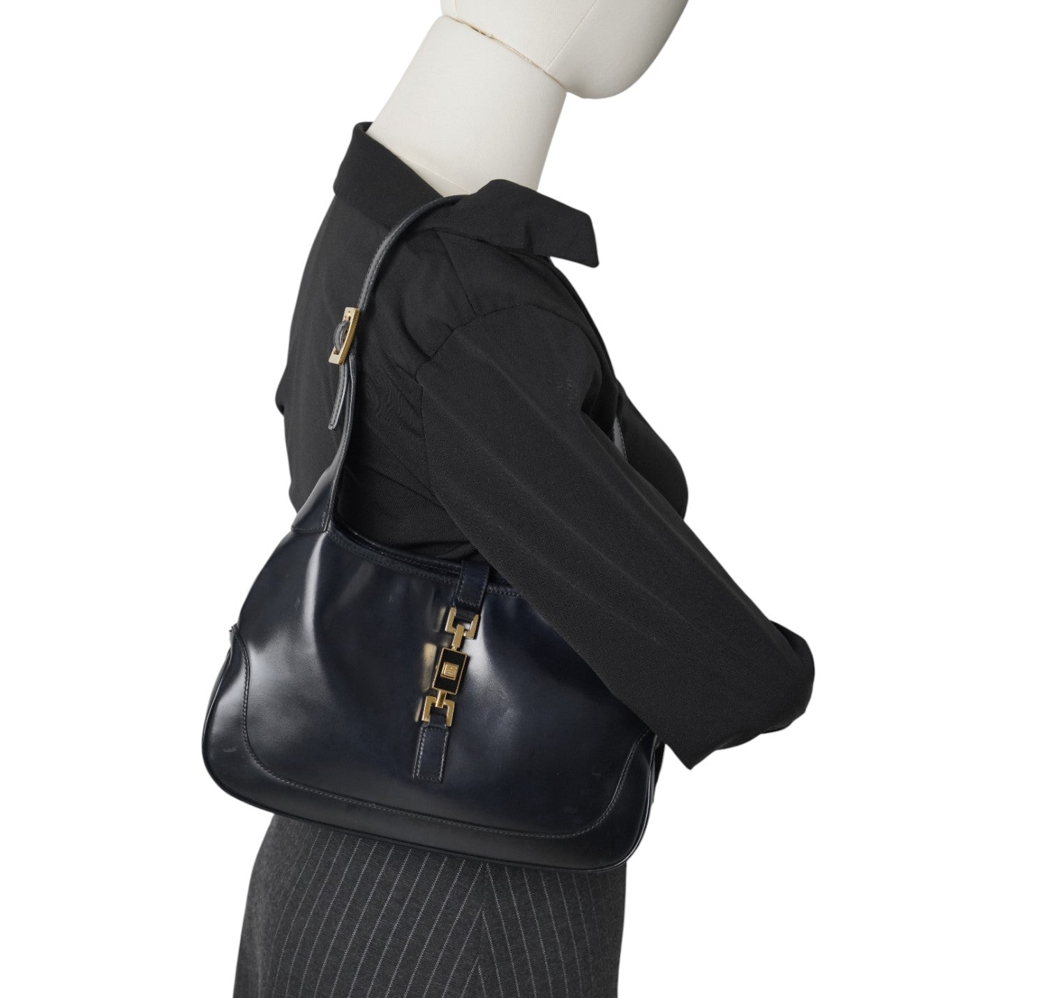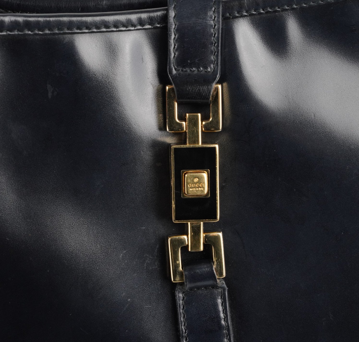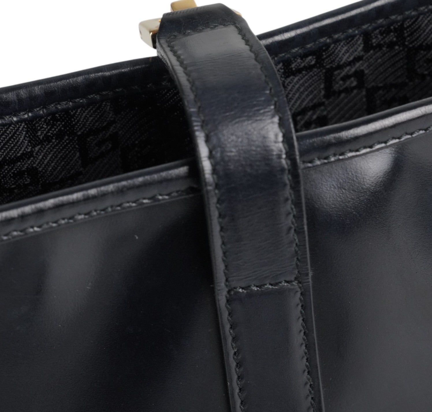 Borsa Gucci, modello Jackie, in pelle Nera. Metalleria color Oro. Iconica chiusura frontale ad incastro con fibbia in pelle. Interno foderato in tessuto logato. Manico superiore regolabile, ideale per l'utilizzo a spalla. Presenta dei minimi segni d'uso come lievi graffi su pelle e micro graffi su metalleria. Minimi segni del tempo.