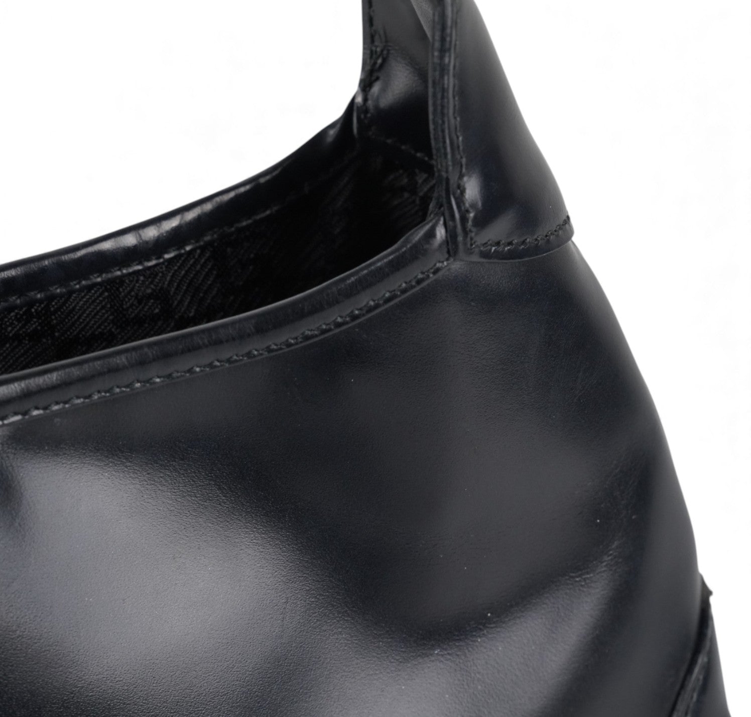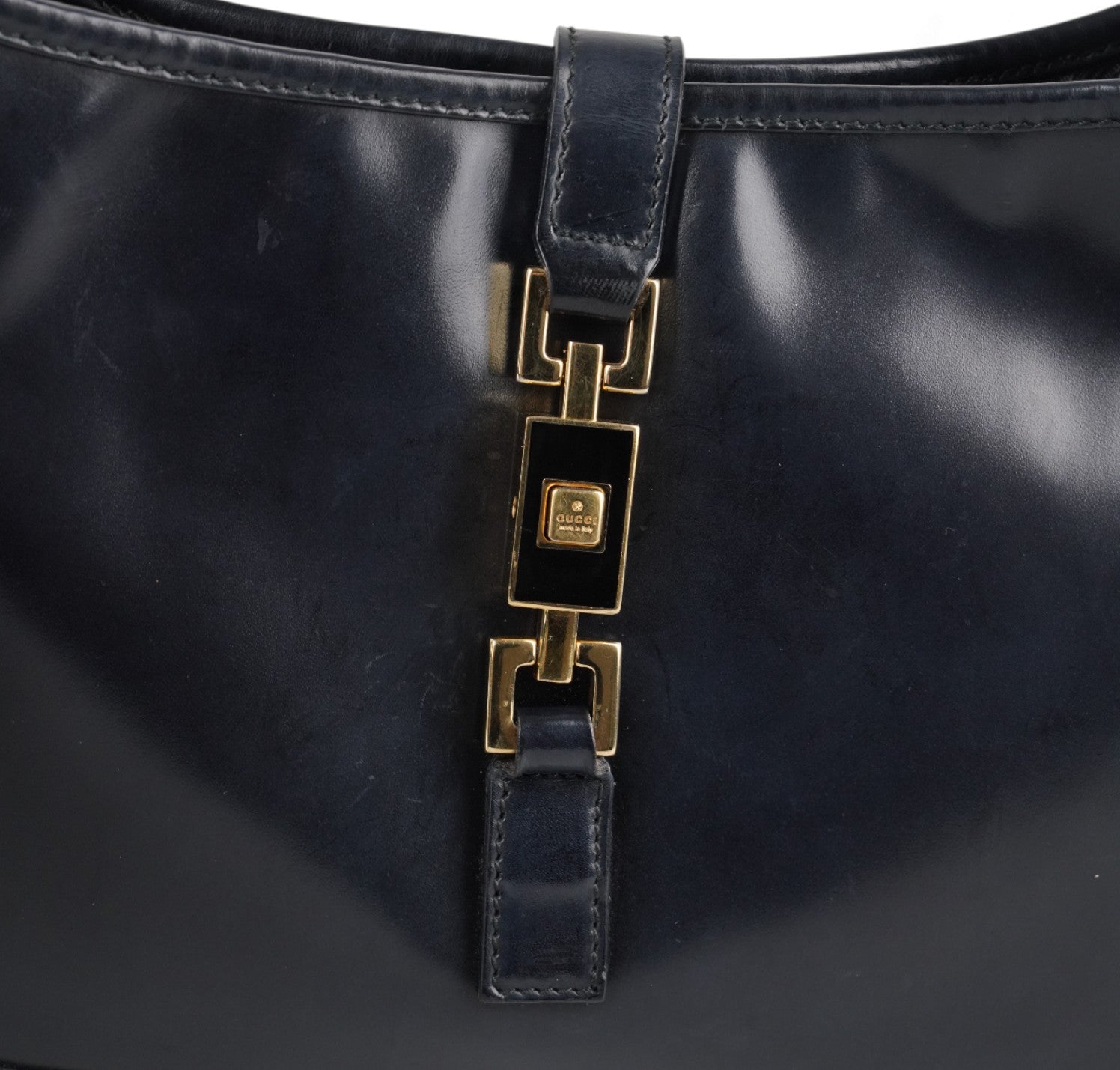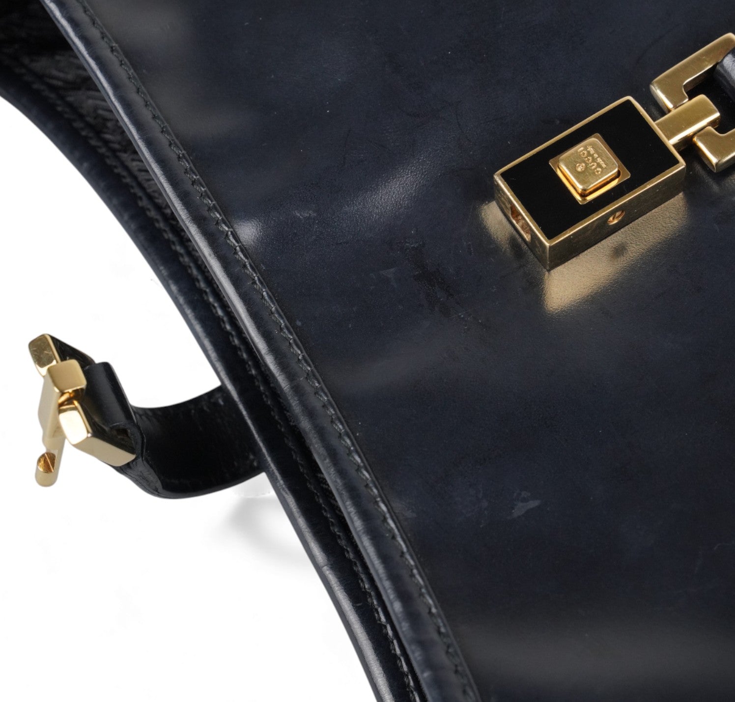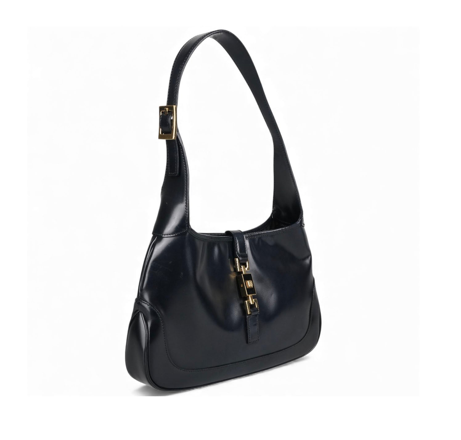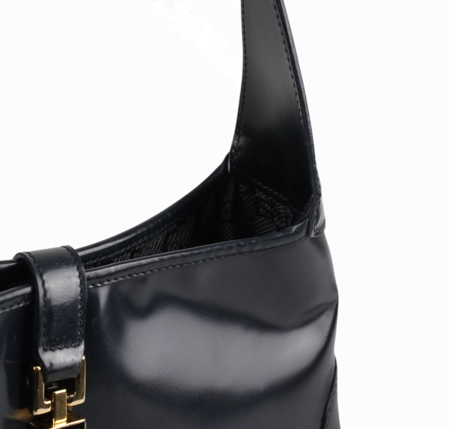 Borsa Gucci, modello Jackie, in pelle Nera. Metalleria color Oro. Iconica chiusura frontale ad incastro con fibbia in pelle. Interno foderato in tessuto logato. Manico superiore regolabile, ideale per l'utilizzo a spalla. Presenta dei minimi segni d'uso come lievi graffi su pelle e micro graffi su metalleria. Minimi segni del tempo.