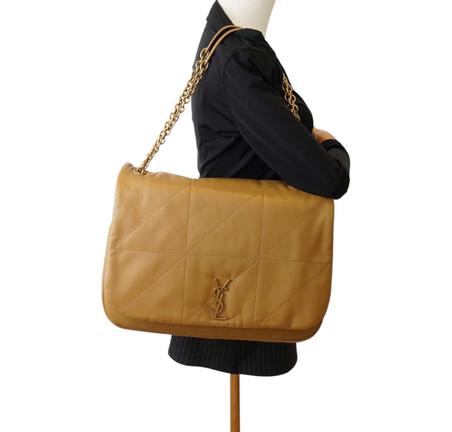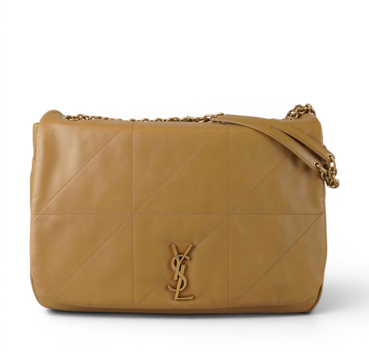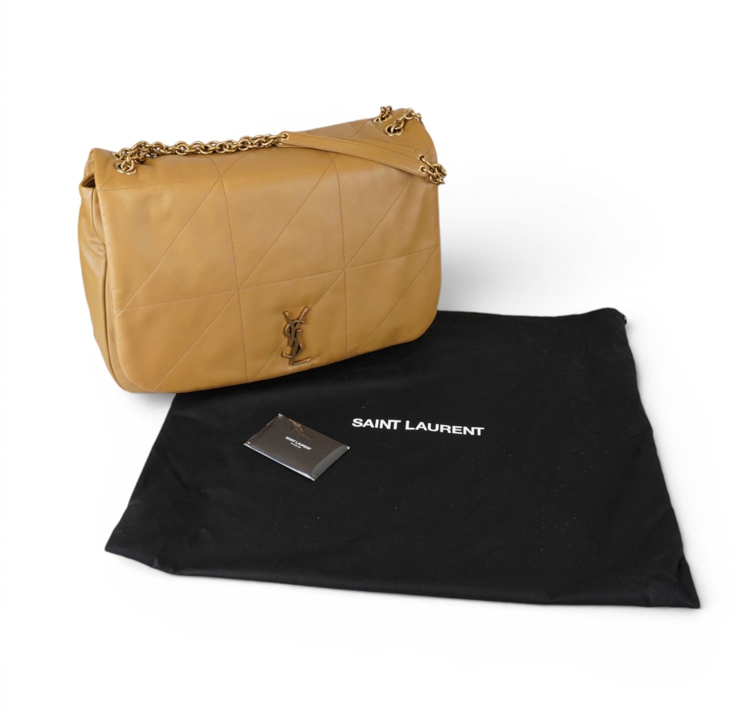 Borsa Saint Laurent, modello Jamie 4.3, misura Large, realizzata in morbida pelle tonalità Praline. Impreziosita dall’iconico logo YSL frontale in metalleria color Oro effetto anticato. Chiusura con patta non magnetica e tracolla a catena in metallo dorato con inserto in pelle, indossabile sia a spalla che crossbody. Interno foderato in tessuto, spazioso e funzionale, ideale anche a viaggi. Pari al nuovo, potrebbero essere presenti micro segni di stoccaggio. Retail 3.700€.