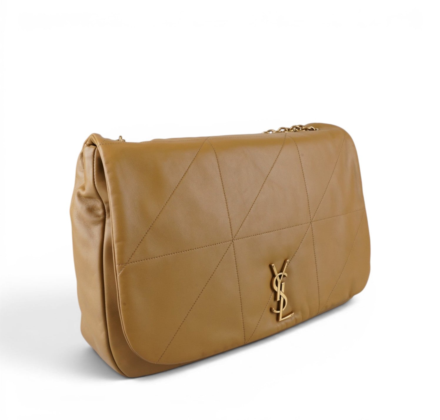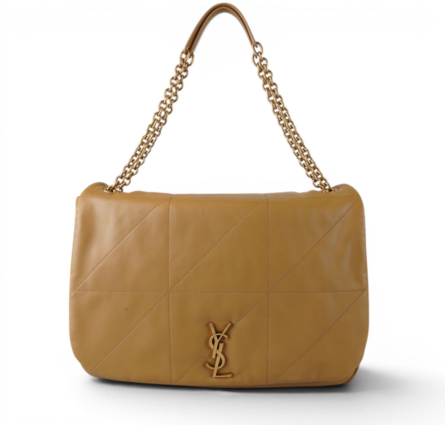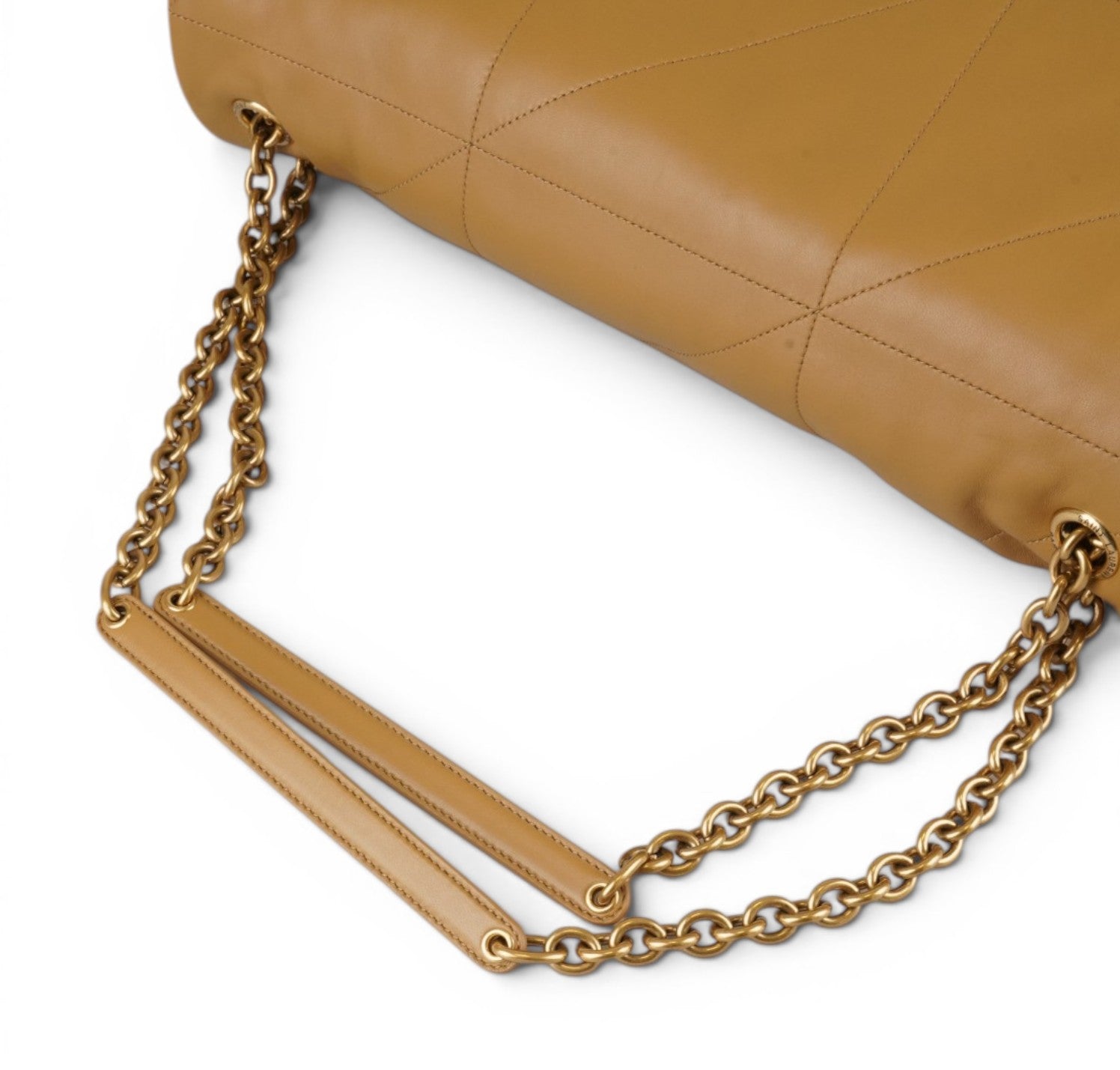 Borsa Saint Laurent, modello Jamie 4.3, misura Large, realizzata in morbida pelle tonalità Praline. Impreziosita dall’iconico logo YSL frontale in metalleria color Oro effetto anticato. Chiusura con patta non magnetica e tracolla a catena in metallo dorato con inserto in pelle, indossabile sia a spalla che crossbody. Interno foderato in tessuto, spazioso e funzionale, ideale anche a viaggi. Pari al nuovo, potrebbero essere presenti micro segni di stoccaggio. Retail 3.700€.