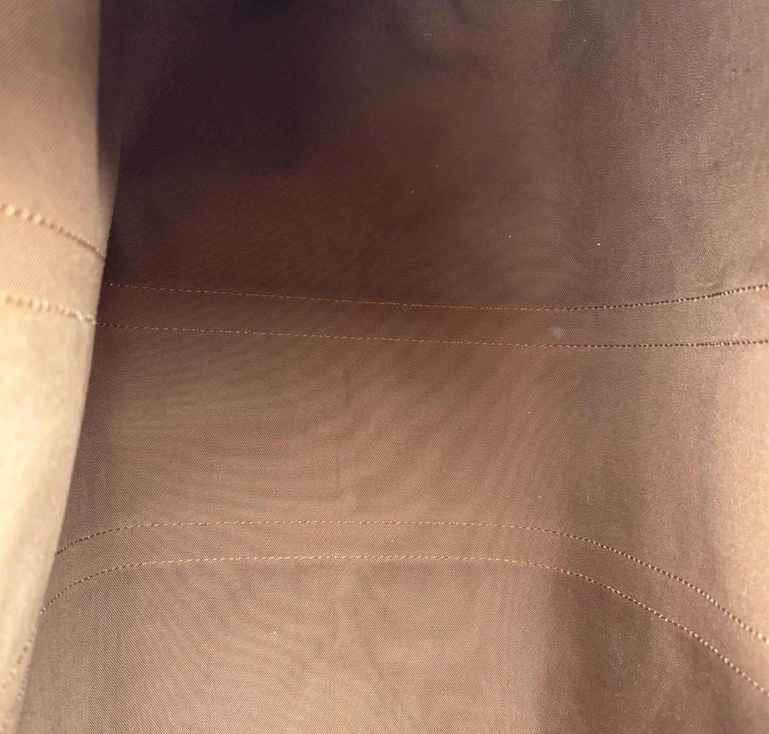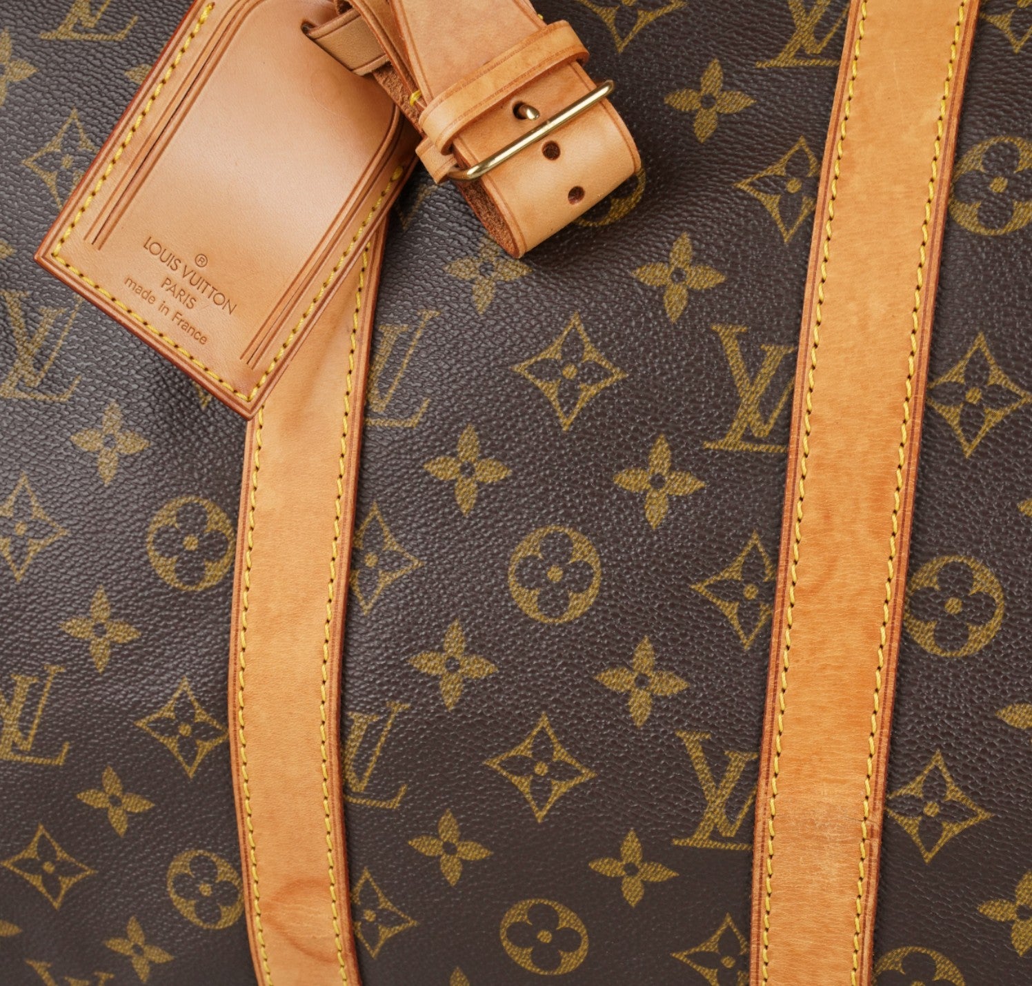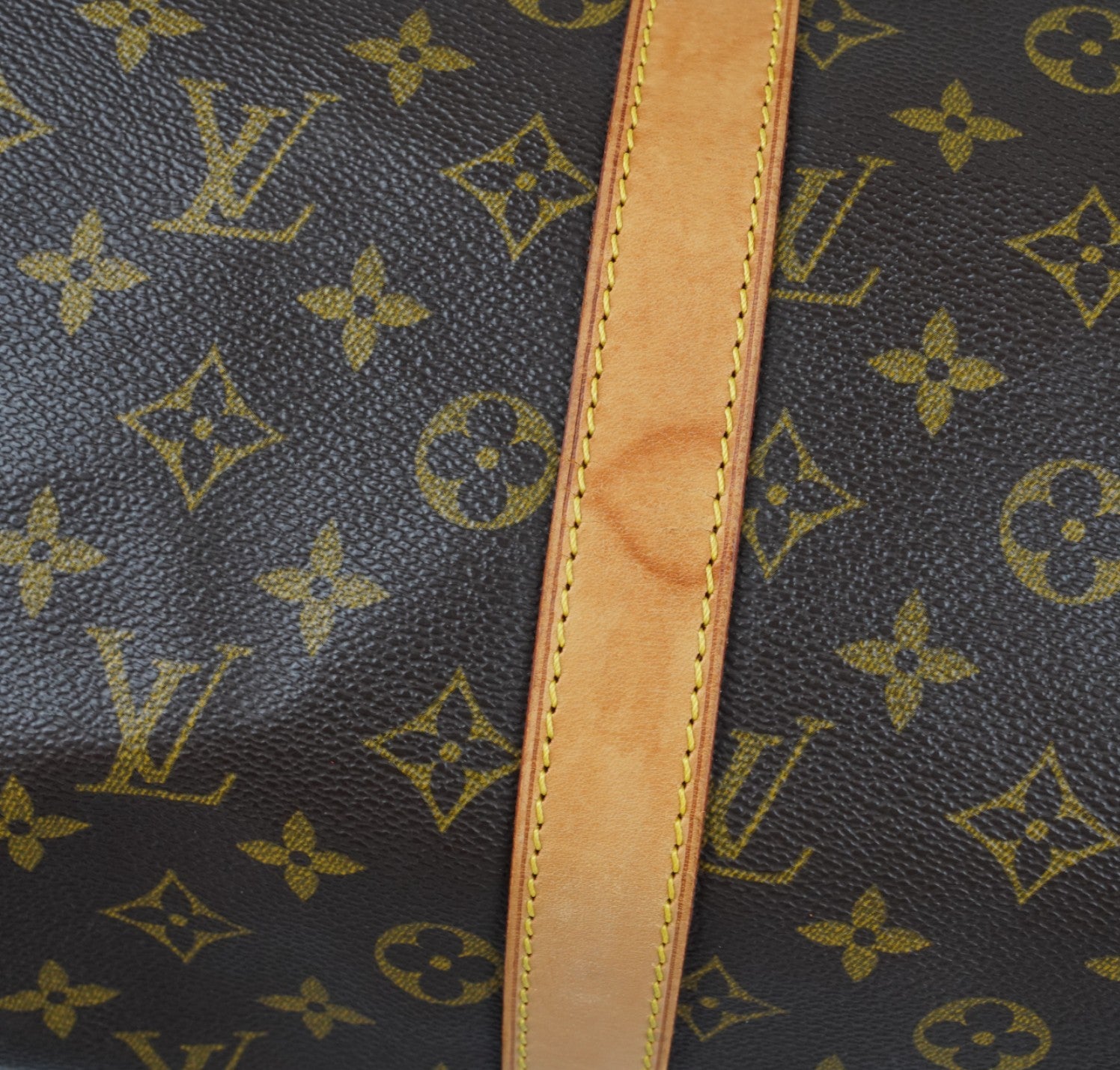 Borsa da Viaggio Louis Vuitton, modello Keepall Bandoulière, misura 45, realizzata in Tela Monogram. Finiture in Vacchetta Naturale. Parti metalliche in Ottone Dorato. Tracolla amovibile e regolabile per il trasporto a spalla. Manici superiori per il trasporto a mano. Chiusura superiore con cerniera a doppio cursore. Interno foderato in Tessuto Marrone. Lievi segni del tempo generali, Aloni, macchie d'acqua su vacchetta, lievi segni di sfregamento su metalleria. Munita di lucchetto con chiave, Name Tag e ferma manici.