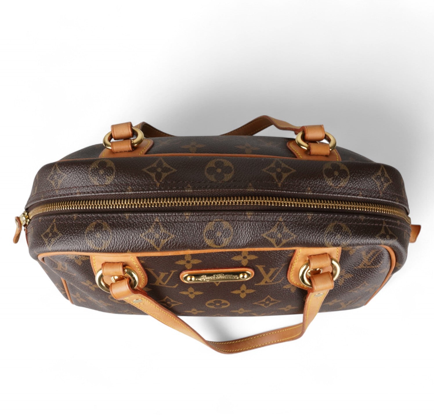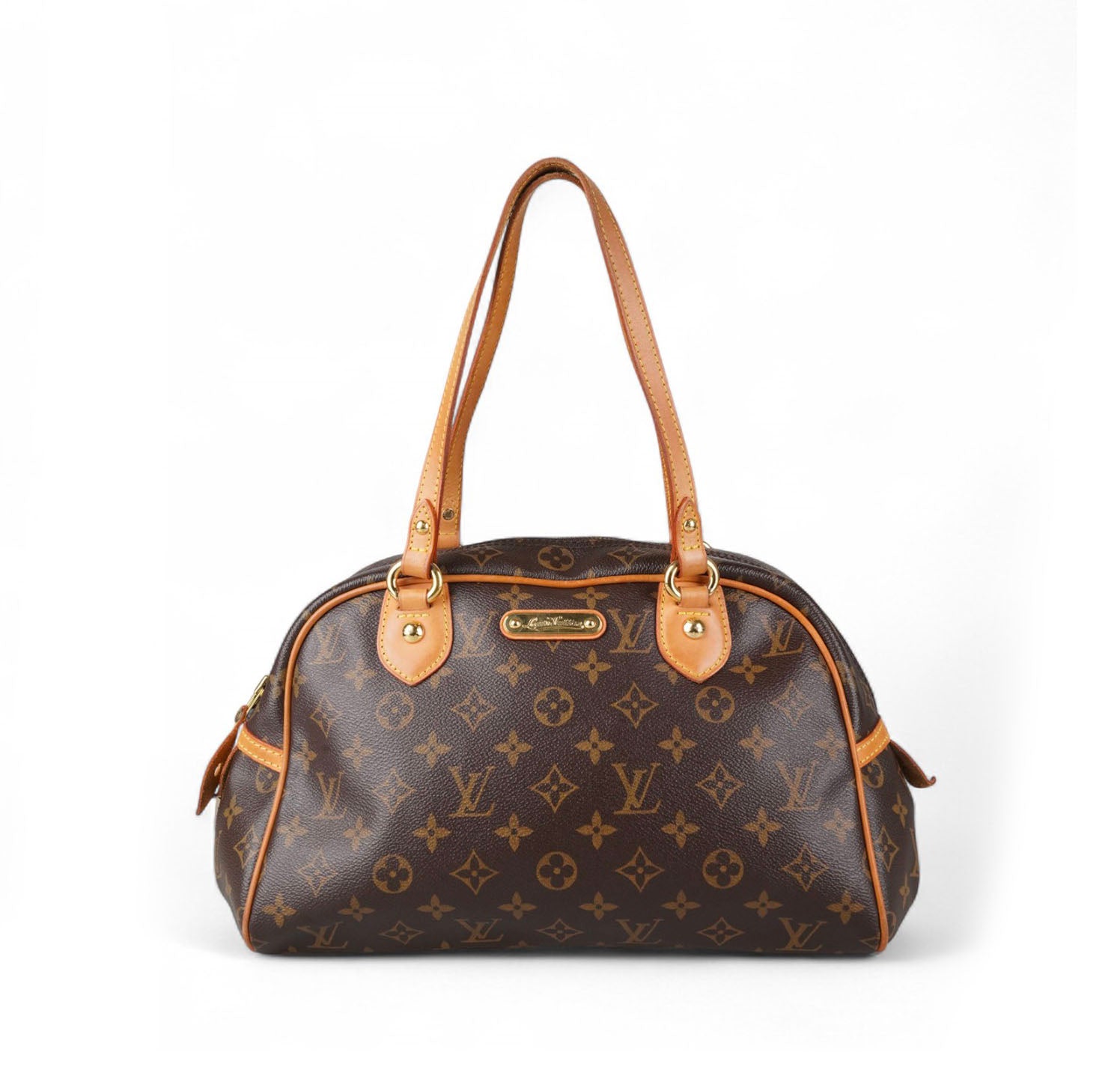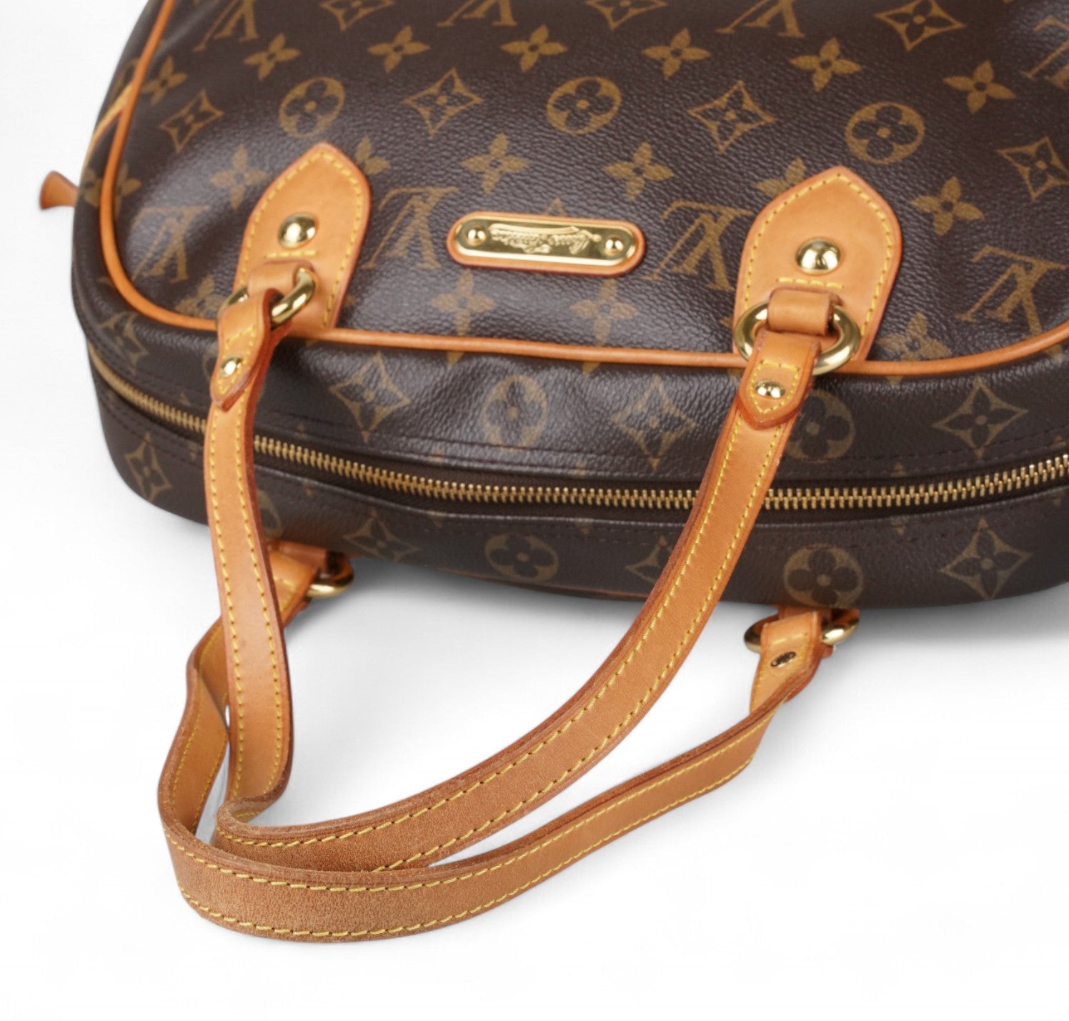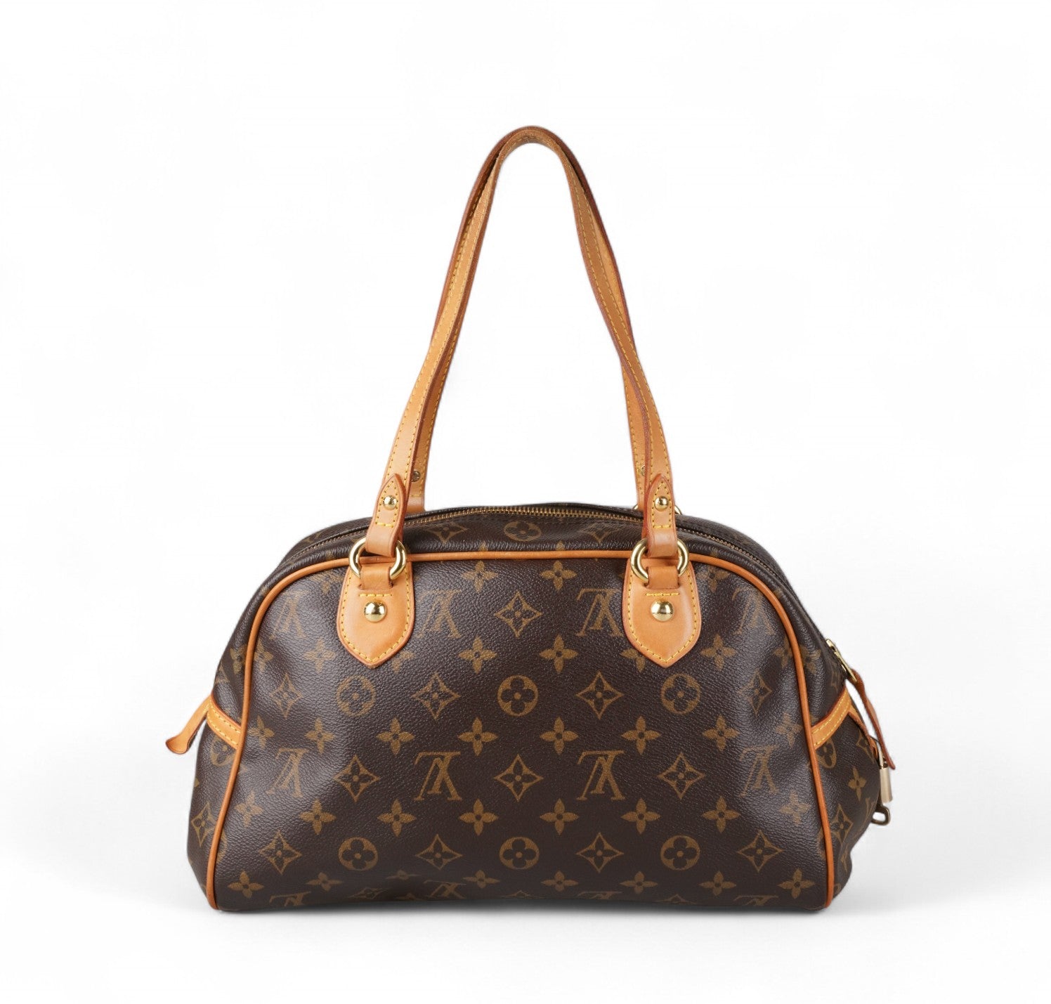 Borsa Louis Vuitton, modello Montorgueil PM, realizzata in Tela Monogram. Finiture in Vacchetta Naturale mielata. Parti metalliche dorate. Chiusura superiore con cerniera. Internamente foderata in tessuto marrone, tasca a bustina applicata. Munita di doppi manici superiori per il trasporto a spalla o mano. Presenti lievi segni d'uso, lievi aloni su vacchetta. Lievi segni del tempo generali.