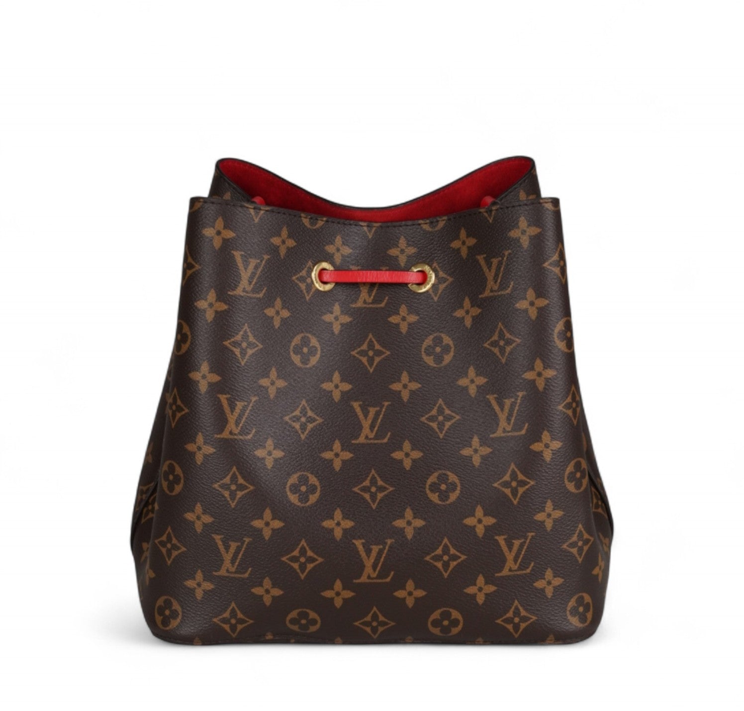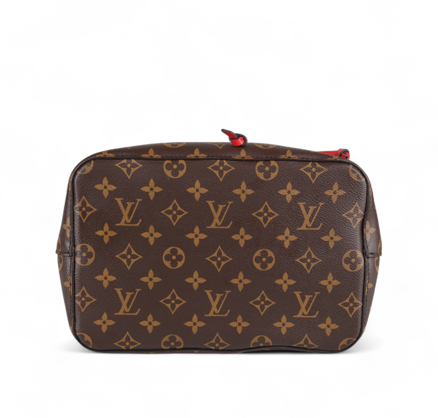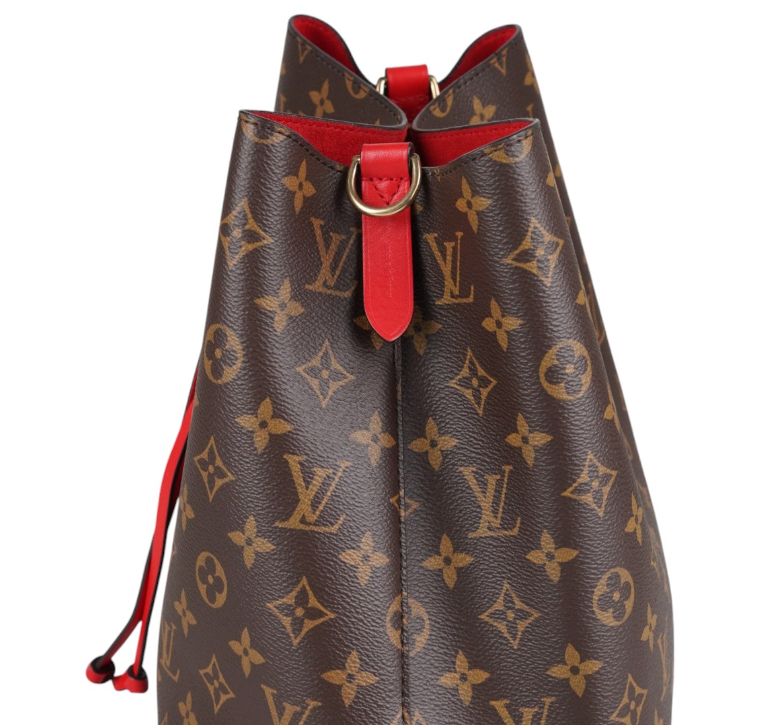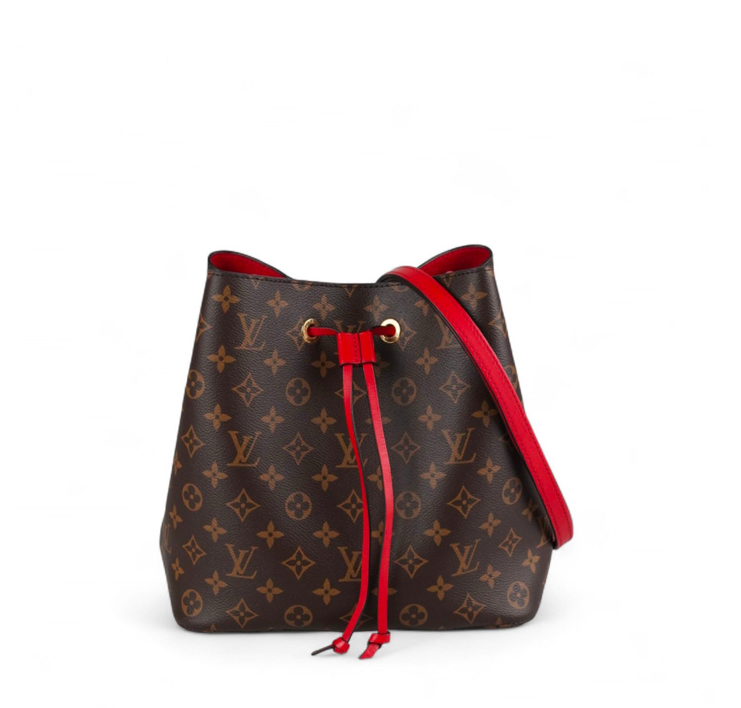 Secchiello Louis Vuitton, modello NéoNoé, realizzato in Tela Monogram. Finiture in Pelle Rossa. Metalleria in Ottone Dorato. Fodera interna in microfibra Rossa, suddivisa in due scomparti da una tasca centrale piatta con zip. Chiusura superiore con coulisse. Munito di tracolla amovibile e regolabile per personalizzarne l'utilizzo. Si presenta in ottimo stato generale, con minimi segni di utilizzo.
