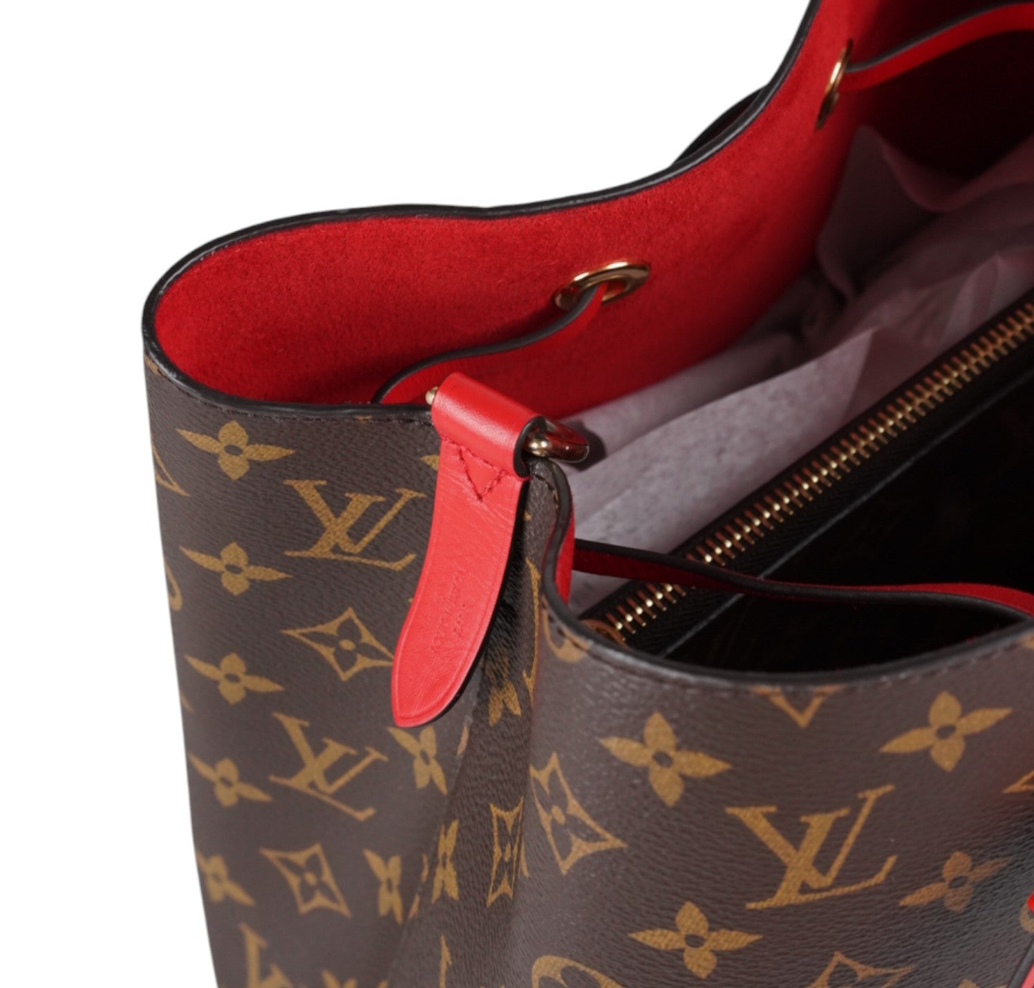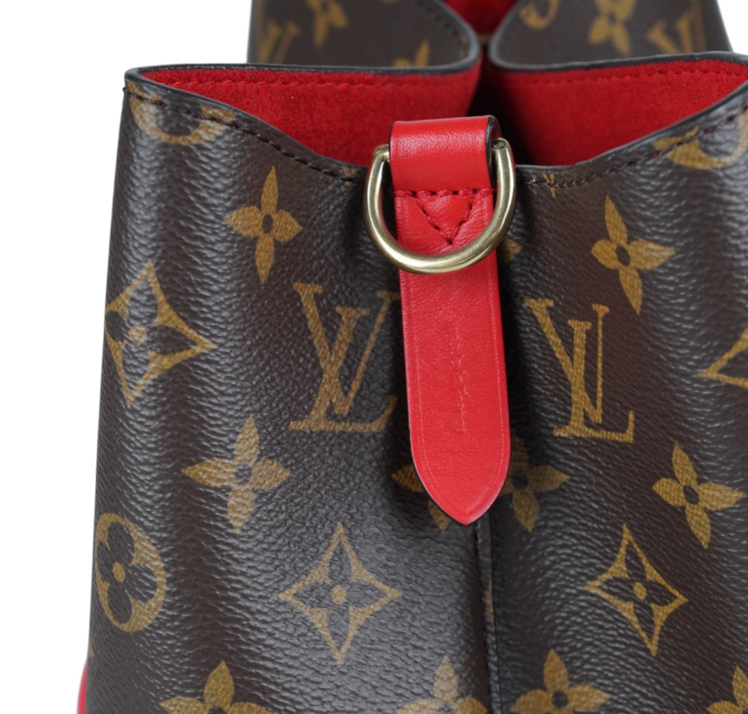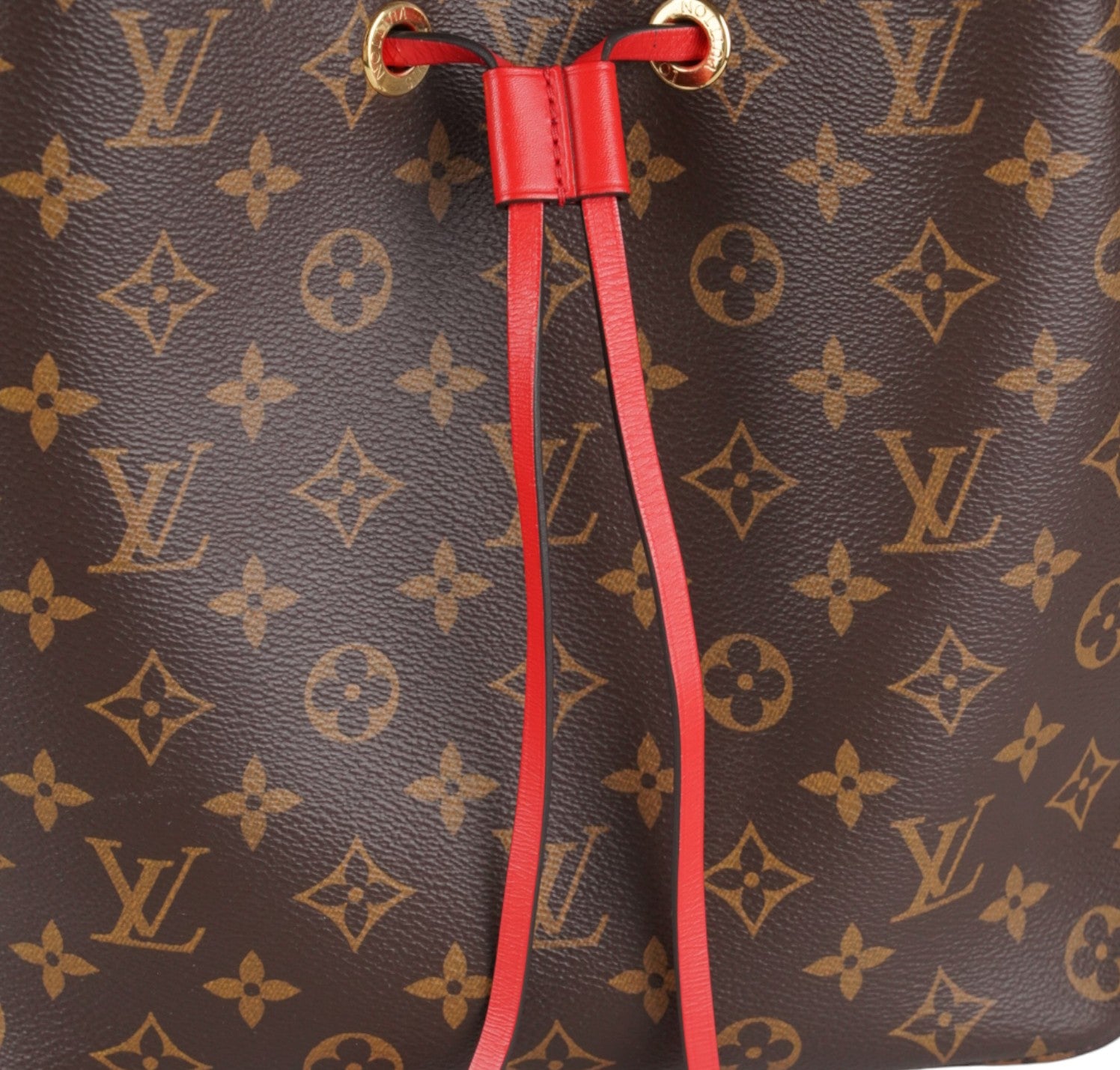 Secchiello Louis Vuitton, modello NéoNoé, realizzato in Tela Monogram. Finiture in Pelle Rossa. Metalleria in Ottone Dorato. Fodera interna in microfibra Rossa, suddivisa in due scomparti da una tasca centrale piatta con zip. Chiusura superiore con coulisse. Munito di tracolla amovibile e regolabile per personalizzarne l'utilizzo. Si presenta in ottimo stato generale, con minimi segni di utilizzo.