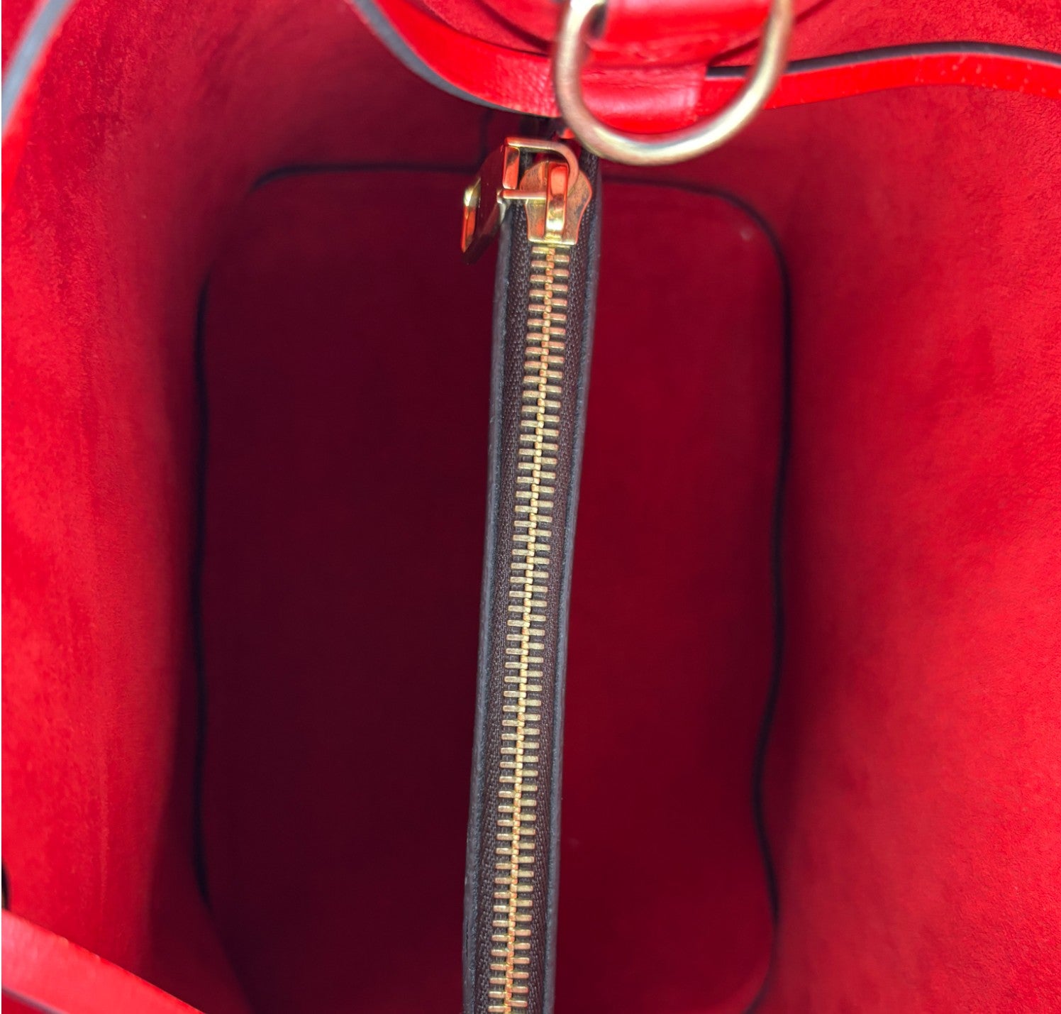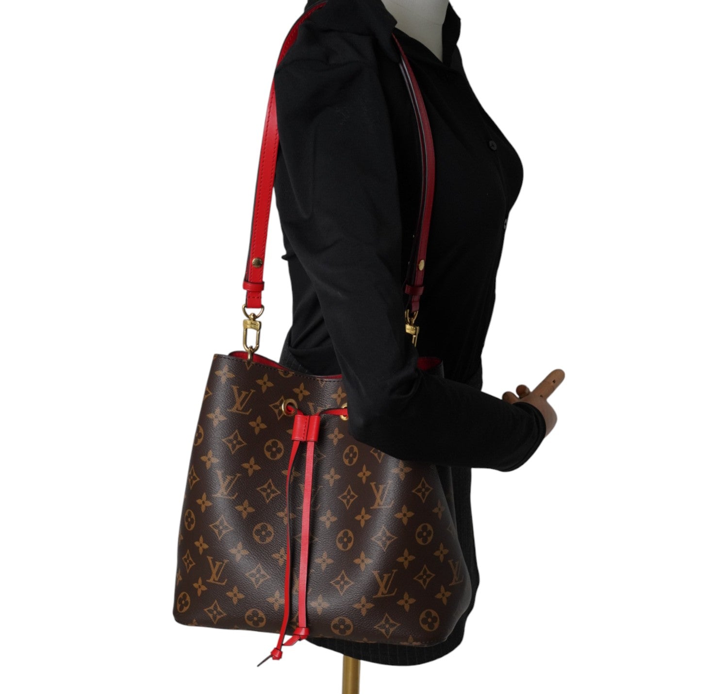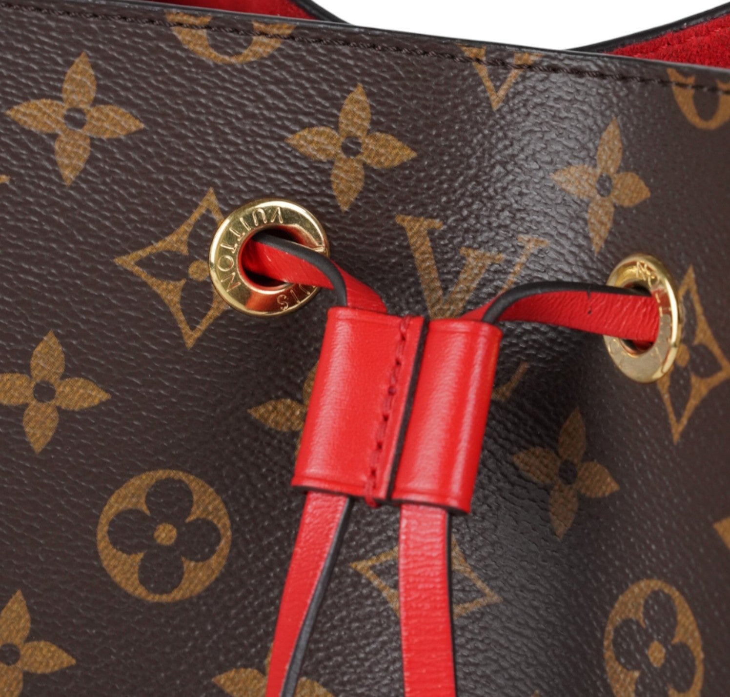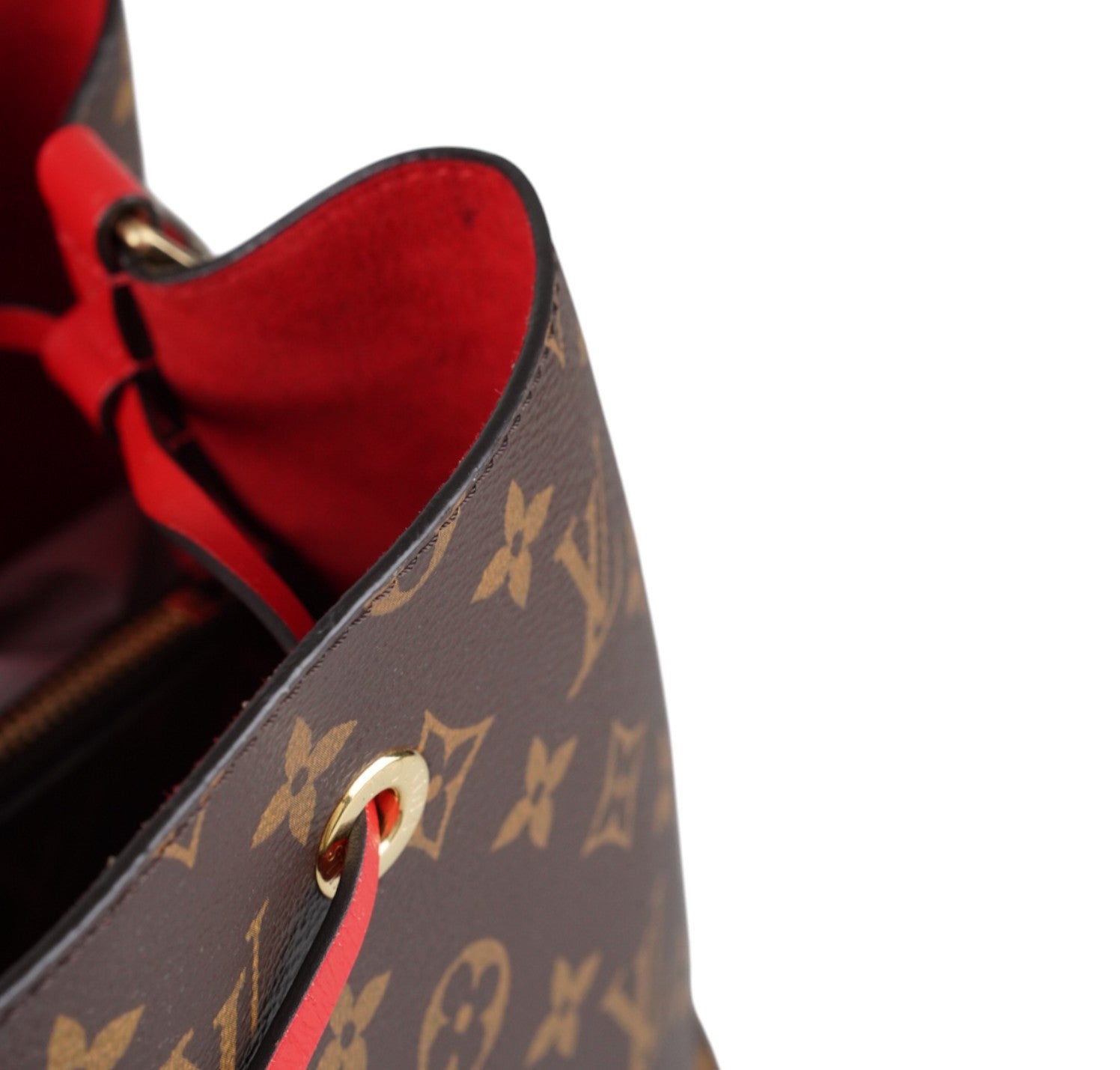 Secchiello Louis Vuitton, modello NéoNoé, realizzato in Tela Monogram. Finiture in Pelle Rossa. Metalleria in Ottone Dorato. Fodera interna in microfibra Rossa, suddivisa in due scomparti da una tasca centrale piatta con zip. Chiusura superiore con coulisse. Munito di tracolla amovibile e regolabile per personalizzarne l'utilizzo. Si presenta in ottimo stato generale, con minimi segni di utilizzo.