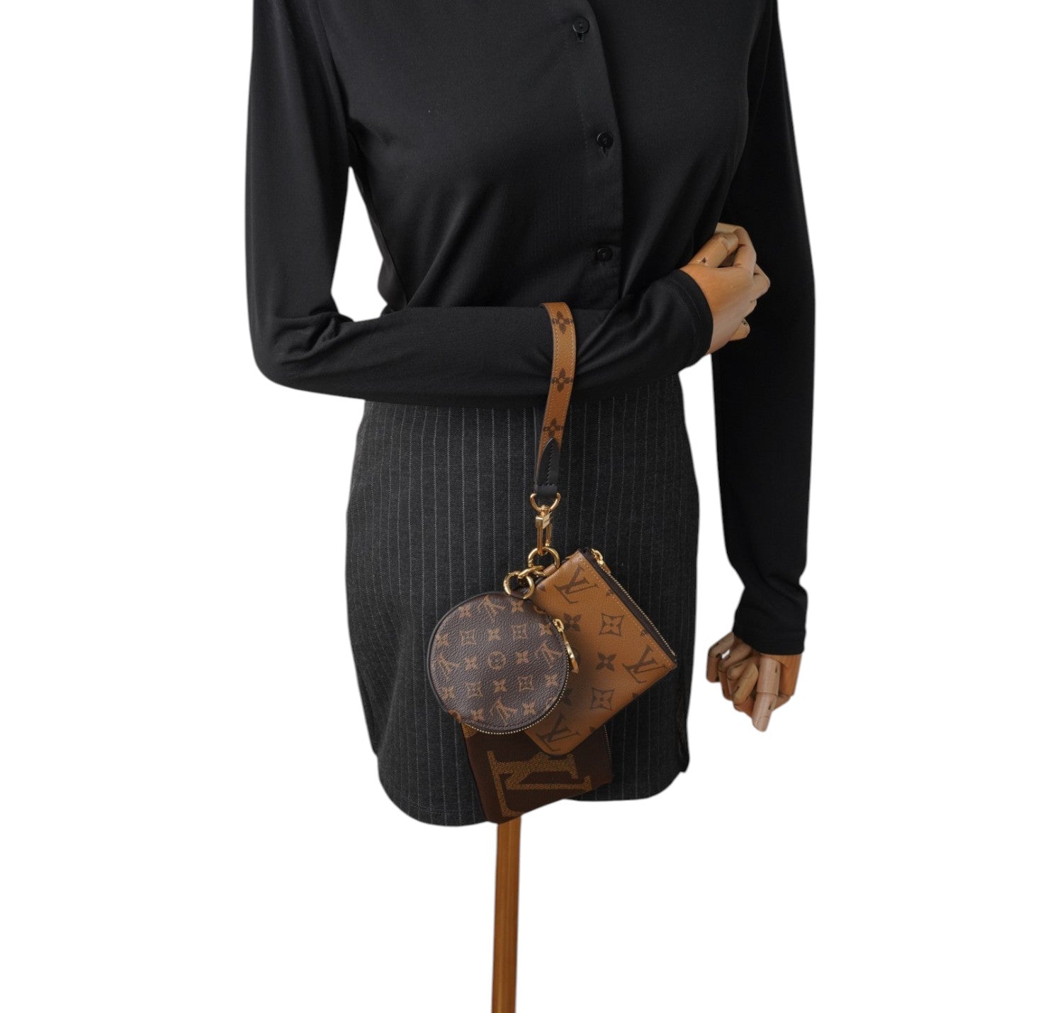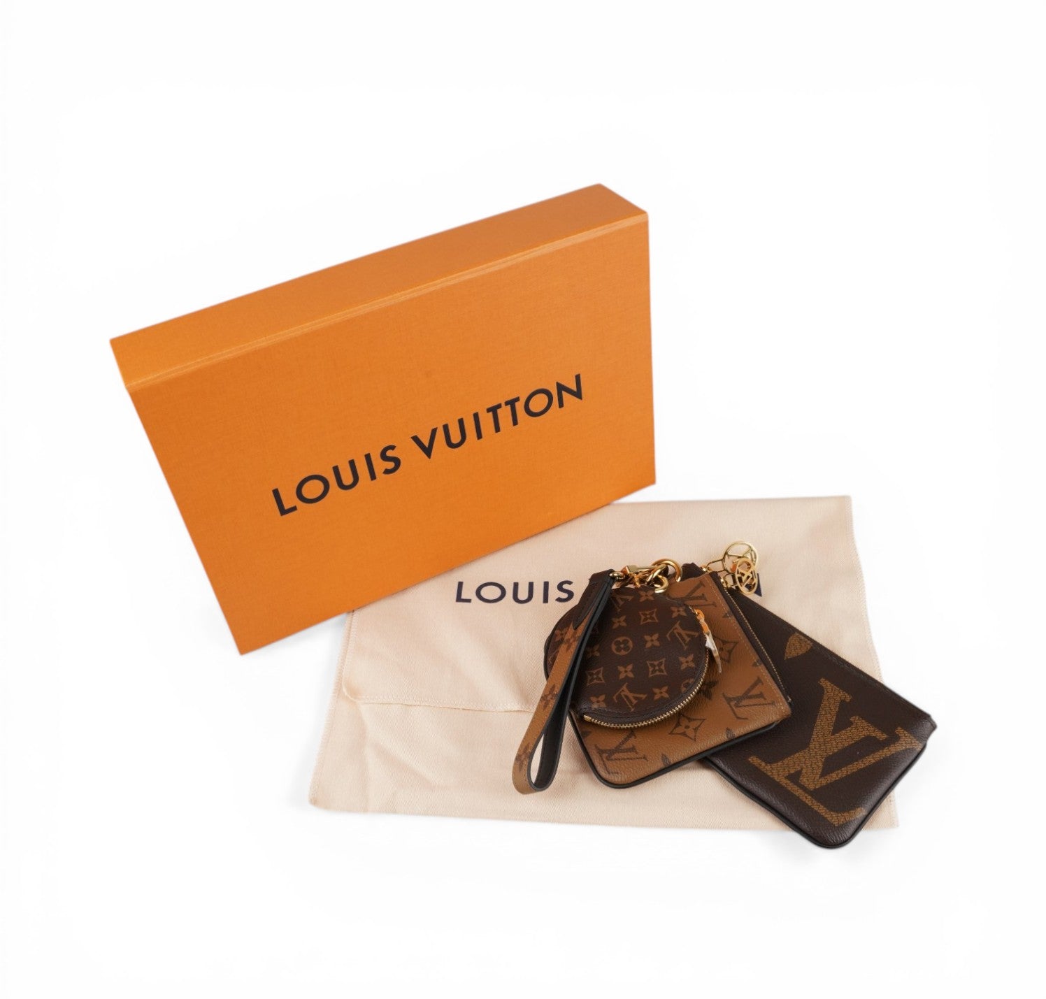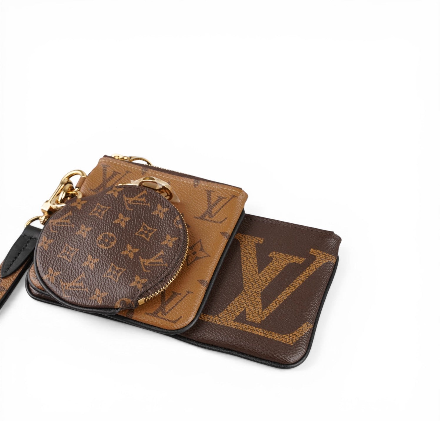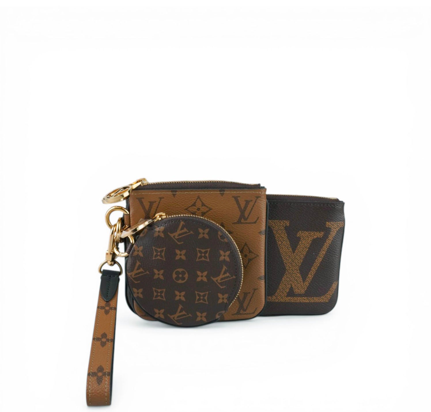 Pochette Louis Vuitton, modello Trio, realizzata in iconica tela Monogram e Monogram Reverse con dettagli in pelle e finiture dorate. Set composto da tre elementi coordinati: una pochette grande rettangolare, una pochette più piccola quadrata e una mini pouch rotonda, tutte rimovibili e utilizzabili separatamente. Completa di cinturino da polso per una portabilità pratica e versatile. Chiusure con zip e tiralampo logati. Perfetta sia come accessorio daily che come organizer da borsa. Condizioni ottime, con minimi segni d’uso; la pouch rotonda è inutilizzata. Misure: pochette grande L19 x A11 pochette piccola L11.5 x A12 round L10 cm, profondità 1 cm.