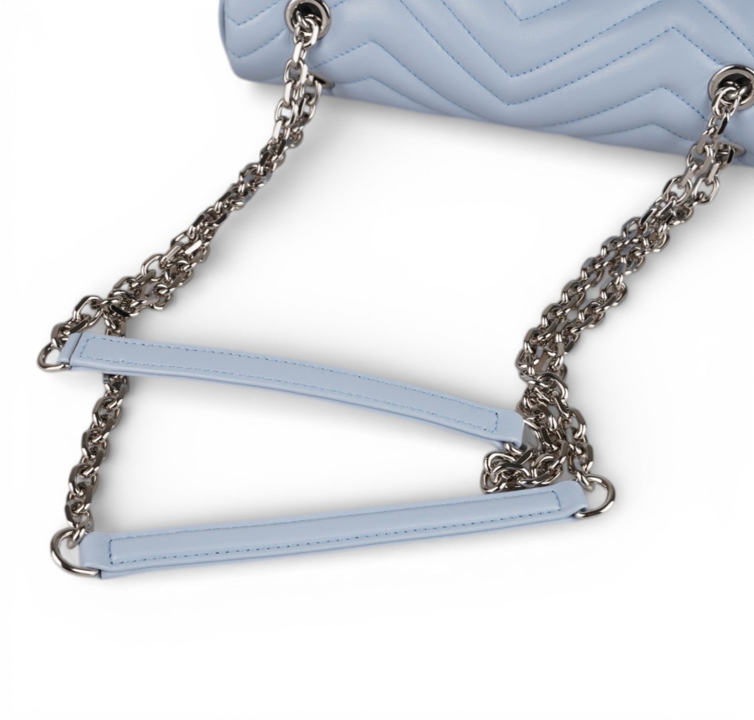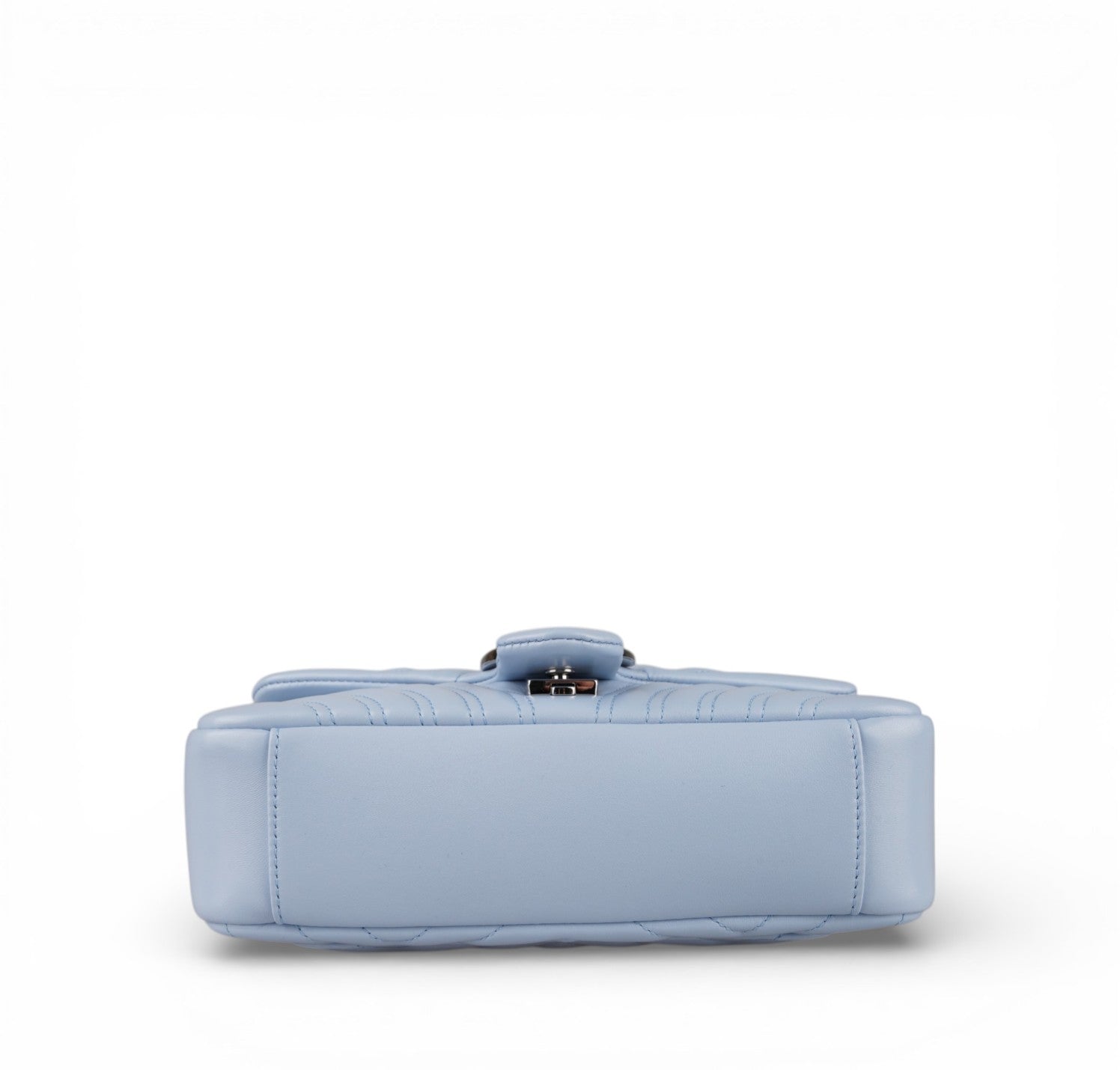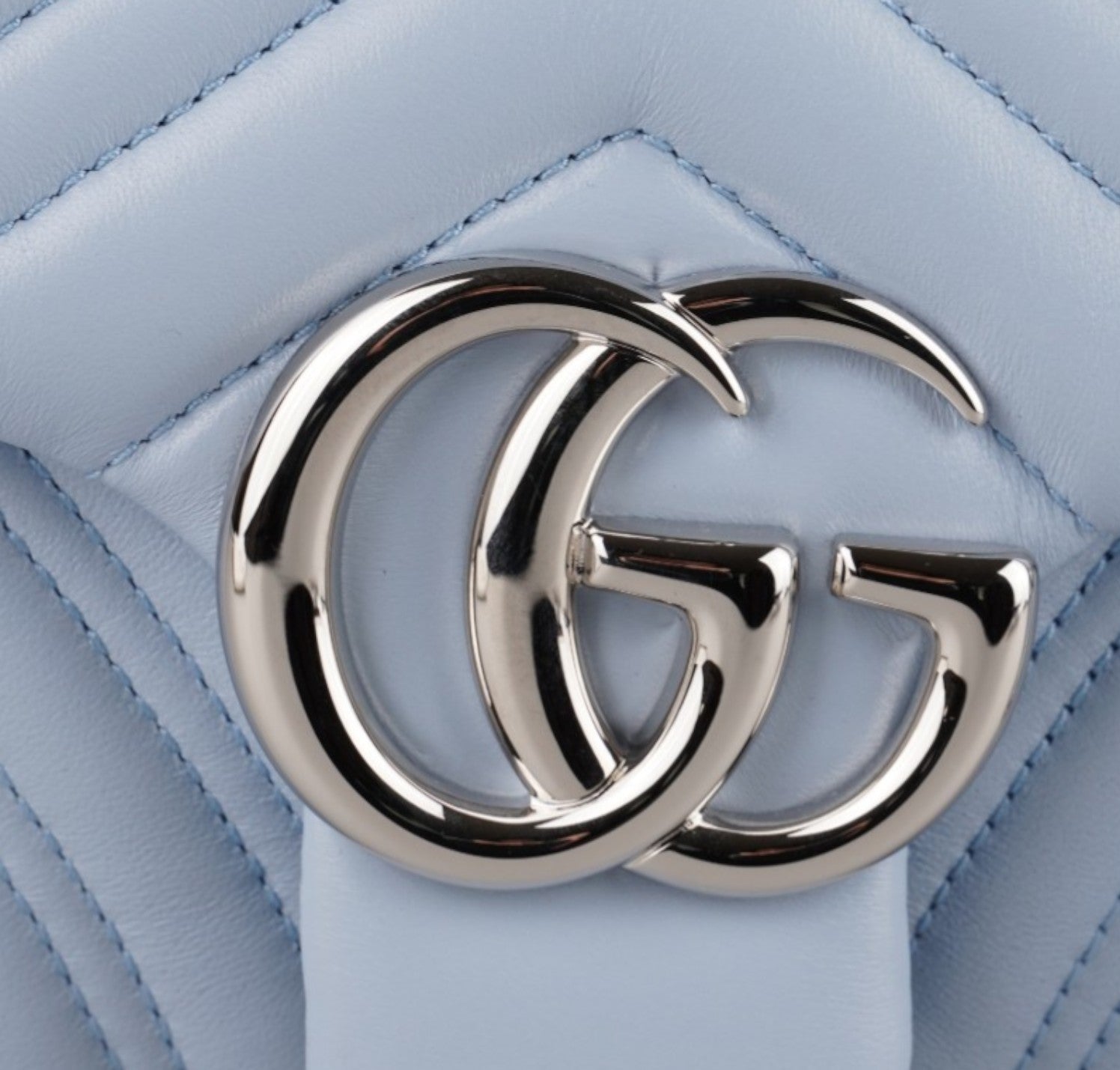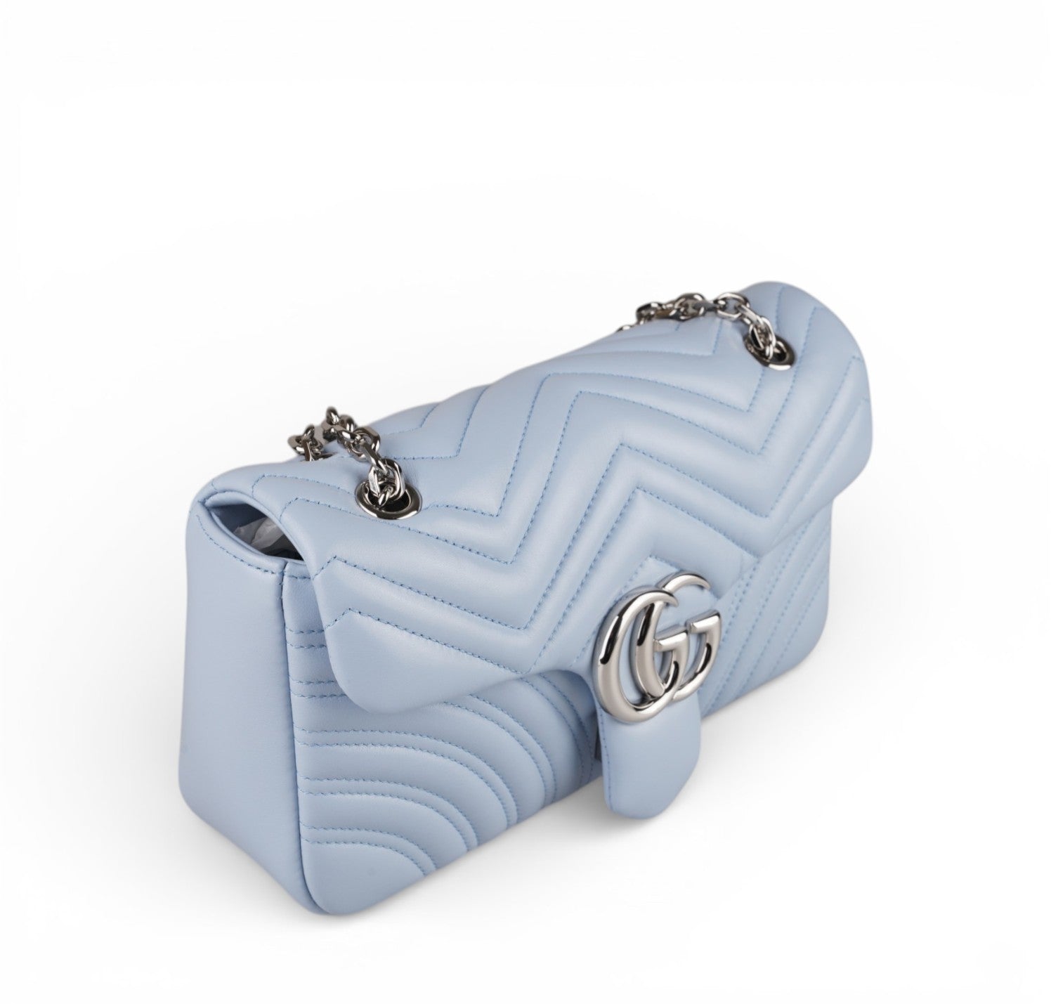 Borsa Gucci, modello GG Marmont, misura Small, nuova collezione. Realizzata in pelle matelassé color Celeste. Caratterizzata dalla finitura metallica argento. Sul retro non è più presente il cuore ricamato, elemento distintivo della prima linea Marmont. Pattina con logo Double G e tracolla scorrevole in catena con doppio inserto in pelle. Interno tono su tono, con tasca piatta. Mai indossata, pari al nuovo, potrebbe presentare micro segni di stoccaggio. Questa versione presenta la misura Small da 22 cm, più compatta, rispetto alla Small precedente da 26 cm.