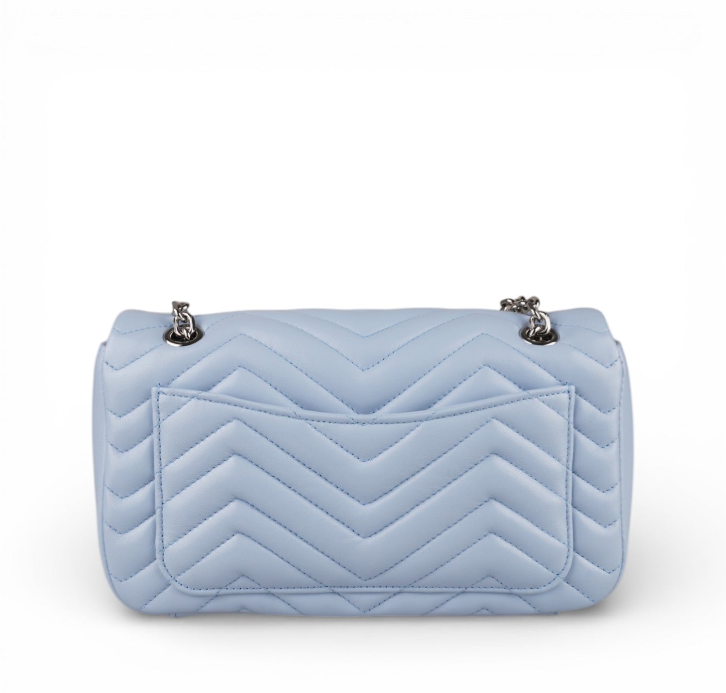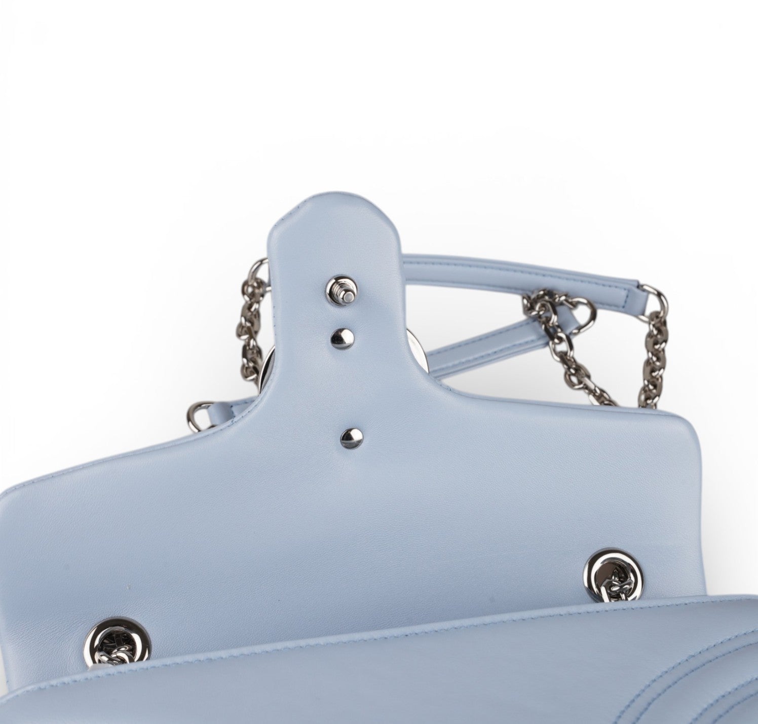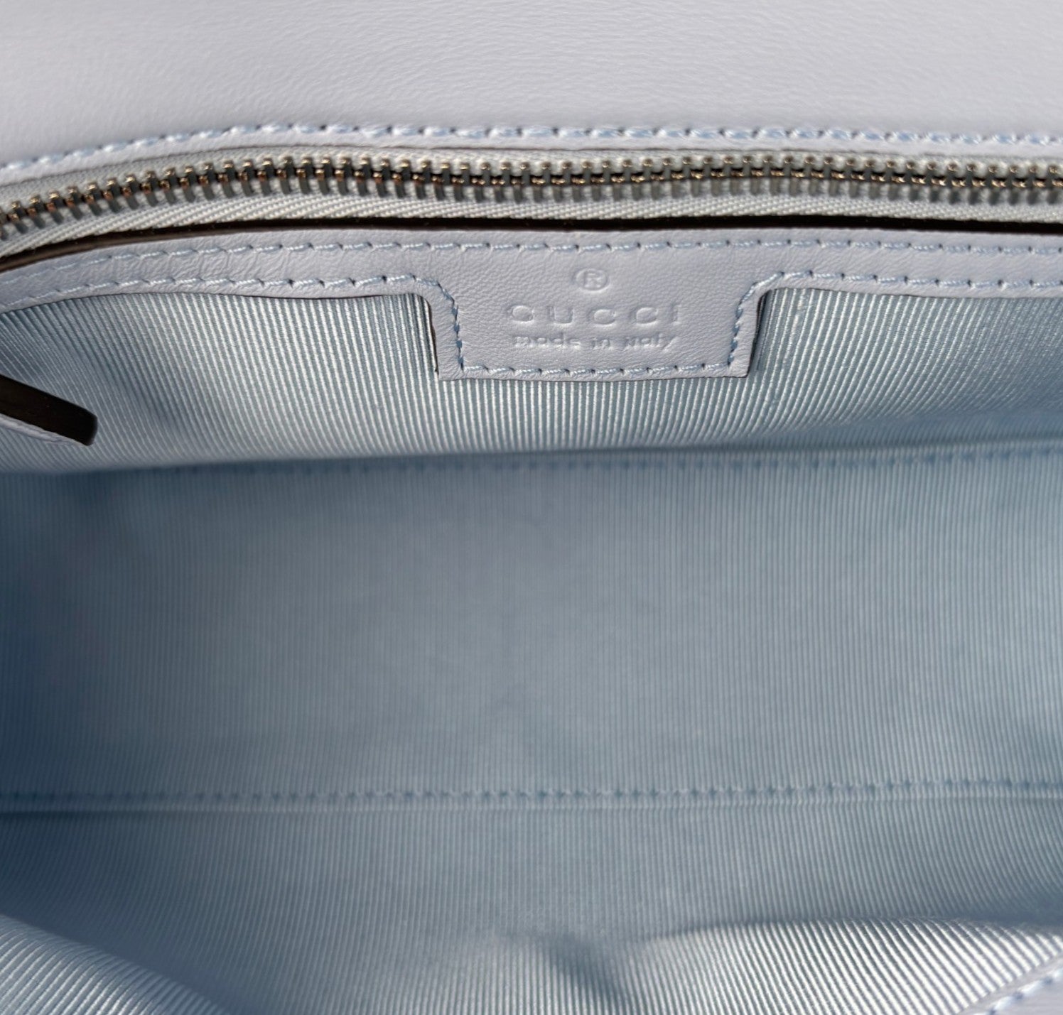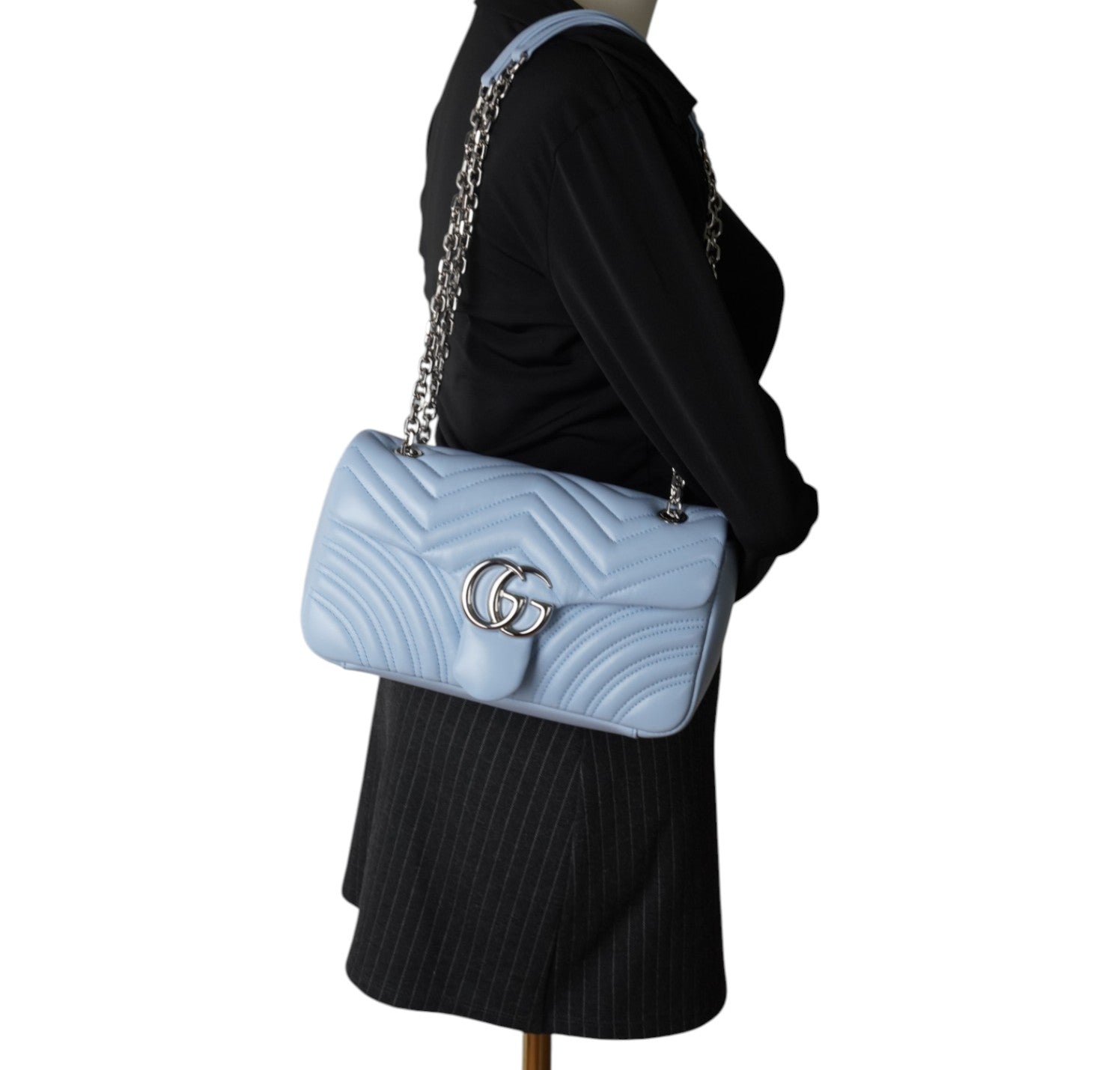 Borsa Gucci, modello GG Marmont, misura Small, nuova collezione. Realizzata in pelle matelassé color Celeste. Caratterizzata dalla finitura metallica argento. Sul retro non è più presente il cuore ricamato, elemento distintivo della prima linea Marmont. Pattina con logo Double G e tracolla scorrevole in catena con doppio inserto in pelle. Interno tono su tono, con tasca piatta. Mai indossata, pari al nuovo, potrebbe presentare micro segni di stoccaggio. Questa versione presenta la misura Small da 22 cm, più compatta, rispetto alla Small precedente da 26 cm.