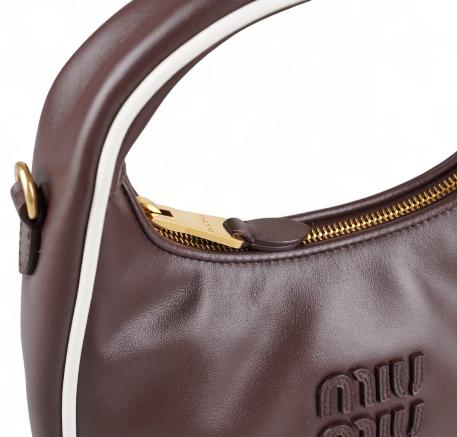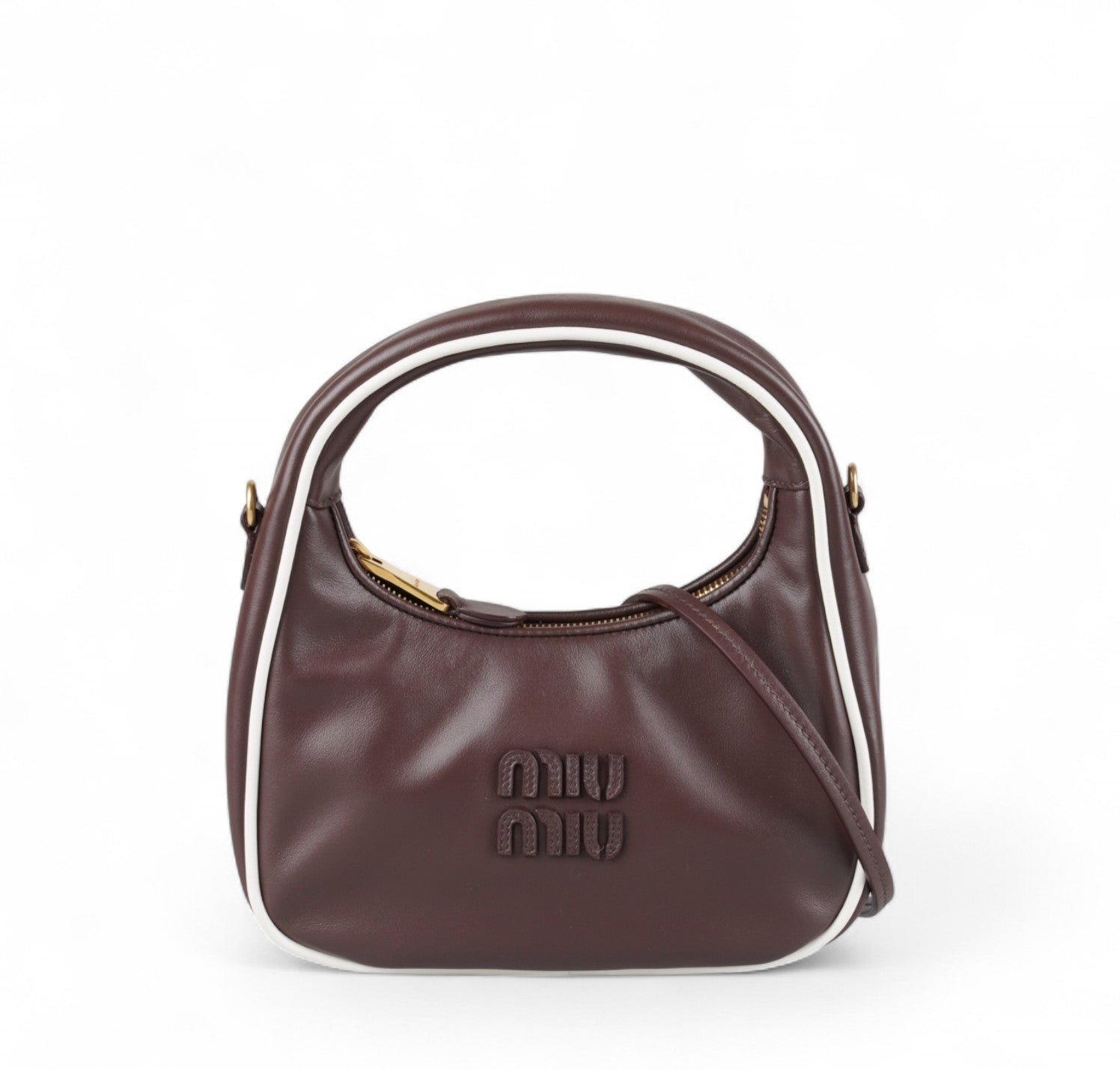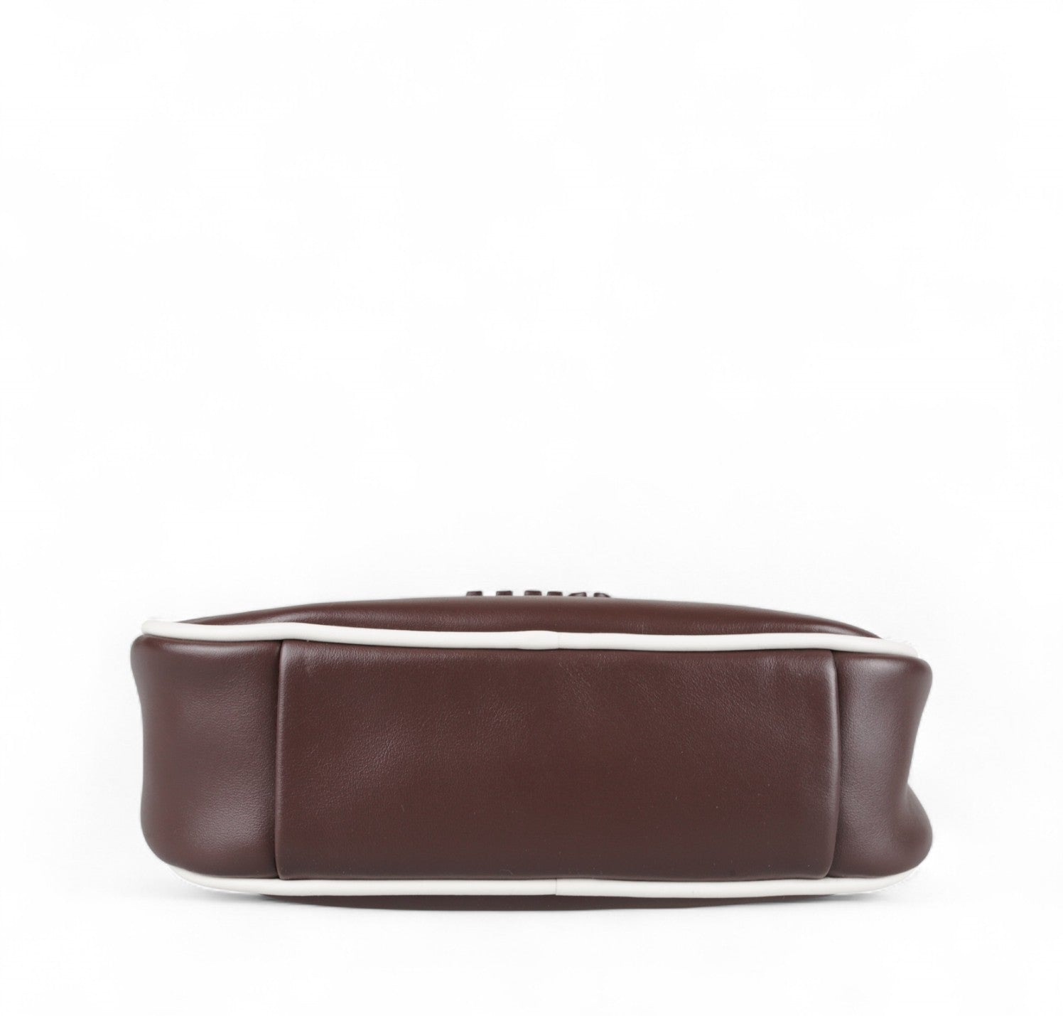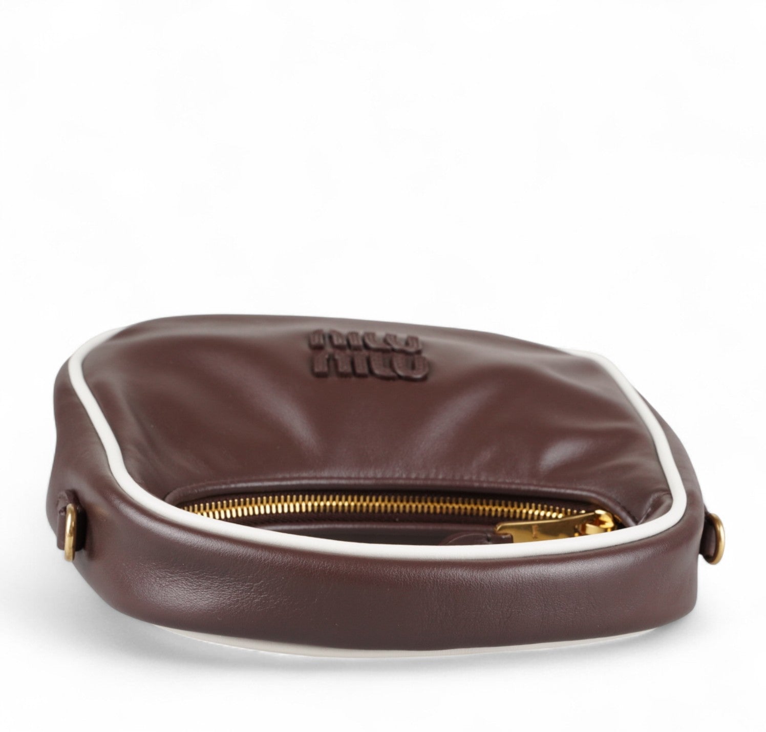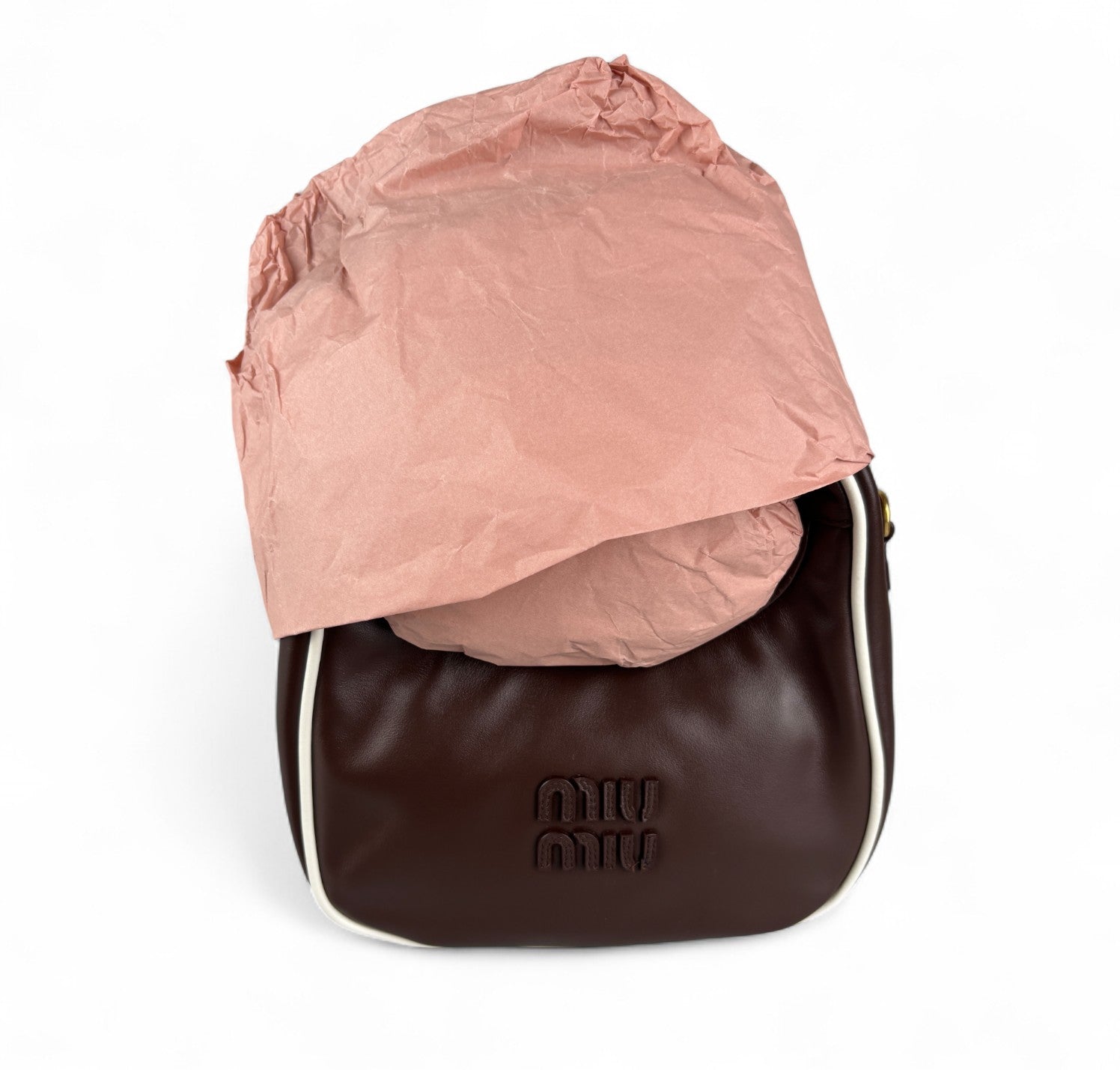 Borsa Miu Miu, modello Wander, misura Small, realizzata in pelle Liscia Marrone Cioccolato con profili bianchi a contrasto. Silhouette morbida e dallo stile sporty-chic. Portabilità a mano o a spalla grazie alla tracolla coordinata. Logo Miu Miu frontale in Pelle tono su tono. Interno foderato in tessuto. Chiusura superiore con zip. Condizioni pari al nuovo. Potrebbe presentare minimi segni di stoccaggio.