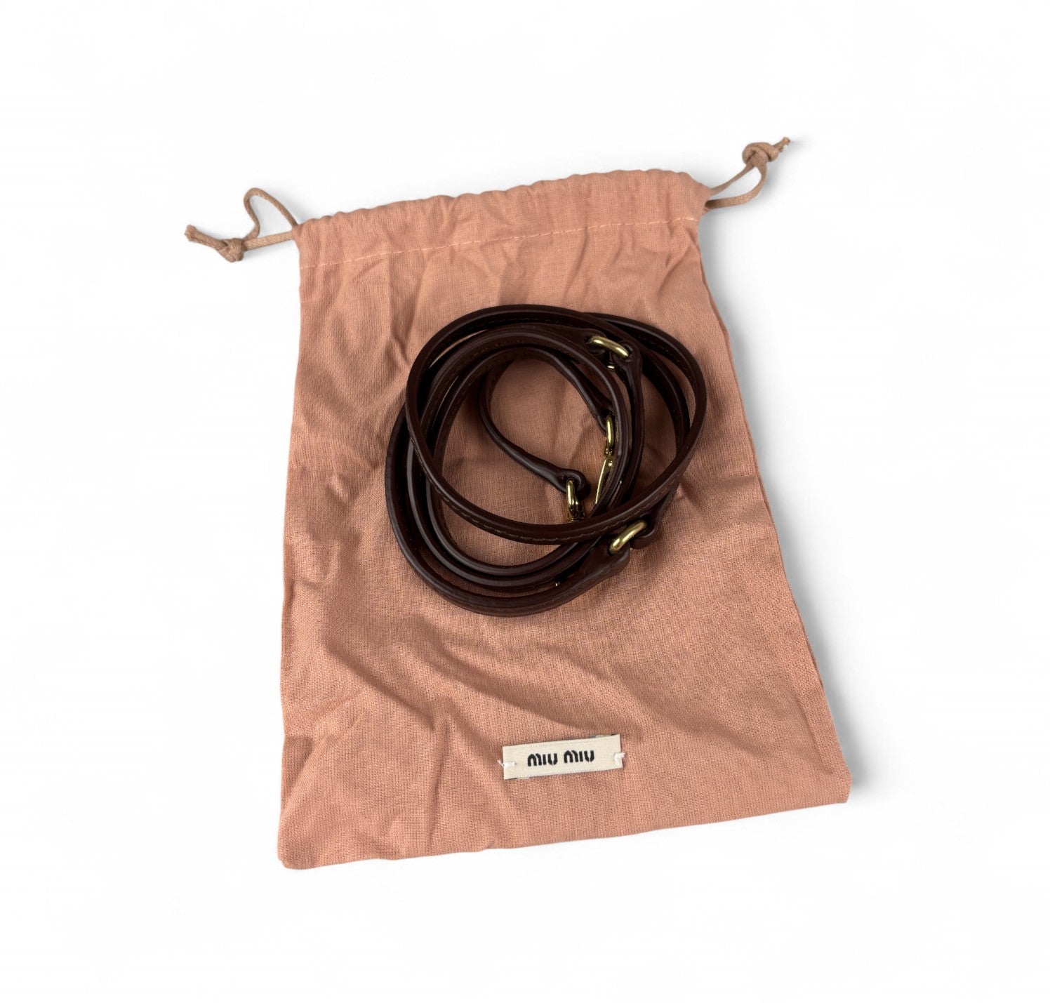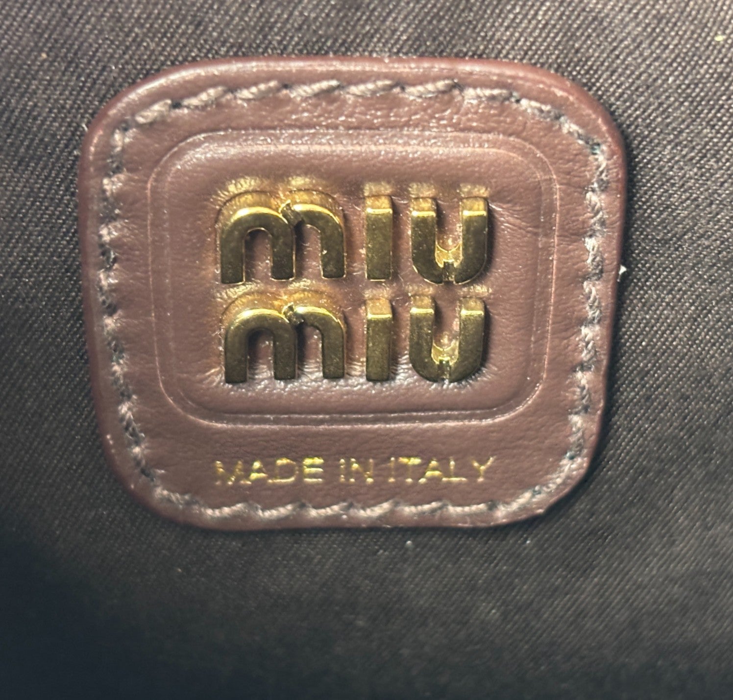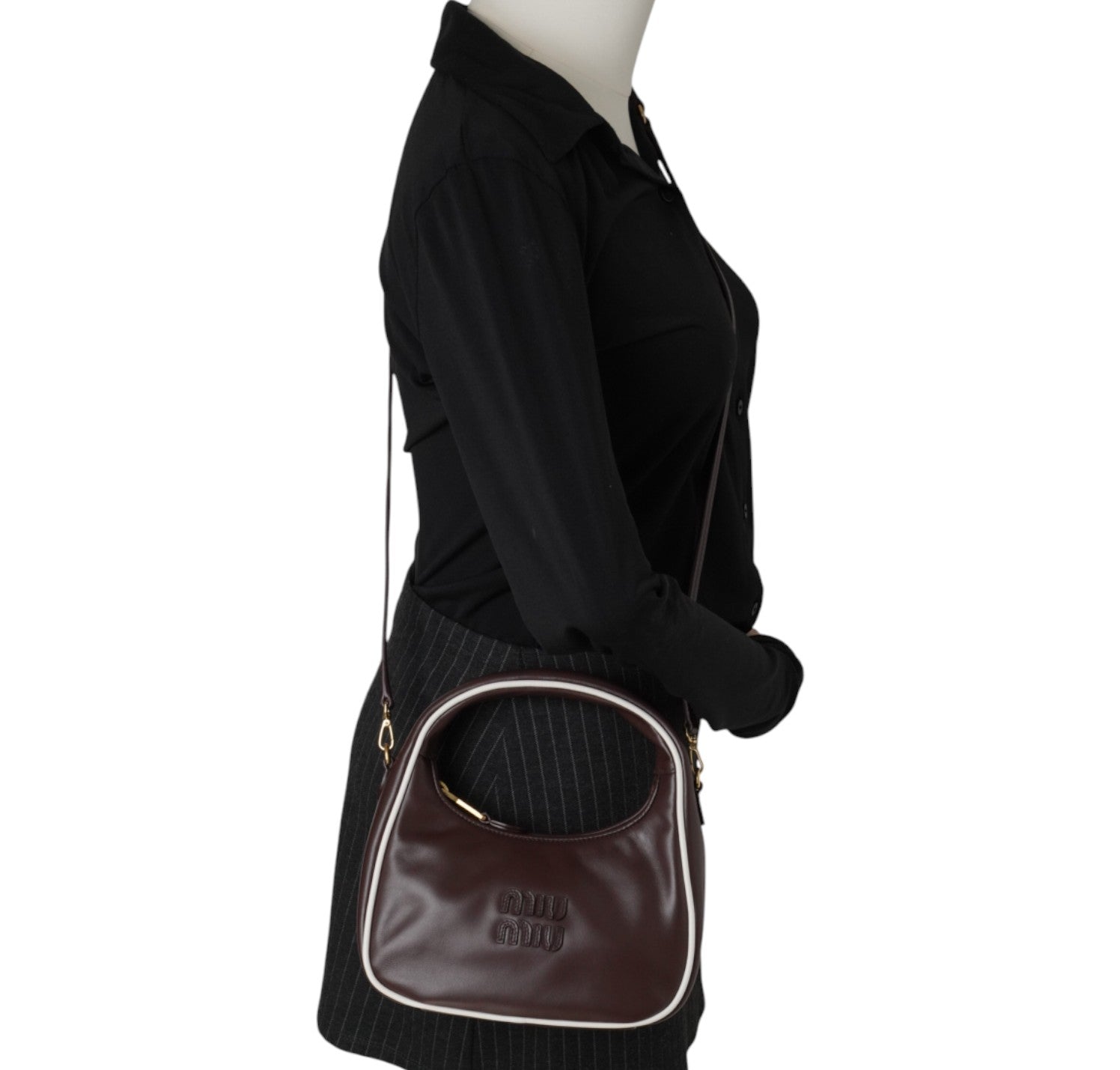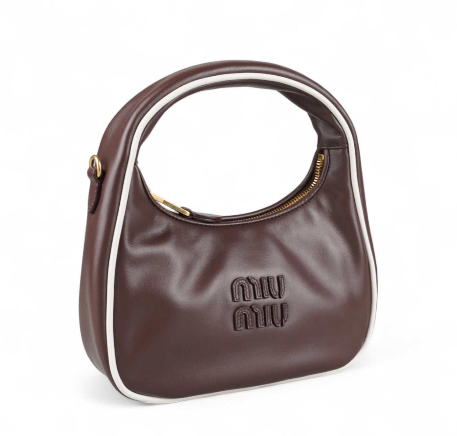 Borsa Miu Miu, modello Wander, misura Small, realizzata in pelle Liscia Marrone Cioccolato con profili bianchi a contrasto. Silhouette morbida e dallo stile sporty-chic. Portabilità a mano o a spalla grazie alla tracolla coordinata. Logo Miu Miu frontale in Pelle tono su tono. Interno foderato in tessuto. Chiusura superiore con zip. Condizioni pari al nuovo. Potrebbe presentare minimi segni di stoccaggio.